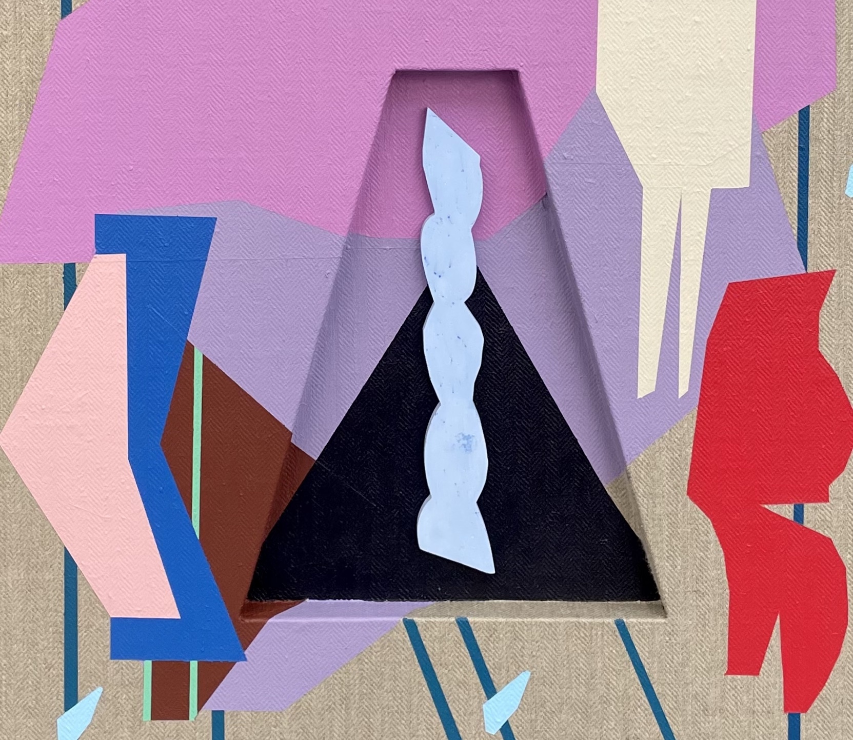 In translating this cinematic logic into paint, spatial illusion collapses into a two-dimensional surface. Forms flatten into color. At times, the movement reverses: space opens inward, receding into a carved recess within the canvas to form a niche. This sculptural device, first introduced in Kent’s interventions on gallery walls and later in wooden constructions, now enters the painting itself, creating literal depth. An enigmatic motif, initially developed in cut paper and later in paint, is cast in pigmented cement and set into the recess. Both embedded and elevated, it holds its quiet significance in high relief, like a treasured relic.