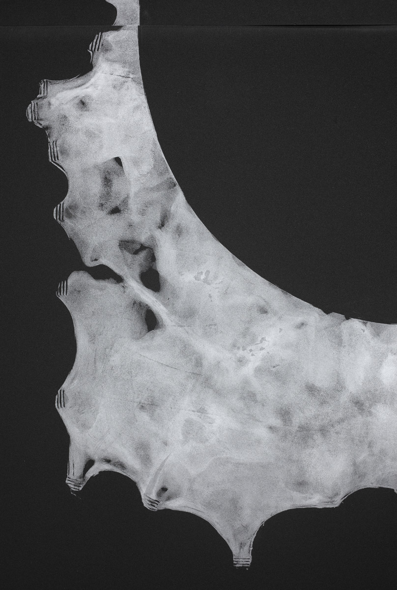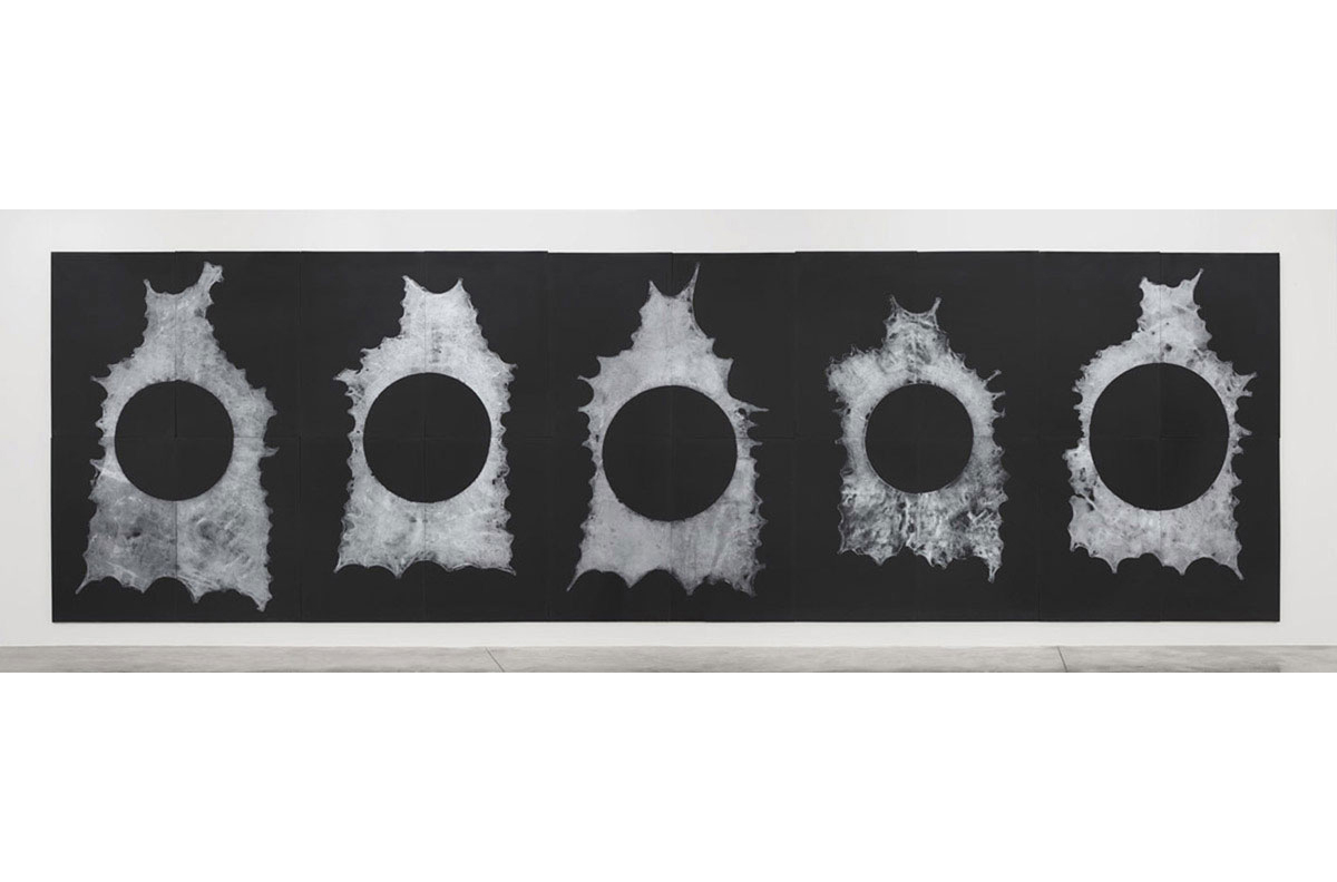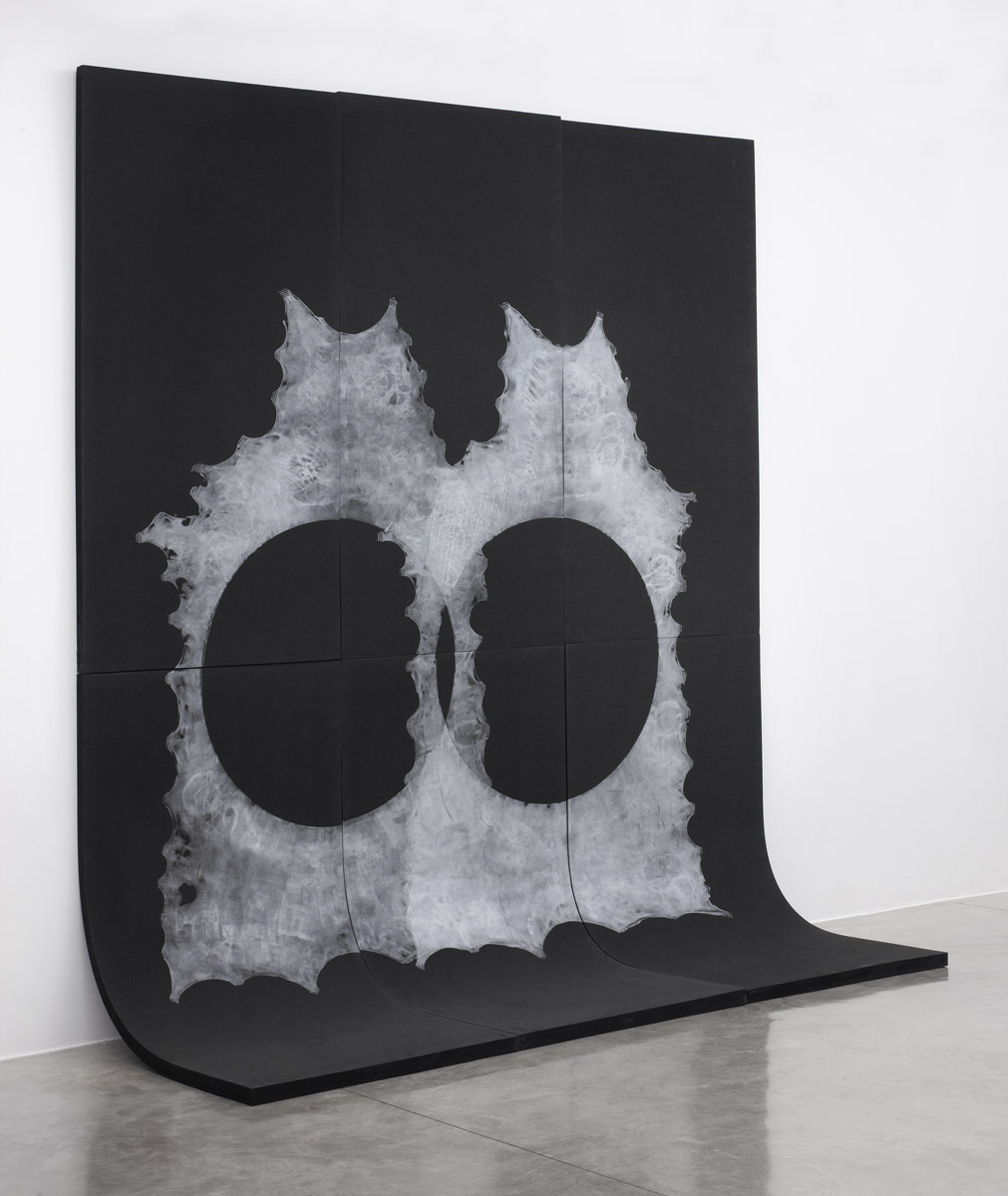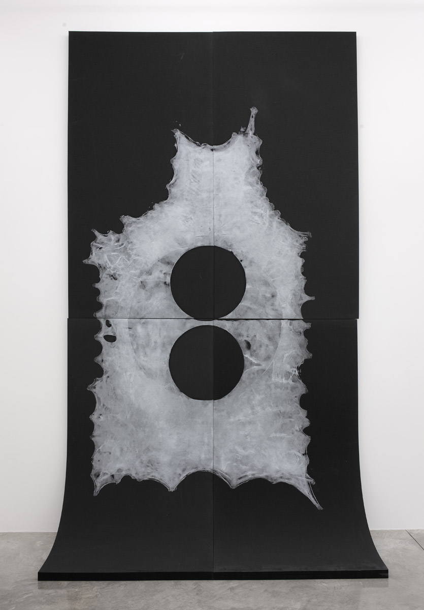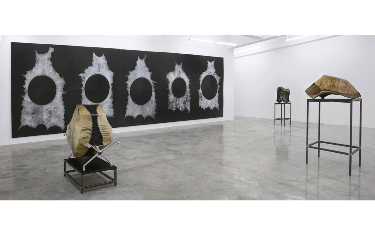 Additionally present is a new series of modular silver ink prints on polyethylene foam panels that lean on to and hang from the gallery walls. Utilizing the remainder of the elk hides, with their cut out, empty circular forms, Jungen saturated one side of each hide in silver ink. With the aid of an assistant, and their combined weight, each inked hide was then pressed into the surface of industrial foam, leaving a textured and ghostly impression of what the skin had previously housed.