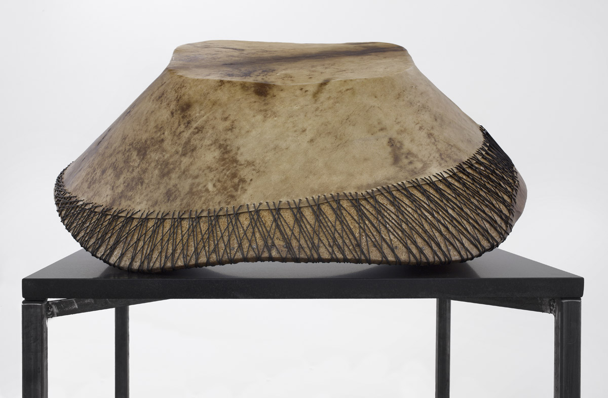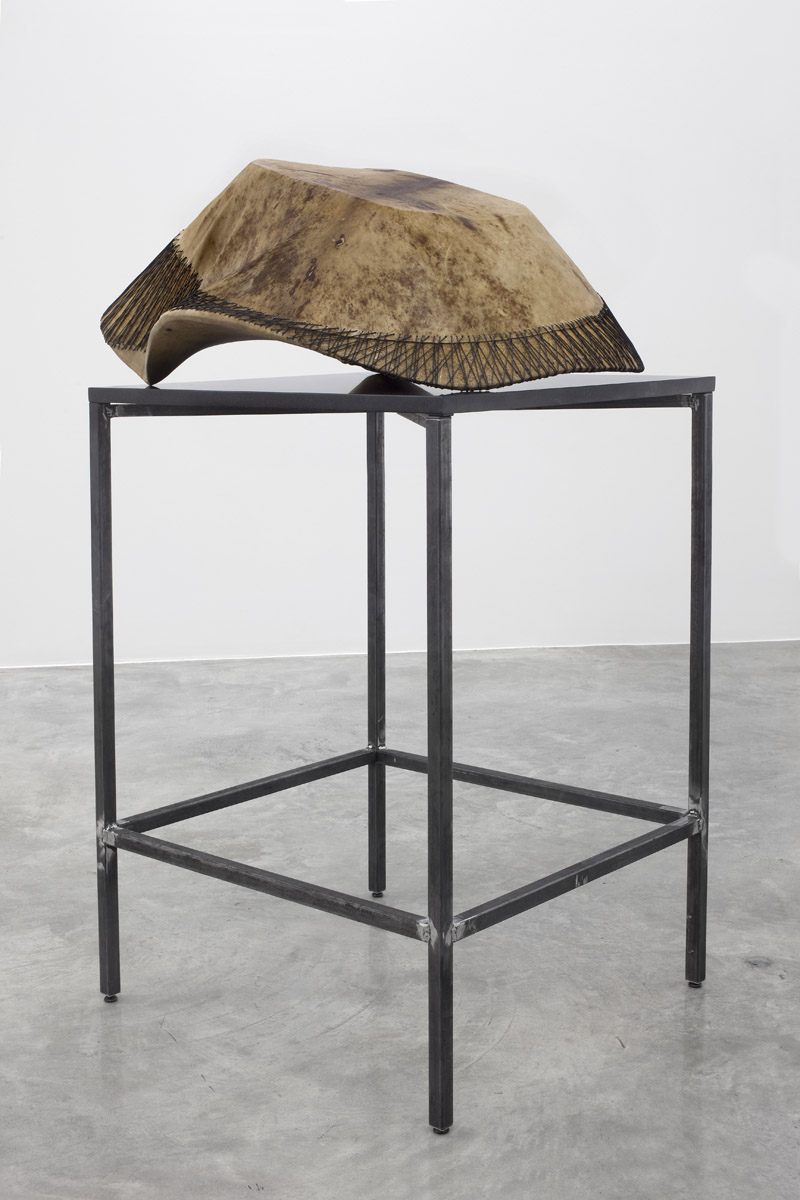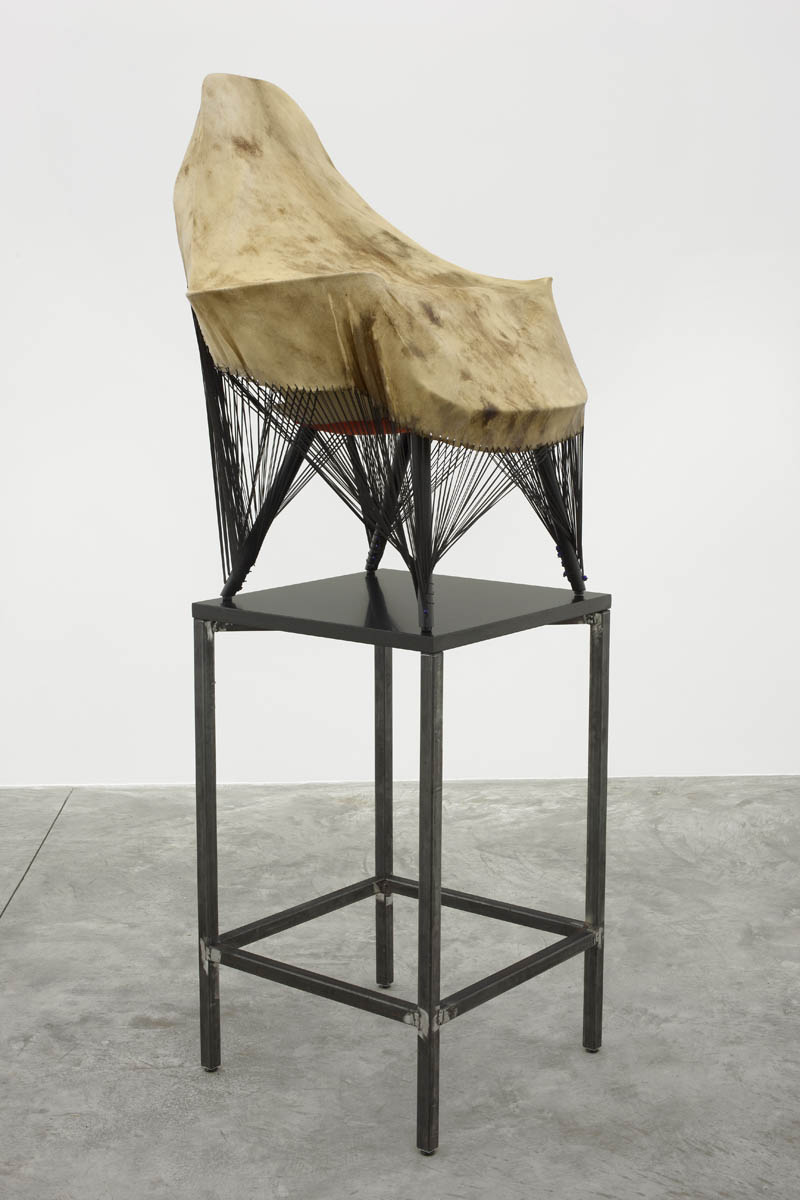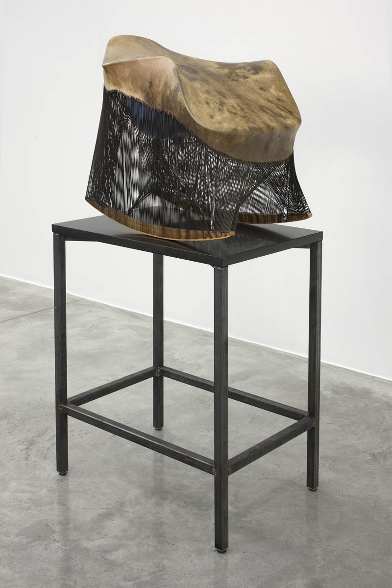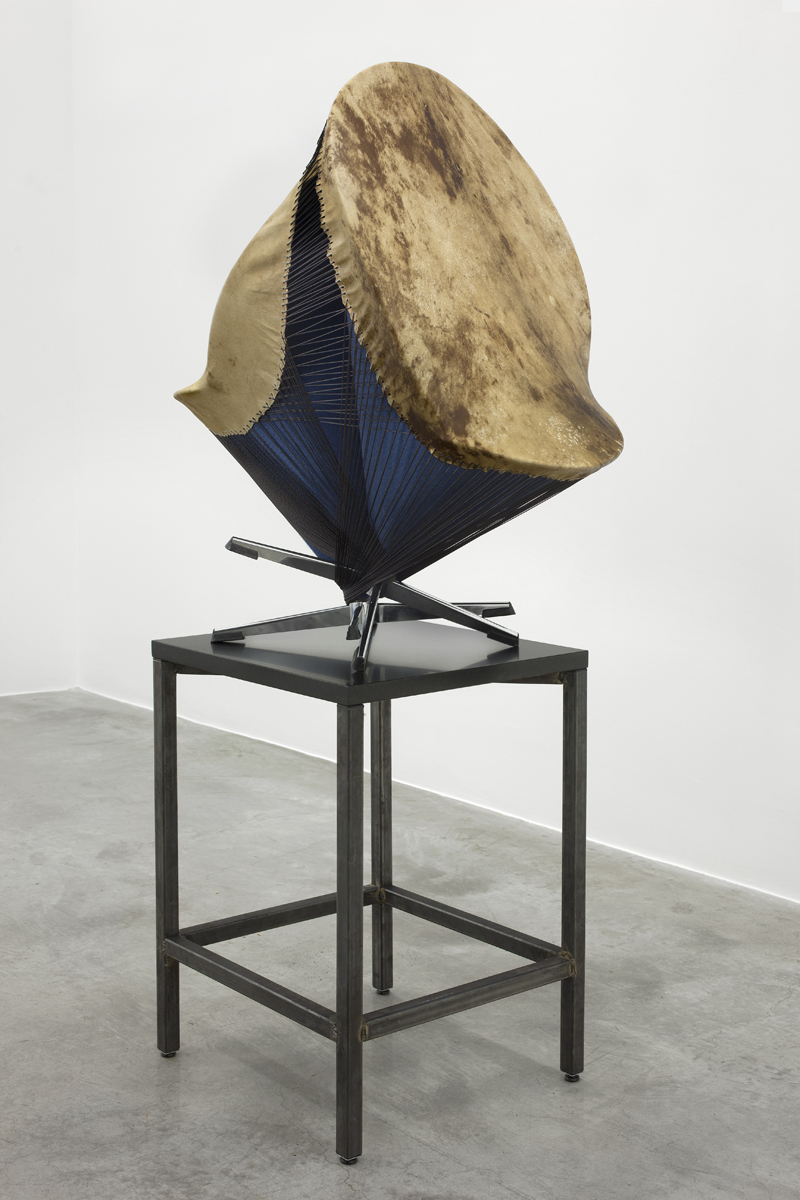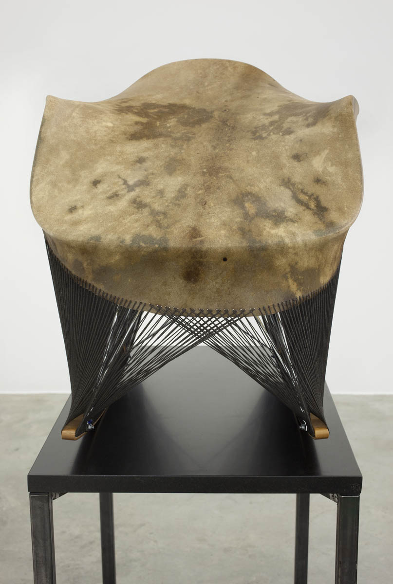 Since 2006, Jungen has lived and worked between Vancouver, British Columbia, and the Doig River Indian reserve in northern BC, where the First Nations Dane-zaa (pronounced “dan-ney-za”) side of his family is located. Reconnecting with friends, family, and the landscape of the Peace River Valley, has increasingly personalized the vocabulary of his practice. Previously, Jungen was most well known for deconstructing Westernized, mass-produced commodities such as leather goods, sports paraphernalia, plastic lawn chairs, and reforming them into sculpture. For this exhibition, Jungen presents two series of works that combine objects of natural and manufactured form, drawn from a range of influences and references, including: modern furniture, Marcel Duchamp’s readymades, Andy Warhol’s silk screen prints, and traditional Dane-zaa drum making.