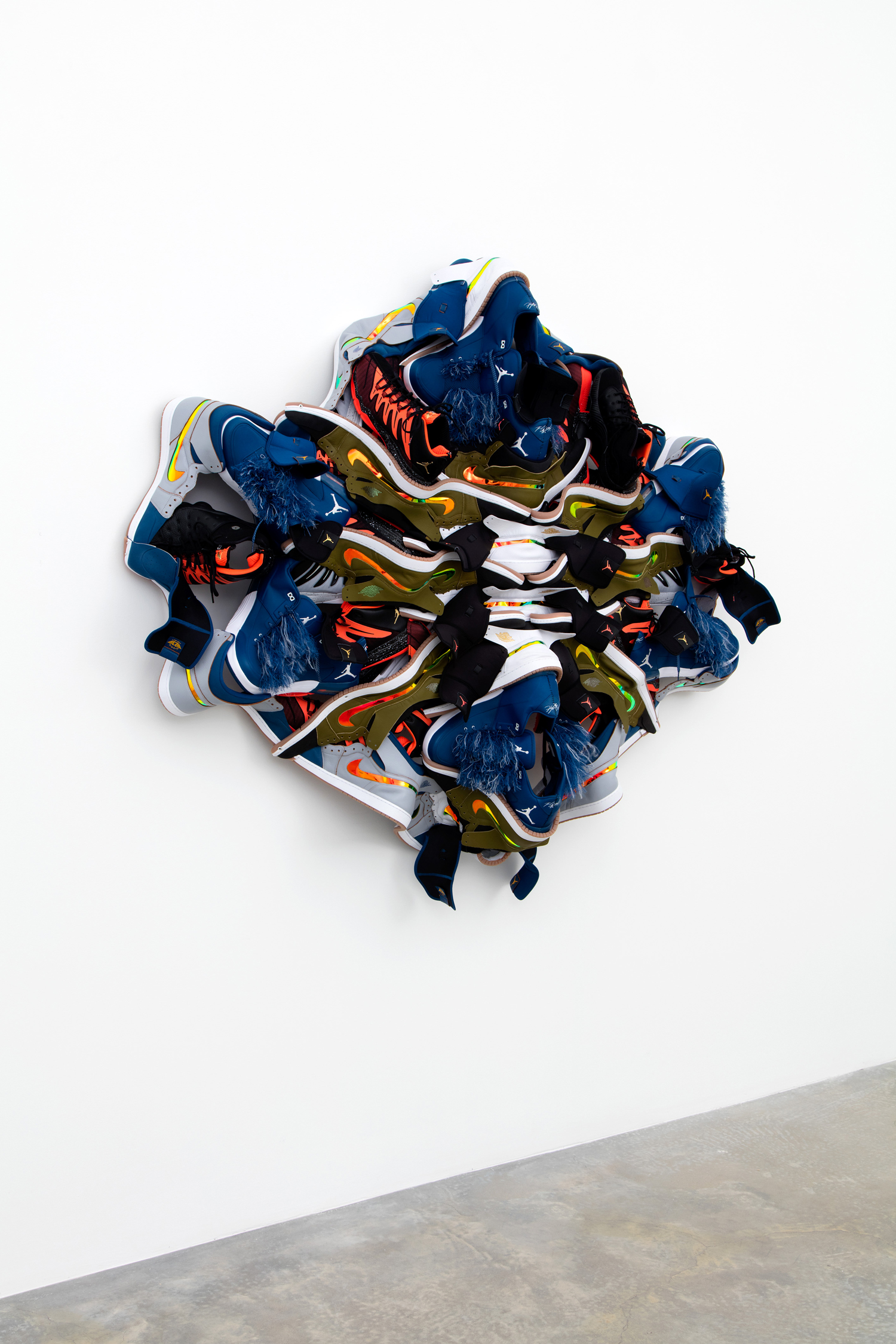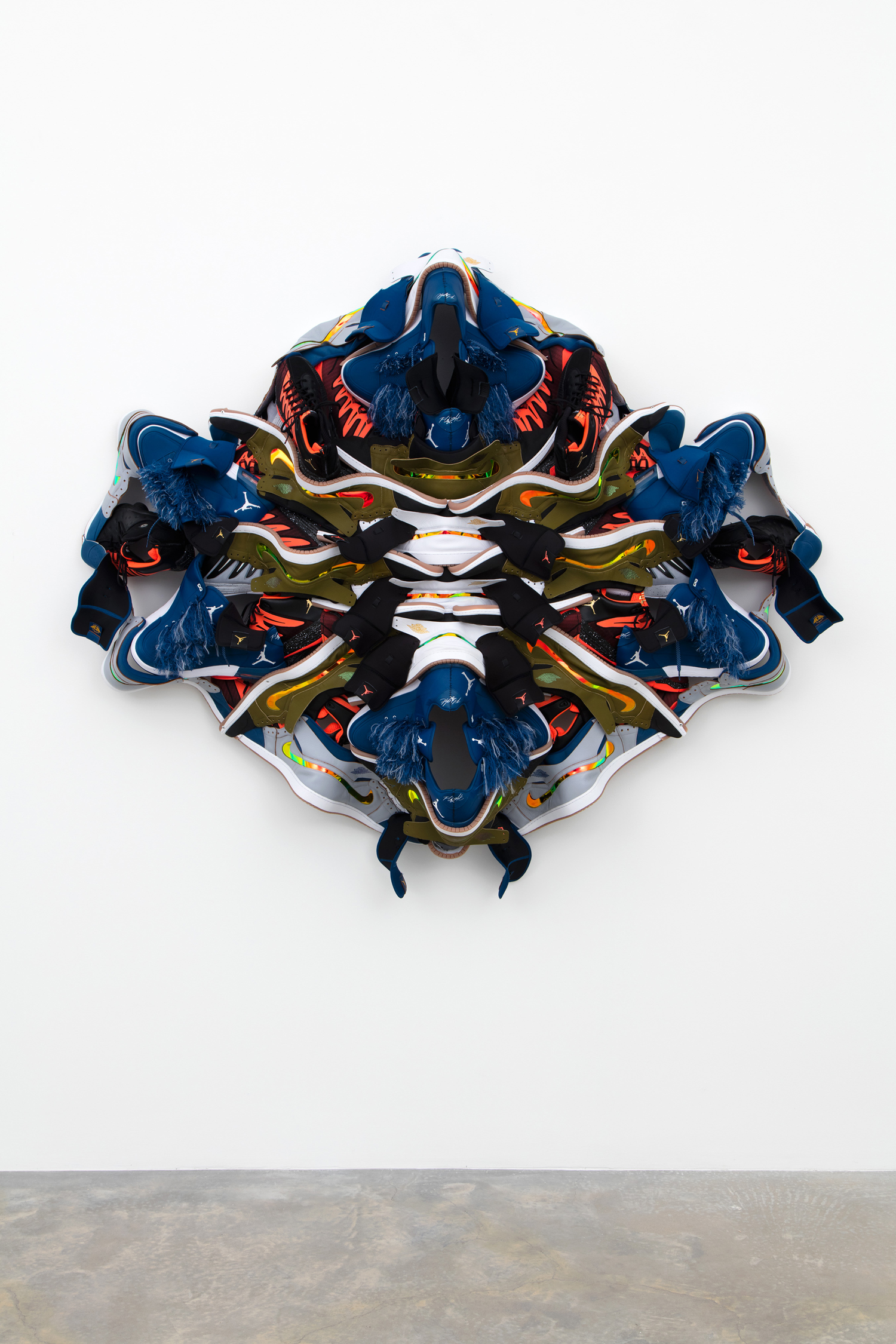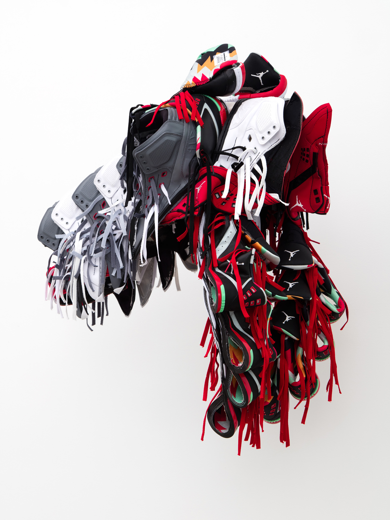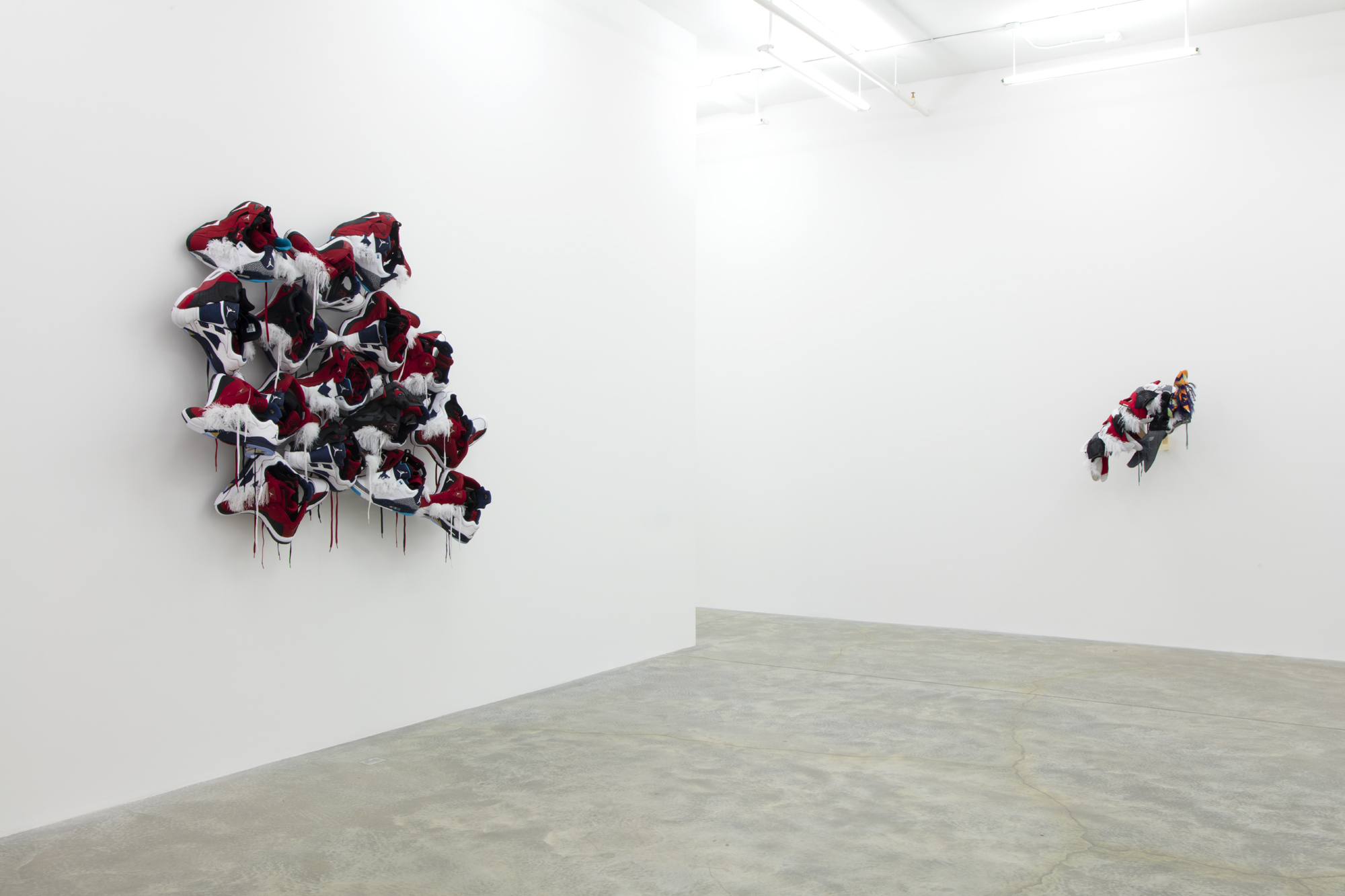 Casey Kaplan is pleased to present an exhibition of new sculptures by renowned artist, Brian Jungen. In 1998, while living in Vancouver the artist conceived his first sculptural works, “Prototype for New Understanding” (1998-2005). Converting Nike Air Jordan trainers into anthropological masks, using the traditional colors of black, white, red, integrated with human hair, Jungen made poignant references to contemporary assimilations and the commercial devaluing of revered customs and symbols. The process was an intimate one, as the shoes were laboriously altered by Jungen’s hand. Ultimately they were presented in a museum-like display as precious artifacts, with glass vitrines and supporting armatures. The Nike Air Jordan was a sought-after, pop-cultural symbol among Jungen’s adolescent peers in the Doig River band of the Dane-zaa First Nation and established Jungen’s interest in the reciprocal link between objects and people. In Jungen’s fourth exhibition at Casey Kaplan, he revisits this medium so instrumental to the beginnings of his practice. Jungen’s new sculptural objects, wall reliefs, and hanging curtain are made of cut, spliced and reformatted Air Jordan trainers transformed into abstracted compositions that generate broader interpretations.