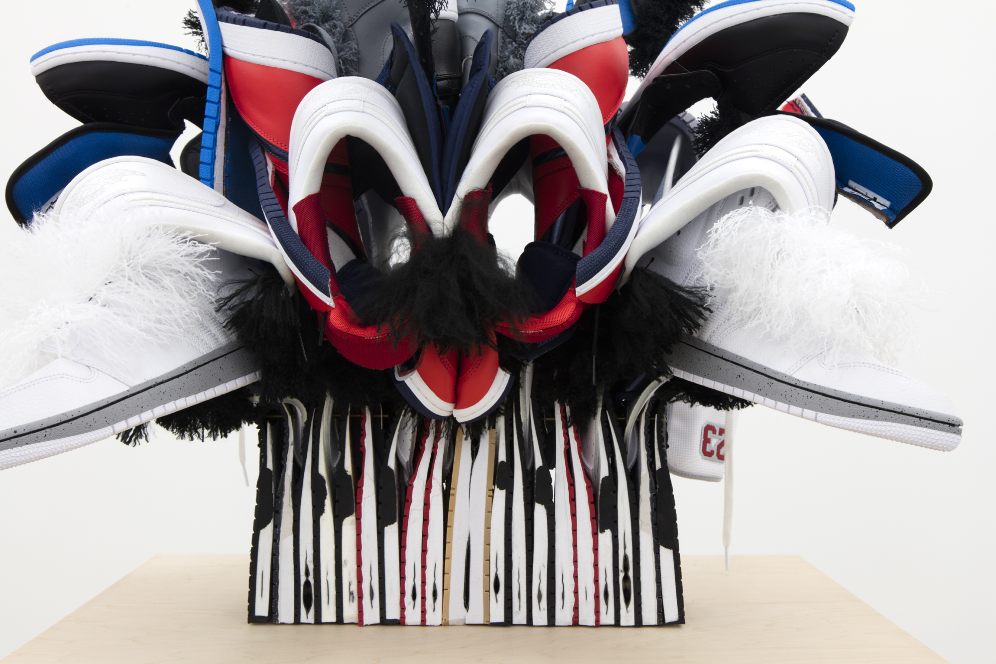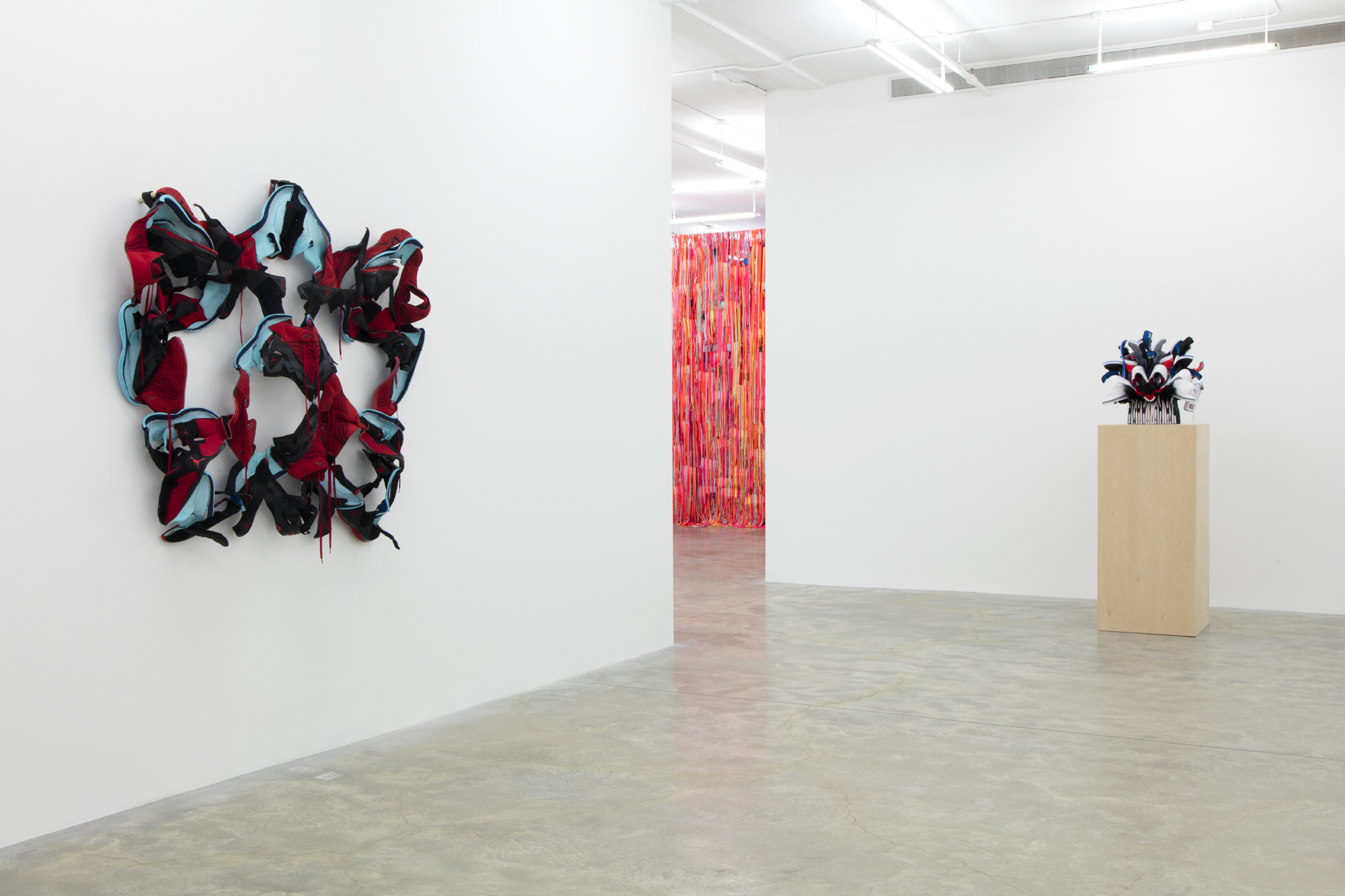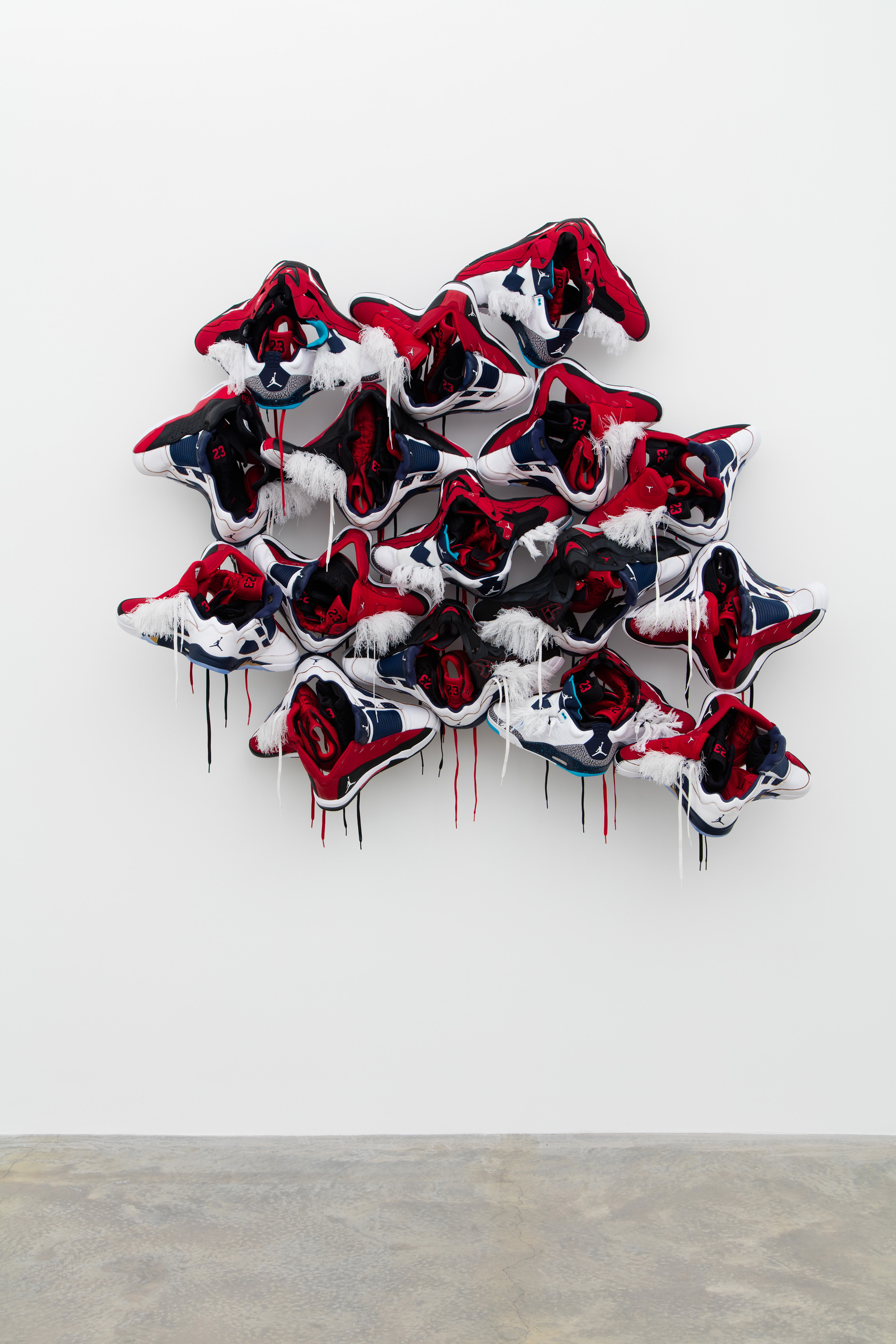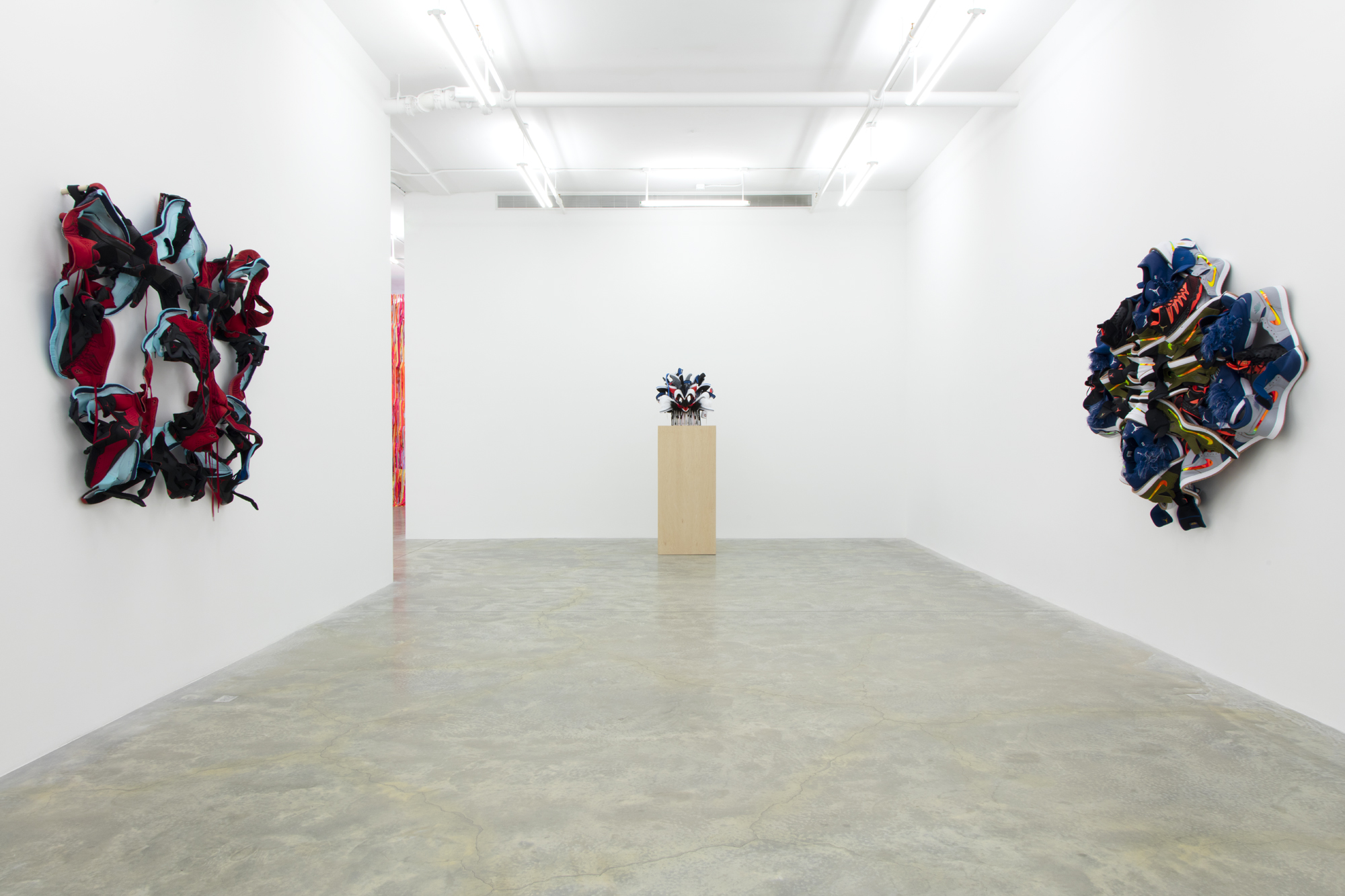 Casey Kaplan is pleased to present an exhibition of new sculptures by renowned artist, Brian Jungen. In 1998, while living in Vancouver the artist conceived his first sculptural works, “Prototype for New Understanding” (1998-2005). Converting Nike Air Jordan trainers into anthropological masks, using the traditional colors of black, white, red, integrated with human hair, Jungen made poignant references to contemporary assimilations and the commercial devaluing of revered customs and symbols. The process was an intimate one, as the shoes were laboriously altered by Jungen’s hand. Ultimately they were presented in a museum-like display as precious artifacts, with glass vitrines and supporting armatures. The Nike Air Jordan was a sought-after, pop-cultural symbol among Jungen’s adolescent peers in the Doig River band of the Dane-zaa First Nation and established Jungen’s interest in the reciprocal link between objects and people. In Jungen’s fourth exhibition at Casey Kaplan, he revisits this medium so instrumental to the beginnings of his practice. Jungen’s new sculptural objects, wall reliefs, and hanging curtain are made of cut, spliced and reformatted Air Jordan trainers transformed into abstracted compositions that generate broader interpretations.