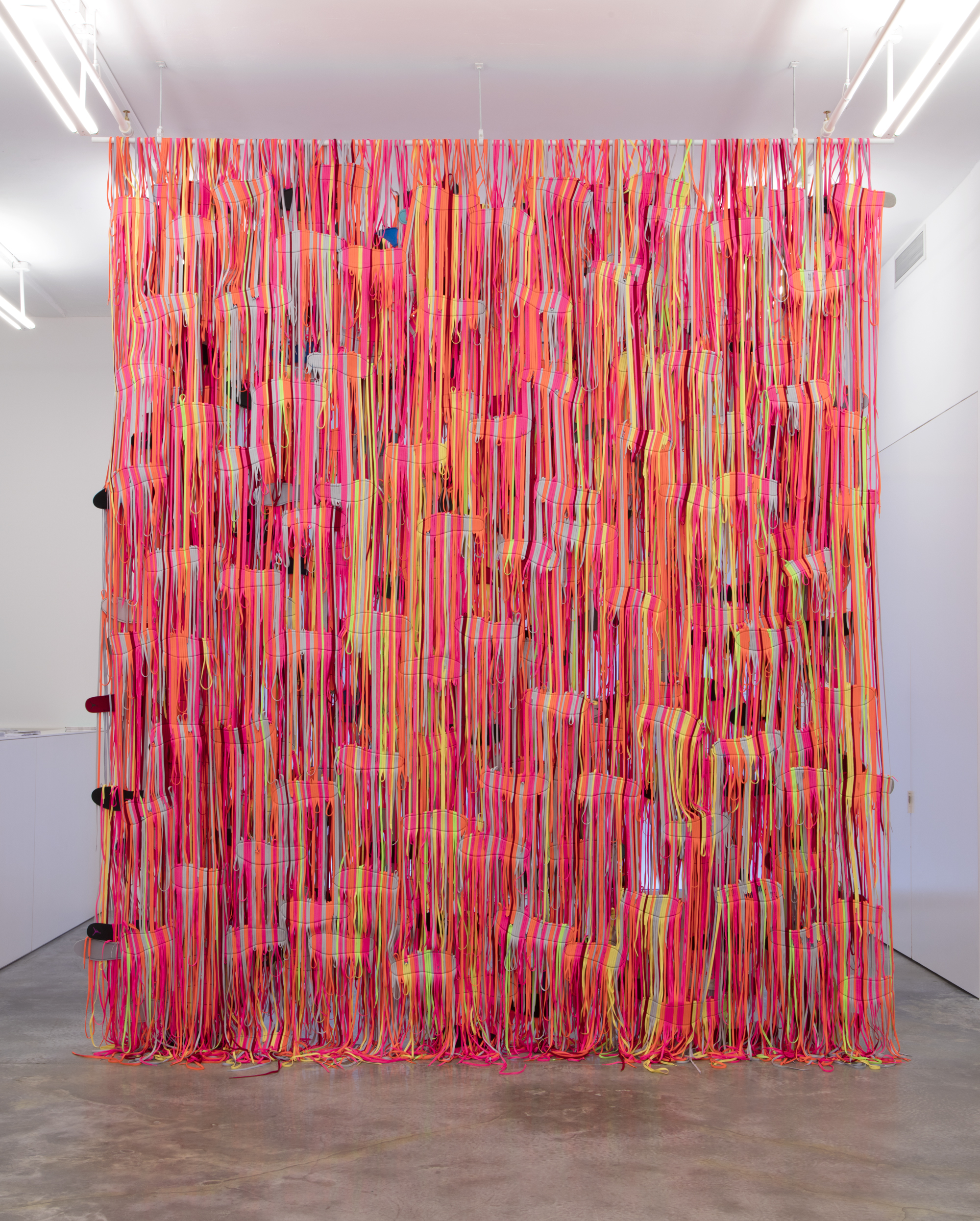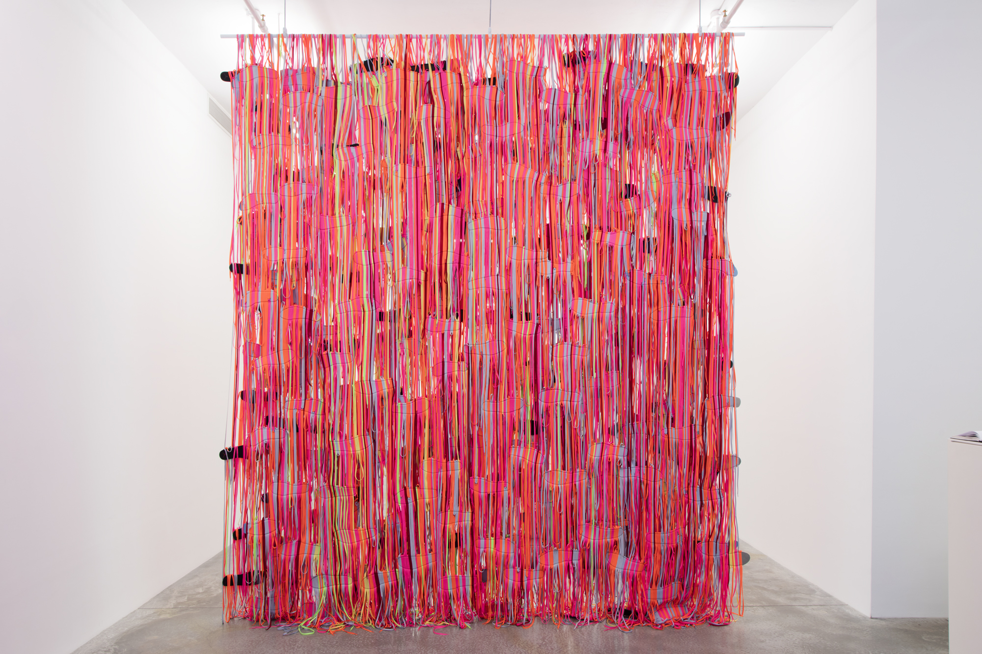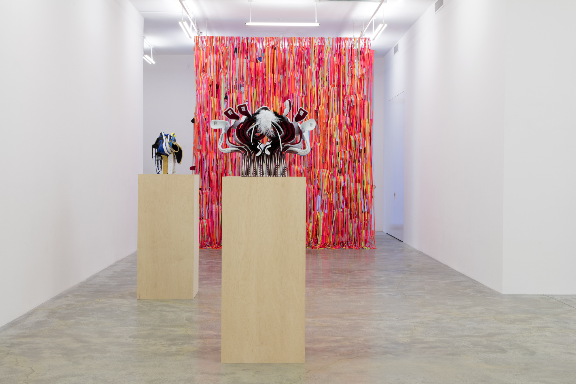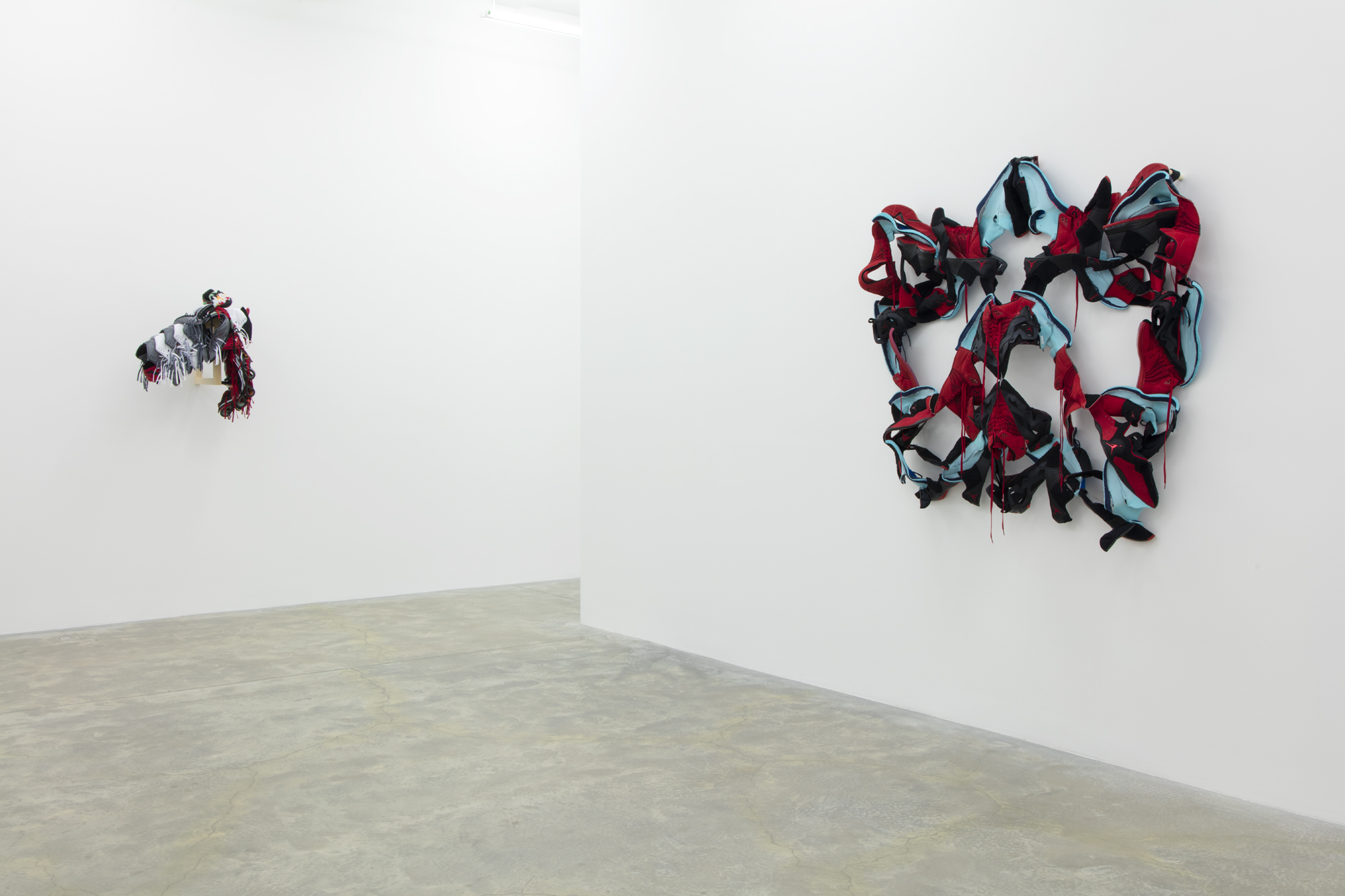 Casey Kaplan is pleased to present an exhibition of new sculptures by renowned artist, Brian Jungen. In 1998, while living in Vancouver the artist conceived his first sculptural works, “Prototype for New Understanding” (1998-2005). Converting Nike Air Jordan trainers into anthropological masks, using the traditional colors of black, white, red, integrated with human hair, Jungen made poignant references to contemporary assimilations and the commercial devaluing of revered customs and symbols. The process was an intimate one, as the shoes were laboriously altered by Jungen’s hand. Ultimately they were presented in a museum-like display as precious artifacts, with glass vitrines and supporting armatures. The Nike Air Jordan was a sought-after, pop-cultural symbol among Jungen’s adolescent peers in the Doig River band of the Dane-zaa First Nation and established Jungen’s interest in the reciprocal link between objects and people. In Jungen’s fourth exhibition at Casey Kaplan, he revisits this medium so instrumental to the beginnings of his practice. Jungen’s new sculptural objects, wall reliefs, and hanging curtain are made of cut, spliced and reformatted Air Jordan trainers transformed into abstracted compositions that generate broader interpretations.