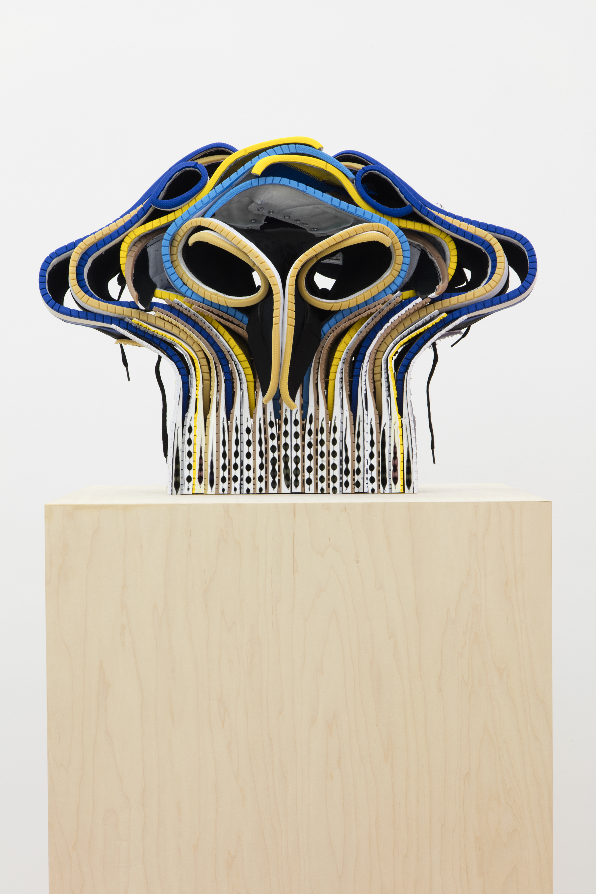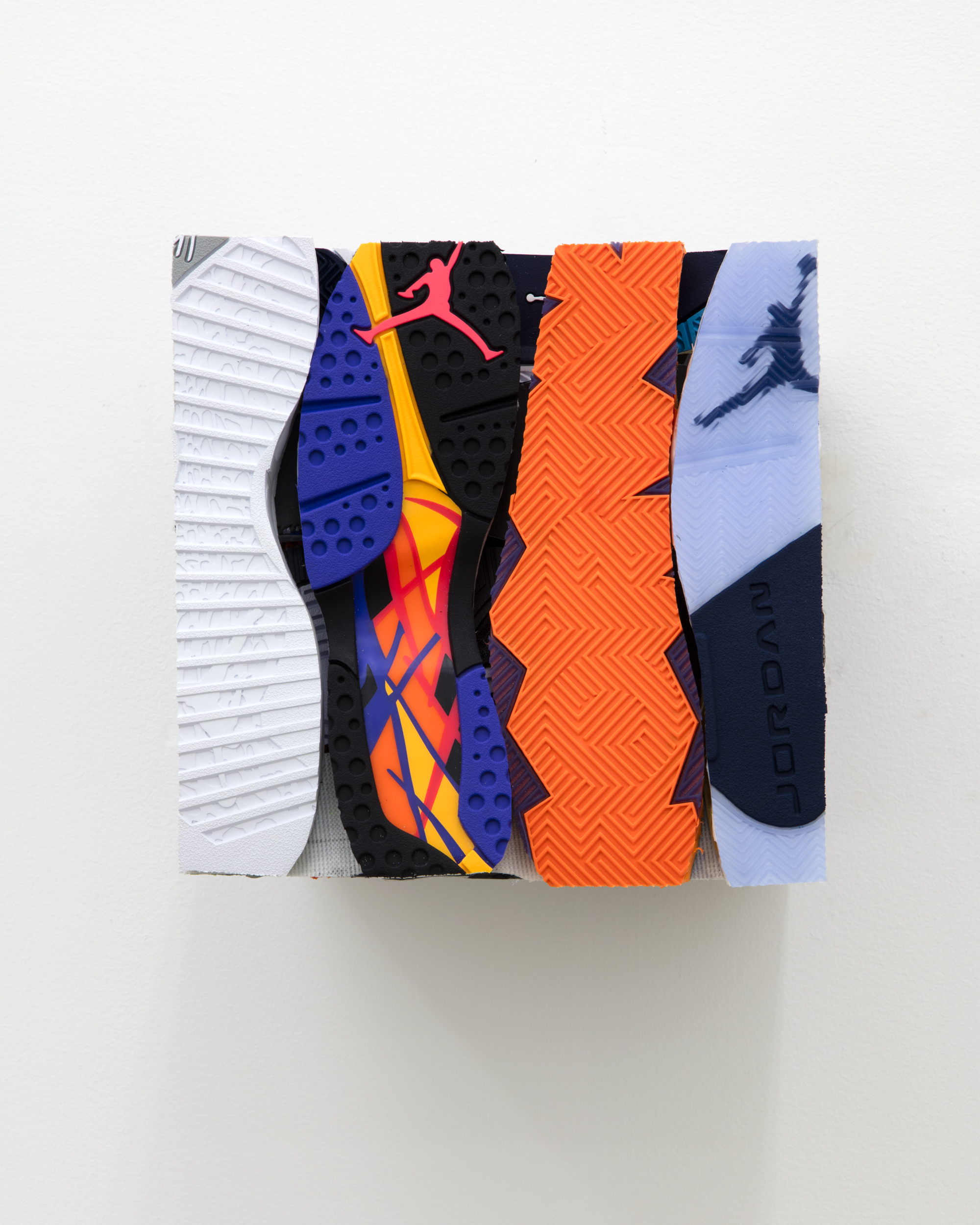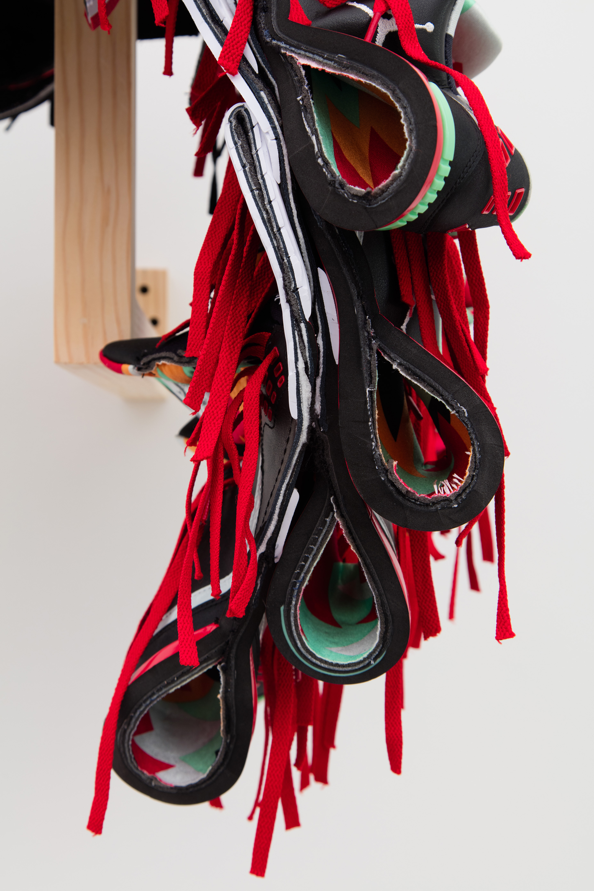 The components of the shoes independently support and embrace the renewed structures. Viewed in the round, the freestanding sculptures offer insight into Jungen’s technique of cutting through stacked and compressed rubber soles, for each layer of synthetic fabric, leather and rubber is exposed. To access the exhibition one must enter through a veil of fluorescent shoelaces, seamed onto insoles suspended from the ceiling. Conscious of using the whole shoe, the curtain walks us through time by incorporating remnants of soles left over from the first “Prototype for New Understanding” series. In wall reliefs, the artist taps into an anthropomorphic realm between the alien and familiar with unraveled and tufted shoelaces, indicative of the use of humanhair in previous work. In many respects, the resulting formation simulates the futuristic design of the Air Jordan as it exists in today’s market.