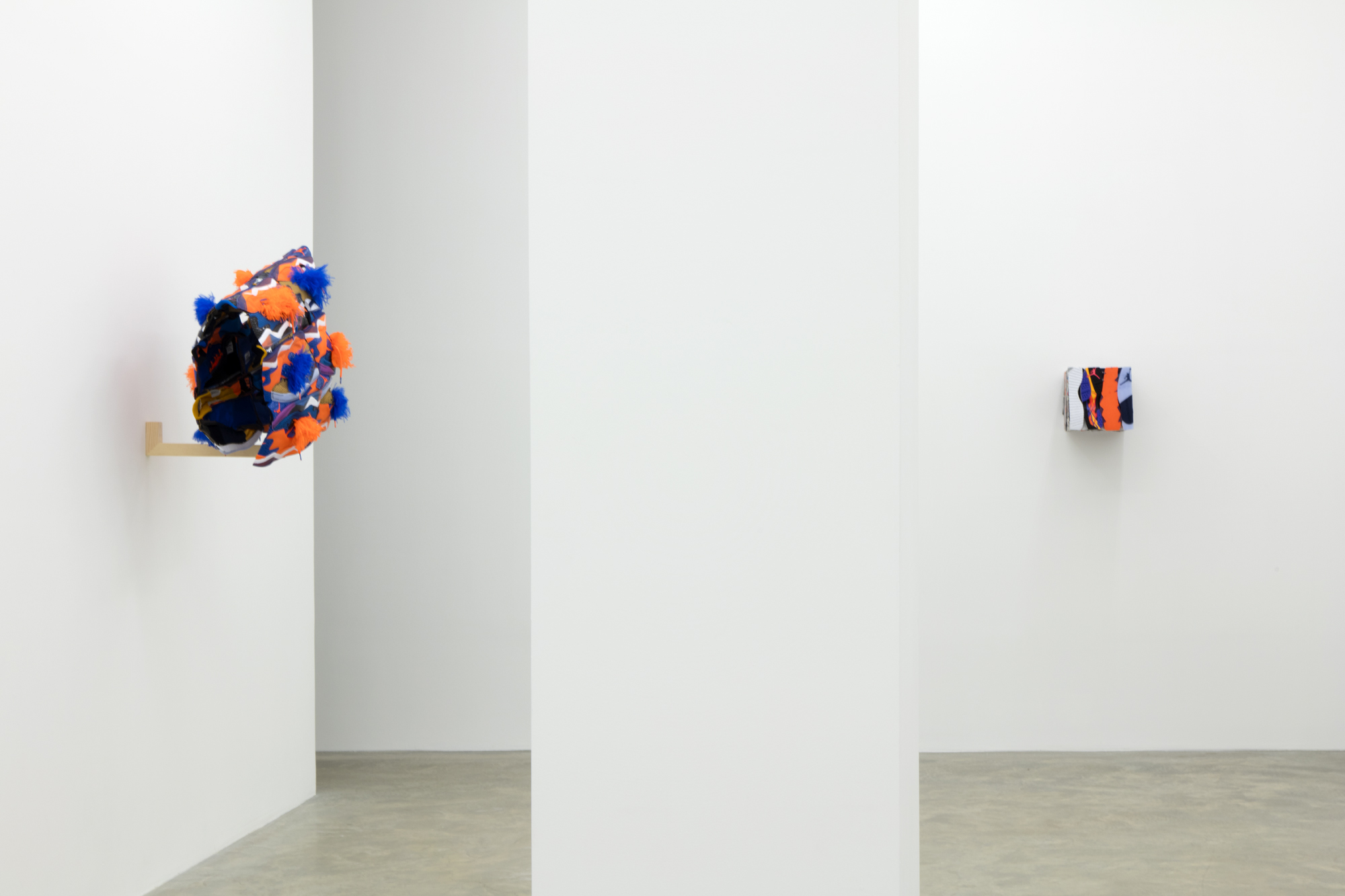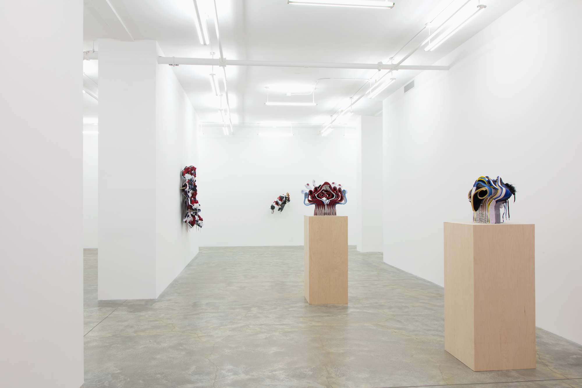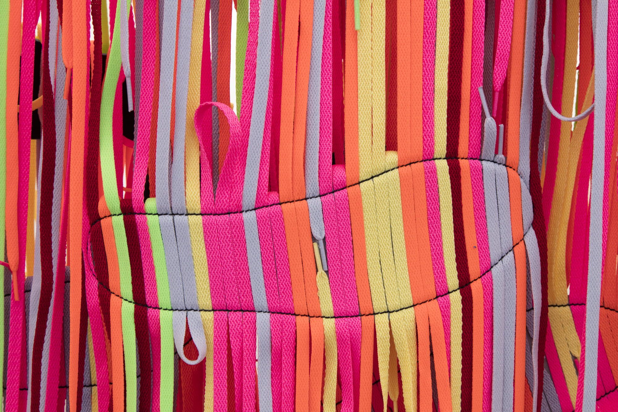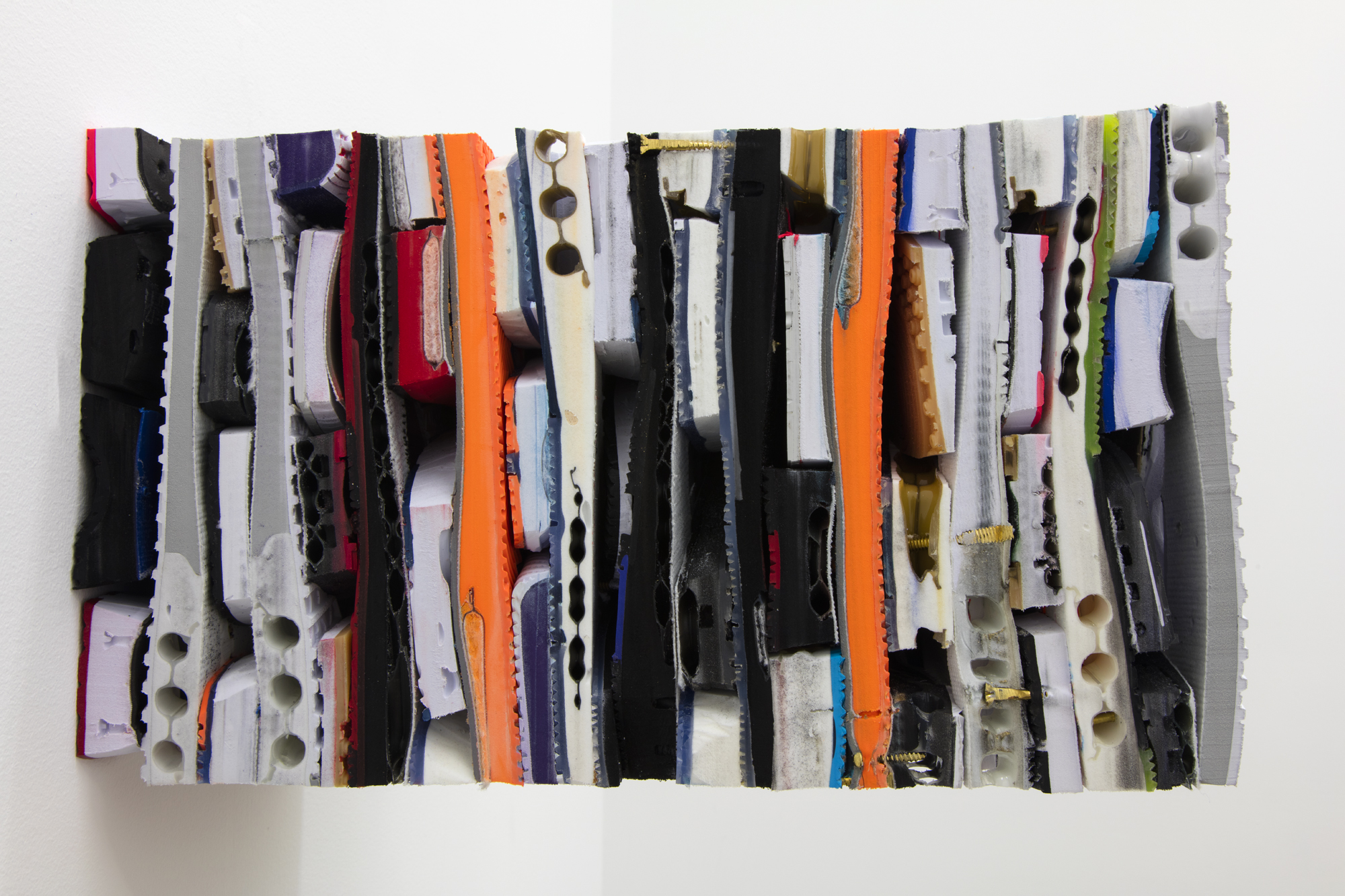 The components of the shoes independently support and embrace the renewed structures. Viewed in the round, the freestanding sculptures offer insight into Jungen’s technique of cutting through stacked and compressed rubber soles, for each layer of synthetic fabric, leather and rubber is exposed. To access the exhibition one must enter through a veil of fluorescent shoelaces, seamed onto insoles suspended from the ceiling. Conscious of using the whole shoe, the curtain walks us through time by incorporating remnants of soles left over from the first “Prototype for New Understanding” series. In wall reliefs, the artist taps into an anthropomorphic realm between the alien and familiar with unraveled and tufted shoelaces, indicative of the use of humanhair in previous work. In many respects, the resulting formation simulates the futuristic design of the Air Jordan as it exists in today’s market.