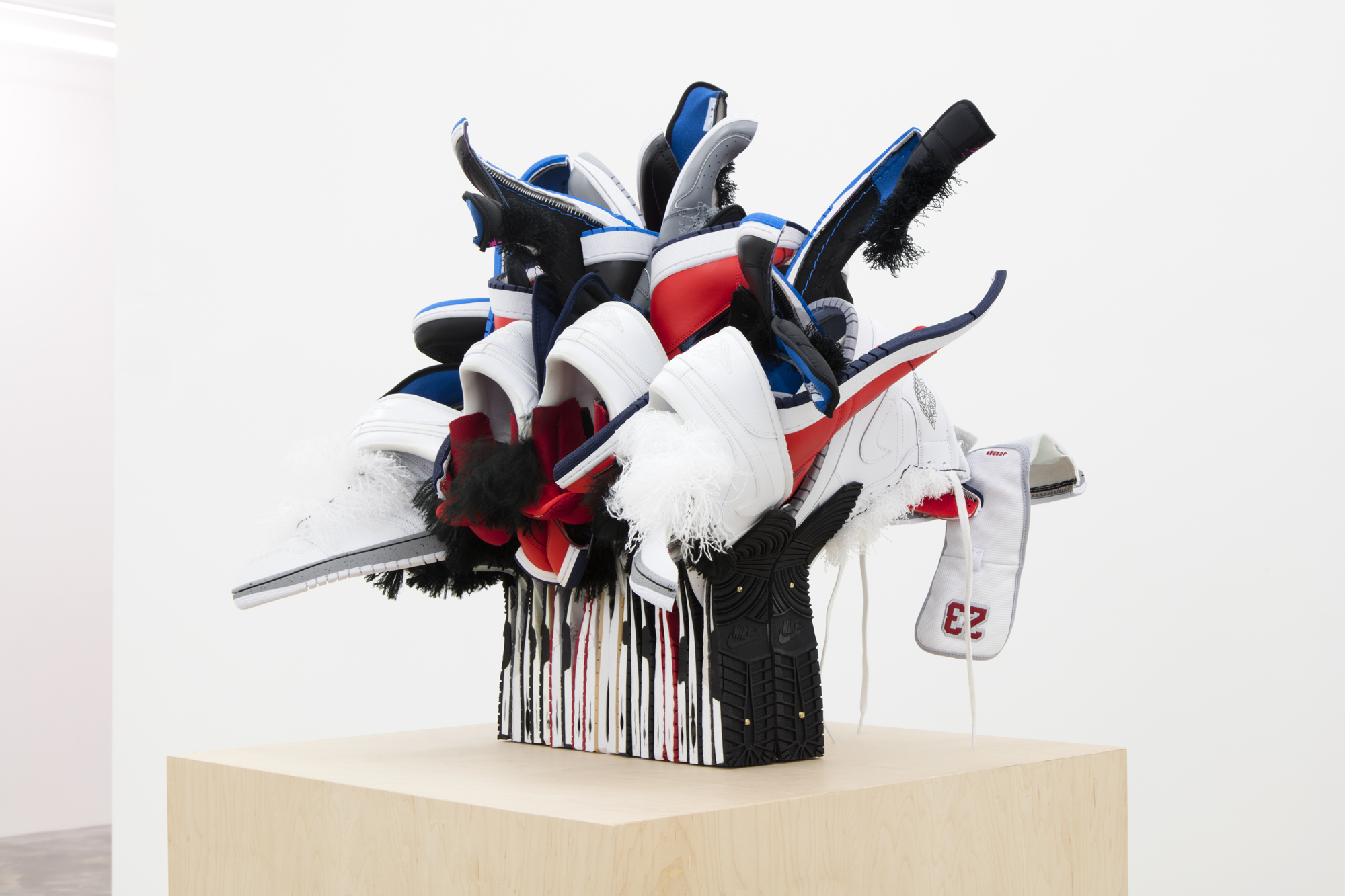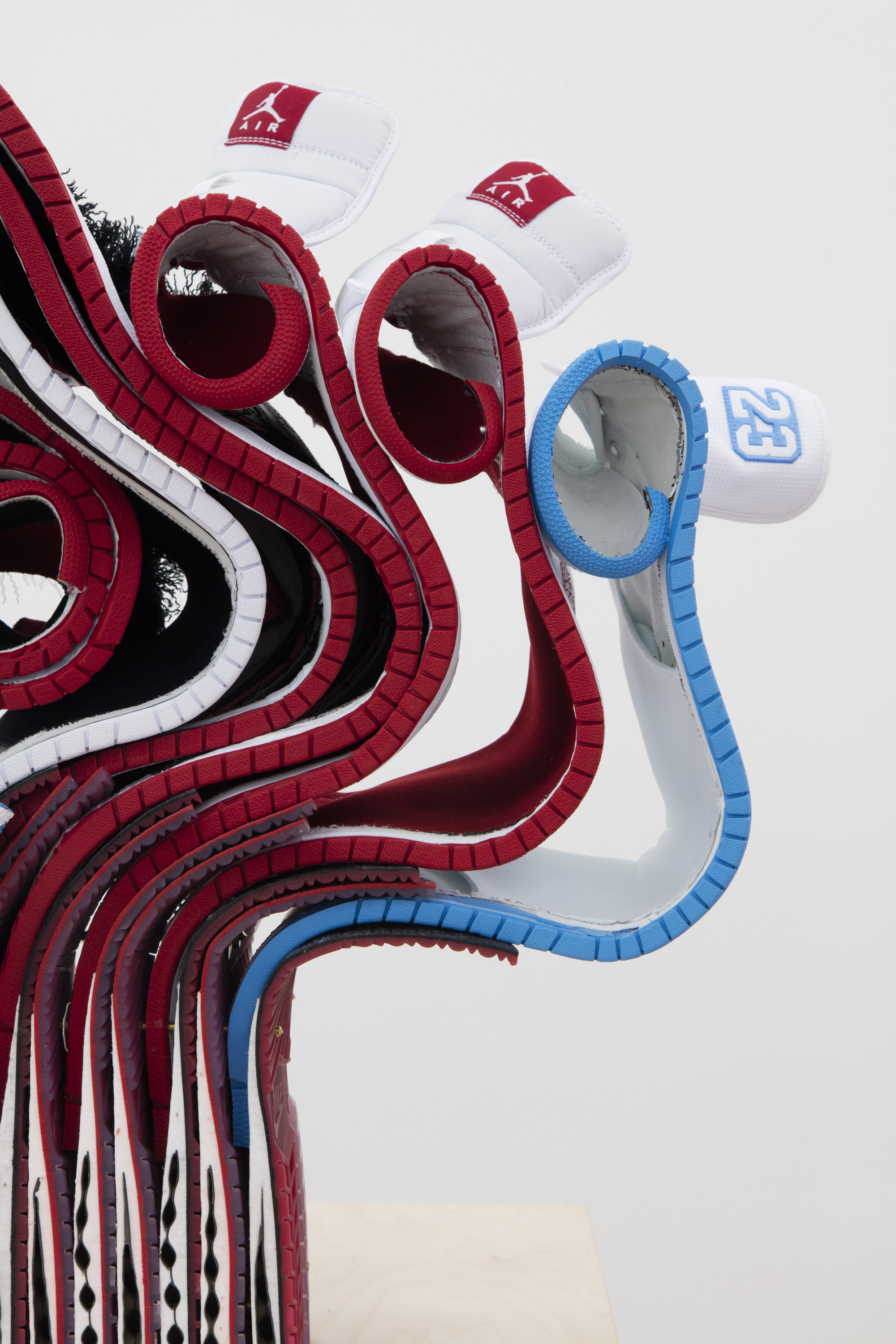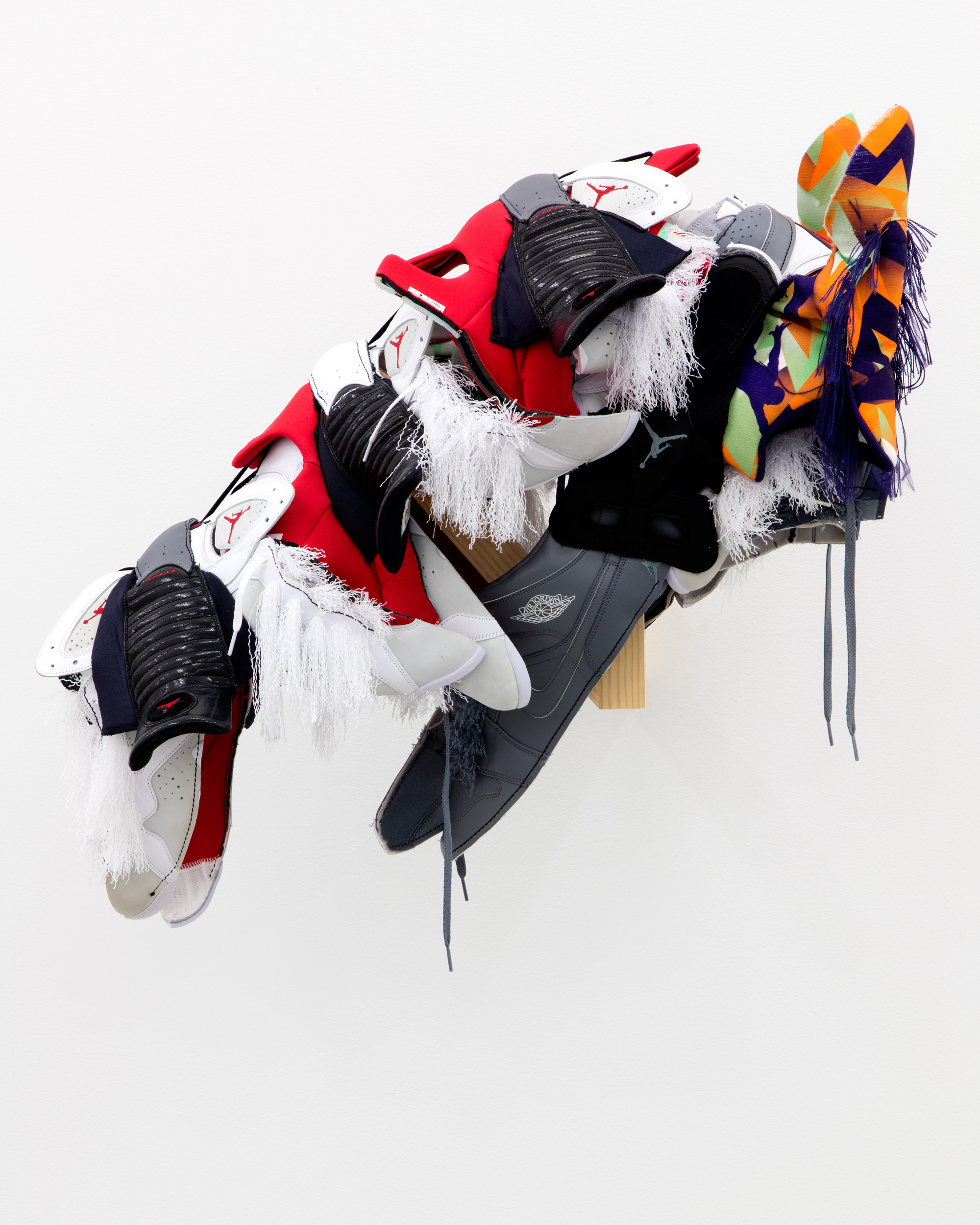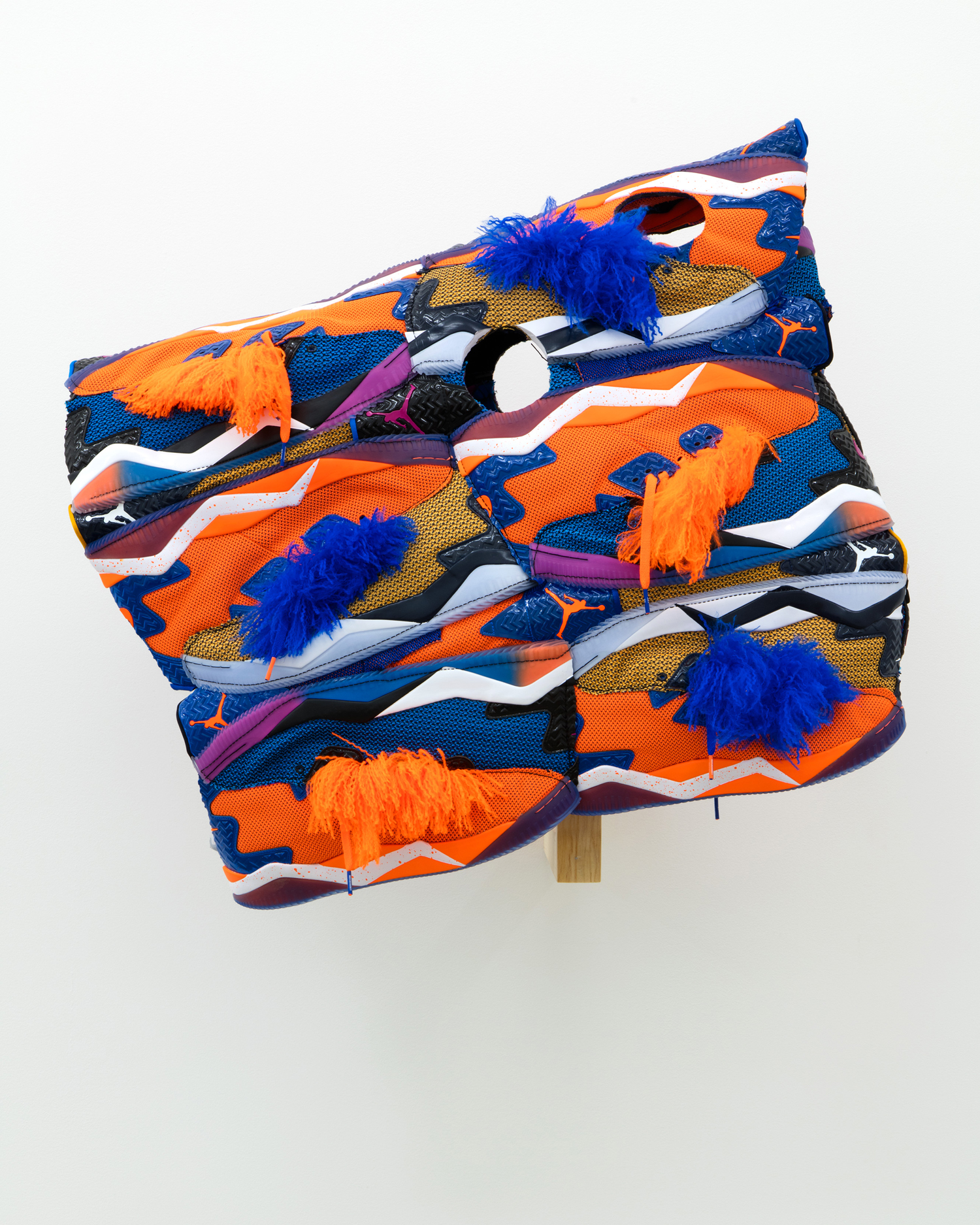 In the past, and specifically for those hailing from Jungen’s hometown, the limited editions of the Nike Air Jordans were practically unattainable. With Nike’s new mass-market approach and broadened international scope in recent years, not to mention the increased accessibility of the Internet, the trainers have become a ubiquitous commodity. Iconic still, their cultural and luxury implications have changed over time. Jungen has altered his treatment and handling of the material to reflect this new understanding and as the result, his newest sculptures can no longer be labeled as prototypes.