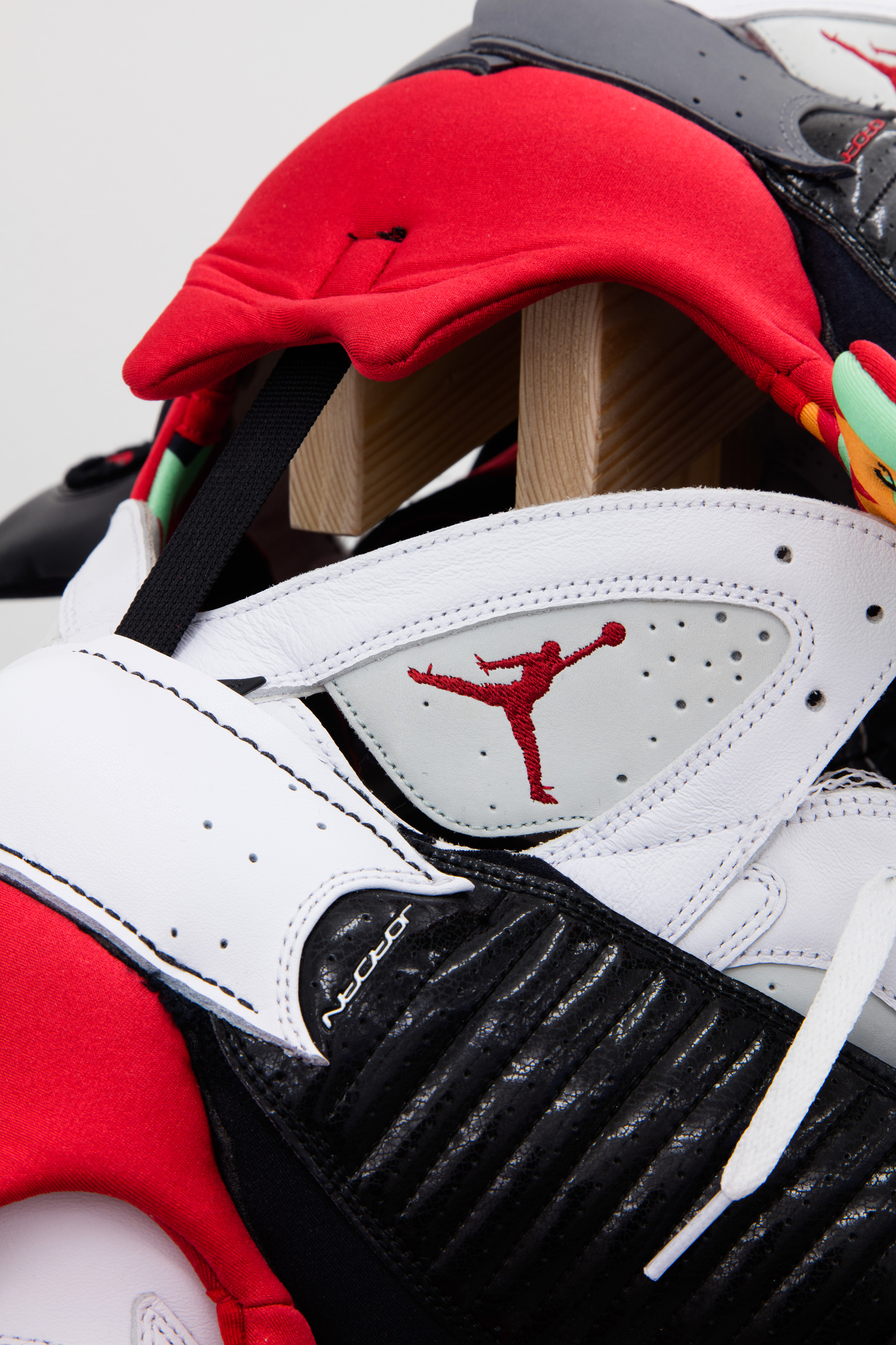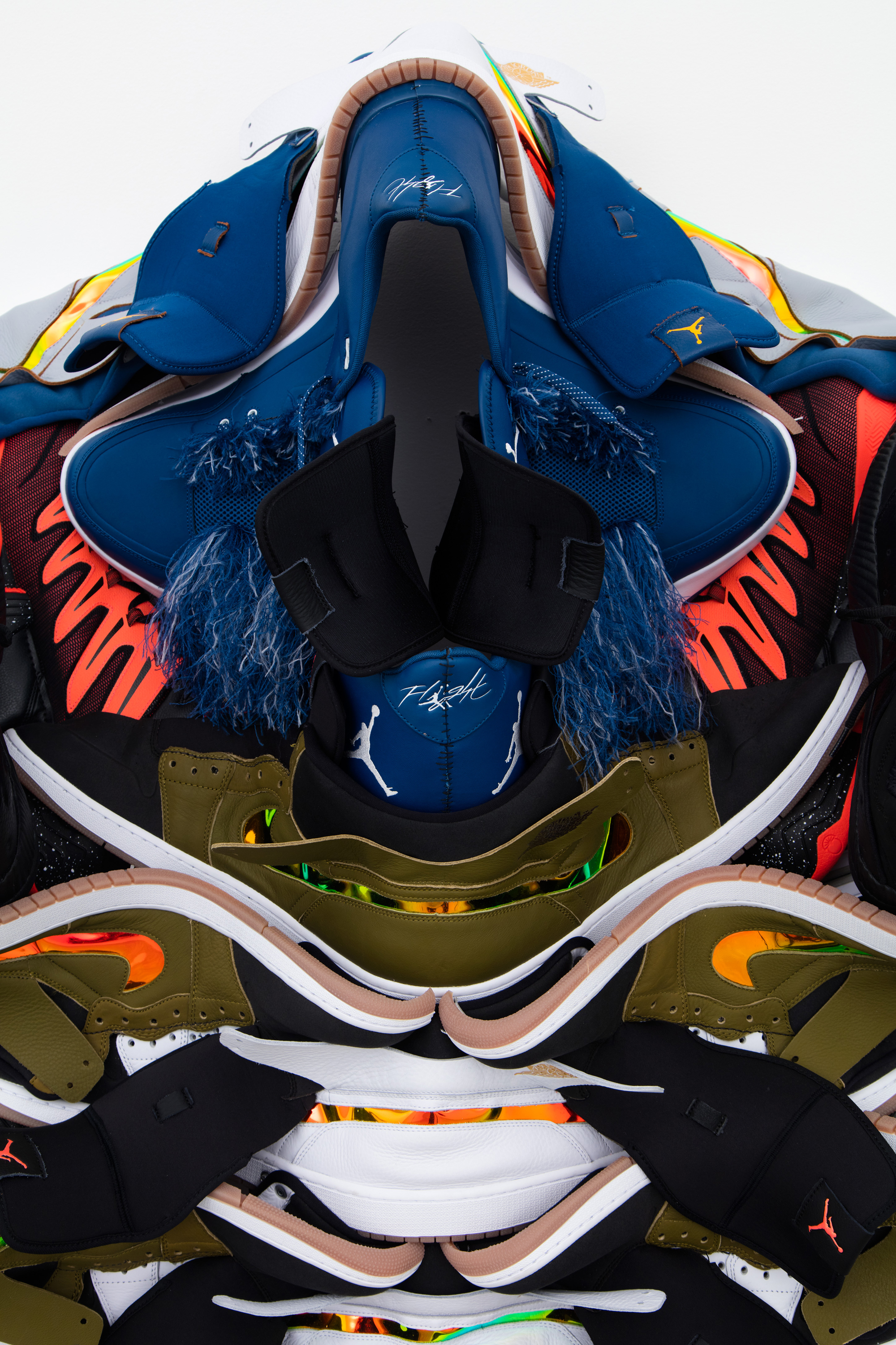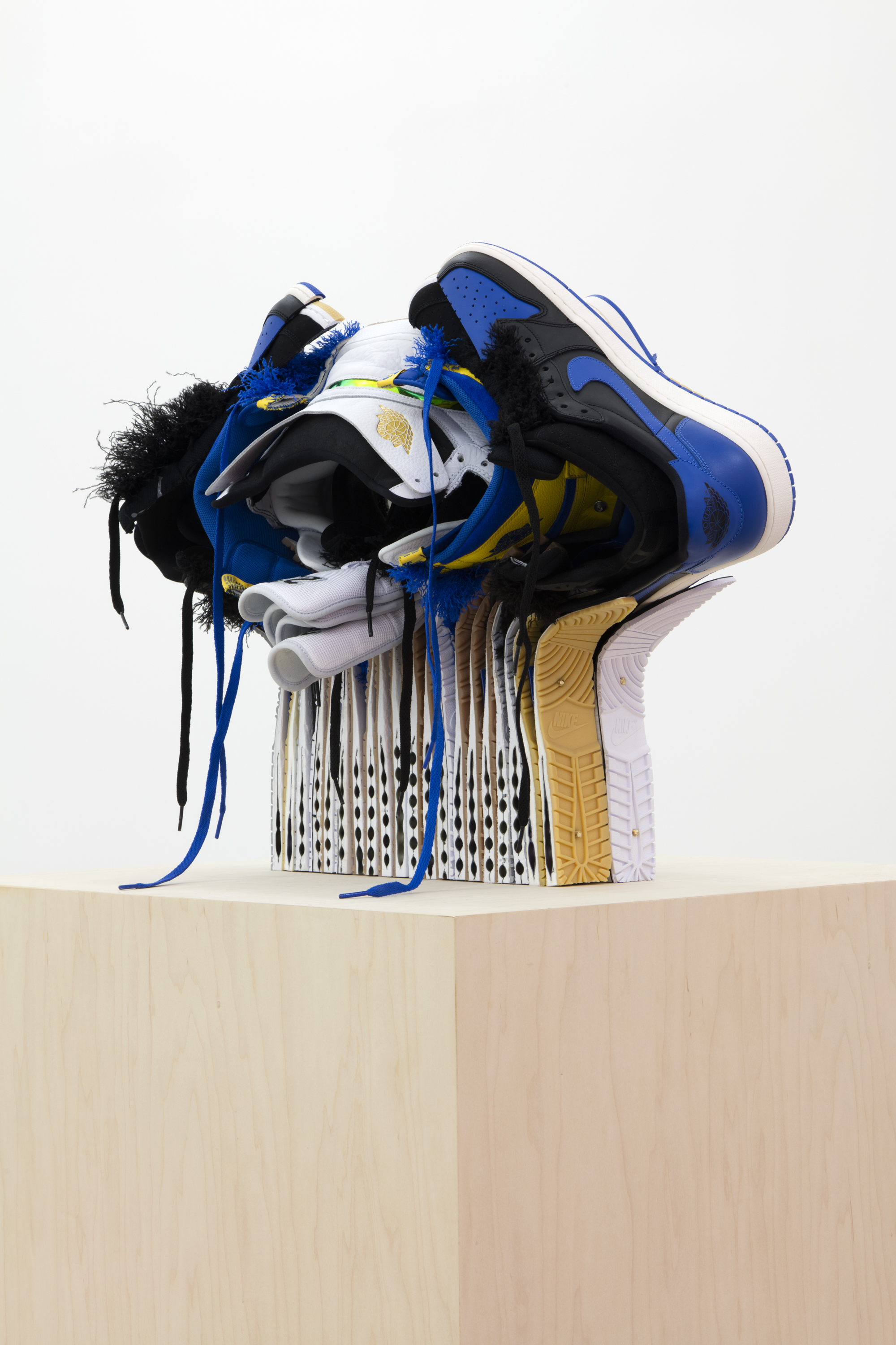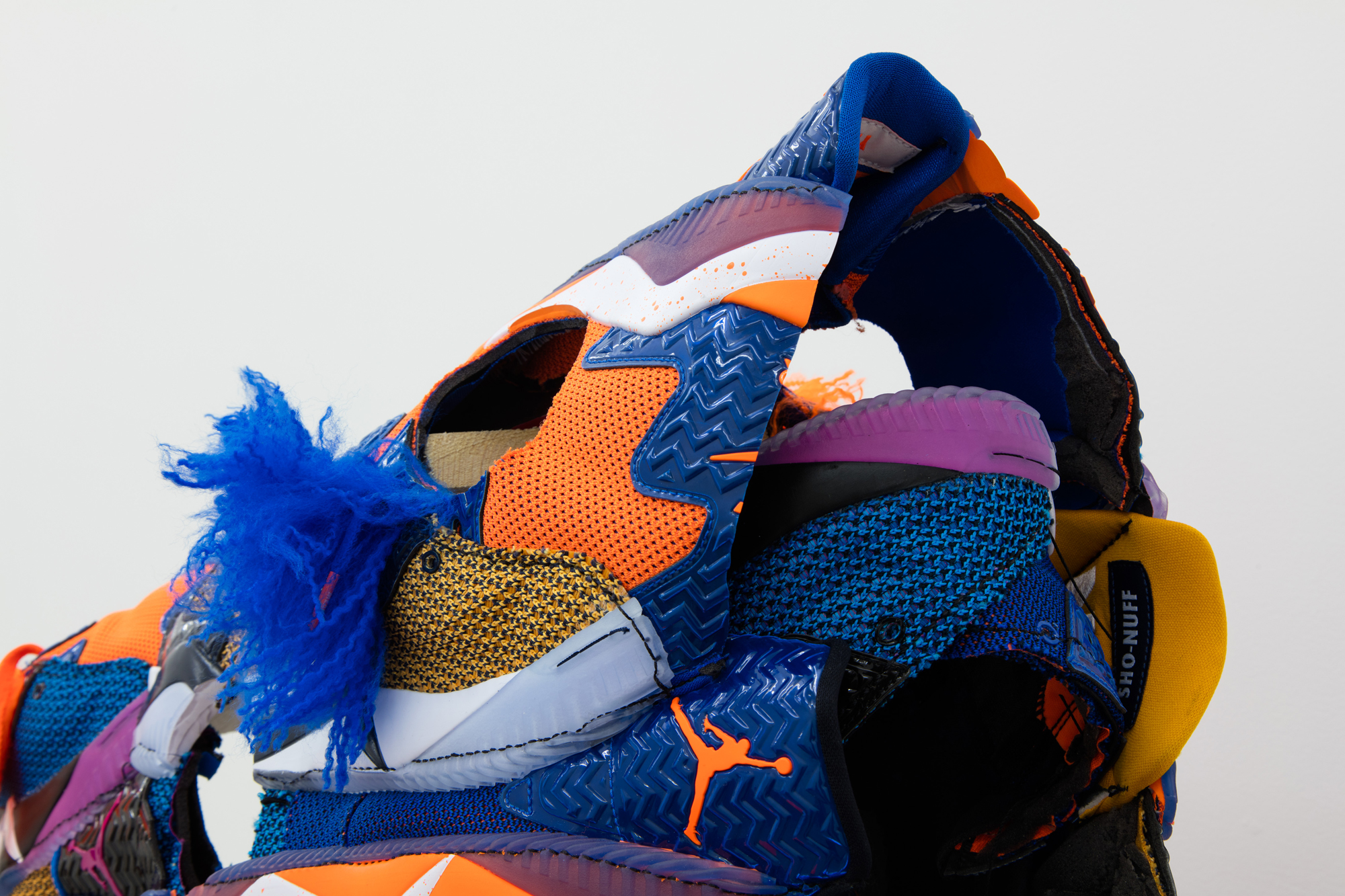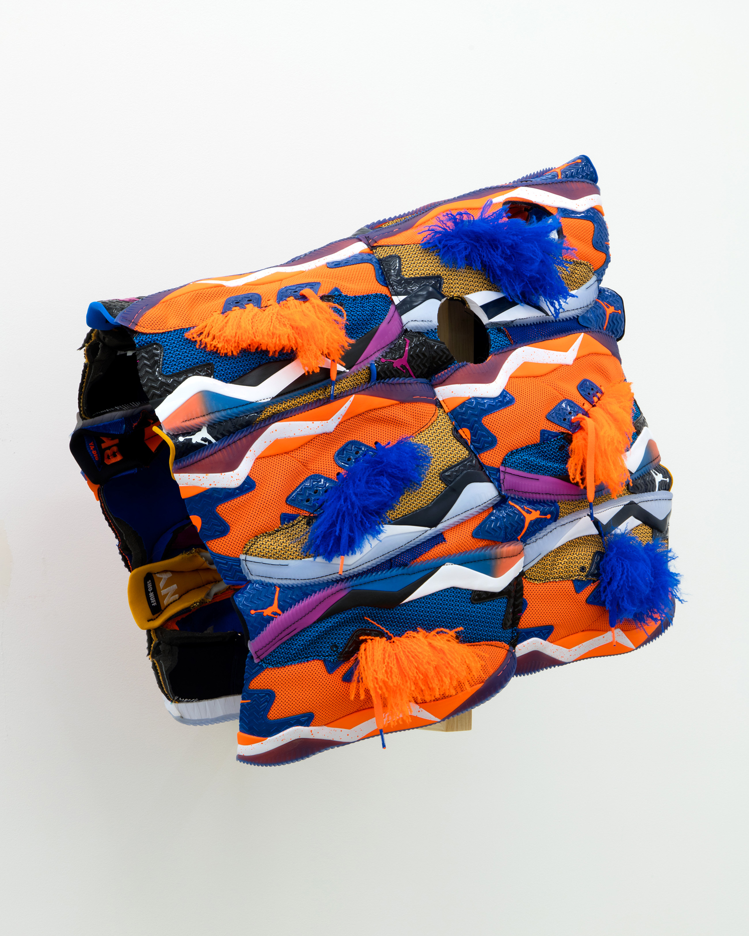 In the past, and specifically for those hailing from Jungen’s hometown, the limited editions of the Nike Air Jordans were practically unattainable. With Nike’s new mass-market approach and broadened international scope in recent years, not to mention the increased accessibility of the Internet, the trainers have become a ubiquitous commodity. Iconic still, their cultural and luxury implications have changed over time. Jungen has altered his treatment and handling of the material to reflect this new understanding and as the result, his newest sculptures can no longer be labeled as prototypes.