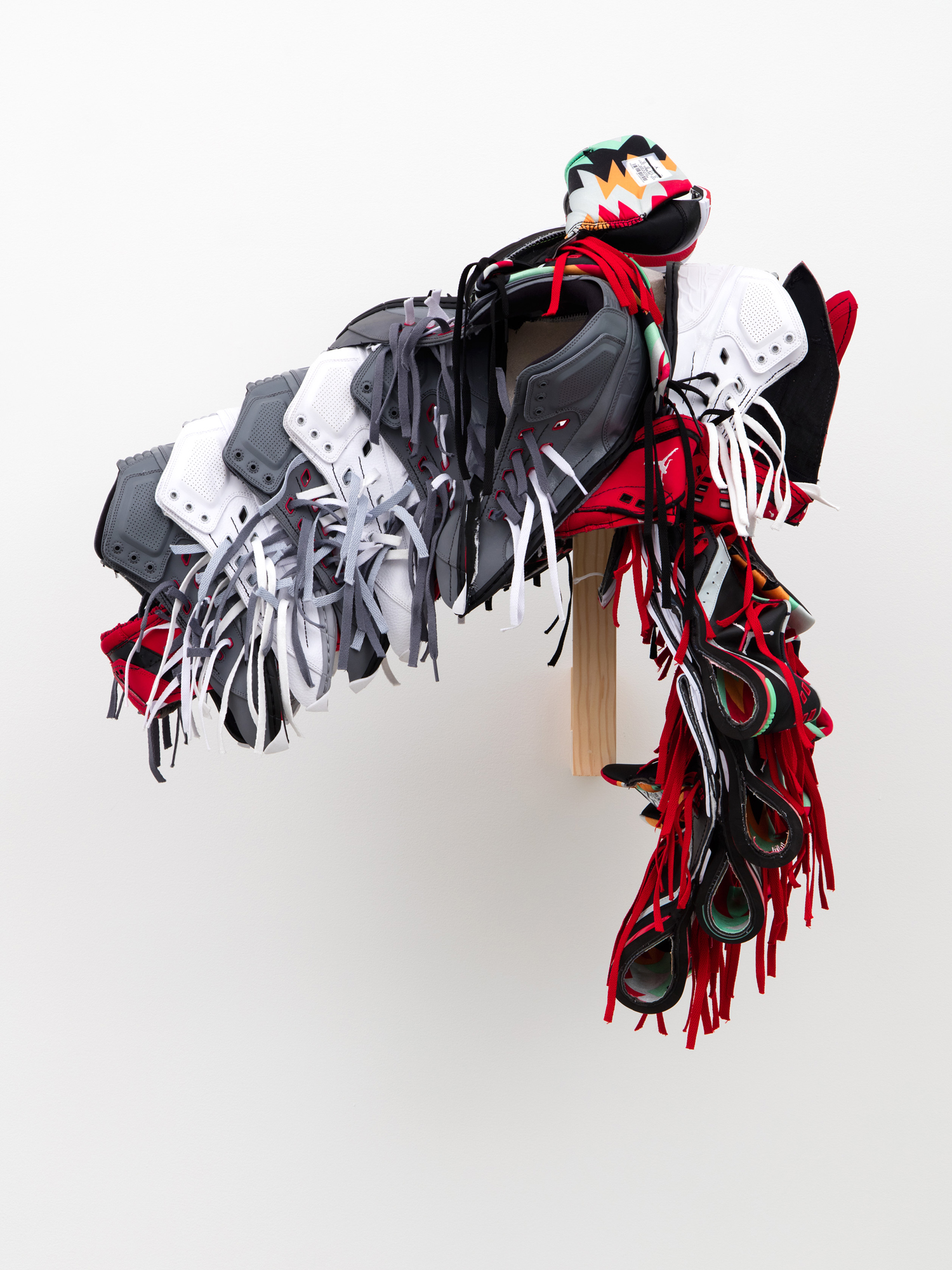 Since his last show in the gallery in 2011, Jungen has relocated his home and studio to a more remote location outside of Vancouver. While his earlier work laid the groundwork for a commentary on indigenous stereotypes and notions of dual heritage, his more recent and continued experiences with his native culture prompted a palpable structural and material transformation in his practice. With his more frequent returns to Northern B.C. in recent years, Jungen learned the traditional techniques of his First Nations people, including animal hide crafts and drum making. He also resumed skills cultivated while growing up on his family’s farm among the Doig River community, such as hunting and horseback riding. (As an avid horseman, some of the mask-like works presented in this exhibition were tailored specifically for one of his horses). Untying himself from a refined treatment of resources, while maintaining his own presence with hand-sewing and carving, the works presented are liberated in an honest portrayal of material metamorphosis which is in direct engagement with the artist’s lifestyle. Residing now on his ranch, his process includes the use of varying shop tools such as industrial sewing machines (originally used for horse saddles) and bandsaws (operated daily on the ranch). Jungen uses only preexisting hardware in an attempt to minimize the visibility of extraneous materials and display devices. Incorporating all of the components of the shoes in an increasingly autonomous approach to modernist composition, the consumable, wearable objects have self-generated as sculpture.