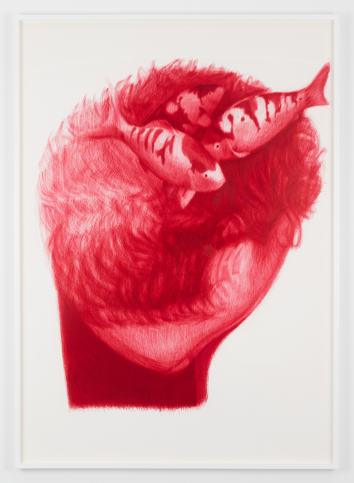 profile. Viewed from peculiar downward angles, the agitated red Biro drawings are guided by striations of color and