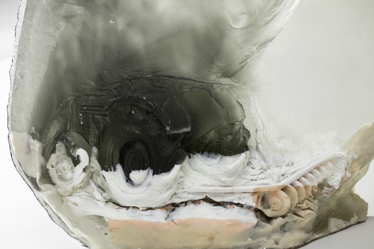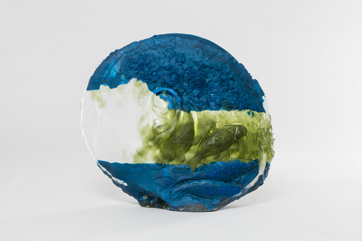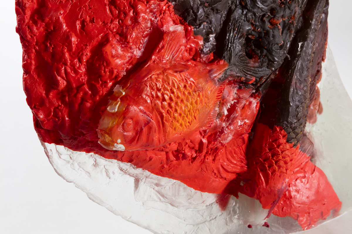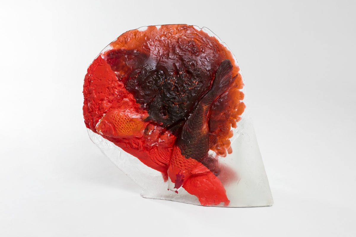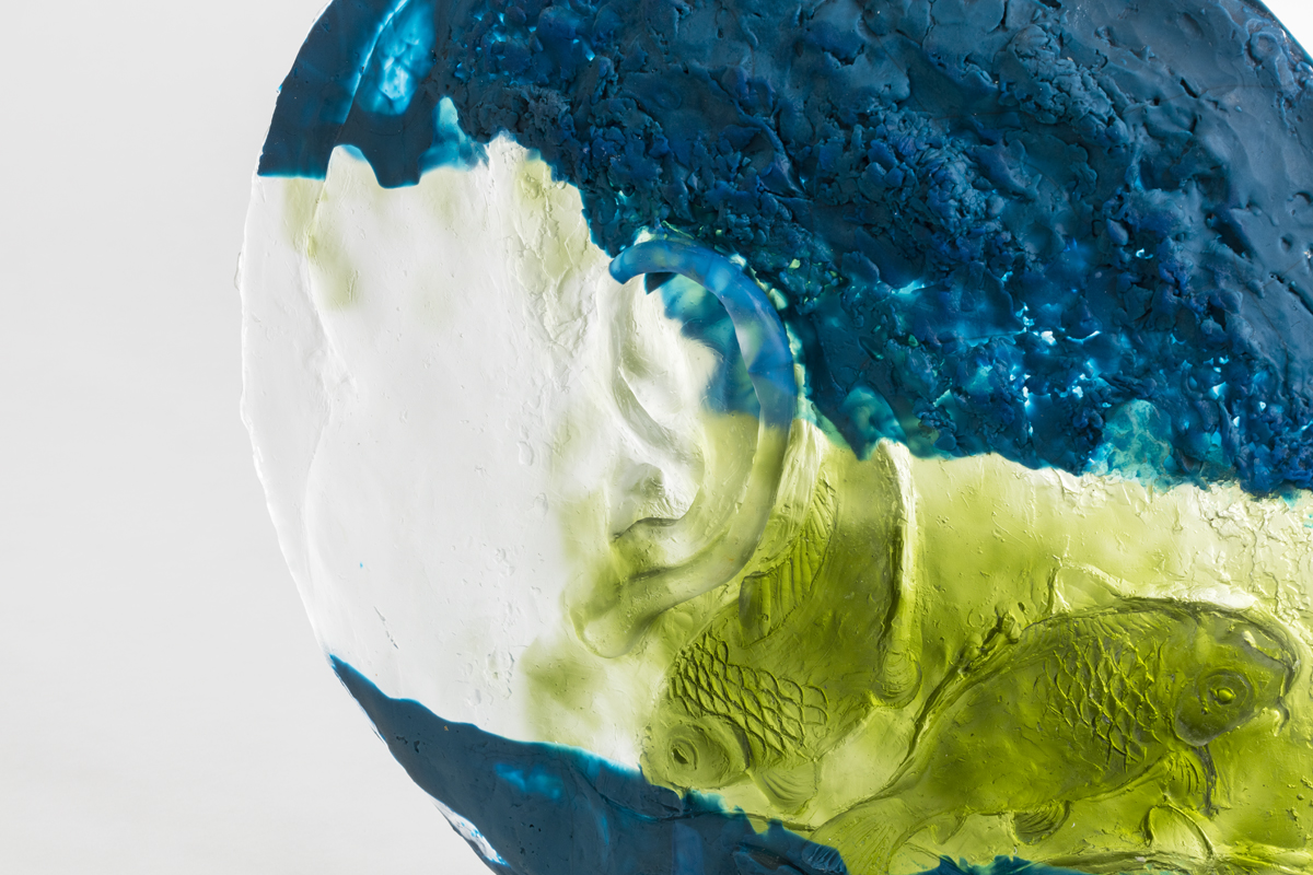 The spherical glass heads contain recurring motifs within Perrone’s practice. Imagery of koi fish and tractors circle the