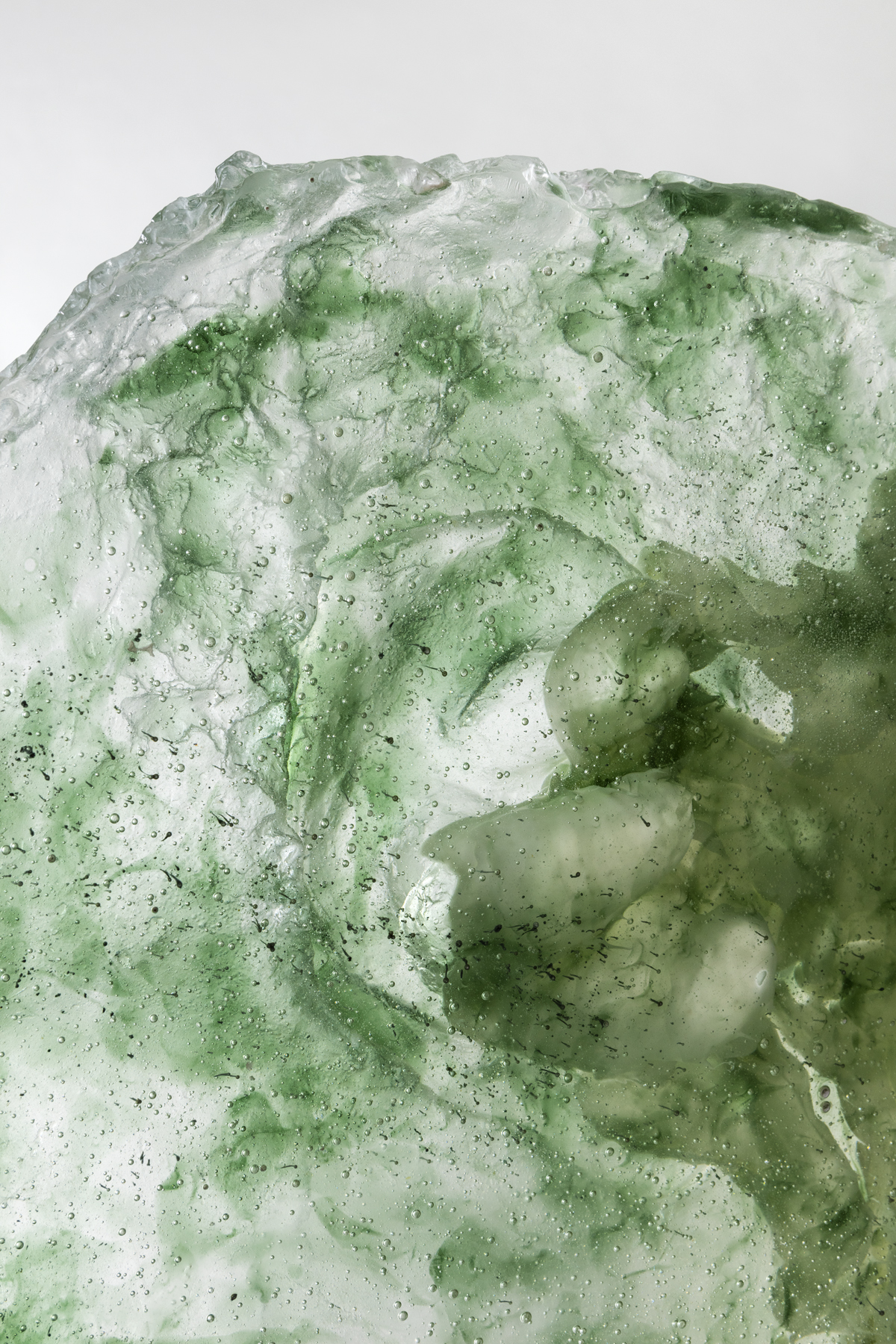 end, immiscible liquids are paused in a forced interaction within each glass sculpture. This tumultuous phase, resulting