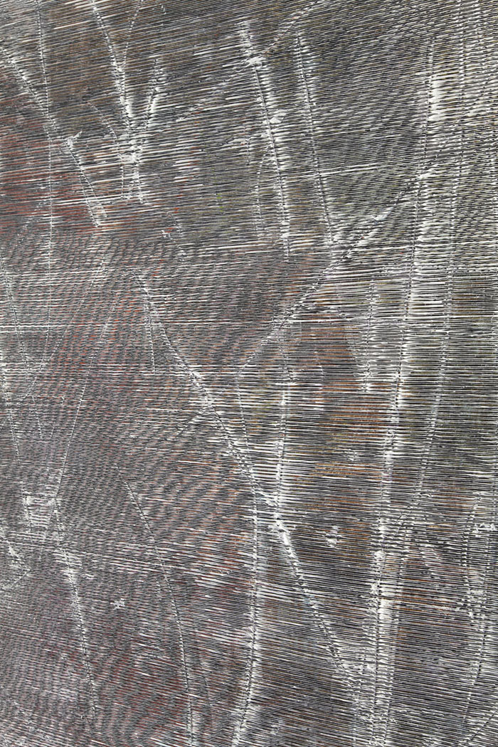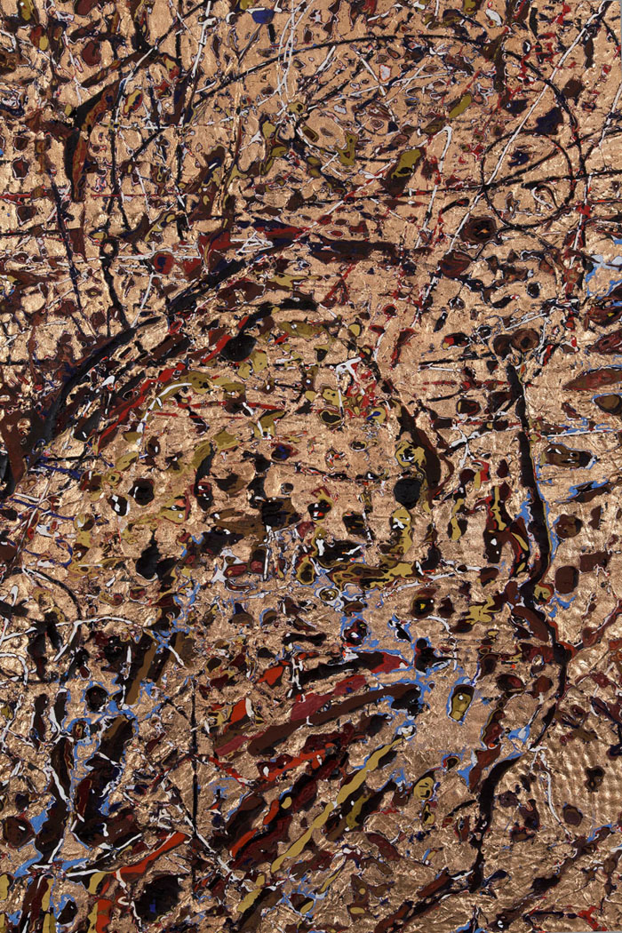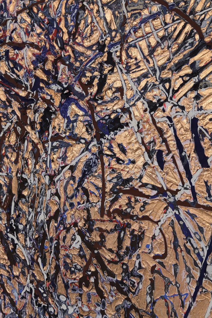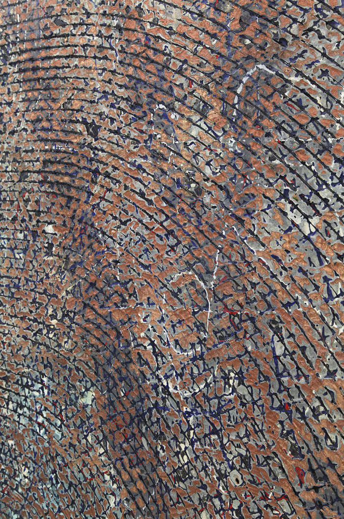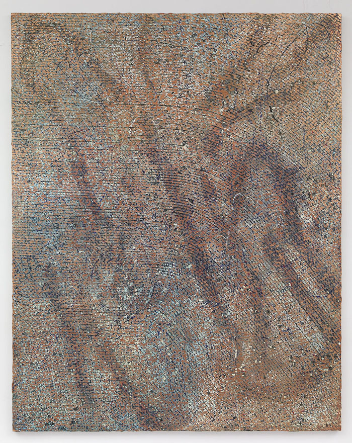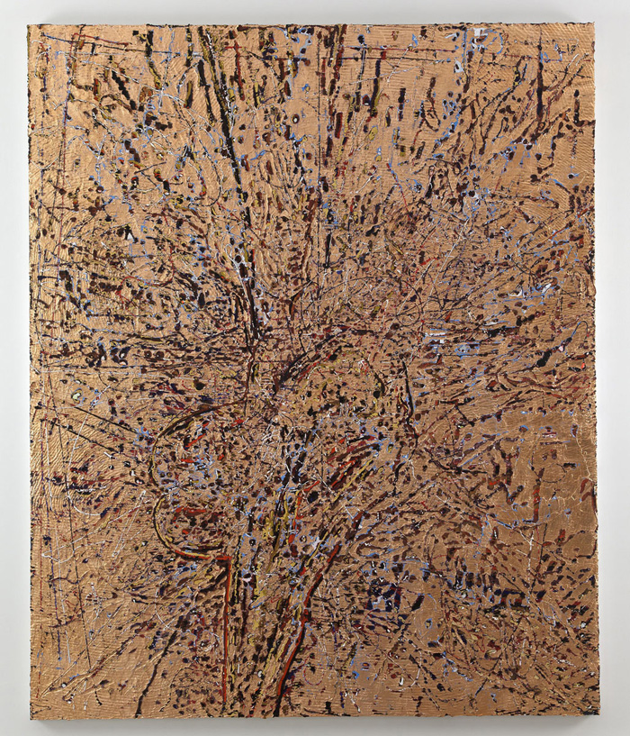 The brazen finish of new copper works acts in direct and conscious opposition to the deceptively staid appearance of Weiser’s interference-pattern paintings, with their molten finish that is almost geologic in its force. Weiser first applies piles of colored paint in a free form and gestural manner. The copper membrane then covers and in effect hides the expressionistic under-painting. The works then become sites of excavation. Weiser uses a razor blade to scrape and gouge their surfaces with an intensity that at times punctures through the canvas itself. The brevity of the physical cut negates the series of fluid actions that precedes it. As the incision follows the impulsive and spontaneous gestures, they are rendered topological, hard-edged, and graphic – a slice reveals the heaped residue of a now dissolved process.
