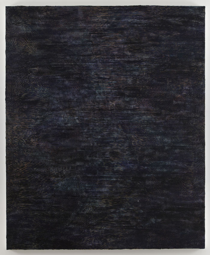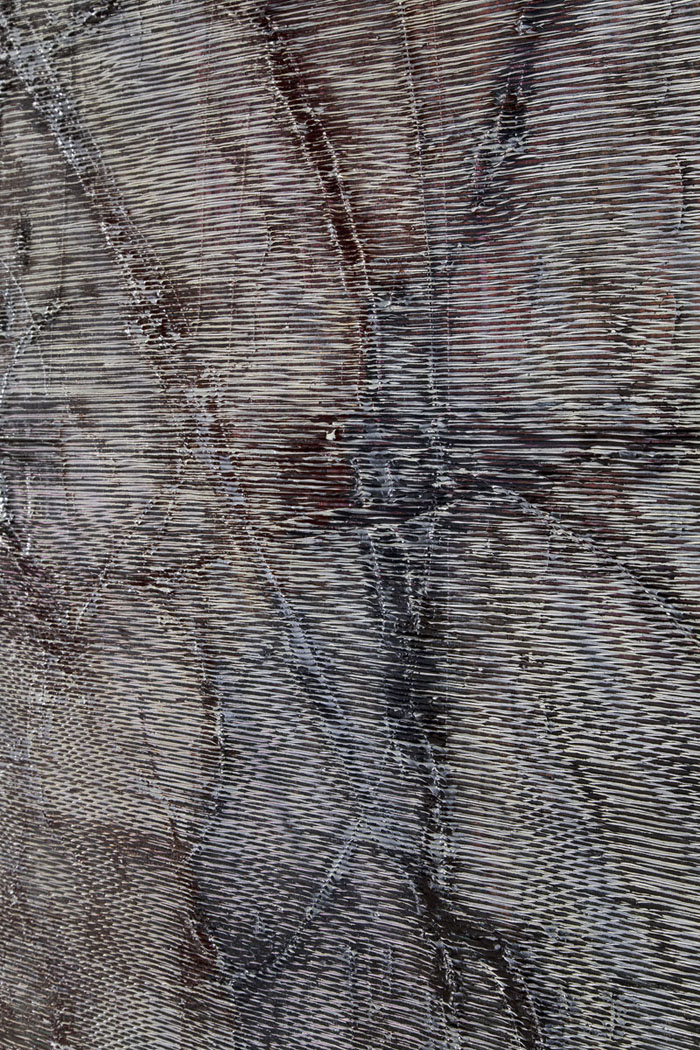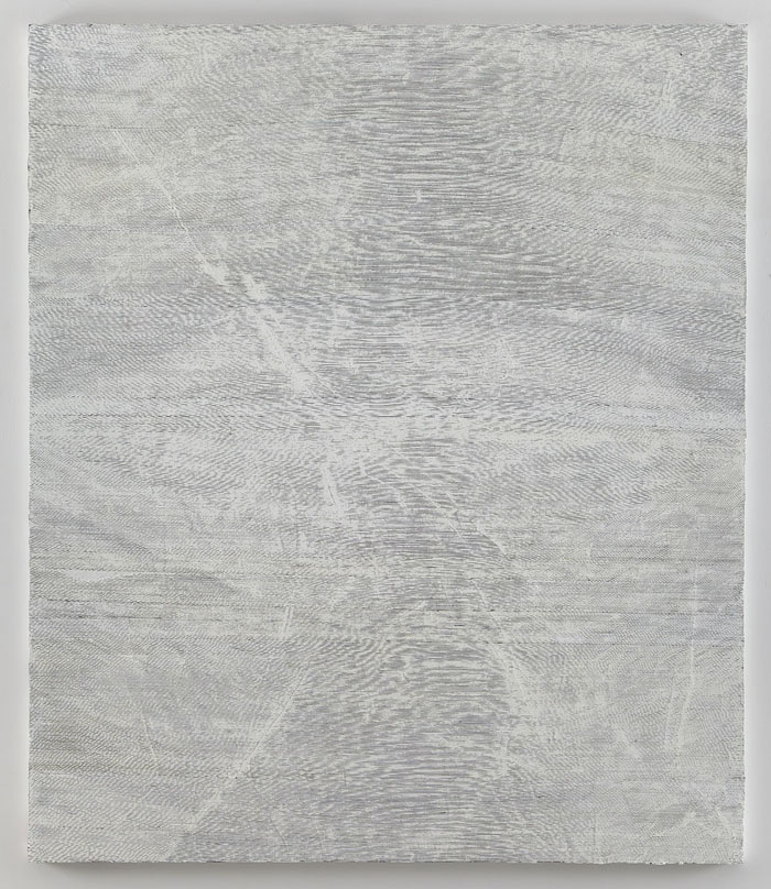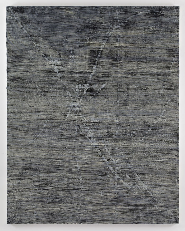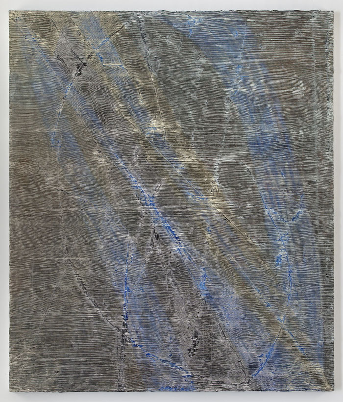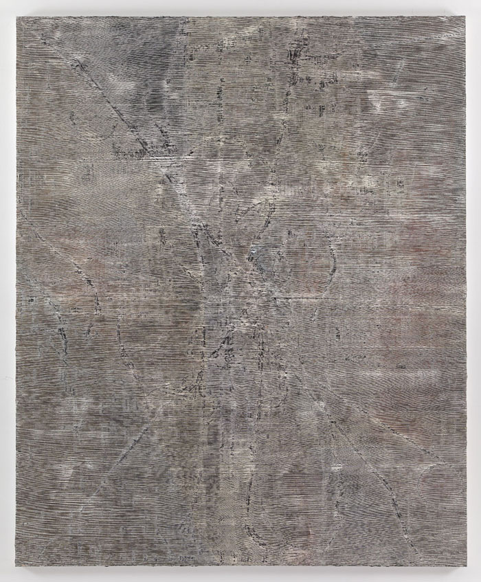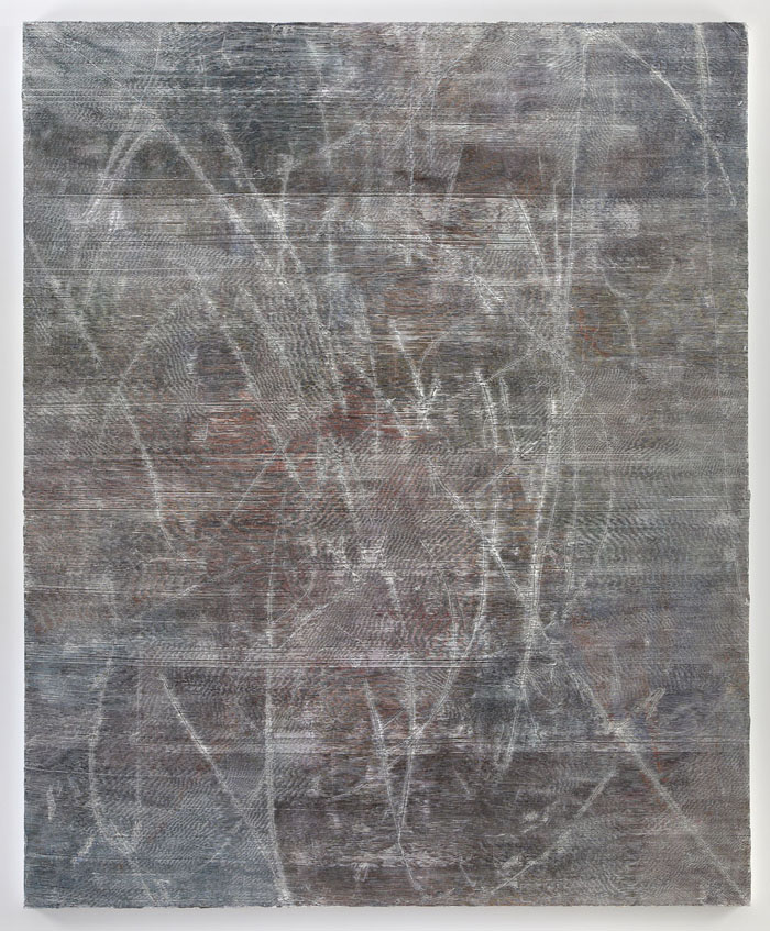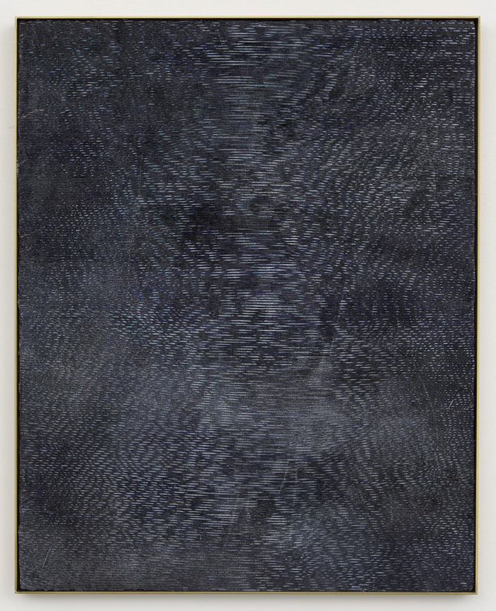 New interference-pattern works disguise themselves as monochromes and forgo the spinal element that characterized previous paintings, instead favoring an allover composition. Creating an attention that lingers on the surface, the pattern functions less as a screen and more as a barrier, limiting access to the painting’s layers. Despite maintaining their references to digital distortion and abstract organic patterns (such as wood grain and aquatic vibration as well as the mathematic correlations between the two), these works do not merely create an optical effect. Their muddled and degraded edges work to give shape to a pulsing, auditory hum. In some cases, the interference-pattern is slashed or scarred, interrupted by blistering lacerations that appear at once to be erupting from the under-painting and attacked on the surface. In other works, pigmented dust is applied as a final layer, which in a brief moment collapses the space and layers of the painting into a singular plane, as if they were cast in stone.