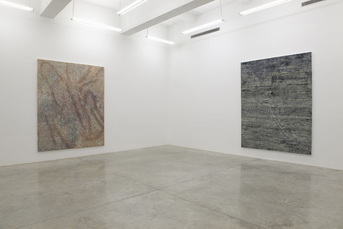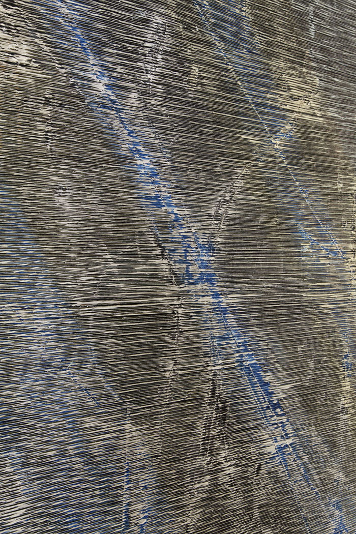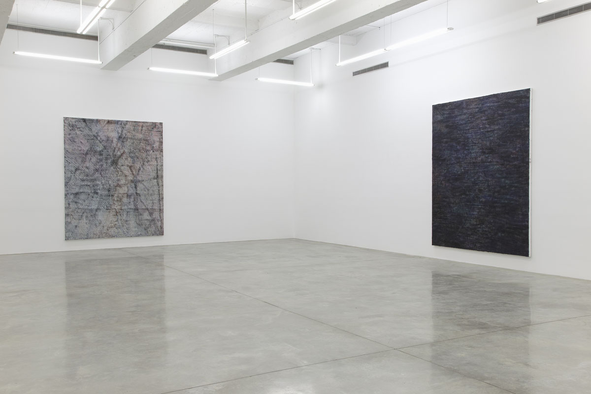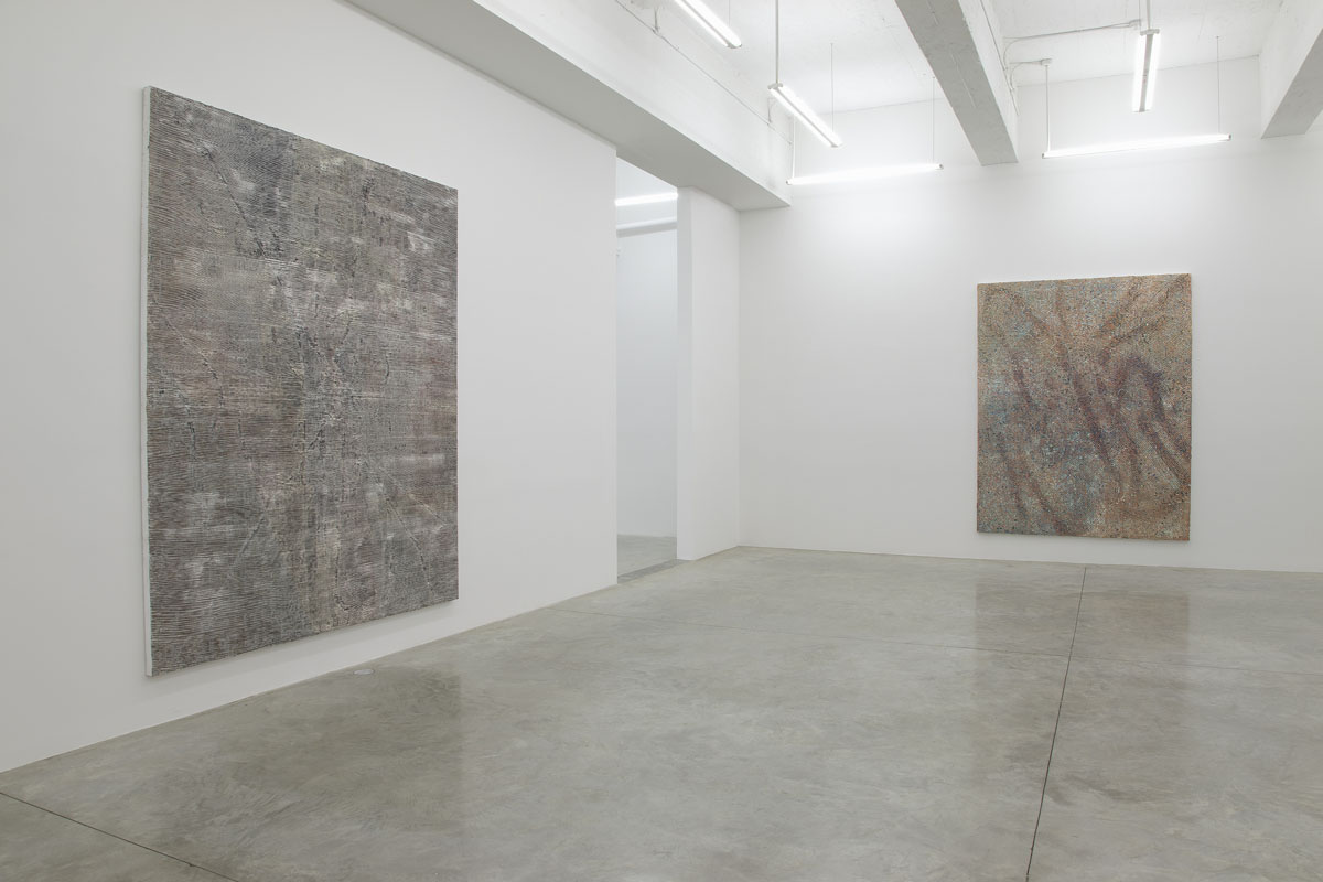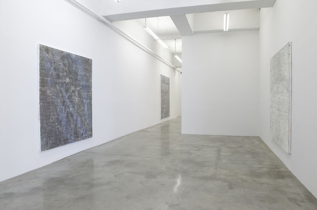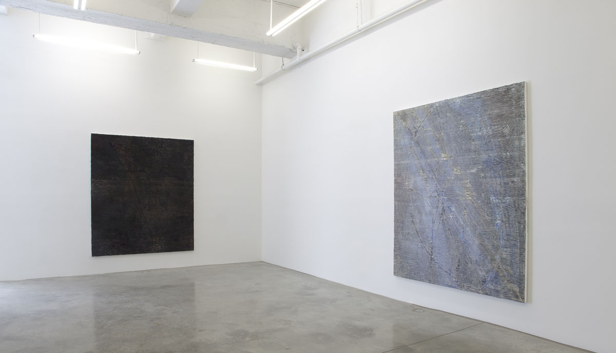 New interference-pattern works disguise themselves as monochromes and forgo the spinal element that characterized previous paintings, instead favoring an allover composition. Creating an attention that lingers on the surface, the pattern functions less as a screen and more as a barrier, limiting access to the painting’s layers. Despite maintaining their references to digital distortion and abstract organic patterns (such as wood grain and aquatic vibration as well as the mathematic correlations between the two), these works do not merely create an optical effect. Their muddled and degraded edges work to give shape to a pulsing, auditory hum. In some cases, the interference-pattern is slashed or scarred, interrupted by blistering lacerations that appear at once to be erupting from the under-painting and attacked on the surface. In other works, pigmented dust is applied as a final layer, which in a brief moment collapses the space and layers of the painting into a singular plane, as if they were cast in stone.