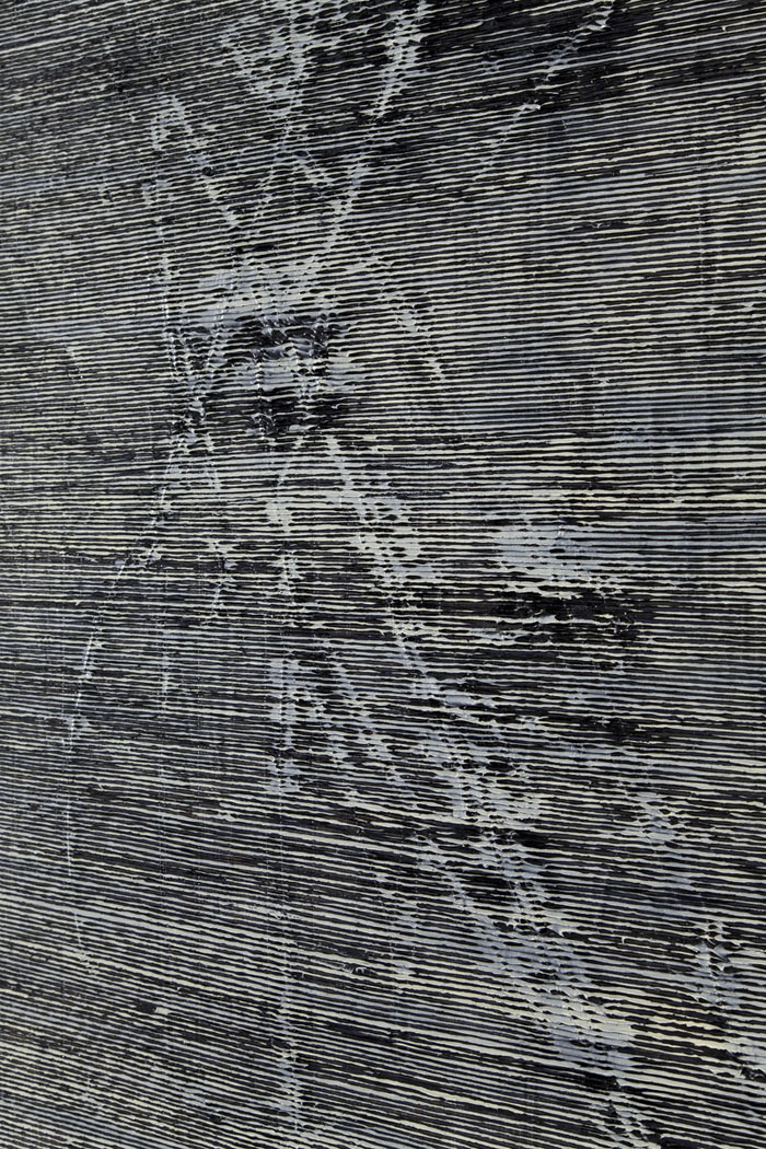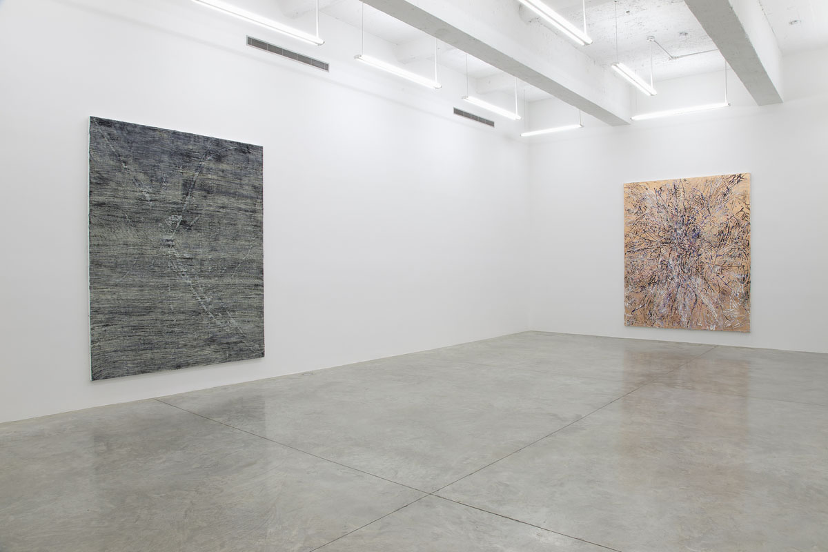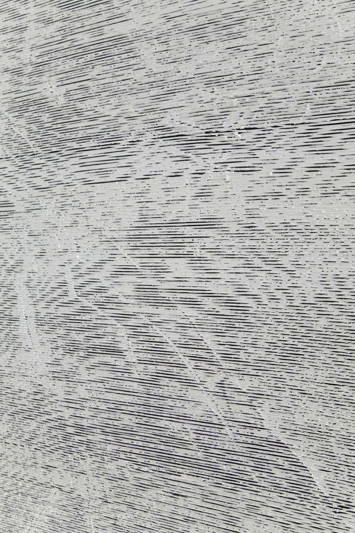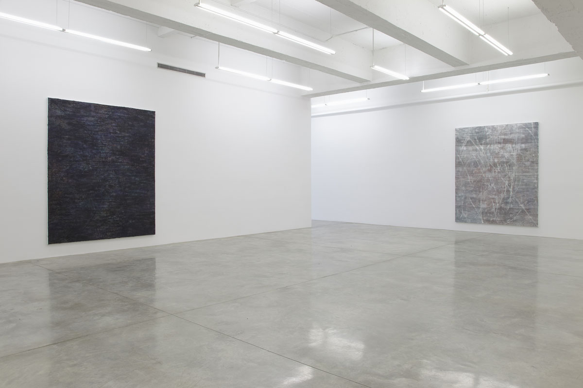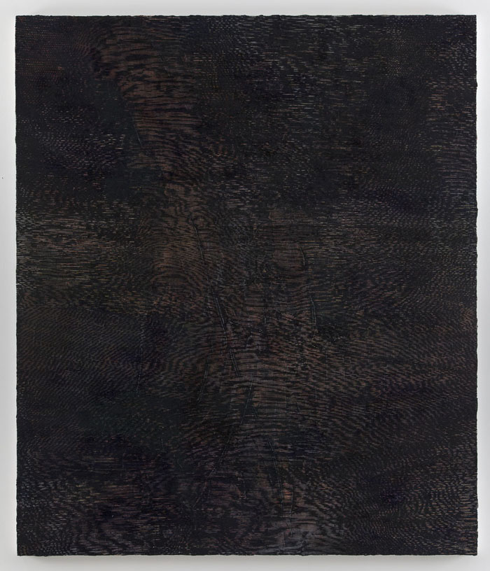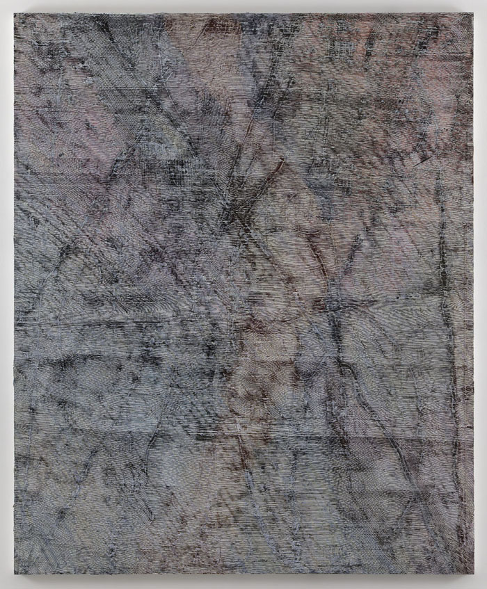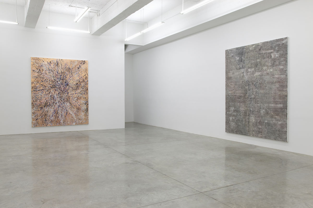 New interference-pattern works disguise themselves as monochromes and forgo the spinal element that characterized previous paintings, instead favoring an allover composition. Creating an attention that lingers on the surface, the pattern functions less as a screen and more as a barrier, limiting access to the painting’s layers. Despite maintaining their references to digital distortion and abstract organic patterns (such as wood grain and aquatic vibration as well as the mathematic correlations between the two), these works do not merely create an optical effect. Their muddled and degraded edges work to give shape to a pulsing, auditory hum. In some cases, the interference-pattern is slashed or scarred, interrupted by blistering lacerations that appear at once to be erupting from the under-painting and attacked on the surface. In other works, pigmented dust is applied as a final layer, which in a brief moment collapses the space and layers of the painting into a singular plane, as if they were cast in stone.