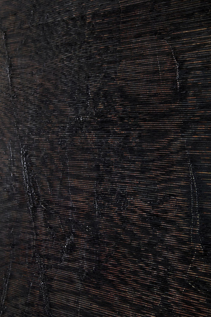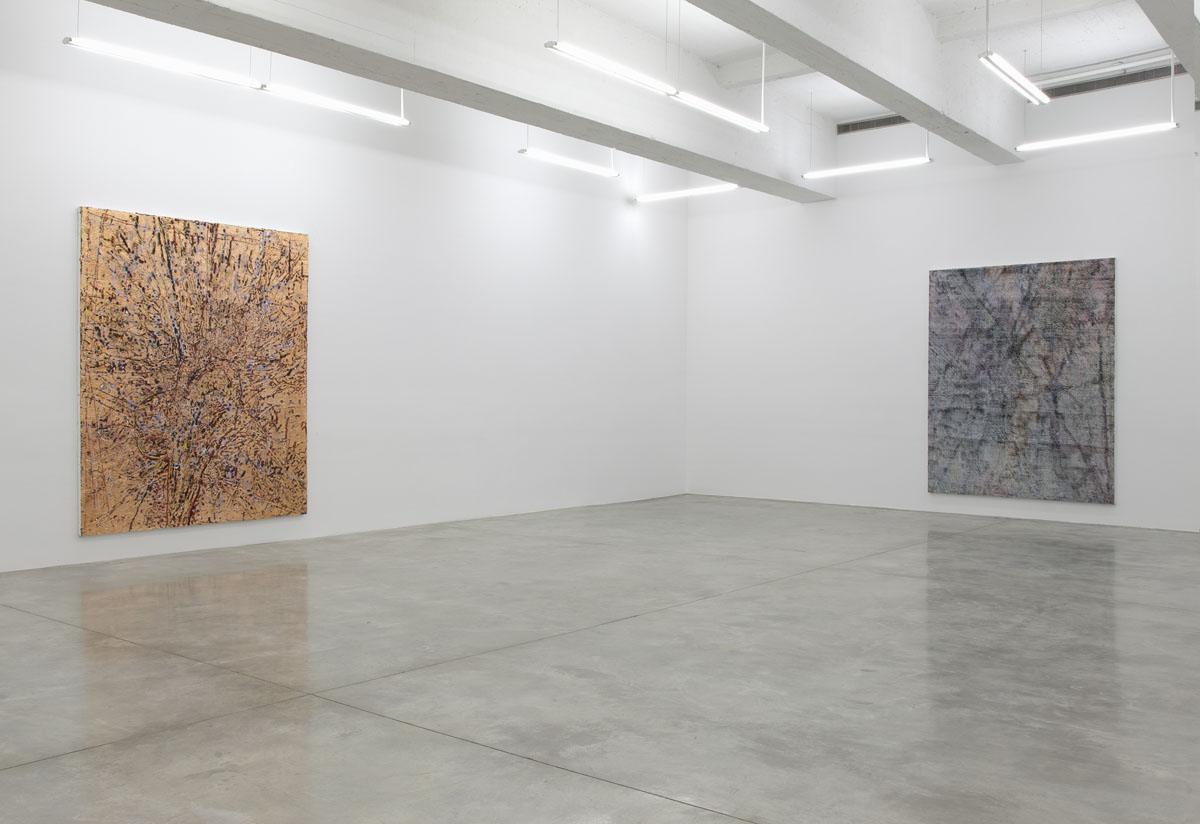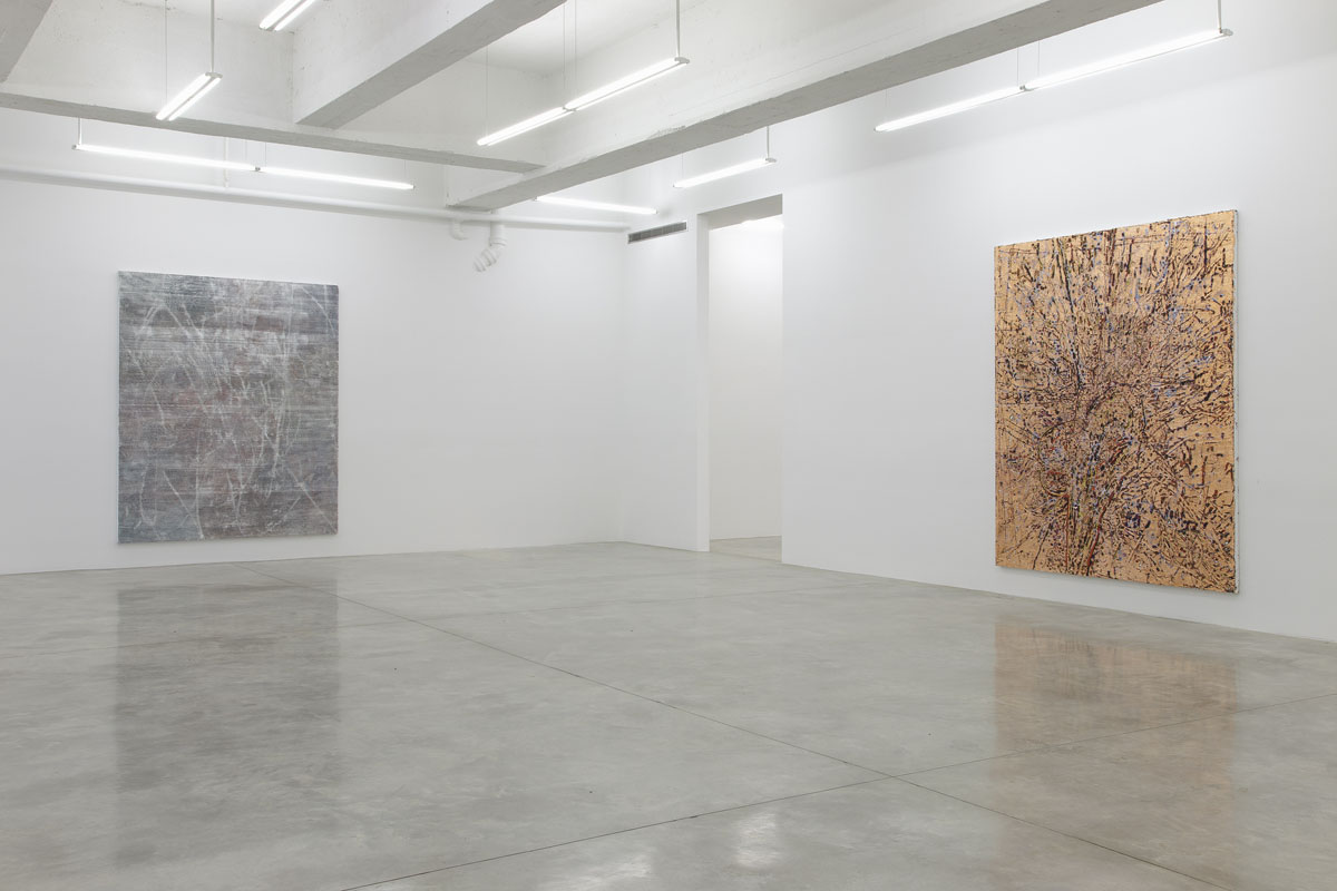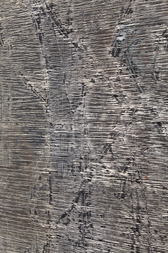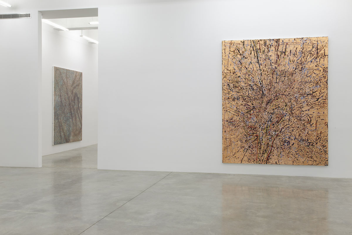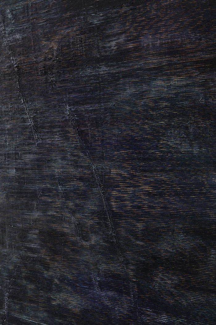 New interference-pattern works disguise themselves as monochromes and forgo the spinal element that characterized previous paintings, instead favoring an allover composition. Creating an attention that lingers on the surface, the pattern functions less as a screen and more as a barrier, limiting access to the painting’s layers. Despite maintaining their references to digital distortion and abstract organic patterns (such as wood grain and aquatic vibration as well as the mathematic correlations between the two), these works do not merely create an optical effect. Their muddled and degraded edges work to give shape to a pulsing, auditory hum. In some cases, the interference-pattern is slashed or scarred, interrupted by blistering lacerations that appear at once to be erupting from the under-painting and attacked on the surface. In other works, pigmented dust is applied as a final layer, which in a brief moment collapses the space and layers of the painting into a singular plane, as if they were cast in stone.