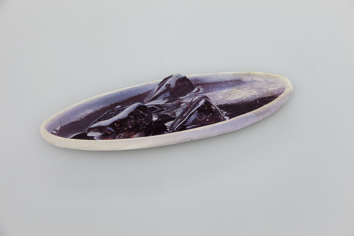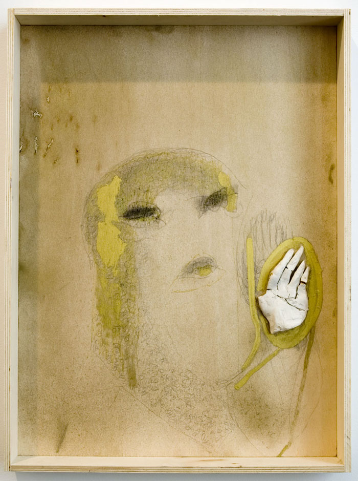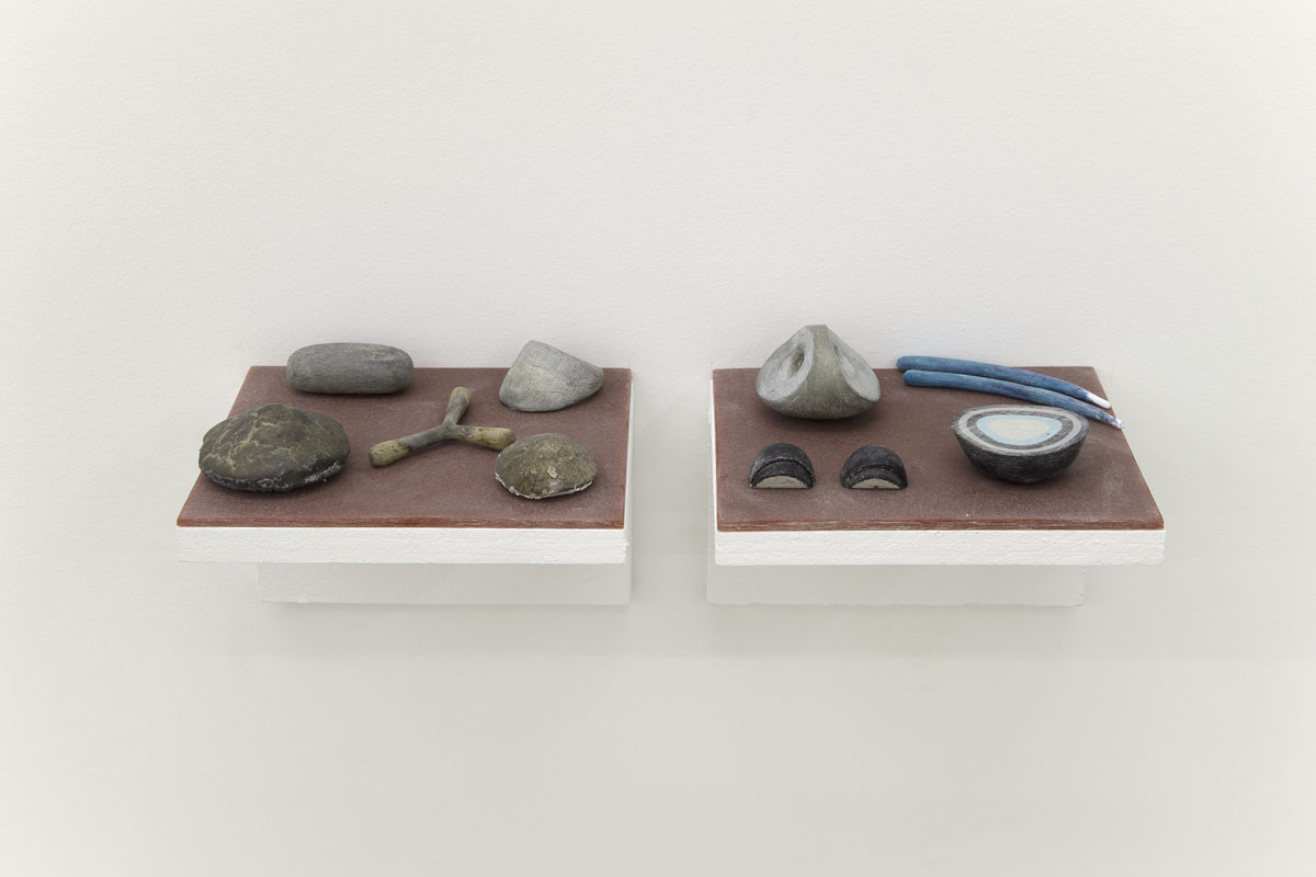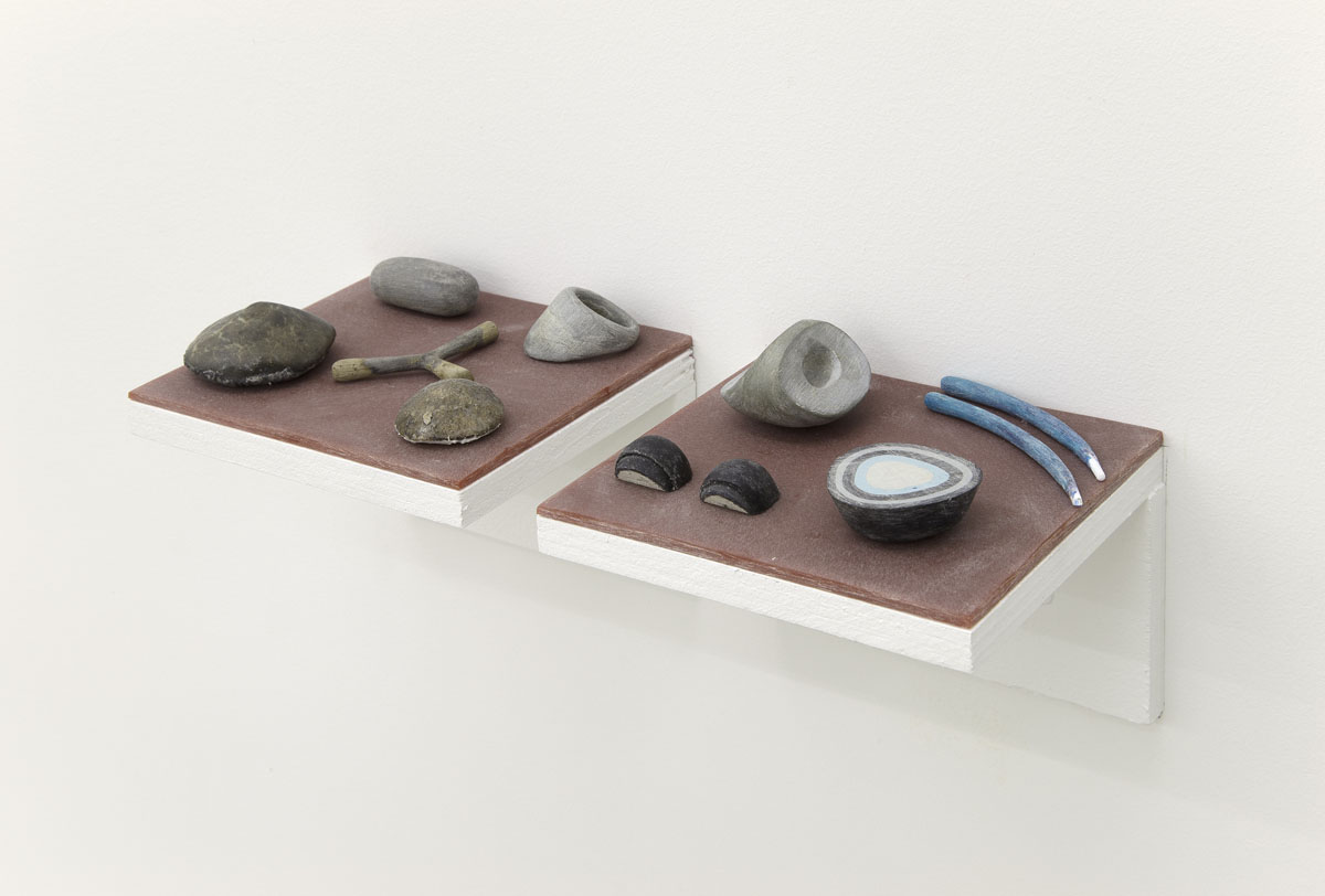 Two wooden shelves with polyurethane supports containing 11 component objects comprised of all or some of the following: various putties, plastic, metal, clay, krazy glue, pastel, oil, tempera, acrylic, and spray paint