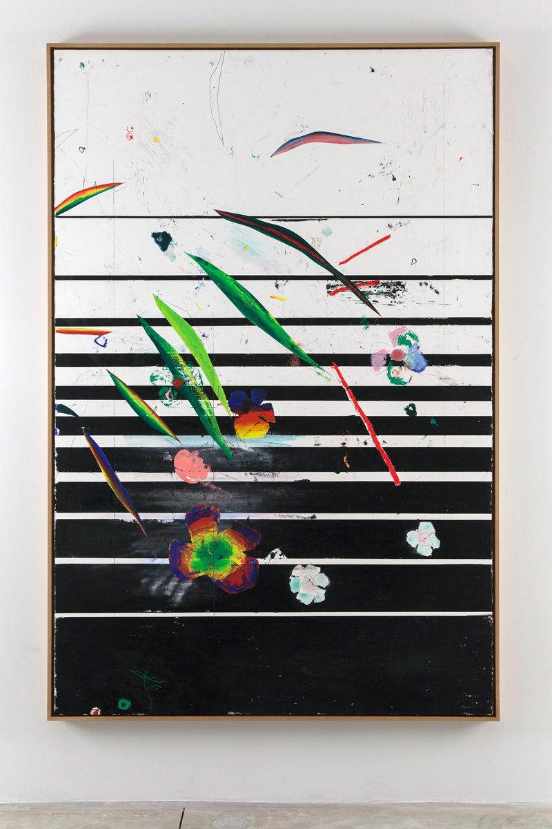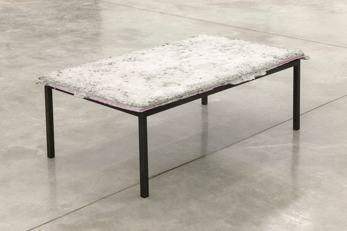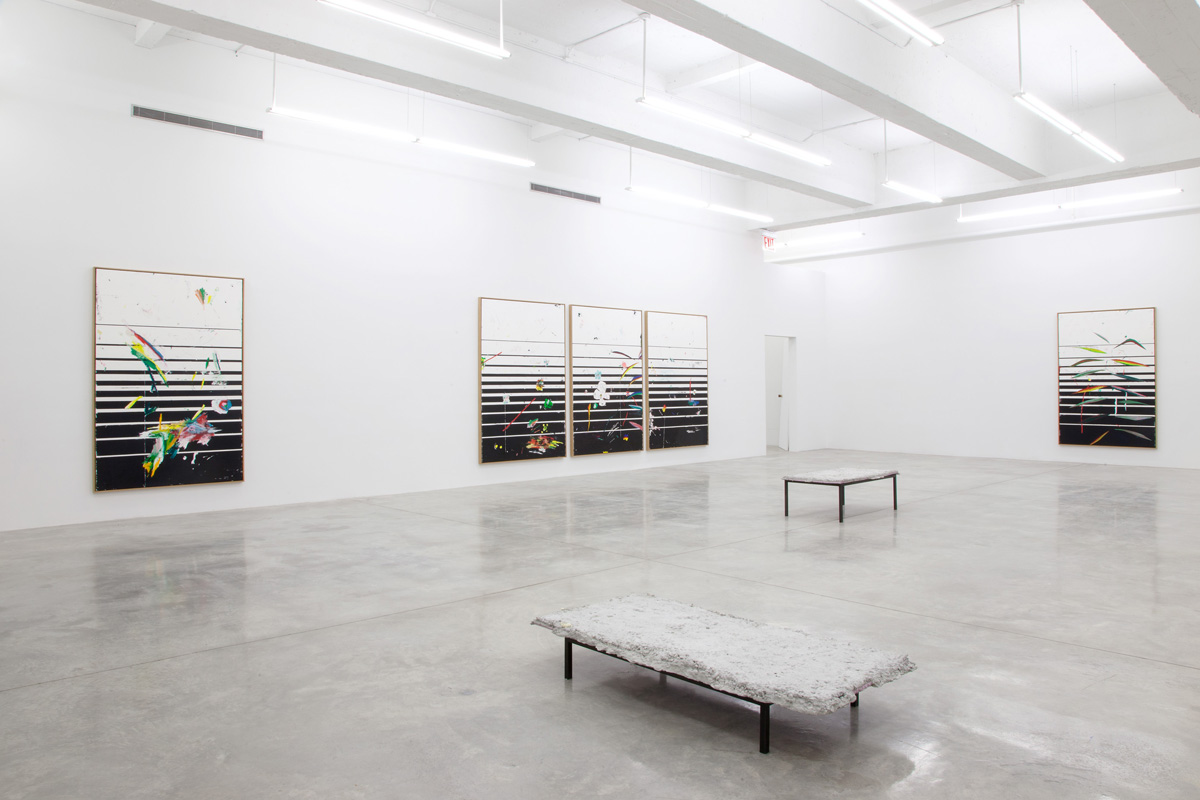 Ancart continues his previous explorations in an ongoing series of large-scale drawings. Pre-cut forms of vegetation are layered onto paper as he creates textural, black and white backgrounds with oil stick. It is traces of their immediacy that are consistent throughout, vestiges of the lush color layered into the negative vegetal spaces are found across the surface. For the first time, Ancart arranges these works as a set, with their compositions sprawling across four panels. Their vibrant foliage and color splashes imply a distance that suggests a fascination with another place. This sense of longing recurs throughout Ancart’s work, finding a parallel in a tension specific to drawing itself – the simultaneous desire to create and communicate a future while acting in relation to the past; a process through which motivations and intentions are continuously reversed. Additionally, he presents sculptural benches that are immediately reminiscent of museum seating, only as ghosts that exist as a skeletal structure.