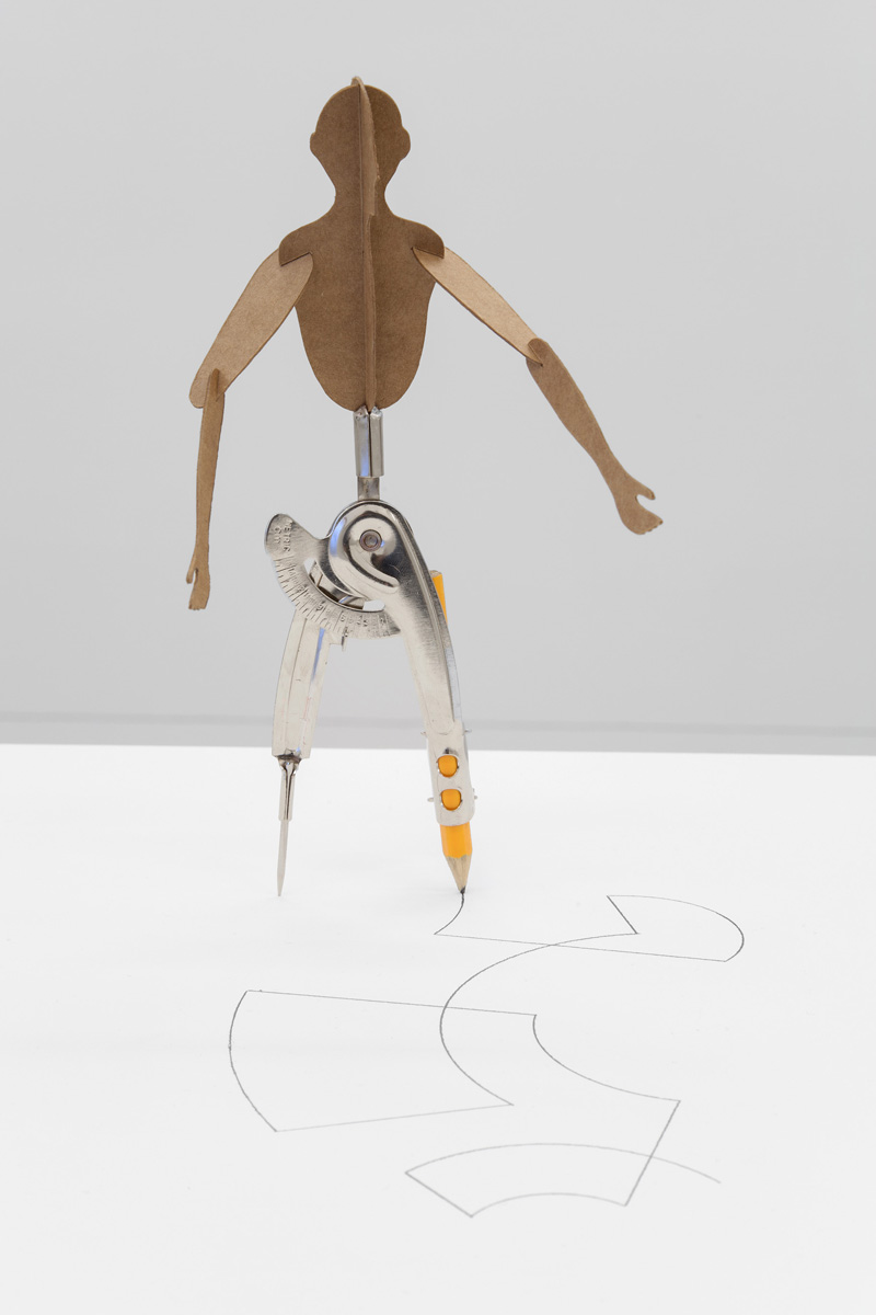 Lo?pez presents a new installation comprised of drawings, sculptures, as well as an animation, an element that is new to his practice. Following a single character – a drafting compass fashioned into a dancer, the protagonist himself presents a contradiction. He is a tool designed for rigidity and precision that instead makes loose, gestural movements. Tracing clockwise or counterclockwise, he begins to form a series of objects: a clock, a door, a globe, among others. Exhibited alongside the animation itself are these artifacts of the dancer’s actions crafted meticulously out of paper, simultaneously suggesting a choreography that creates play and narrative and a drawing extending from the second to third dimension.
