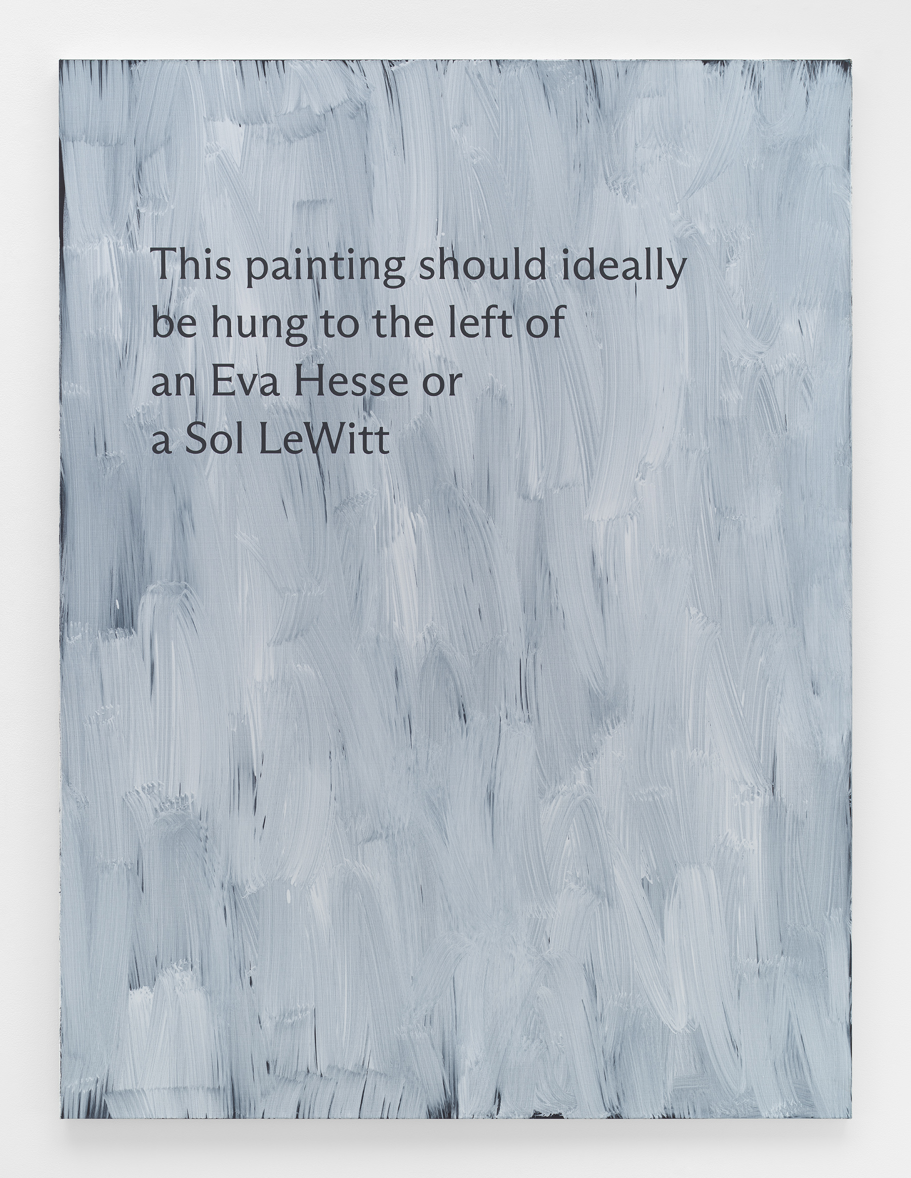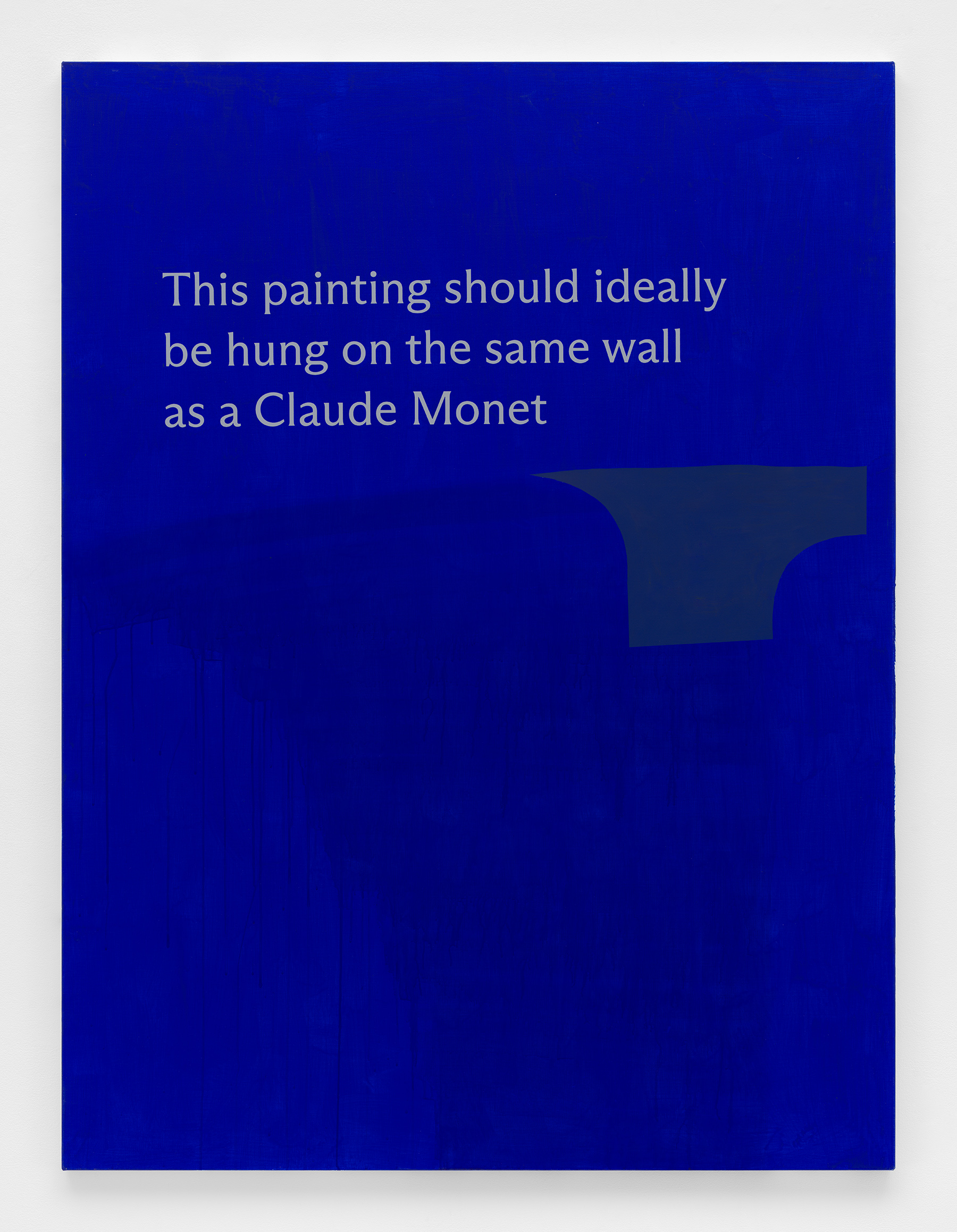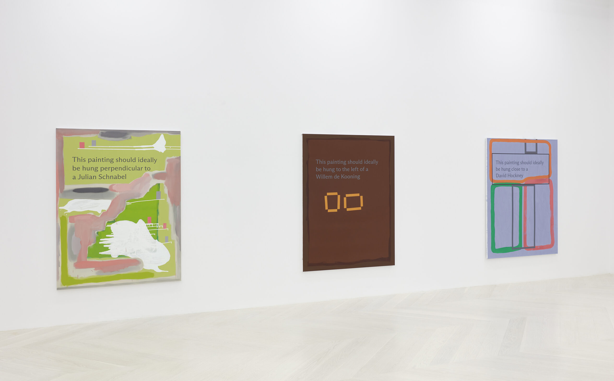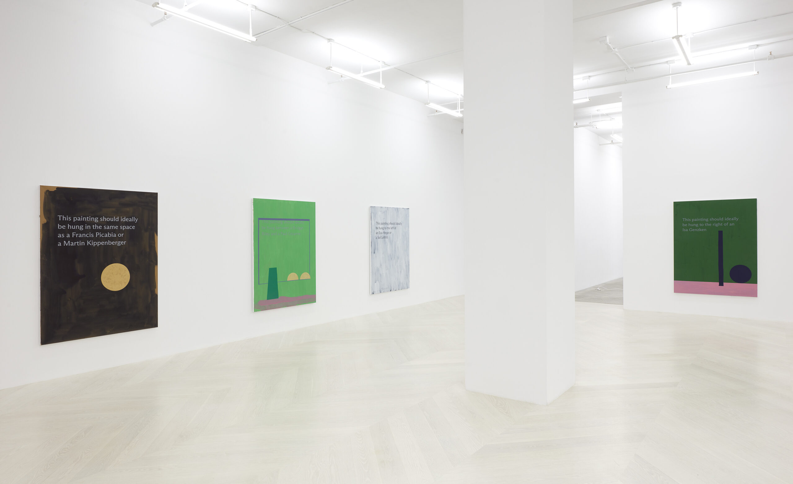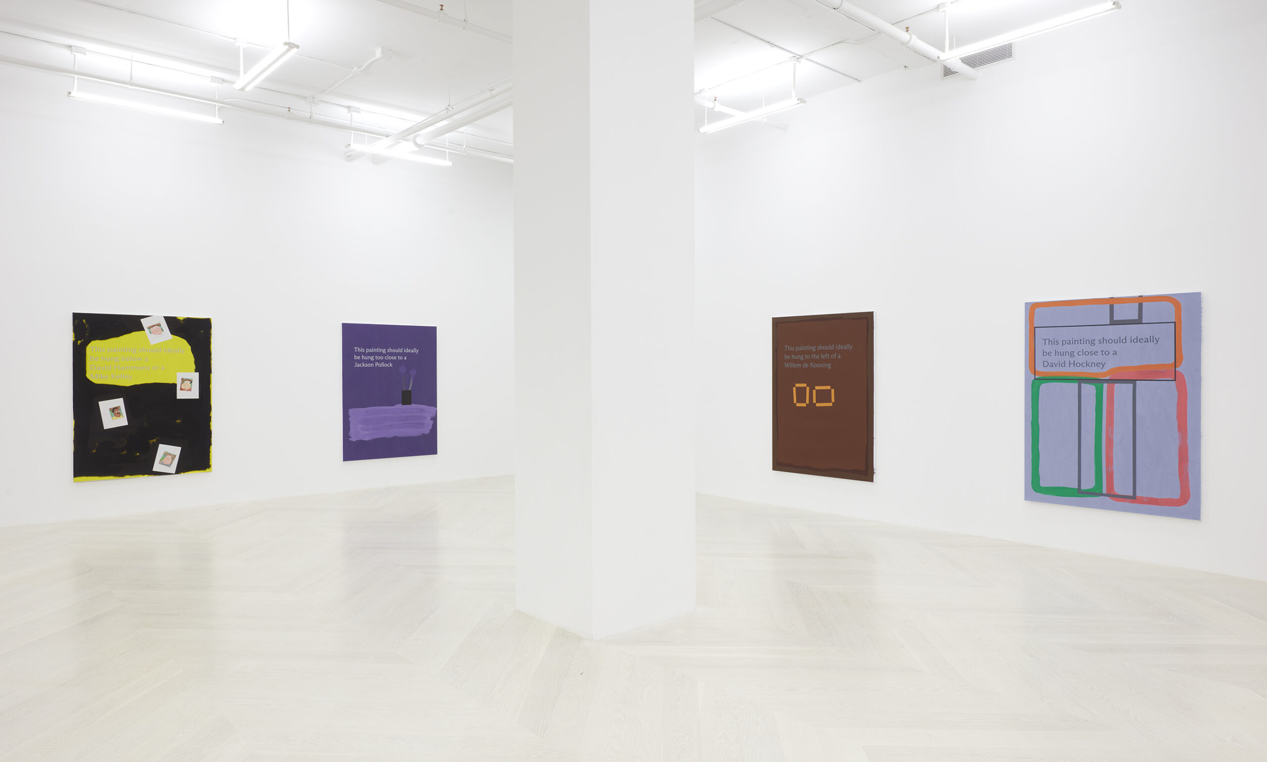 Casey Kaplan is pleased to present These Paintings Should, Jonathan Monk’s tenth solo exhibition with the gallery. The exhibition is comprised of a collection of twelve acrylic-based paintings, each emblazoned with screen-printed text that differs from one to the next, always beginning with the phrase “This painting should ideally be hung…”. As such, each sets up an imagined reality by dictating a supposed “ideal” placement on the wall, offering an unexpected conversation with iconic artists—from Isa Genzken or Claude Monet to David Hockney or Eva Hesse—who exist in the zeitgeist of the public’s and art market’s eye.