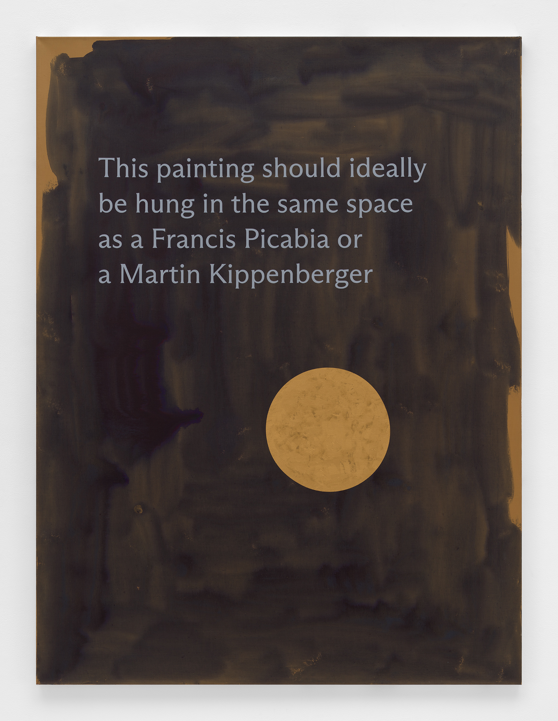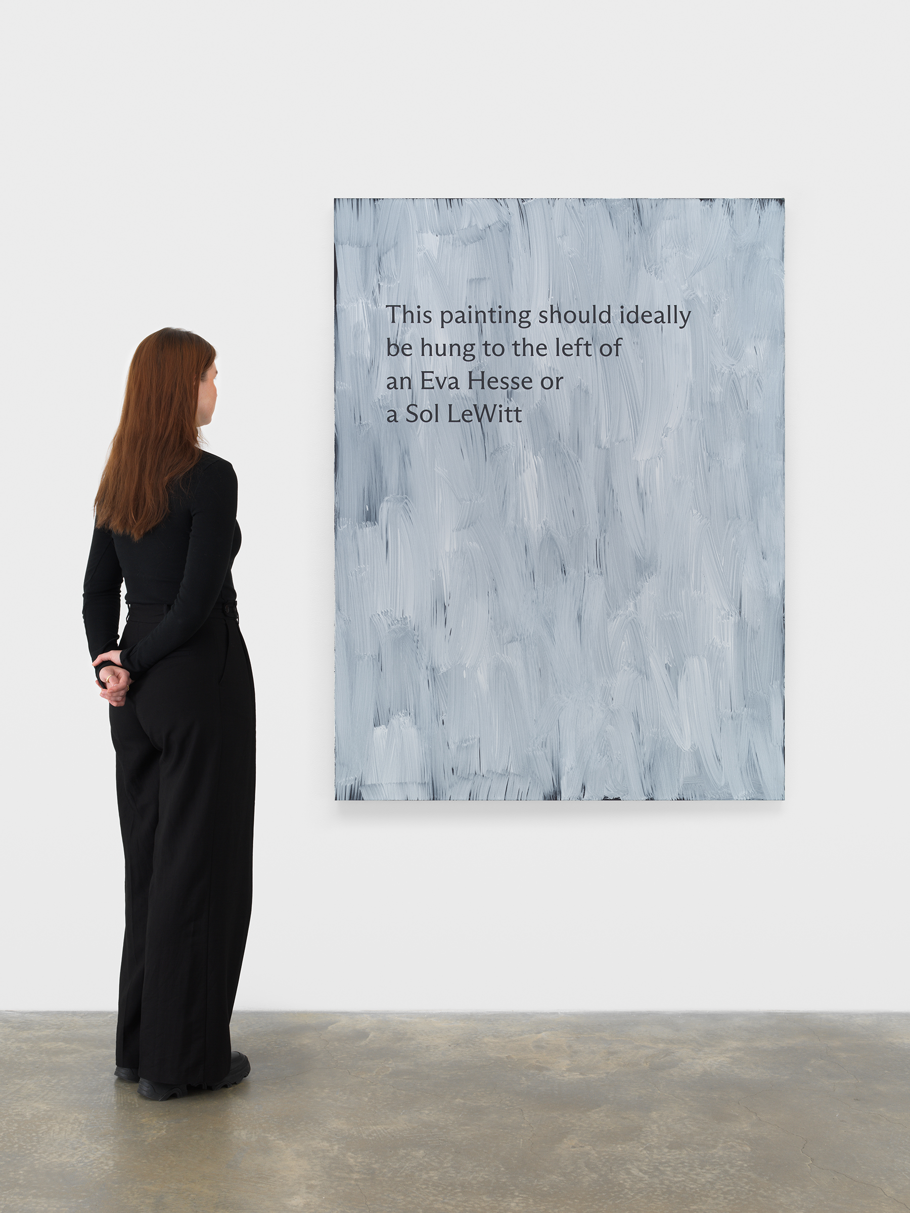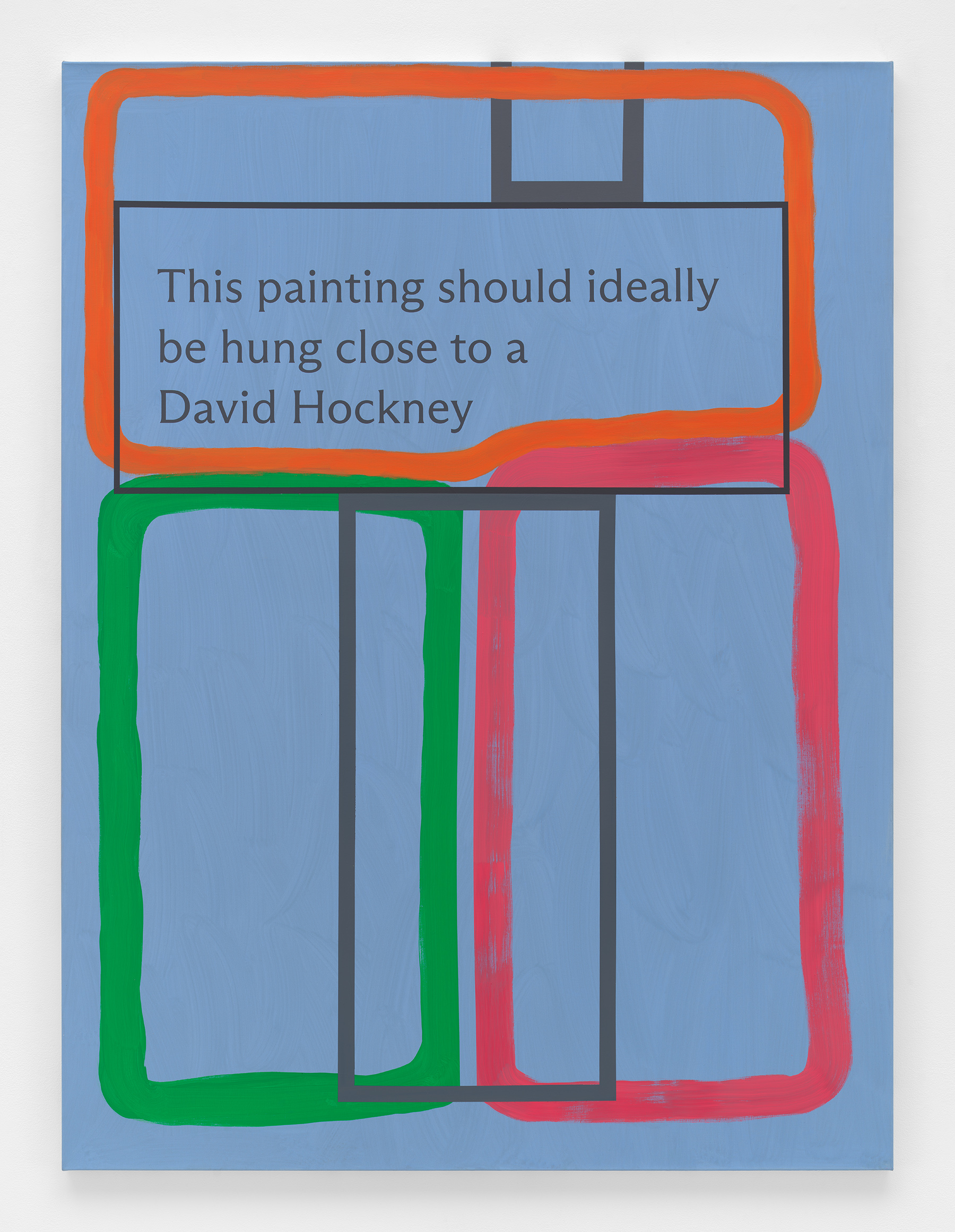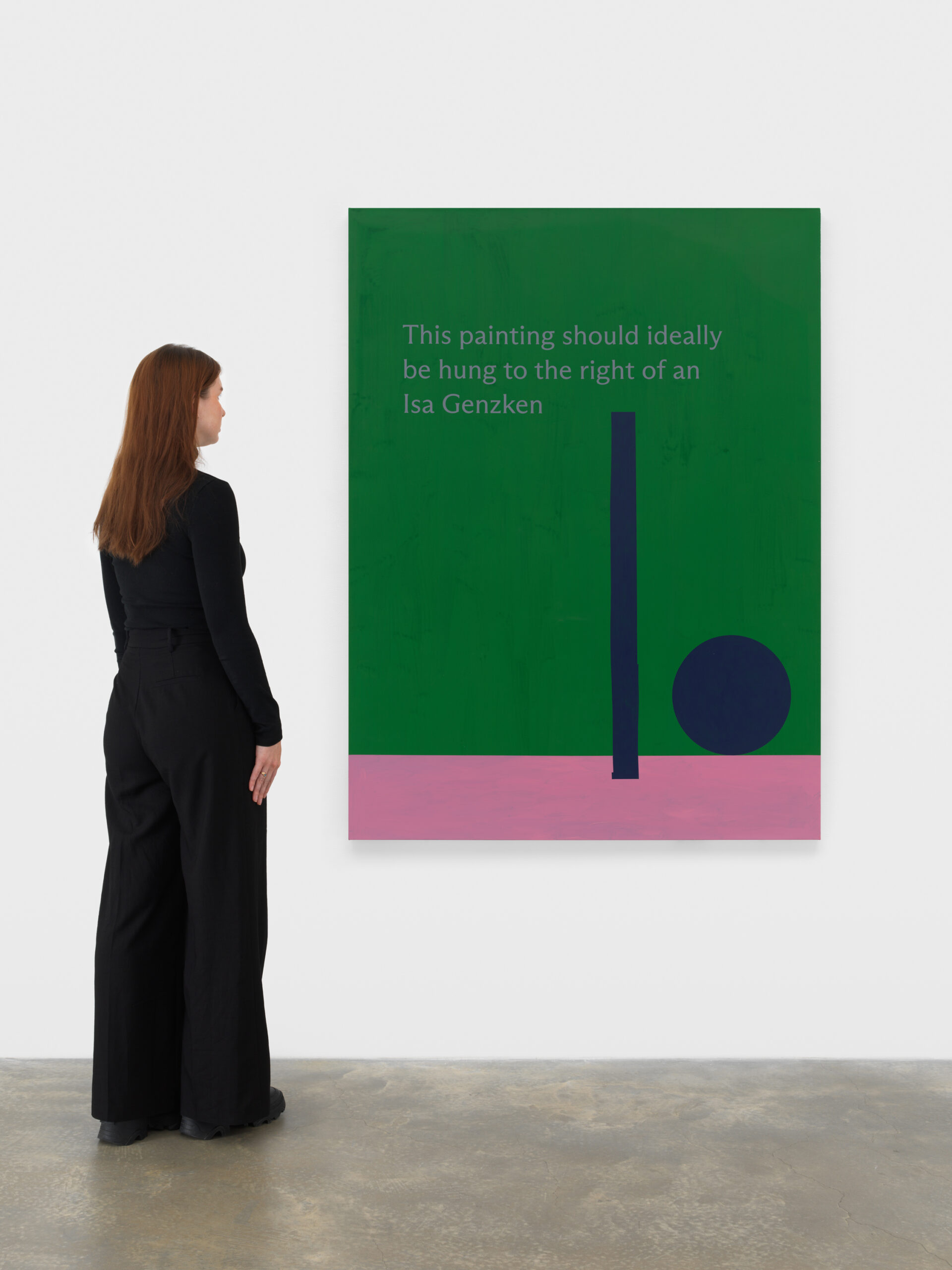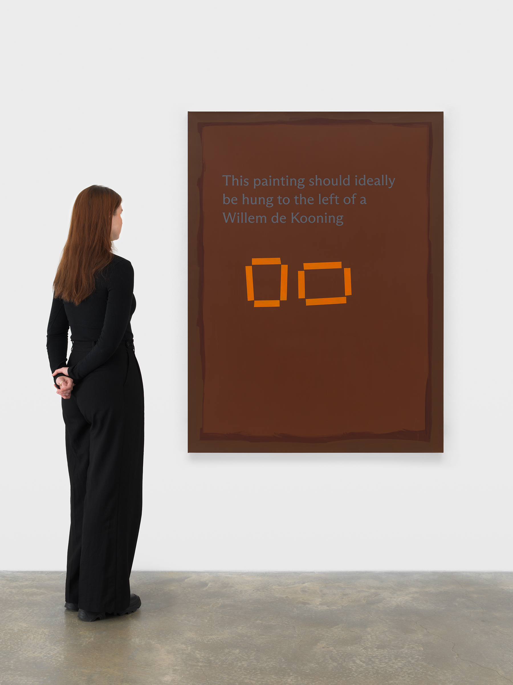 Casey Kaplan is pleased to present These Paintings Should, Jonathan Monk’s tenth solo exhibition with the gallery. The exhibition is comprised of a collection of twelve acrylic-based paintings, each emblazoned with screen-printed text that differs from one to the next, always beginning with the phrase “This painting should ideally be hung…”. As such, each sets up an imagined reality by dictating a supposed “ideal” placement on the wall, offering an unexpected conversation with iconic artists—from Isa Genzken or Claude Monet to David Hockney or Eva Hesse—who exist in the zeitgeist of the public’s and art market’s eye.