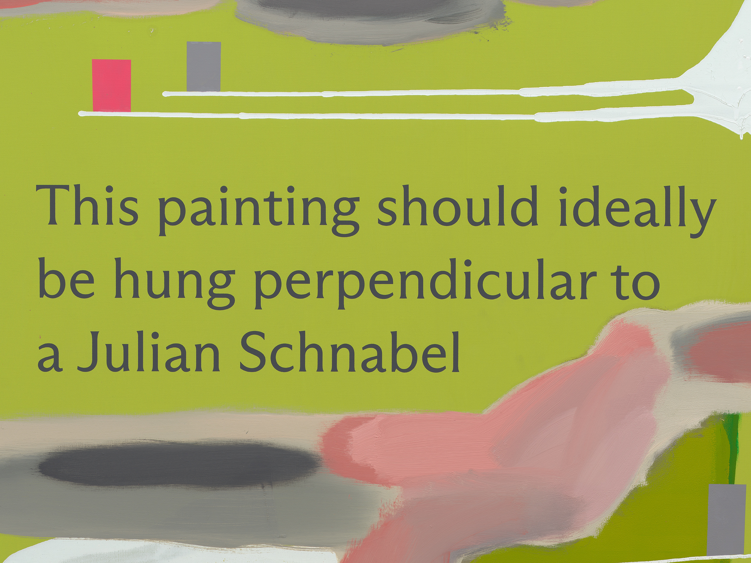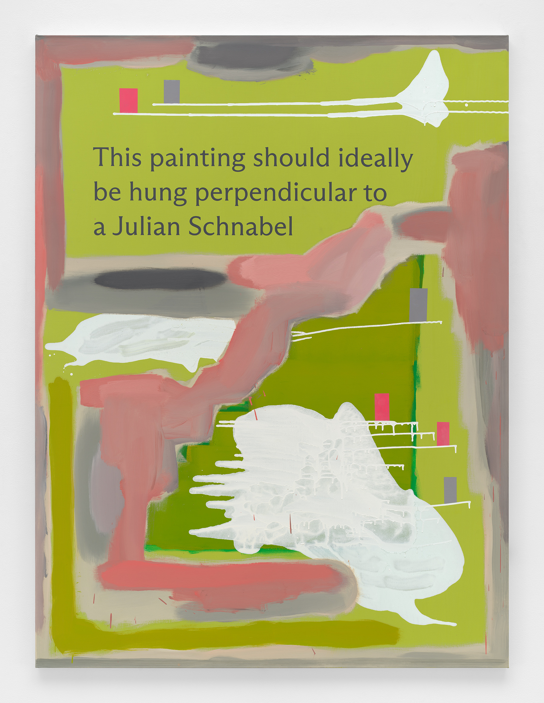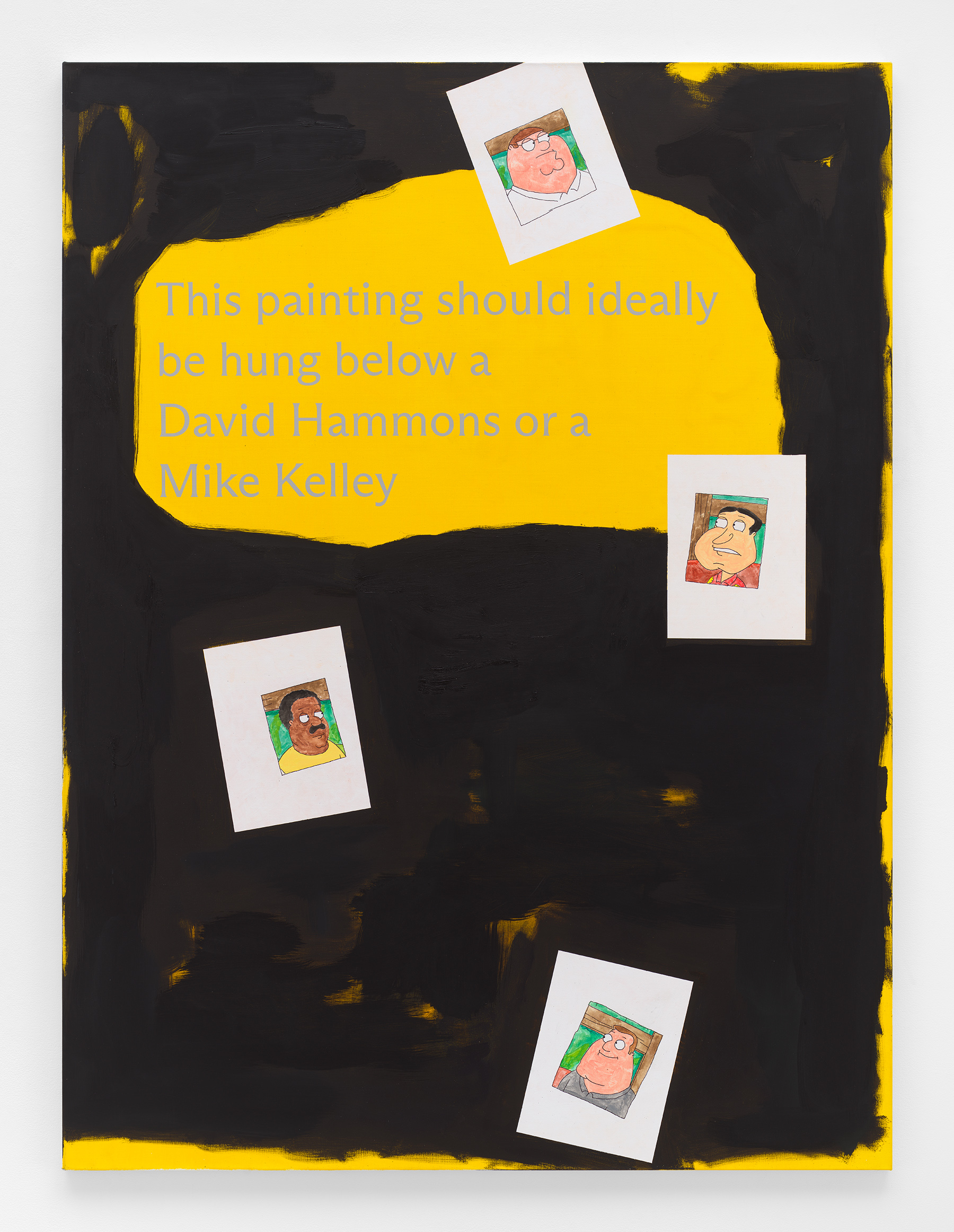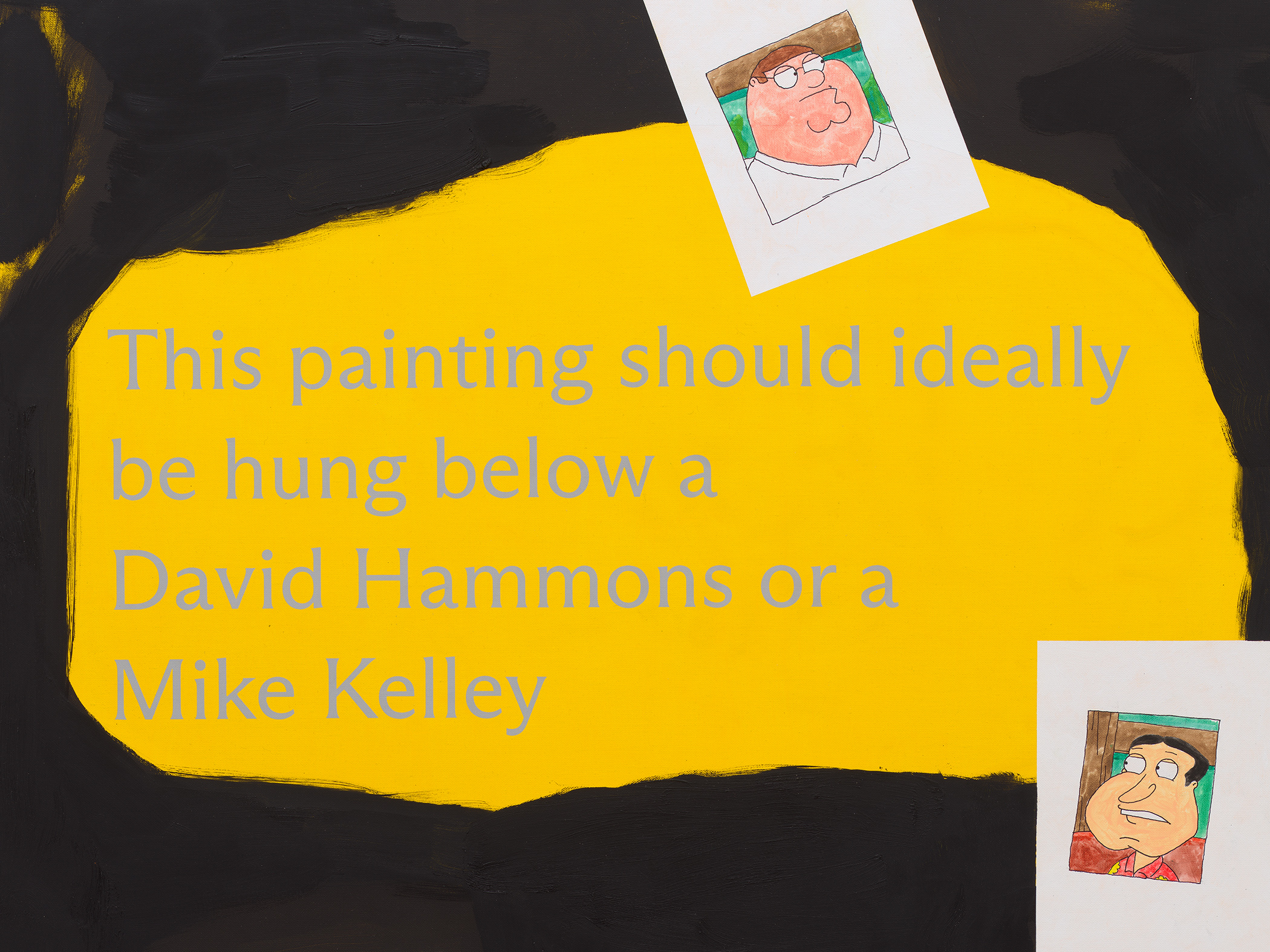 The completed paintings recall a series of similar works created by Monk nearly fifteen years ago. The earlier works focused on a grouping of conceptual artists who, like Monk, often worked in text, such as Lawrence Weiner or Ed Ruscha. Comprised purely of text, painted by a sign painter on a white plane, the paintings were without the intense, at times incandescent, hues and additional layers of paint present in the 2022 works. Borrowing from a concept created in Monk’s own earlier set of paintings, the works in These Paintings Should are primarily about location. In a self-referential move, Monk reconsidered the context in which his work is placed -- an art fair, collector’s home, or museum -- and the possibility that it could be hung next to one of the artists that he would himself like to own. Ideally, This Painting (Basquiat Warhol), Monk’s mustard and fuchsia abstraction that includes a character from Seth MacFarlane’s animated sitcom, Family Guy, should be hung near a Jean-Michel Basquiat and opposite an Andy Warhol, but it could also be installed with nothing at all, or to the right of something else entirely.