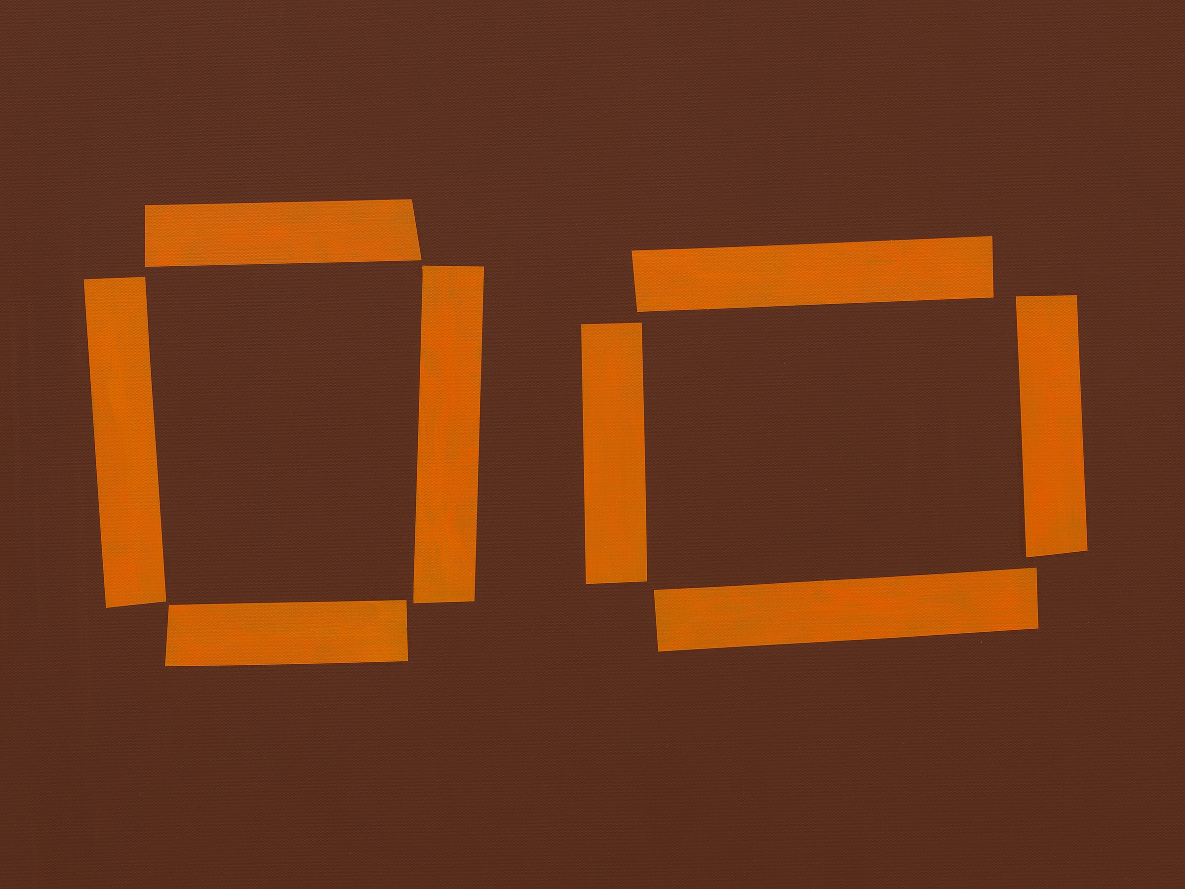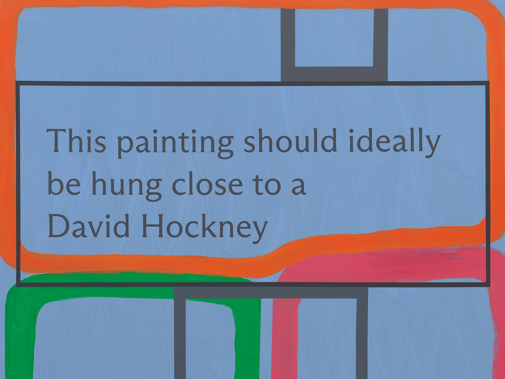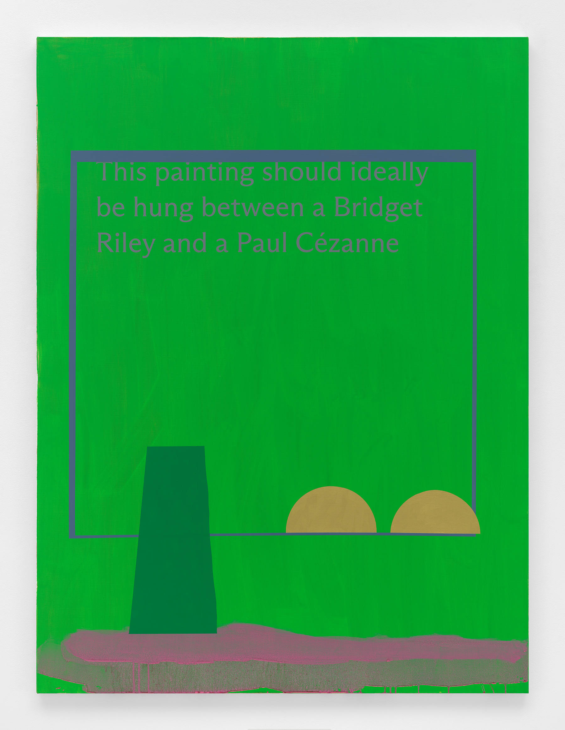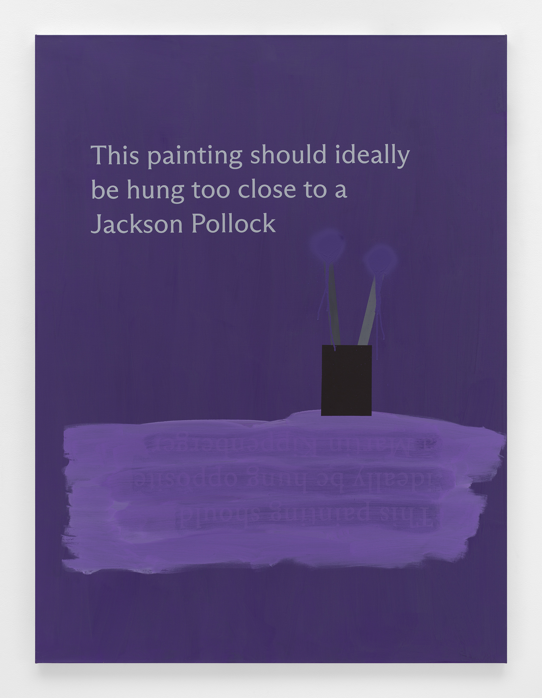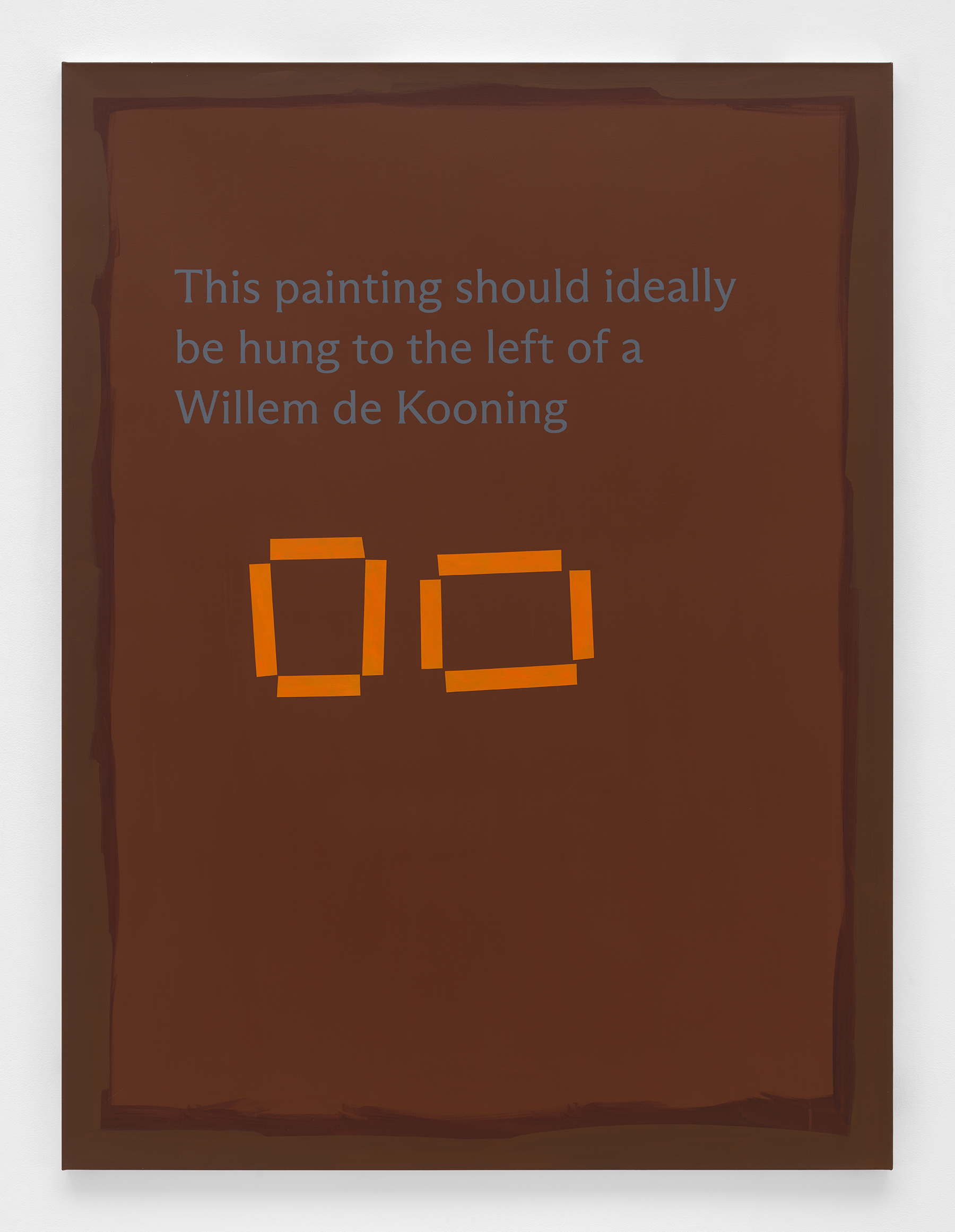 The completed paintings recall a series of similar works created by Monk nearly fifteen years ago. The earlier works focused on a grouping of conceptual artists who, like Monk, often worked in text, such as Lawrence Weiner or Ed Ruscha. Comprised purely of text, painted by a sign painter on a white plane, the paintings were without the intense, at times incandescent, hues and additional layers of paint present in the 2022 works. Borrowing from a concept created in Monk’s own earlier set of paintings, the works in These Paintings Should are primarily about location. In a self-referential move, Monk reconsidered the context in which his work is placed -- an art fair, collector’s home, or museum -- and the possibility that it could be hung next to one of the artists that he would himself like to own. Ideally, This Painting (Basquiat Warhol), Monk’s mustard and fuchsia abstraction that includes a character from Seth MacFarlane’s animated sitcom, Family Guy, should be hung near a Jean-Michel Basquiat and opposite an Andy Warhol, but it could also be installed with nothing at all, or to the right of something else entirely.
