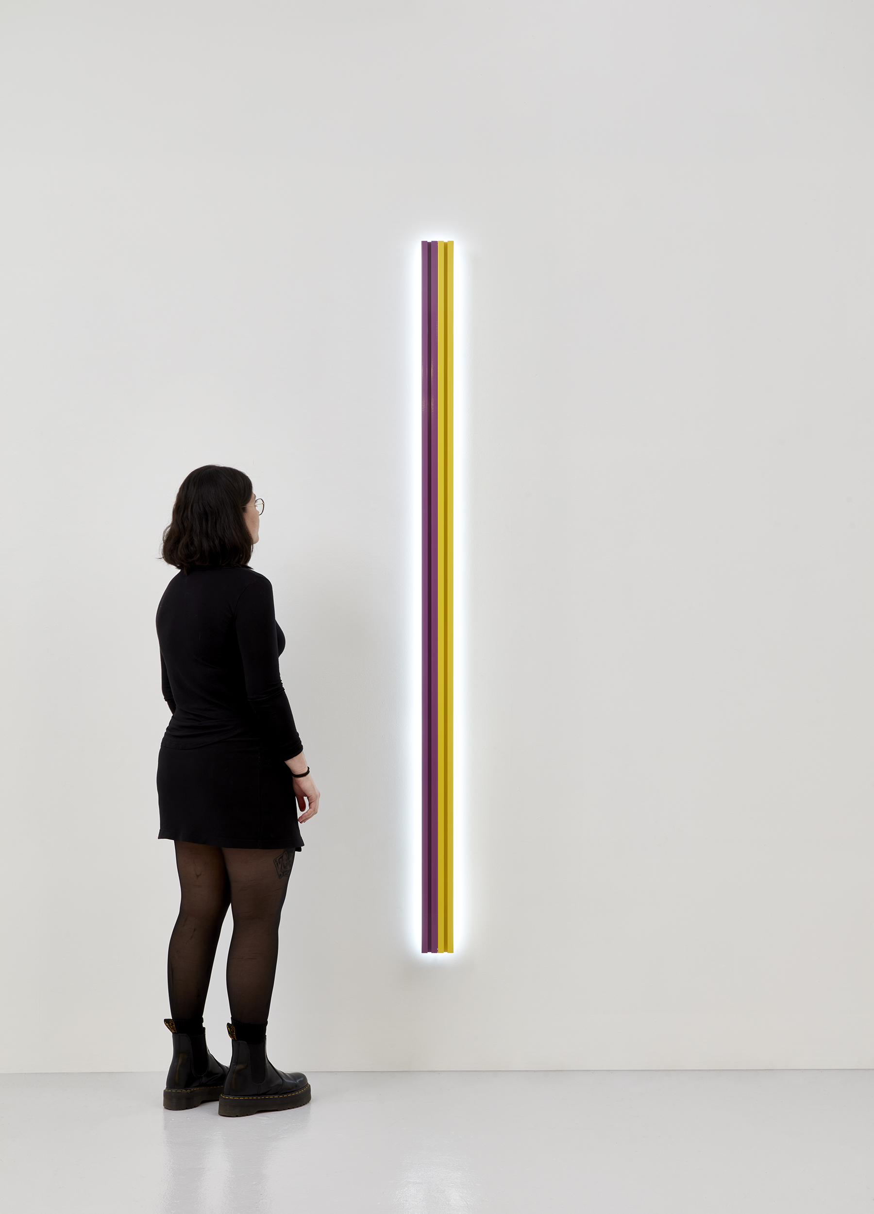 Through color and light, concept is tied to form, as seen in Gillick’s 2023 solo exhibition Filtered Time at the Pergamonmuseum in Berlin. Soundscapes and colored light projections refracted the culturally resonant site completed in the tenuous Weimar period (1919-1933) through the filter of our present. Gillick’s practice is intertwined and cumulative: the white LED lights and hues of the custom powder-coatings combine to confuse any underlying narrative or purpose by distancing the object from its predictable setting and turning our attention to the building blocks of an alienating present.
