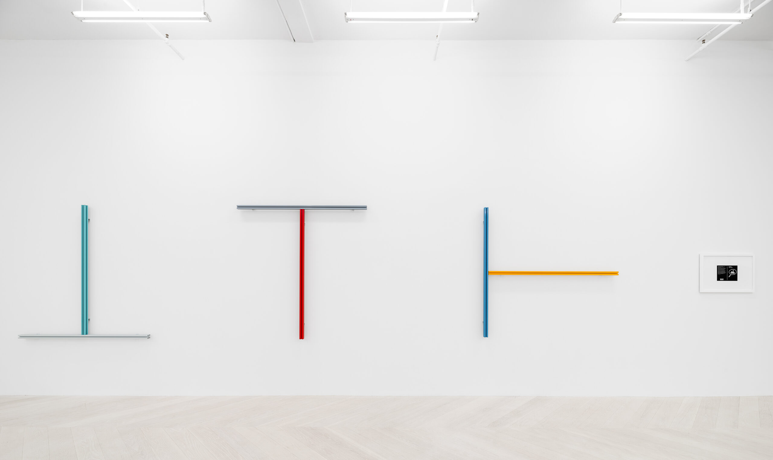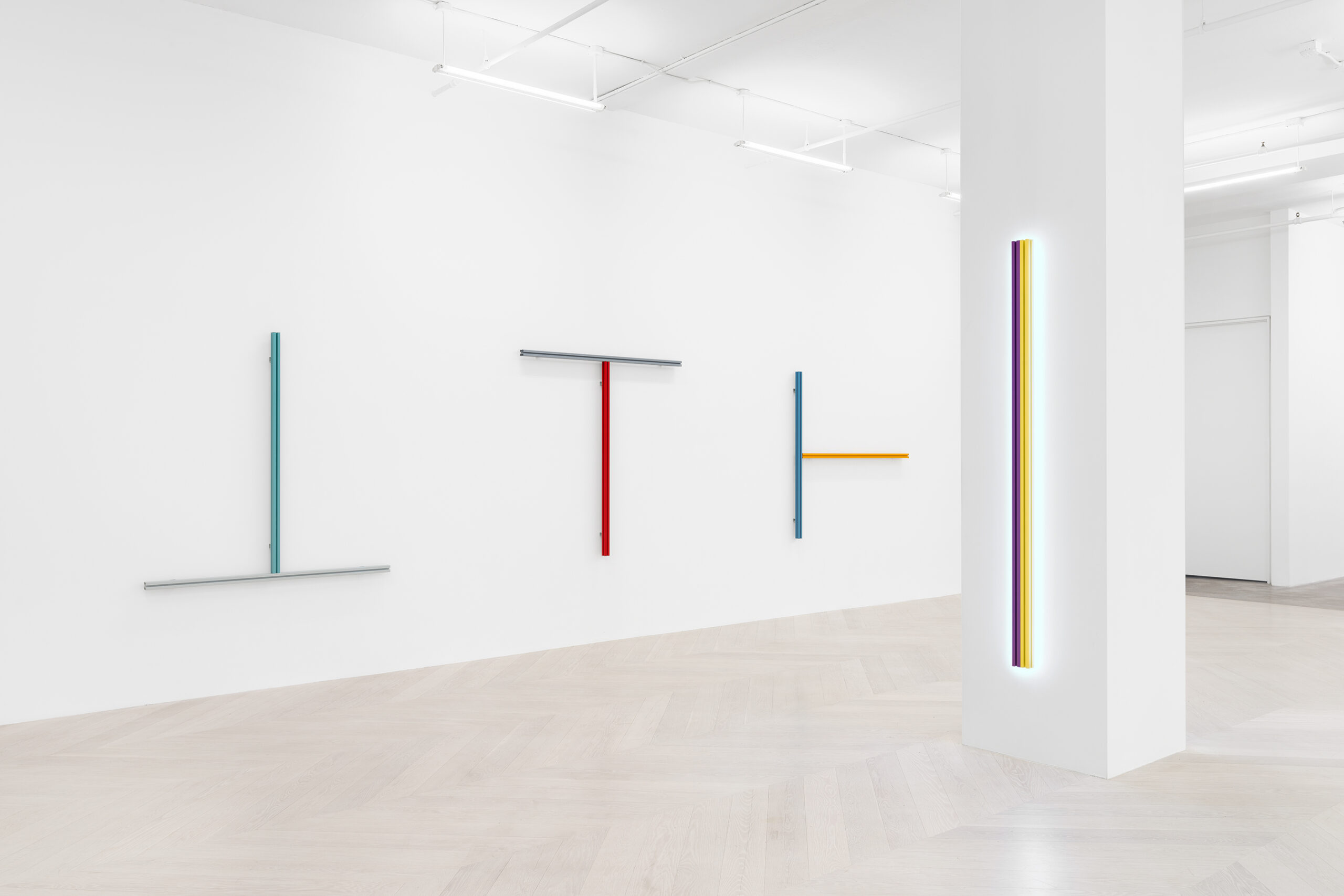 Casey Kaplan is pleased to present Fact Structures Amount Structures Language Structures, Liam Gillick’s (b. 1964, Aylesbury, UK) tenth solo exhibition with the gallery and the final stage of a three-part series that began in Brussels and Berlin. The exhibitions mark a development in Gillick’s work with a new focus on how advanced production is conceptualized and represented. For Casey Kaplan, Gillick presents new wall-mounted sculptures produced from aluminum T-slot extrusions. In addition, four new LED light structures are installed in the center of the gallery. Each individual work is accompanied by a unique print of a book jacket design. The linear sculptural configurations contend with today’s opaque and fluctuating methods of manufacturing, construction, and communication—their neat geometries seemingly indifferent to our uncertainties.