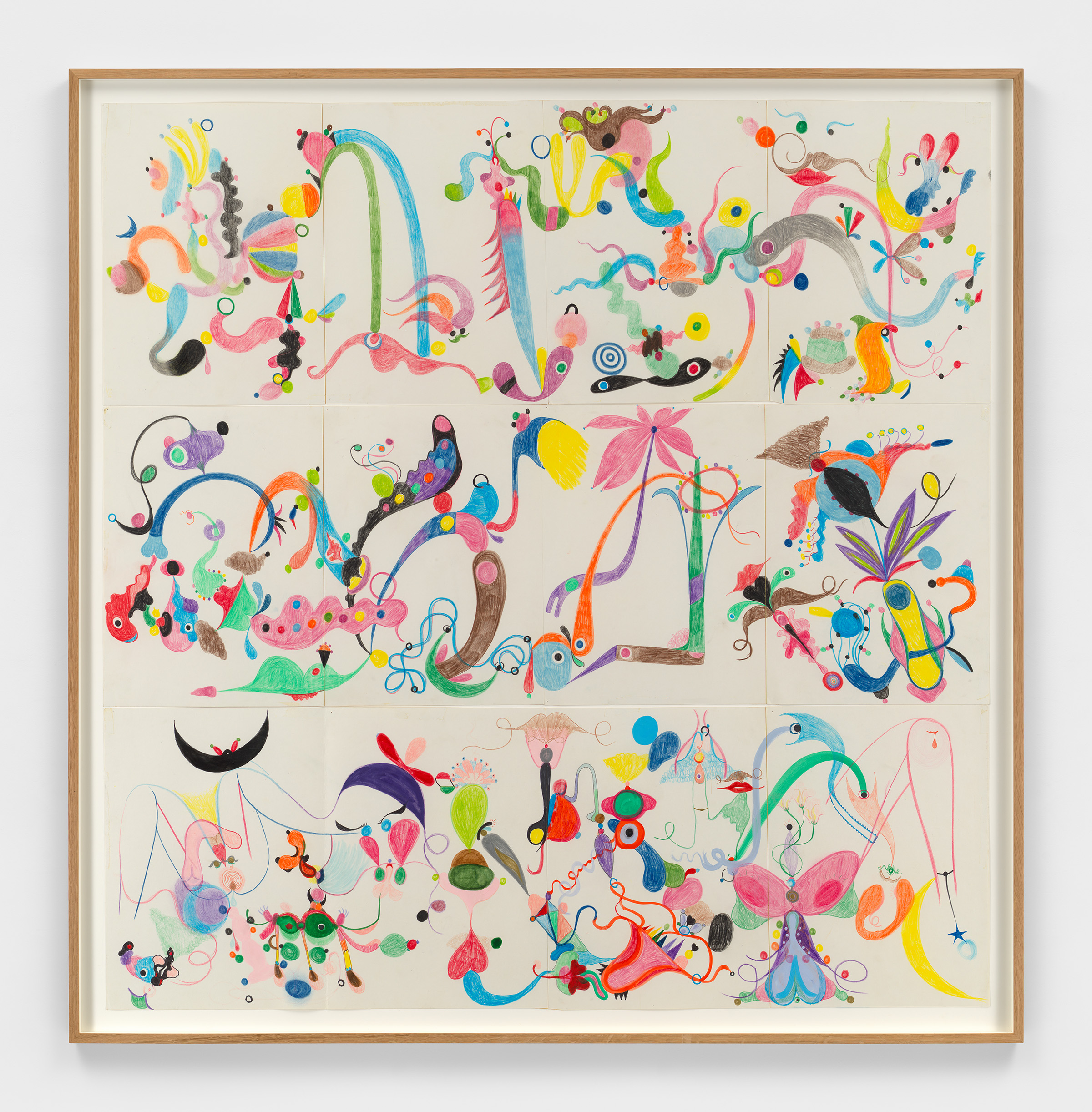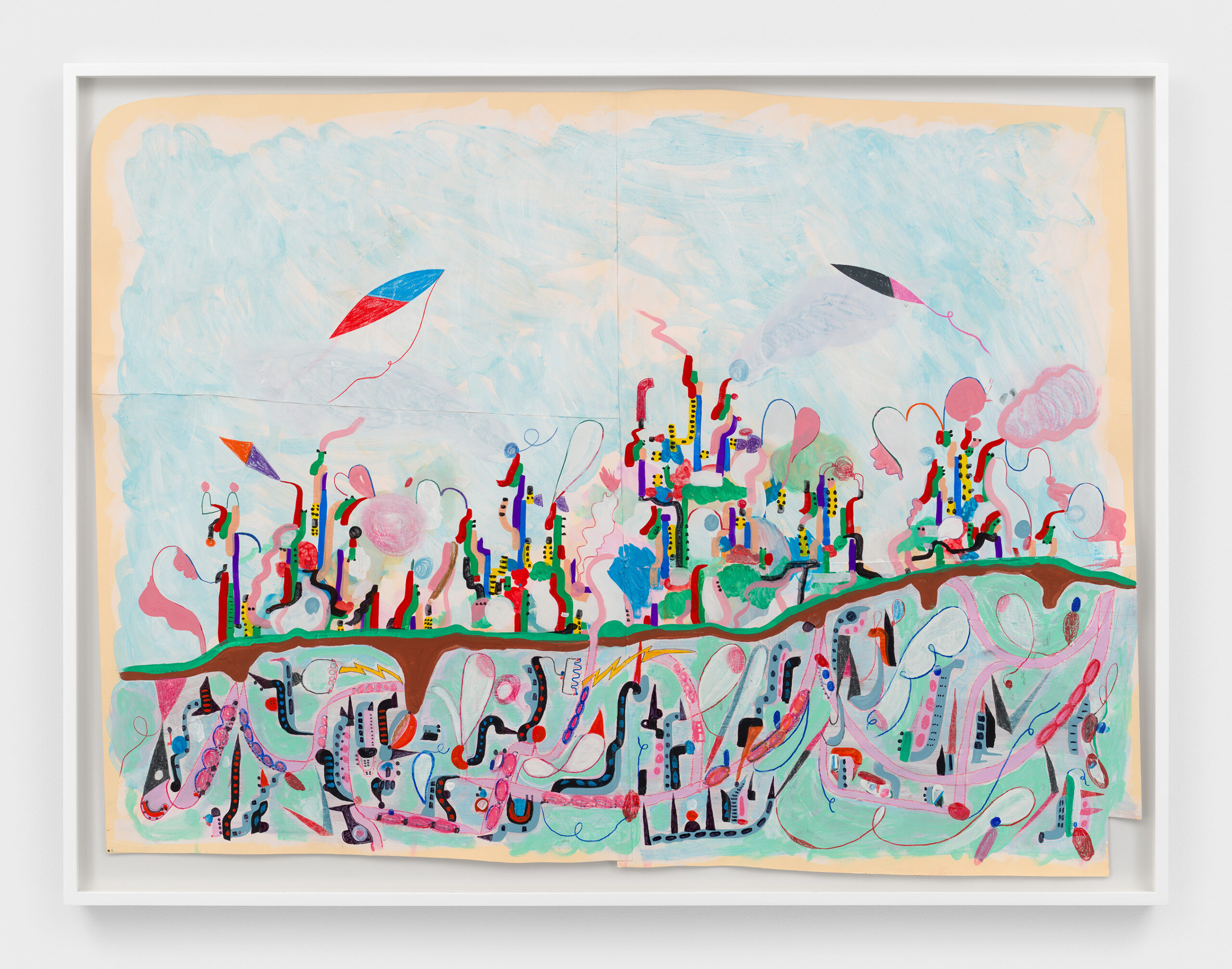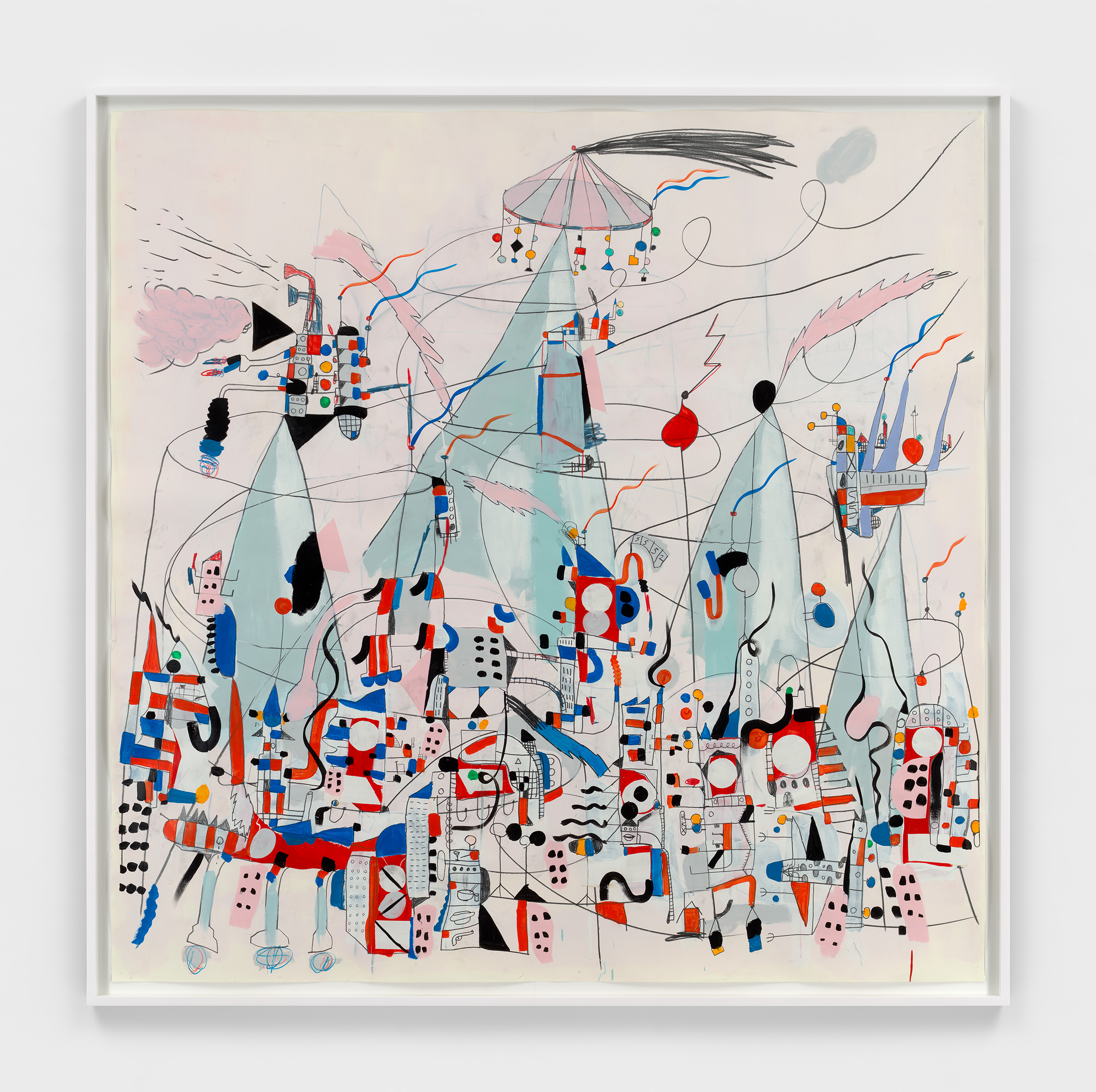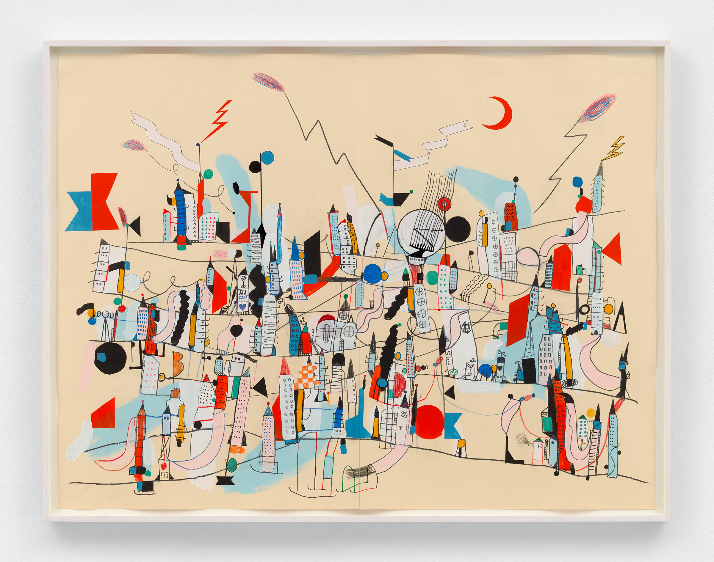 Casey Kaplan is pleased to announce Nathan Carter: Drawings 1996 - 2024, the artist’s ninth solo exhibition with the gallery, spanning a 25-year collaboration. Surveying Carter’s drawing practice over the last three decades, this exhibition brings together depictions of imagined metropolises and multicolored abstractions in a variety of media – colored pencil, ink, collage, gouache, graphite, acrylic, and enamel. Cityscapes are populated by lightning bolts, twisting power lines, and precarious structures, while in other abstract works, looping lines and gestural marks interlock with biomorphic forms and fields of color. Beginning with a work created during Carter’s art school years, the exhibition features works on paper through present day, offering a durational view into the artist’s fantastical worlds.