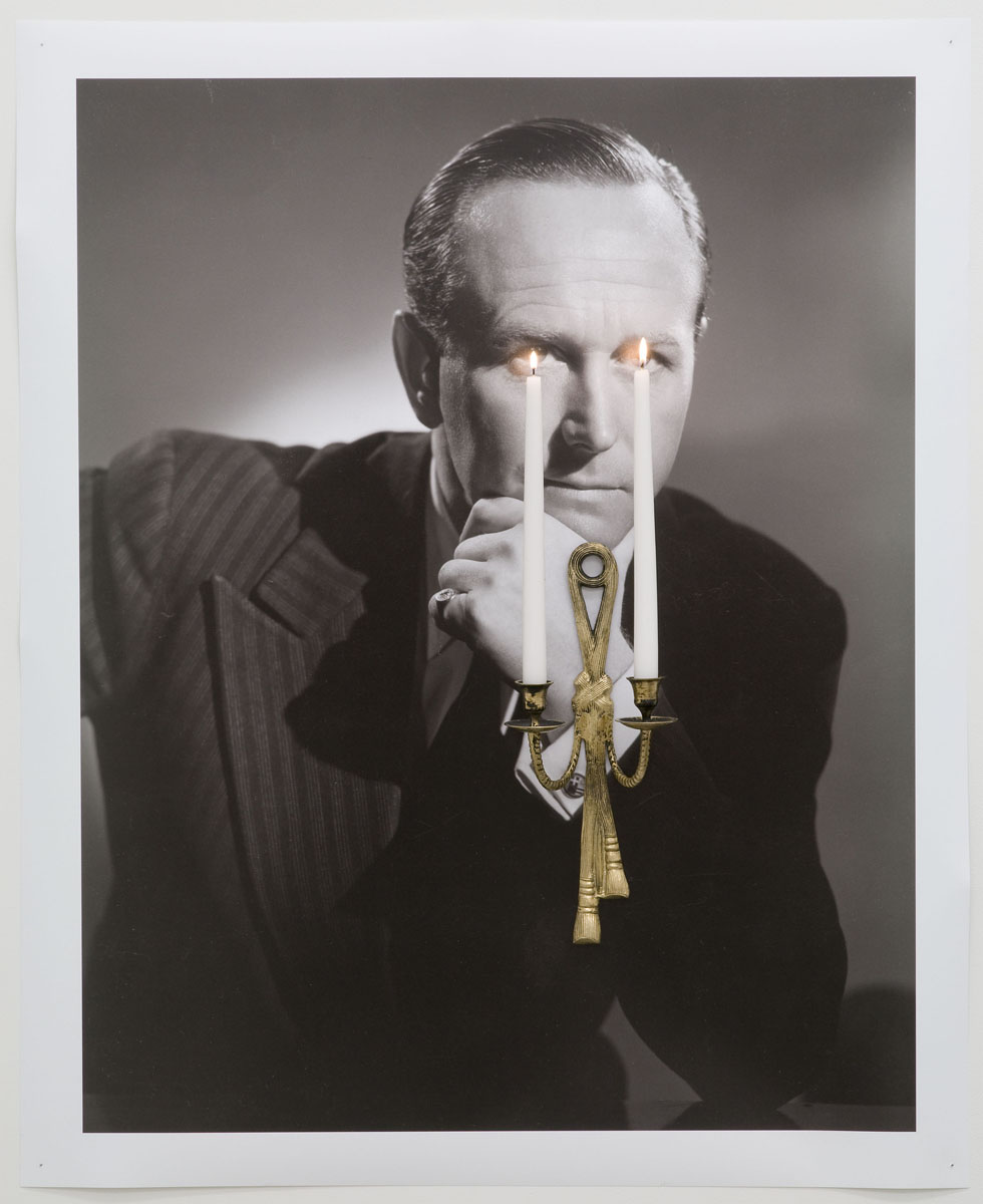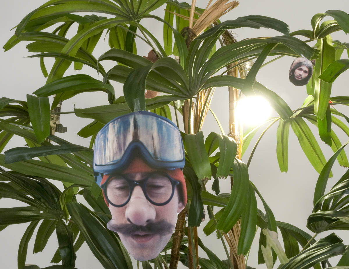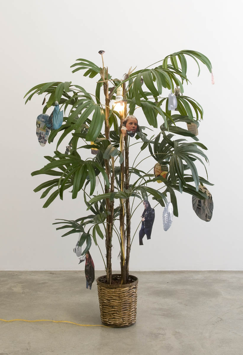Light bulb, potted artificial palm tree, paper clippings from LIFE magazine, tape