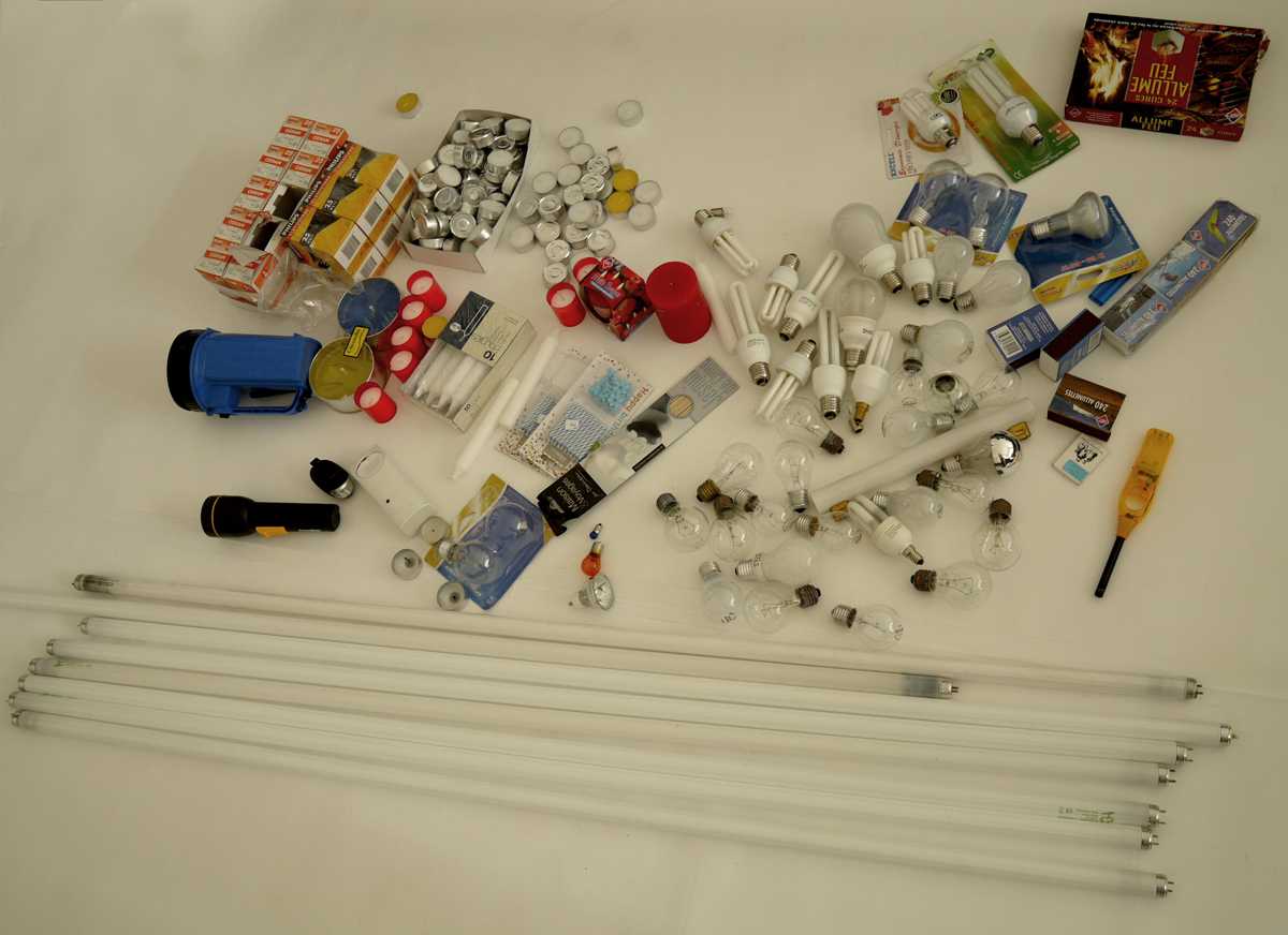 Candles, lighbulbs, matches, lighters, flashlights