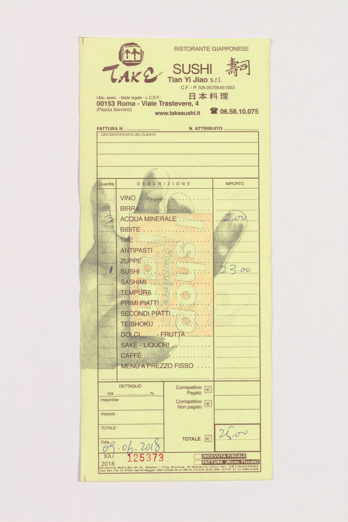 The series began in 2015 when Monk and his family relocated temporarily from Berlin to Rome. Communal meals became habitual as the family sought to familiarize themselves with the new city. Attracted to the elegant, hand-written paper receipts commonly used in restaurants in Italy, Monk began to collect the bills received at the end of his family meals. Once home, he would draw directly onto the receipts, a recurring practice that has continued to this day.