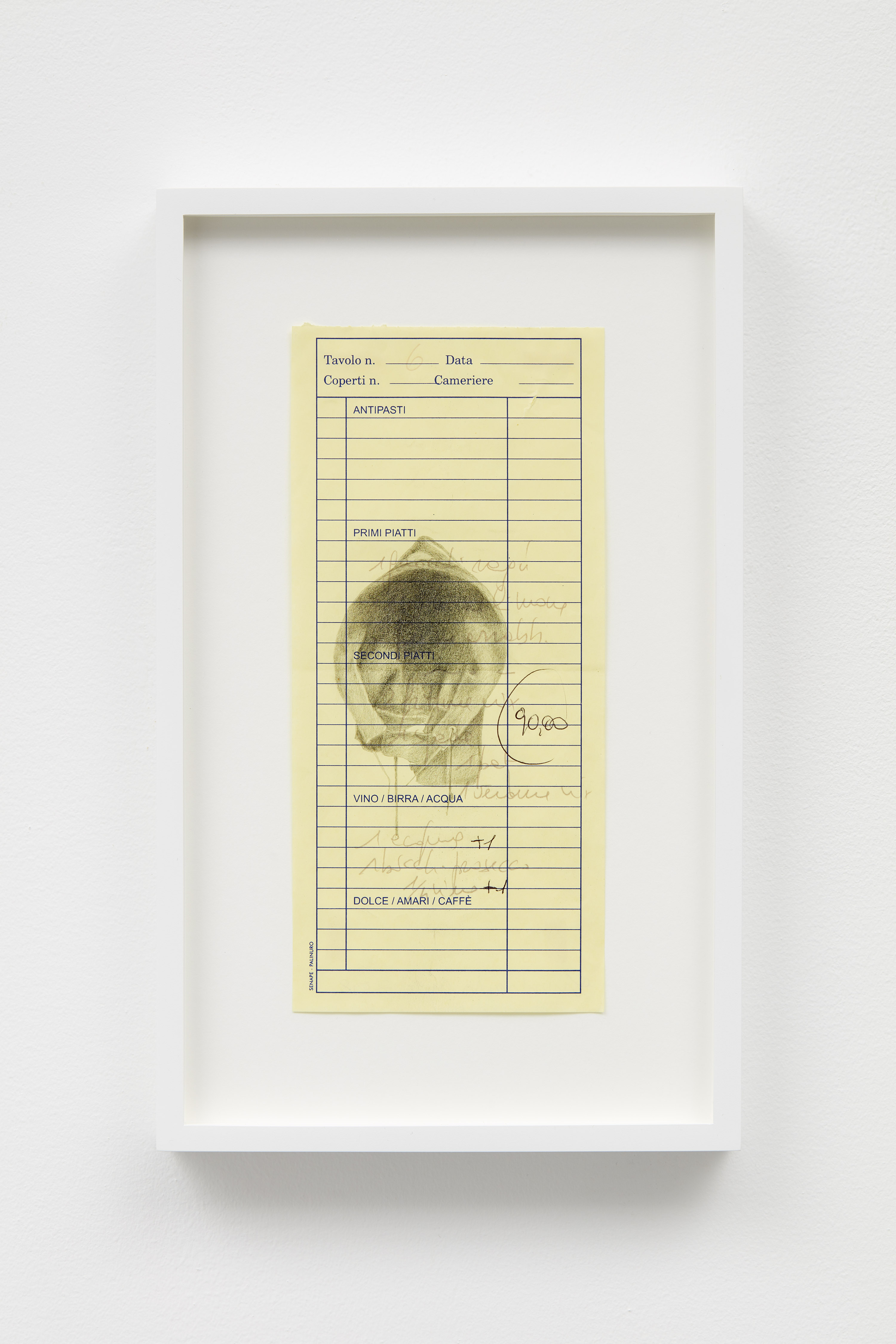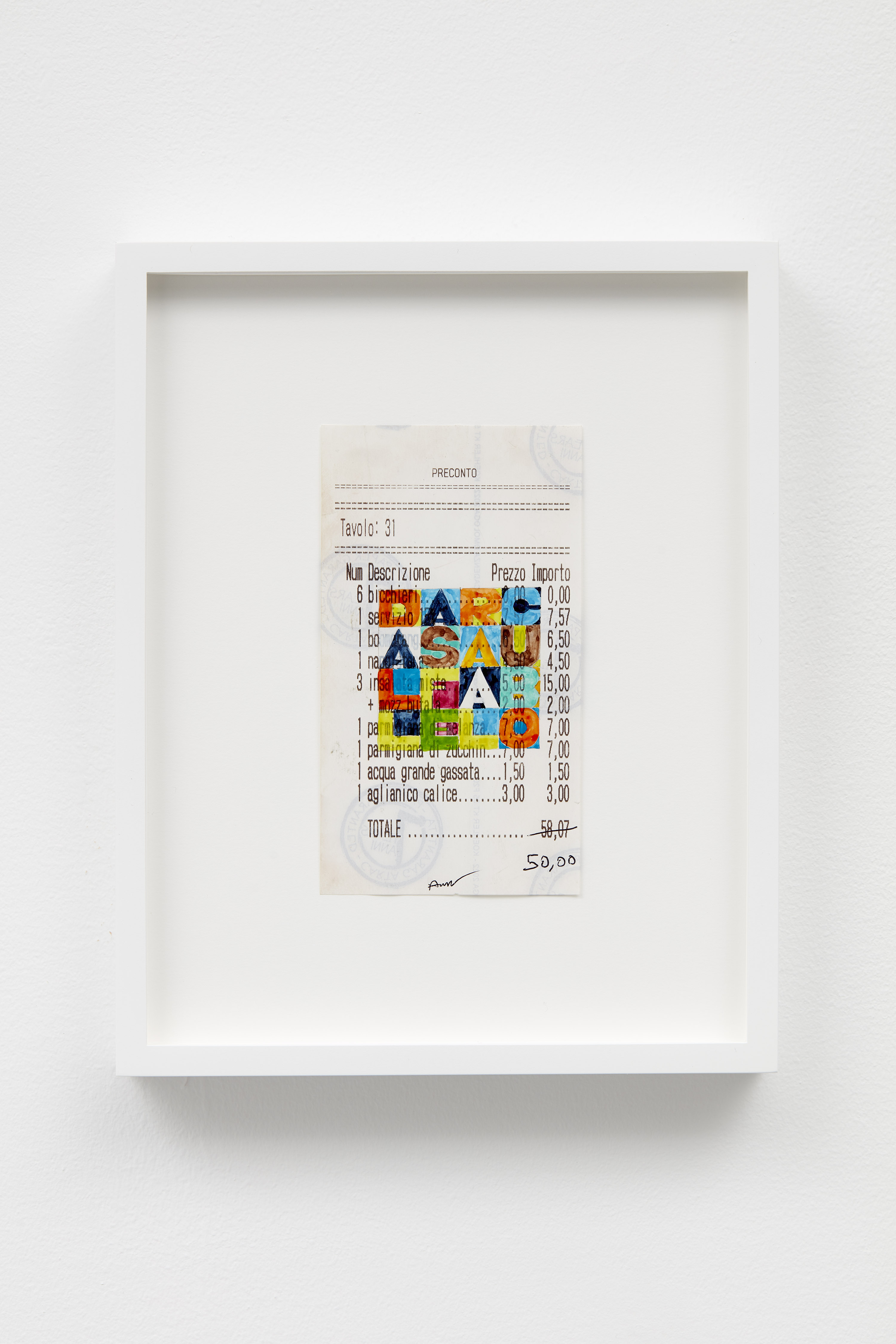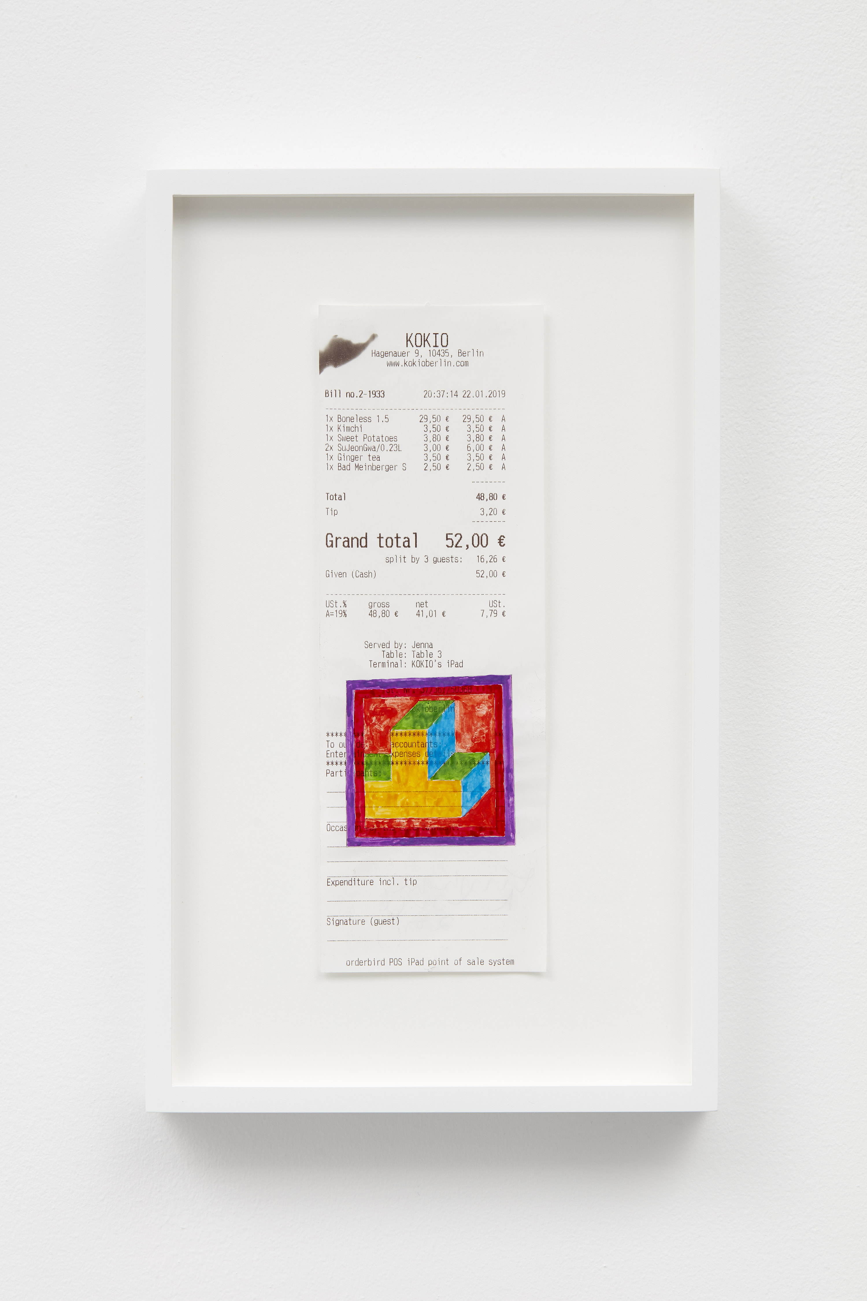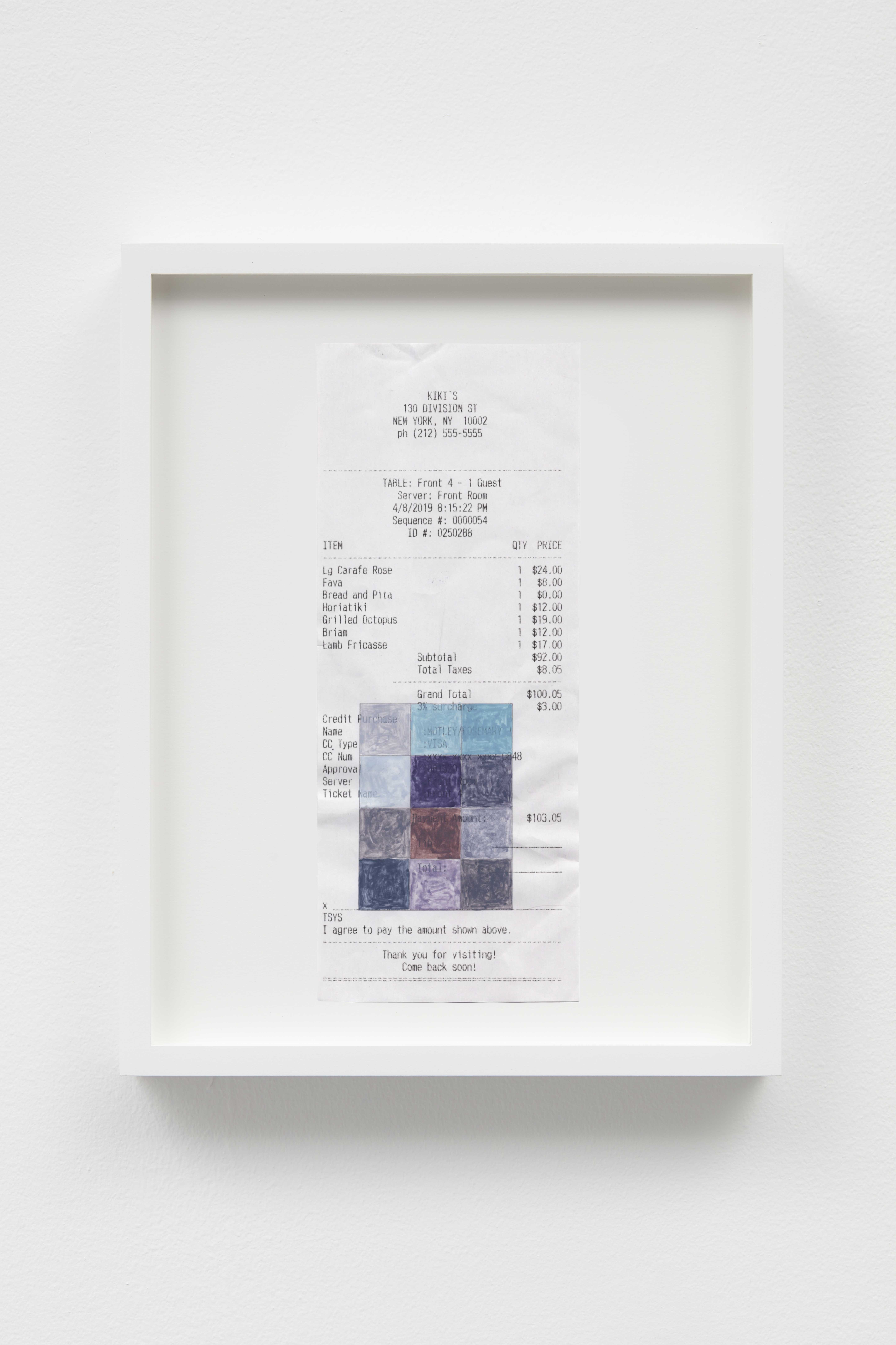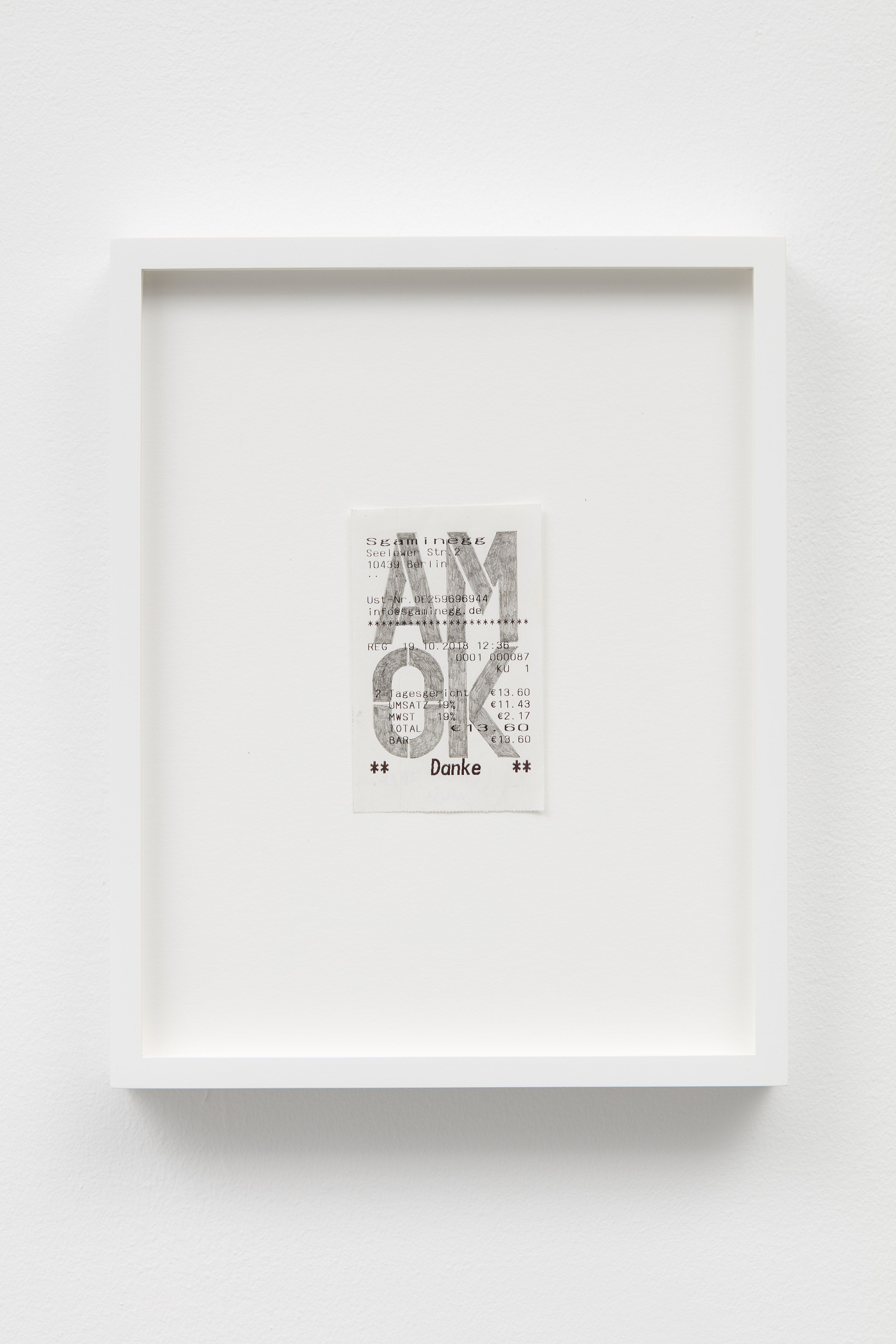 Appropriations of seminal artworks, often immediately recognizable, by artists such as Donald Judd, On Kawara, David Hammons, Sol LeWitt, Christopher Wool, Barbara Kruger and Alighiero Boetti, are rendered in graphite, watercolor and pastel, directly onto the thermal or paper receipts. Once completed, Monk photographs the drawing with his iPhone and posts the image on his Instagram account @monkpictures, where his followers have the opportunity to purchase the artwork for the price of the meal recorded on the receipt (typically ranging between €2 - €250). From Instagram, the works sell rapidly, with Monk’s most attentive followers staking claim on their desired drawing within seconds. The artworks are generally allocated on a first-come-first-serve basis; a gesture of inclusivity in an otherwise exclusionary art market.