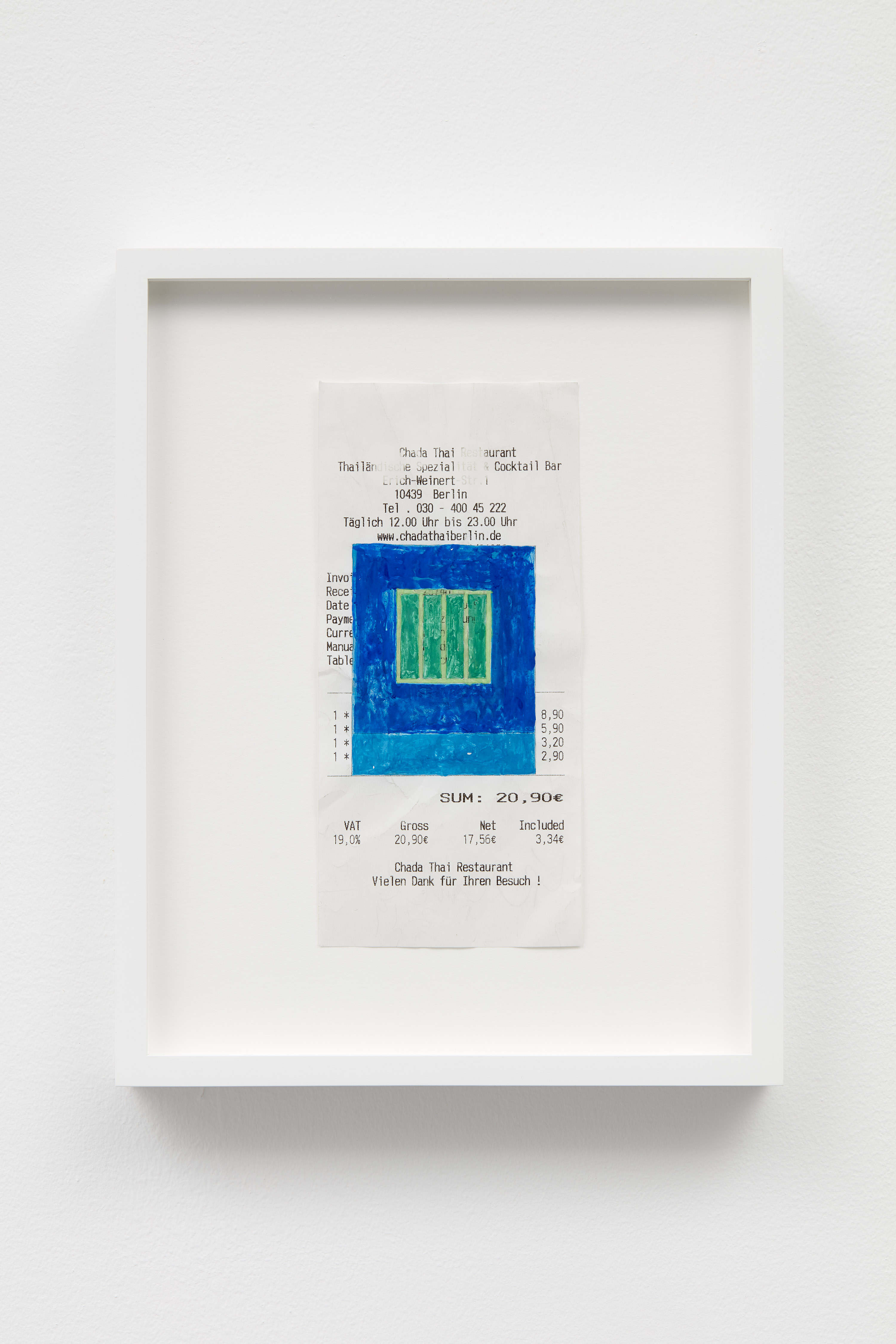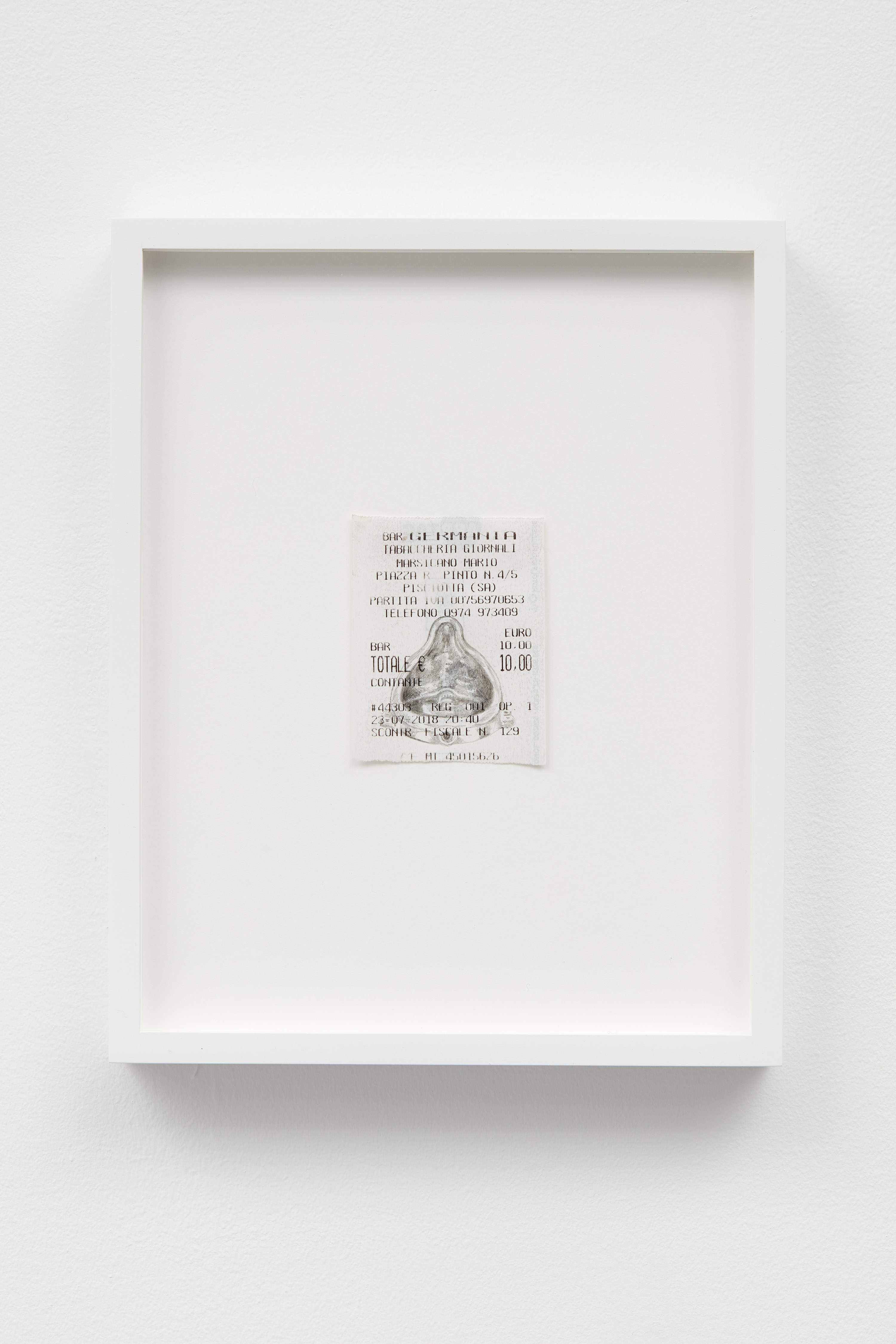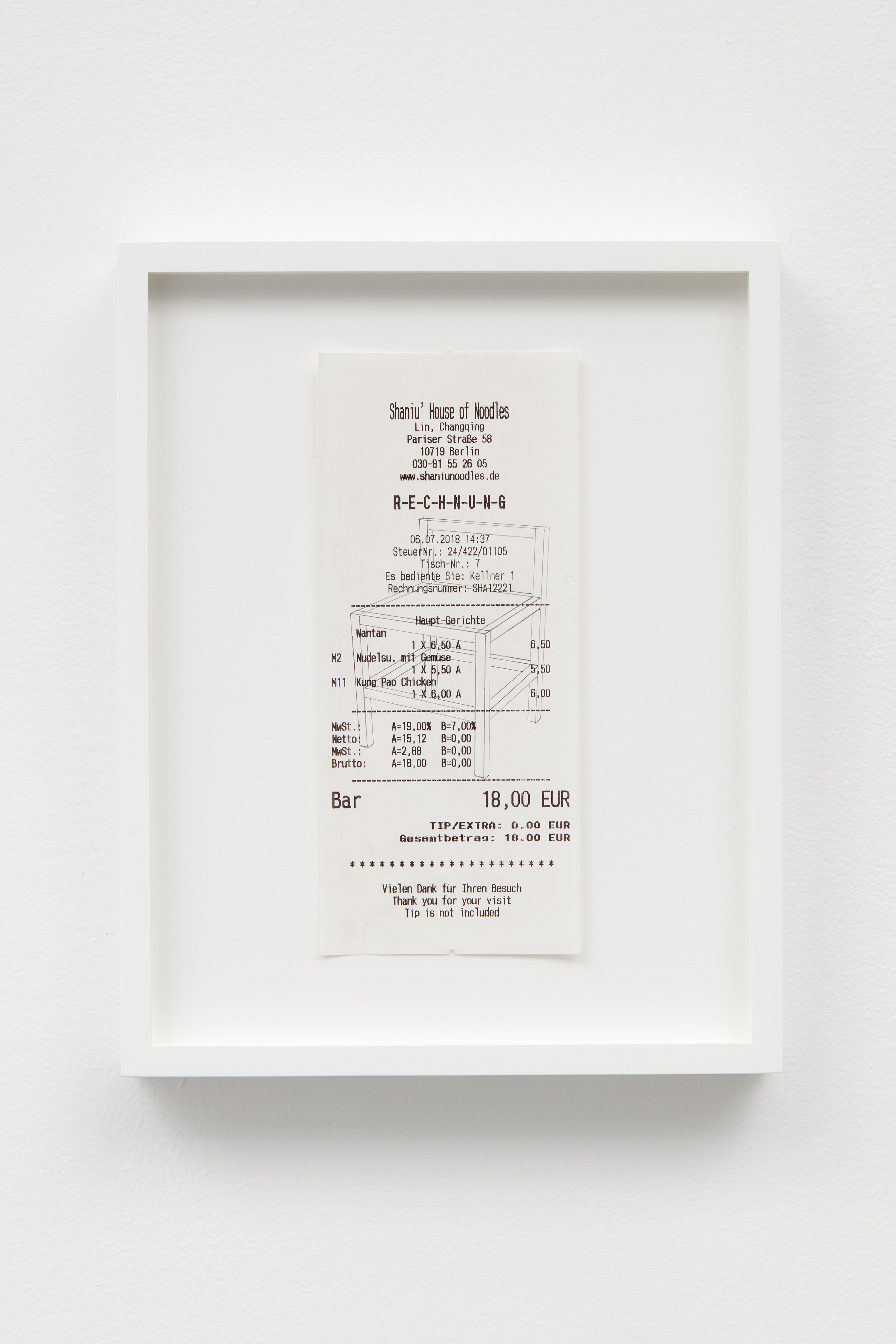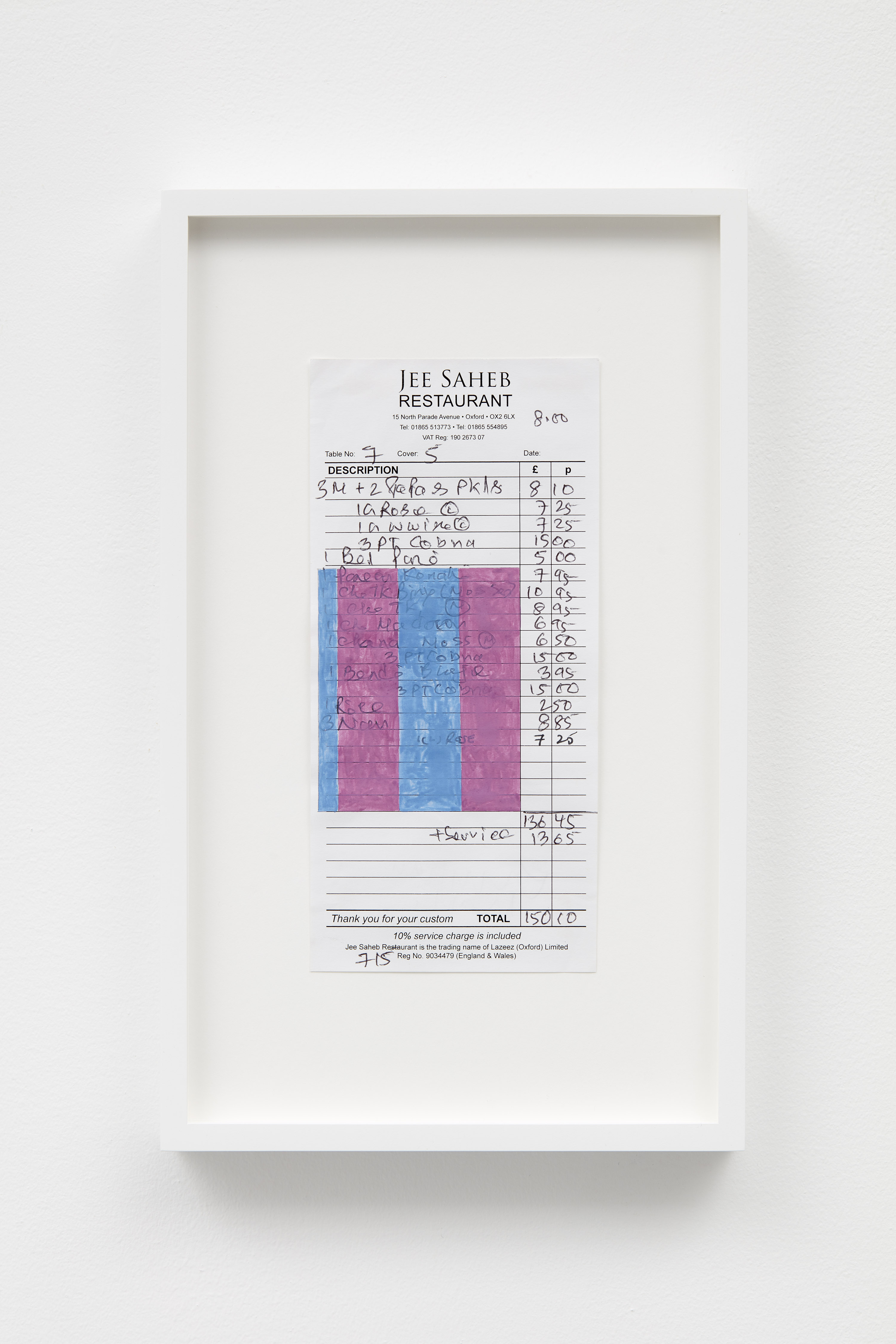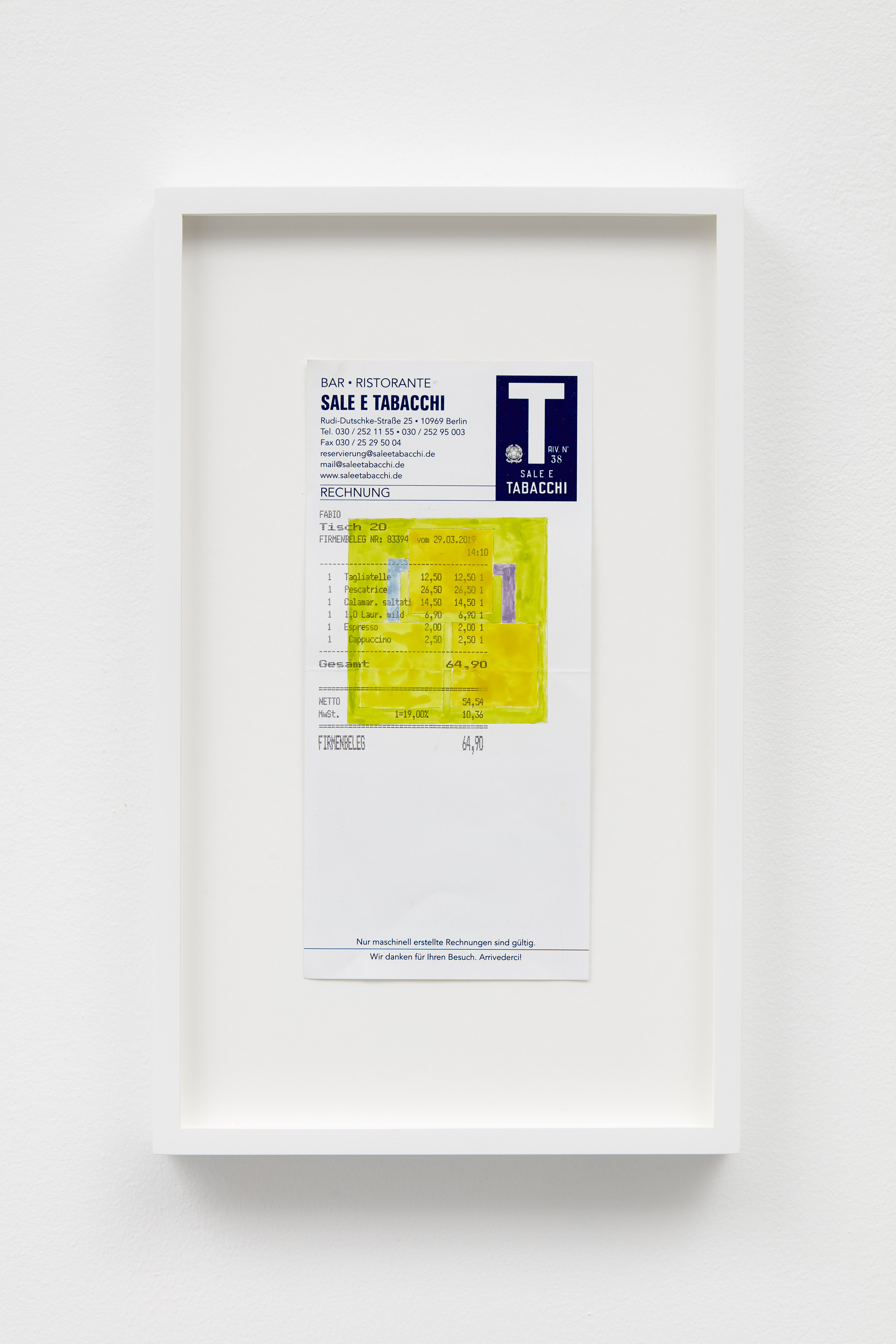 Appropriations of seminal artworks, often immediately recognizable, by artists such as Donald Judd, On Kawara, David Hammons, Sol LeWitt, Christopher Wool, Barbara Kruger and Alighiero Boetti, are rendered in graphite, watercolor and pastel, directly onto the thermal or paper receipts. Once completed, Monk photographs the drawing with his iPhone and posts the image on his Instagram account @monkpictures, where his followers have the opportunity to purchase the artwork for the price of the meal recorded on the receipt (typically ranging between €2 - €250). From Instagram, the works sell rapidly, with Monk’s most attentive followers staking claim on their desired drawing within seconds. The artworks are generally allocated on a first-come-first-serve basis; a gesture of inclusivity in an otherwise exclusionary art market.
