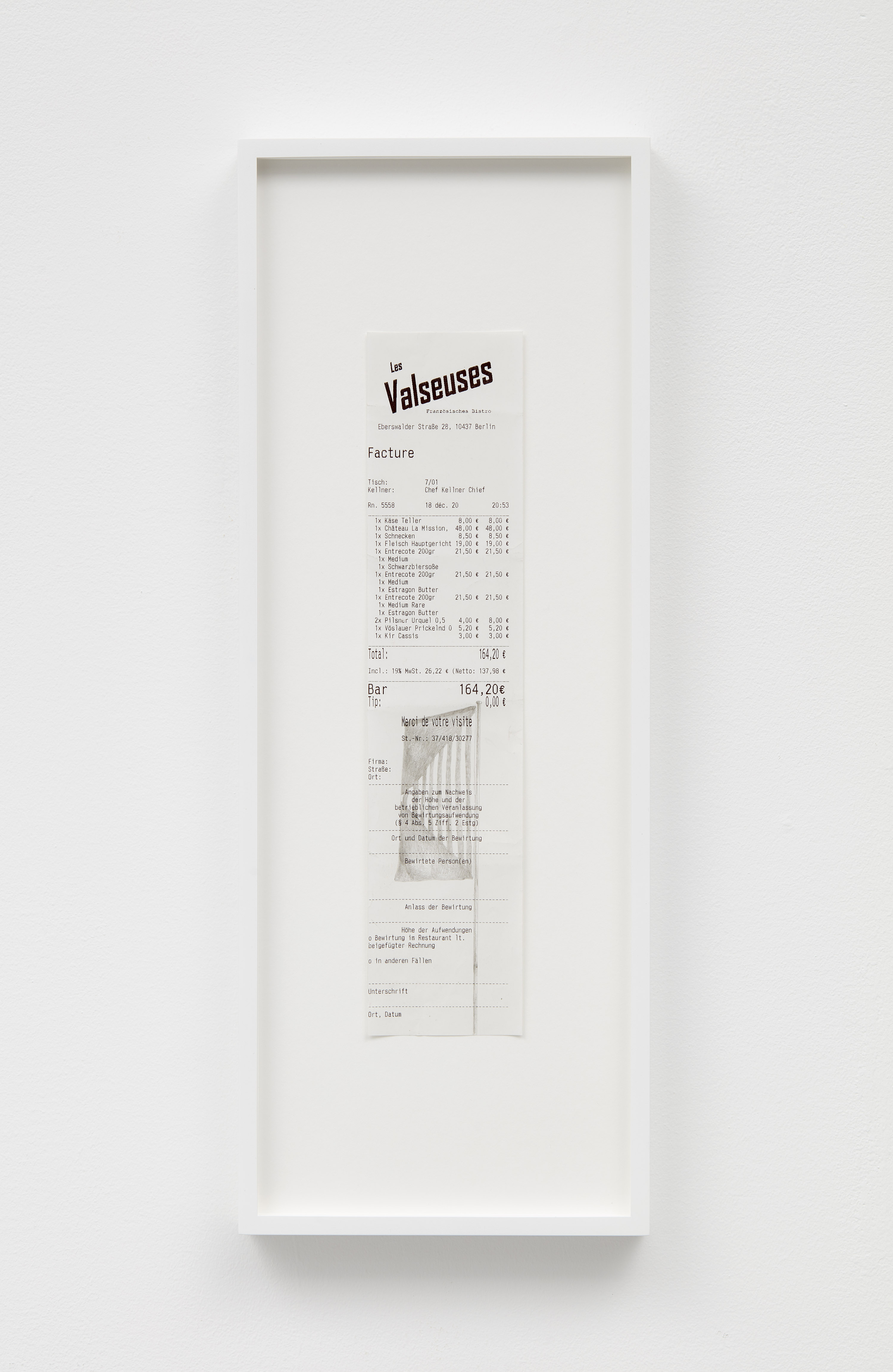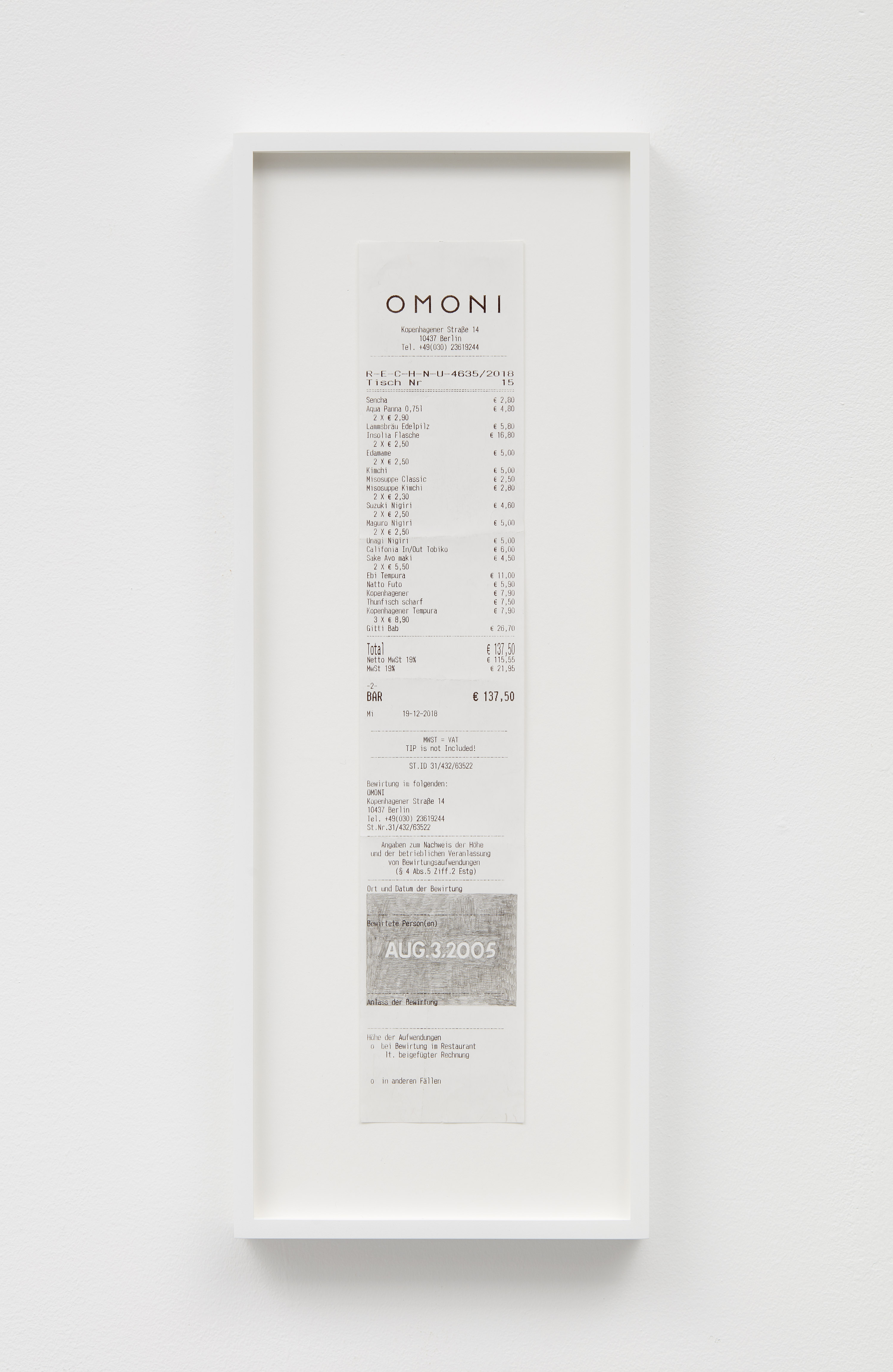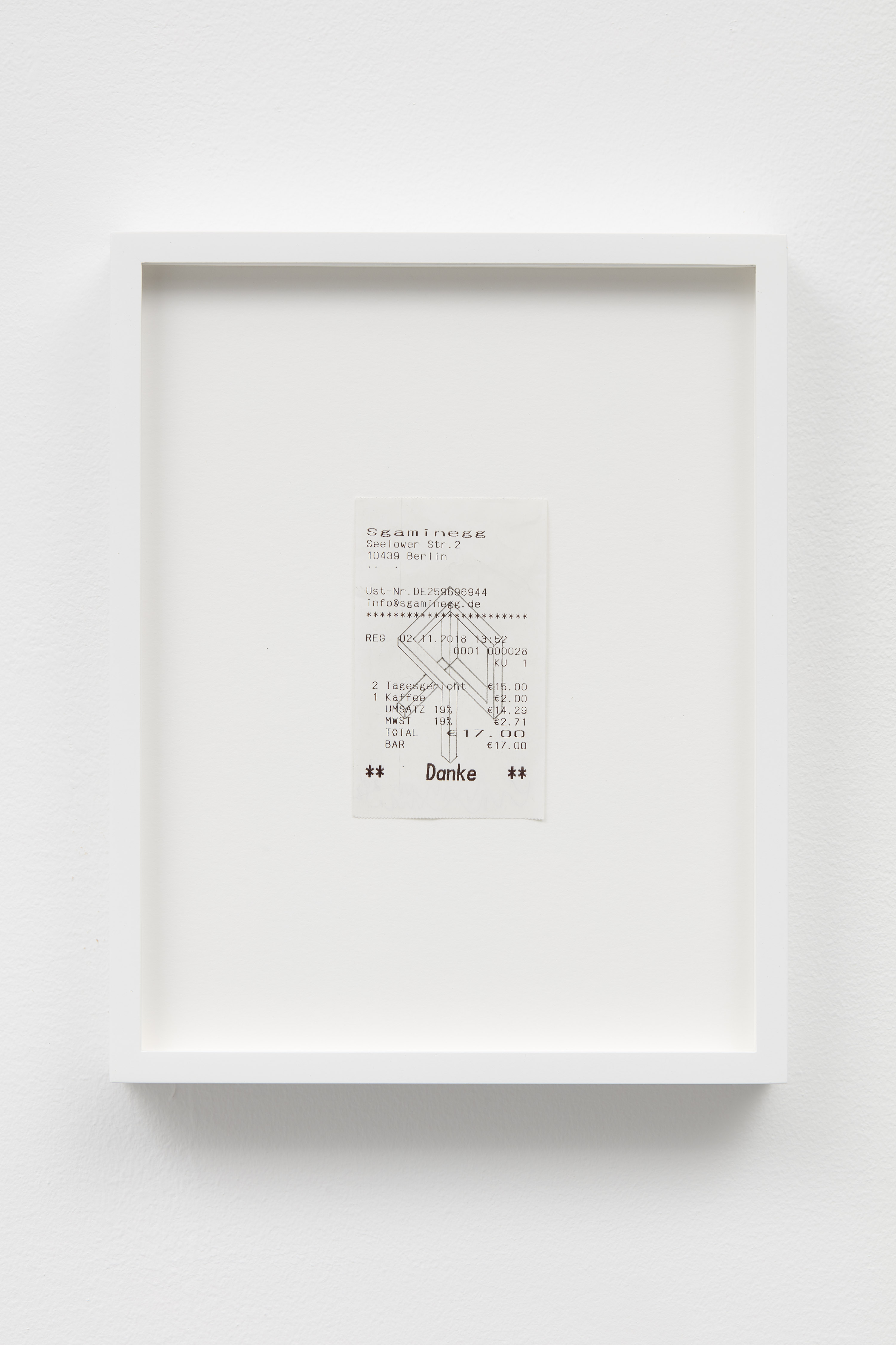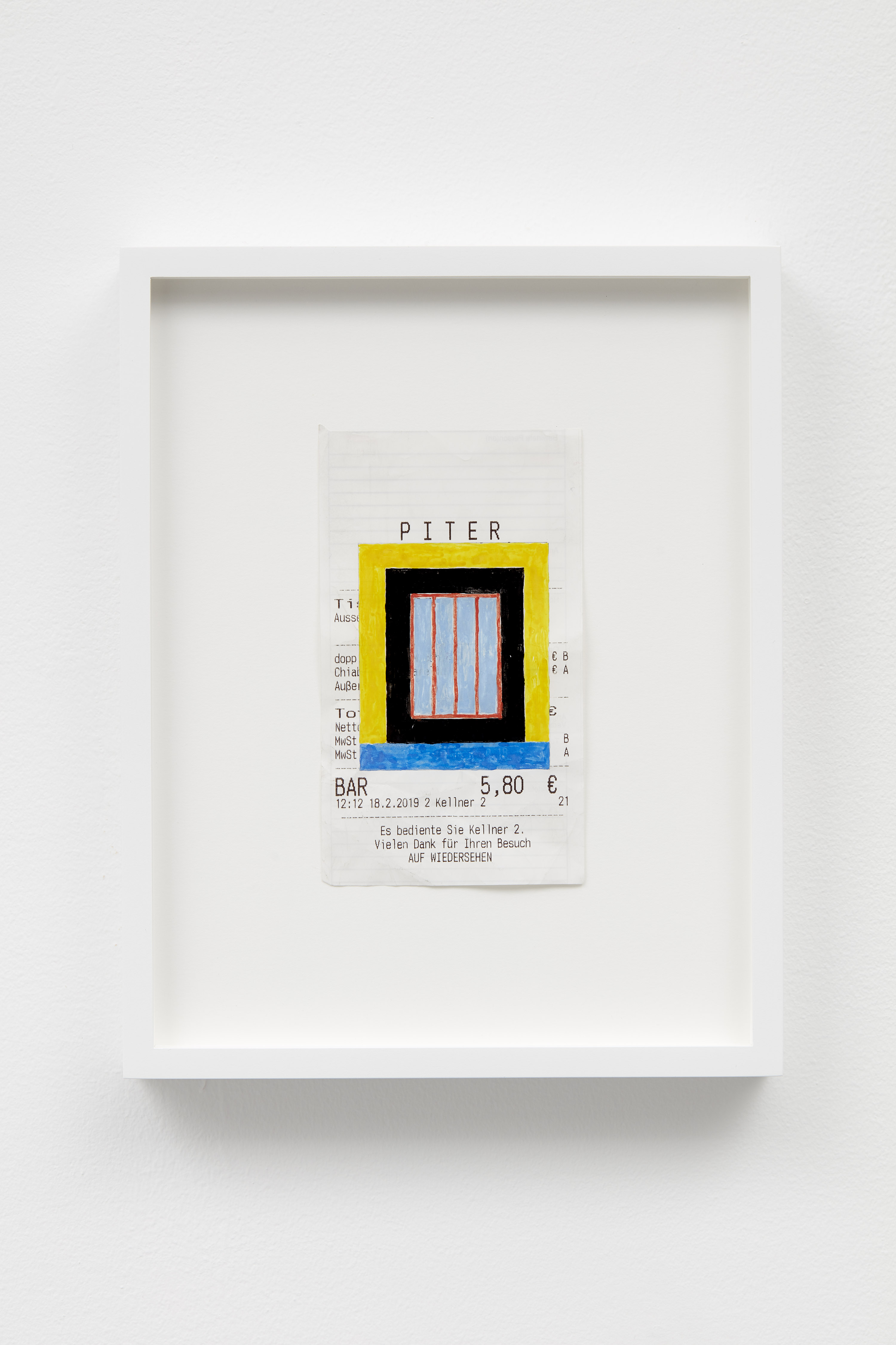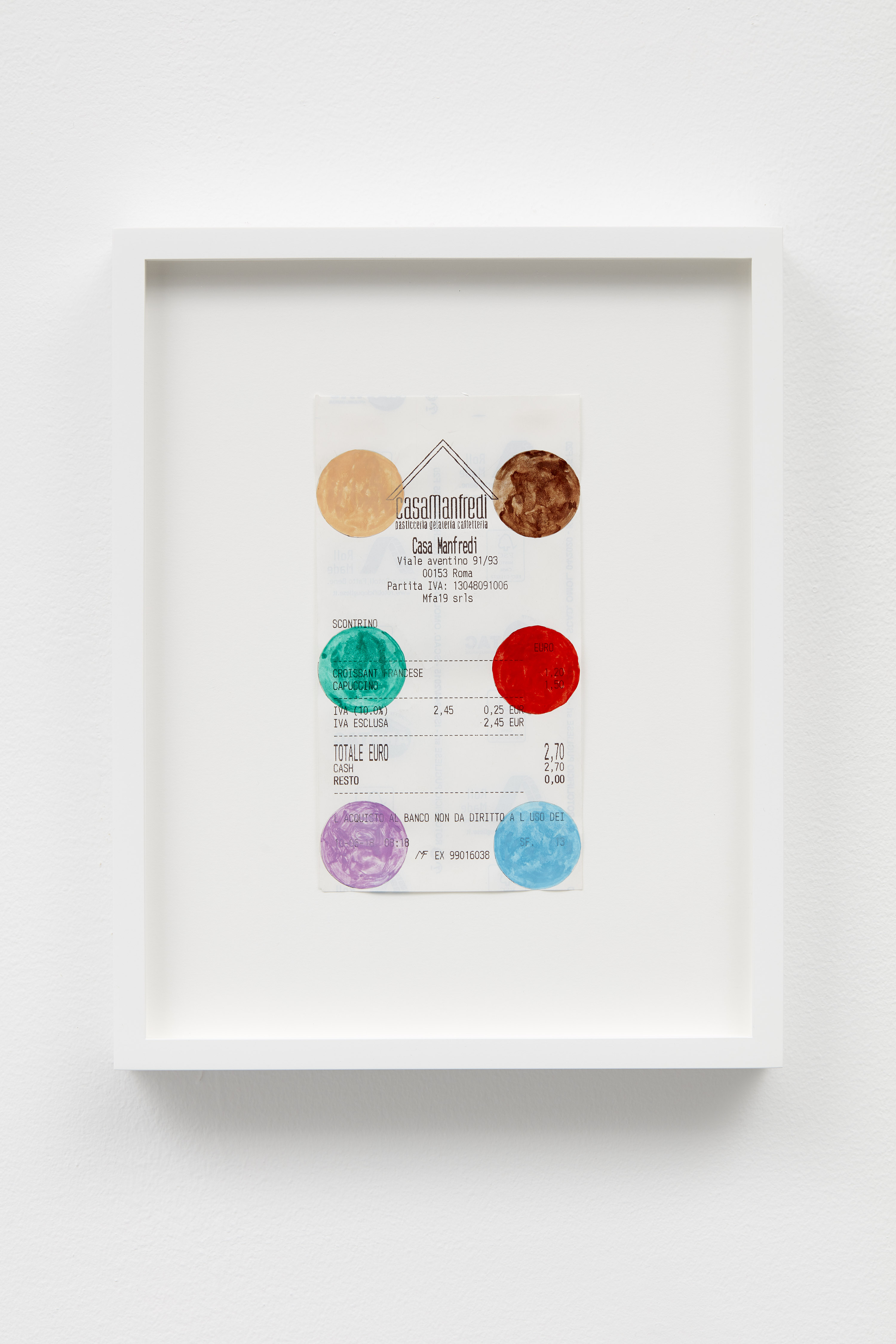 Appropriations of seminal artworks, often immediately recognizable, by artists such as Donald Judd, On Kawara, David Hammons, Sol LeWitt, Christopher Wool, Barbara Kruger and Alighiero Boetti, are rendered in graphite, watercolor and pastel, directly onto the thermal or paper receipts. Once completed, Monk photographs the drawing with his iPhone and posts the image on his Instagram account @monkpictures, where his followers have the opportunity to purchase the artwork for the price of the meal recorded on the receipt (typically ranging between €2 - €250). From Instagram, the works sell rapidly, with Monk’s most attentive followers staking claim on their desired drawing within seconds. The artworks are generally allocated on a first-come-first-serve basis; a gesture of inclusivity in an otherwise exclusionary art market.