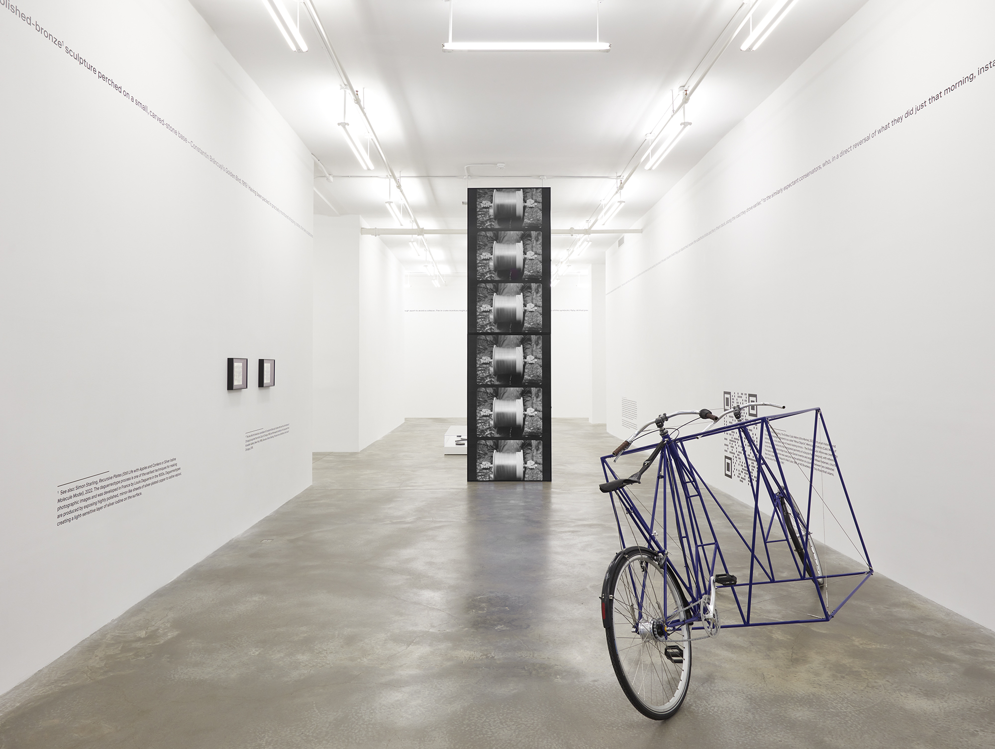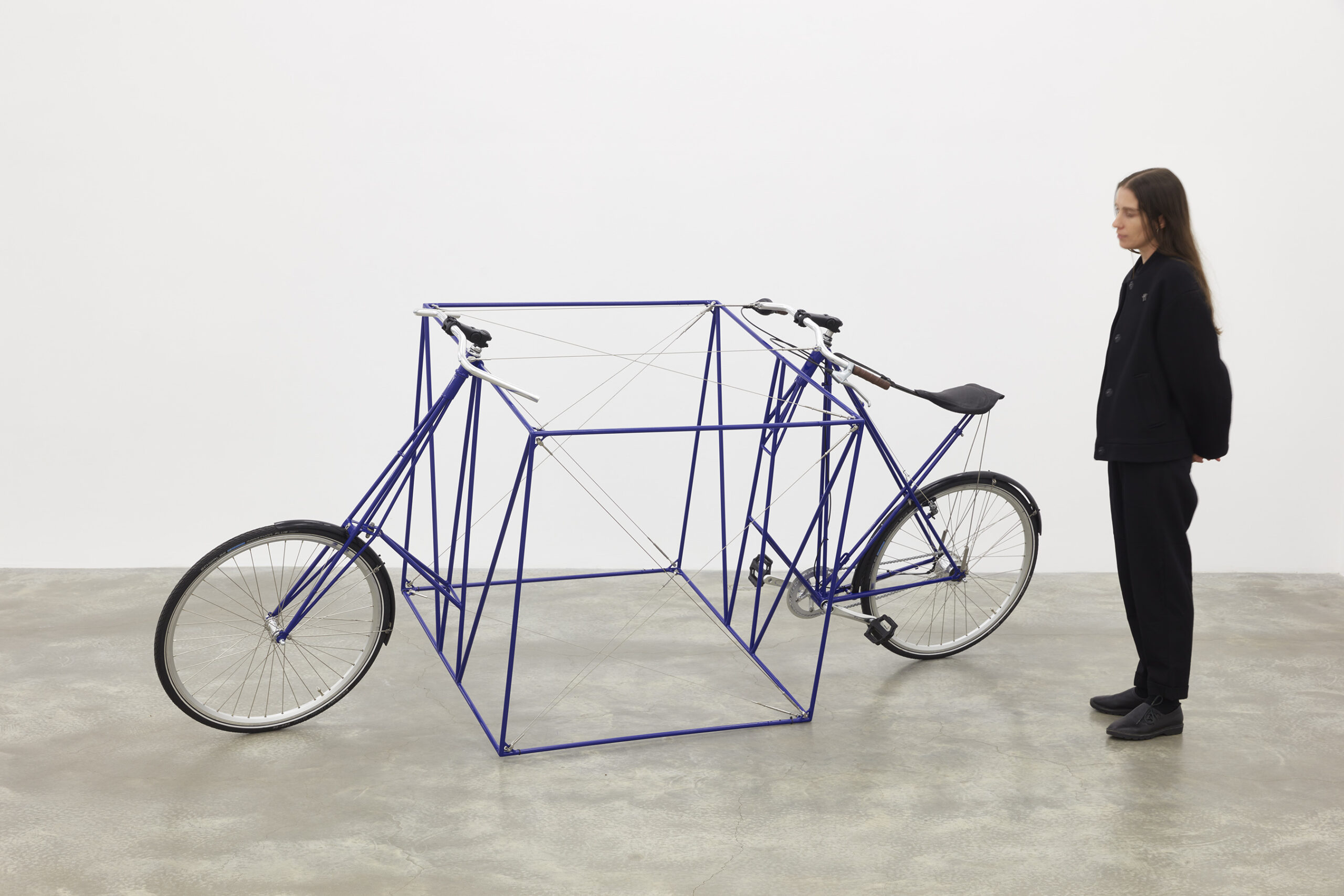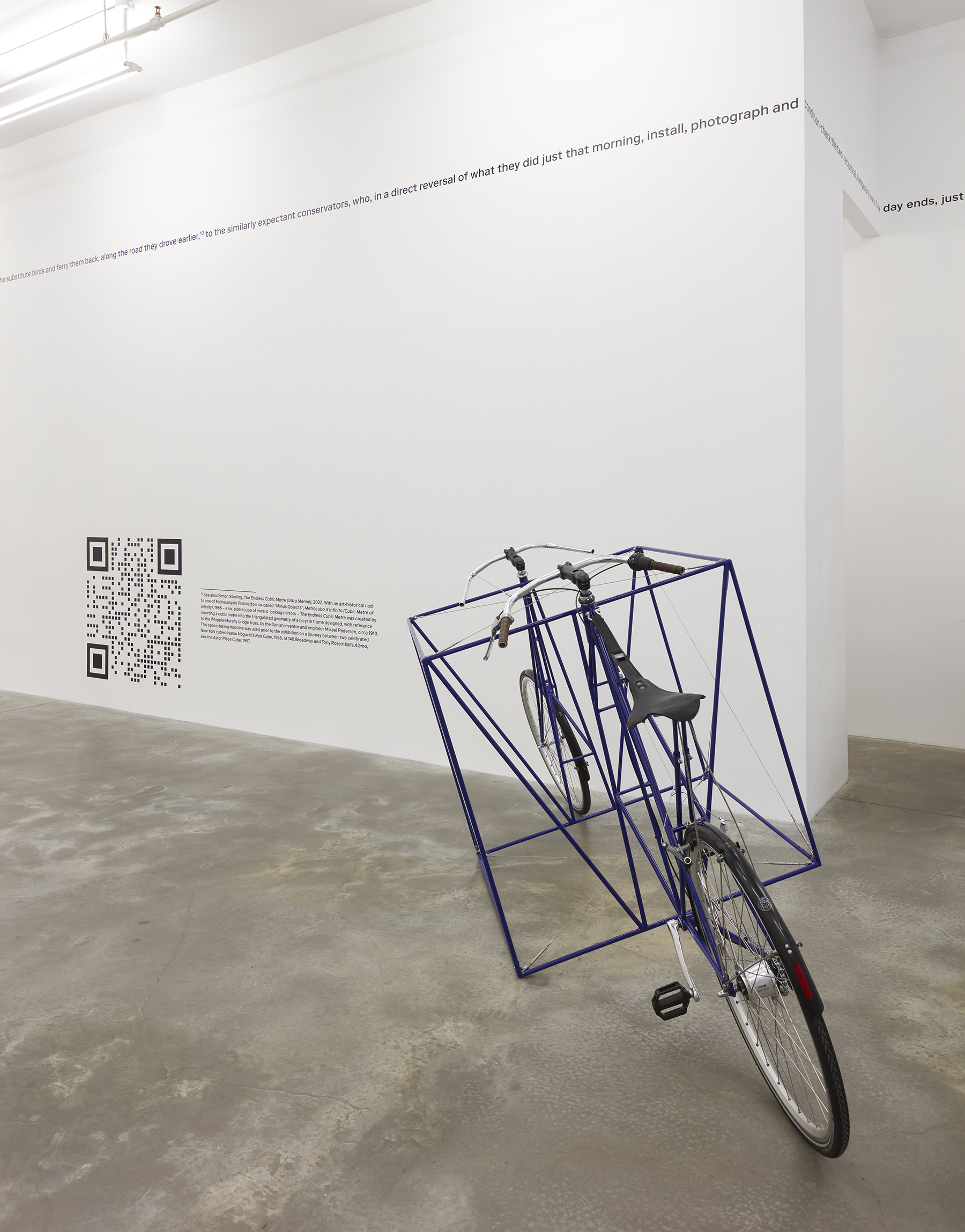Transmutations of objects in space, and in transit, can be seen throughout Two Birds, No Birds. Starling’s The Endless Cubic Metre (Ultra Marine) (2022) occupies floor space in a nod to Michelangelo Pistoletto’s so-called “Minus Objects”, Metrocubo d’Infinito (Cubic Metre of Infinity) (1966), a six-sided cube of inward-looking mirrors. In contrast, Starling’s sculpture is both aesthetic and functional, created by inserting a cubic meter into the triangulated geometry of a bicycle frame. Drawing from a bicycle designed by Danish engineer Mikael Pedersen circa 1910 with reference to the Whipple-Murphy bridge truss, Starling’s peculiar reworking of this little-known design classic is in fact rideable and served as transport for the artist’s trek between two celebrated New York cubes: Isamu Noguchi’s Red Cube (1968) located at 140 Broadway and Tony Rosenthal’s Alamo, aka the Astor Place Cube (1967). A square meter-sized QR code links viewers to documentation of the short voyage.