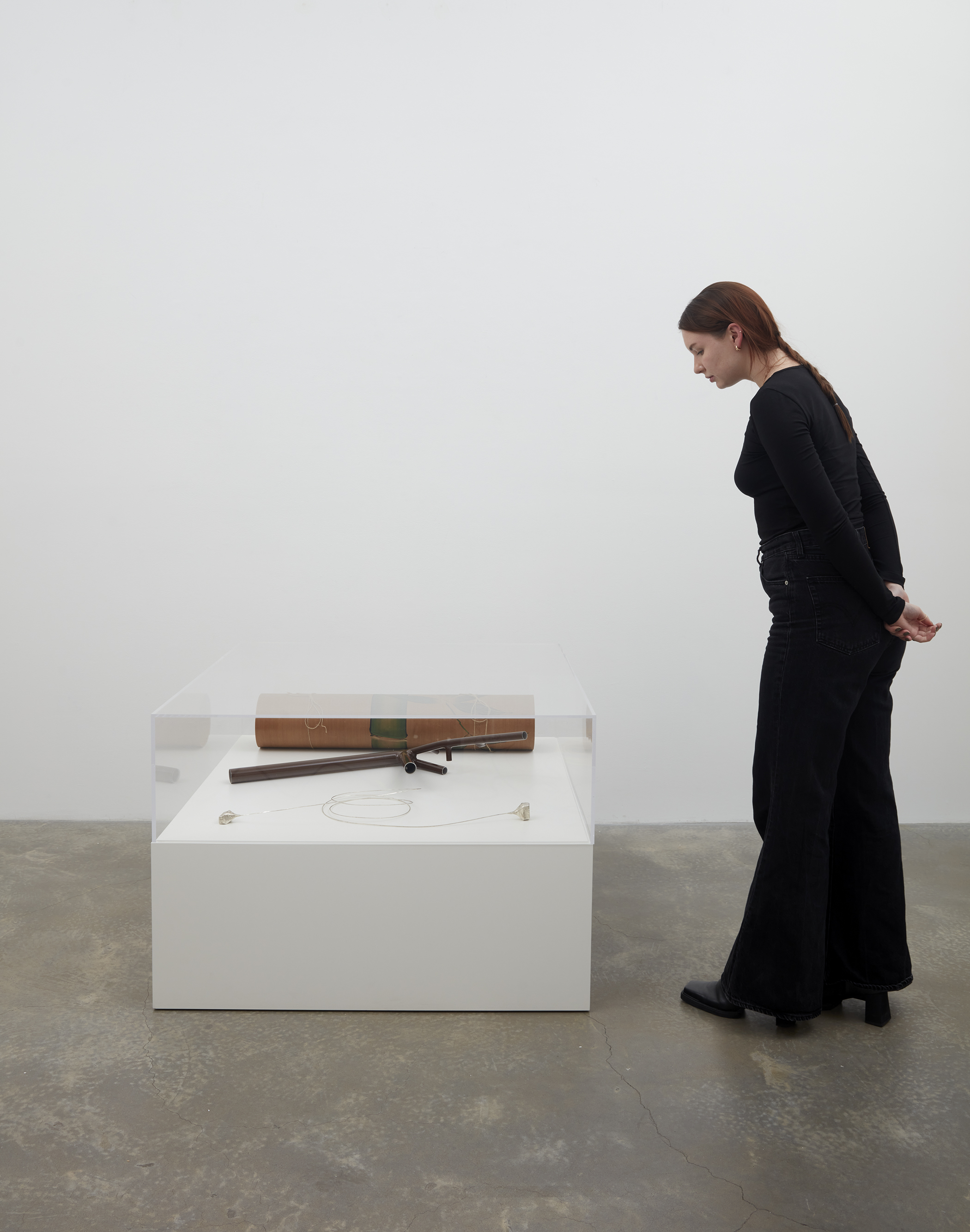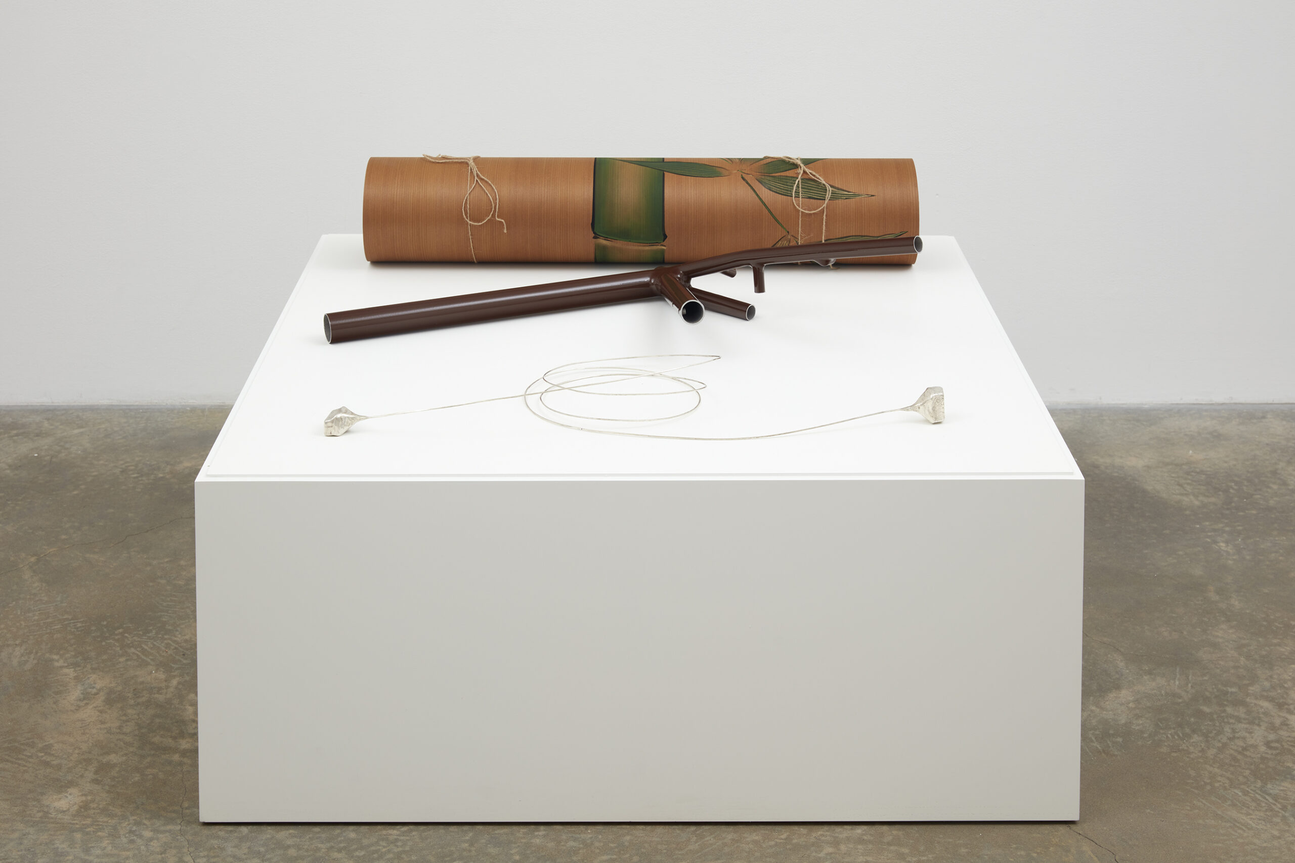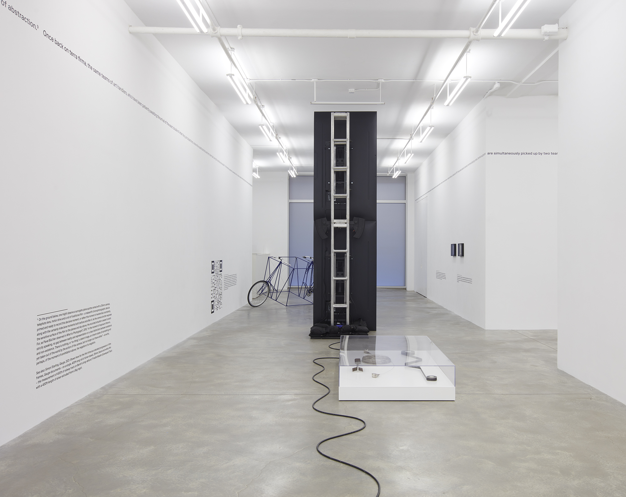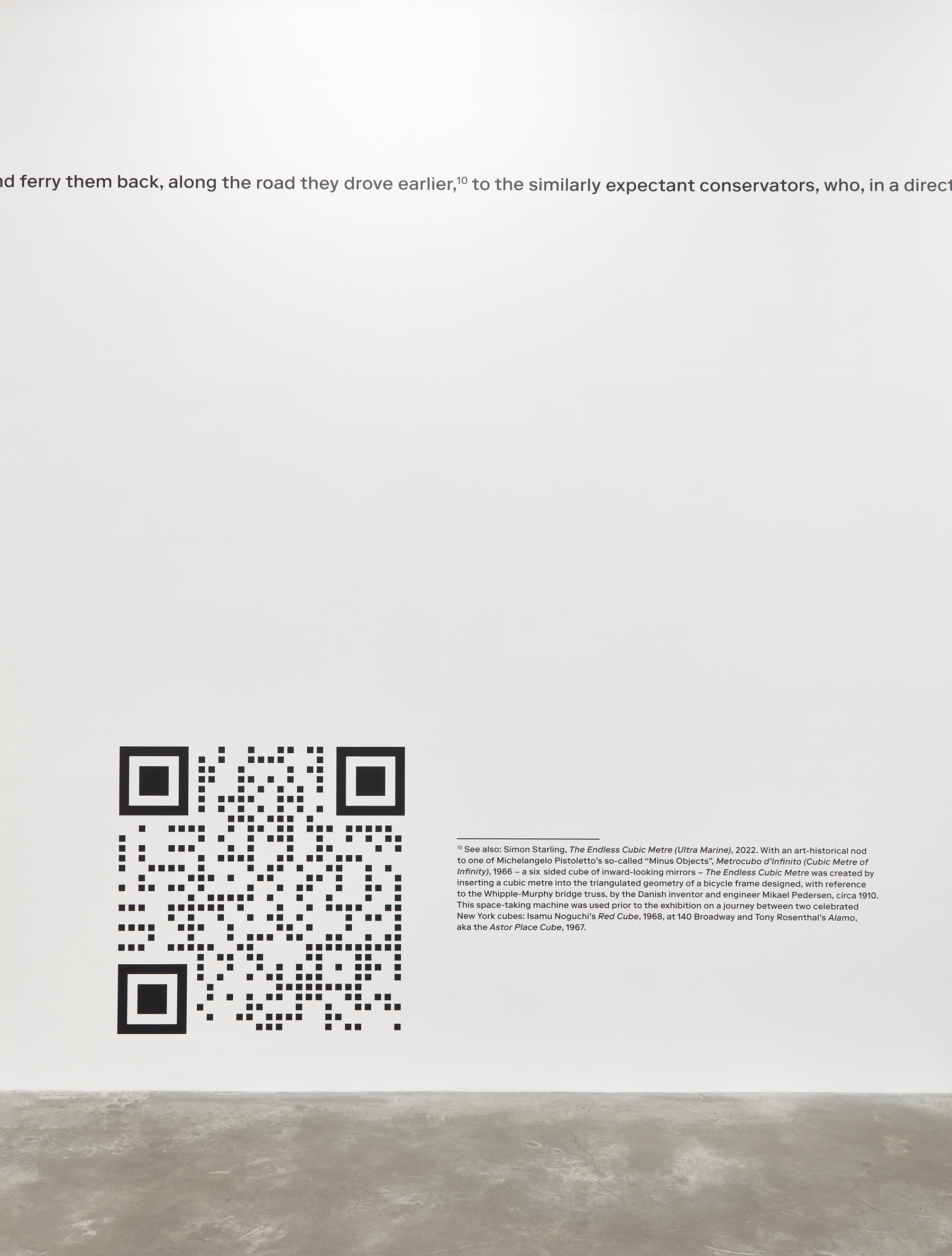Transmutations of objects in space, and in transit, can be seen throughout Two Birds, No Birds. Starling’s The Endless Cubic Metre (Ultra Marine) (2022) occupies floor space in a nod to Michelangelo Pistoletto’s so-called “Minus Objects”, Metrocubo d’Infinito (Cubic Metre of Infinity) (1966), a six-sided cube of inward-looking mirrors. In contrast, Starling’s sculpture is both aesthetic and functional, created by inserting a cubic meter into the triangulated geometry of a bicycle frame. Drawing from a bicycle designed by Danish engineer Mikael Pedersen circa 1910 with reference to the Whipple-Murphy bridge truss, Starling’s peculiar reworking of this little-known design classic is in fact rideable and served as transport for the artist’s trek between two celebrated New York cubes: Isamu Noguchi’s Red Cube (1968) located at 140 Broadway and Tony Rosenthal’s Alamo, aka the Astor Place Cube (1967). A square meter-sized QR code links viewers to documentation of the short voyage.