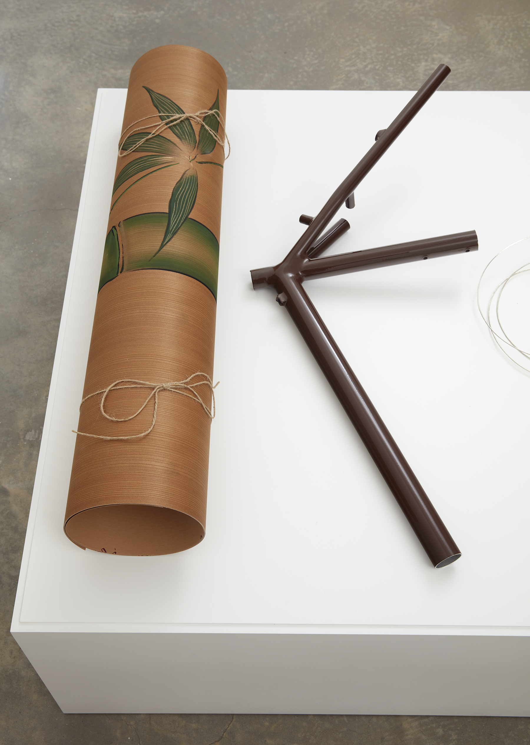 Extruded silver ingot, stained and painted Japanese cedar veneer, cut aluminum bike frame