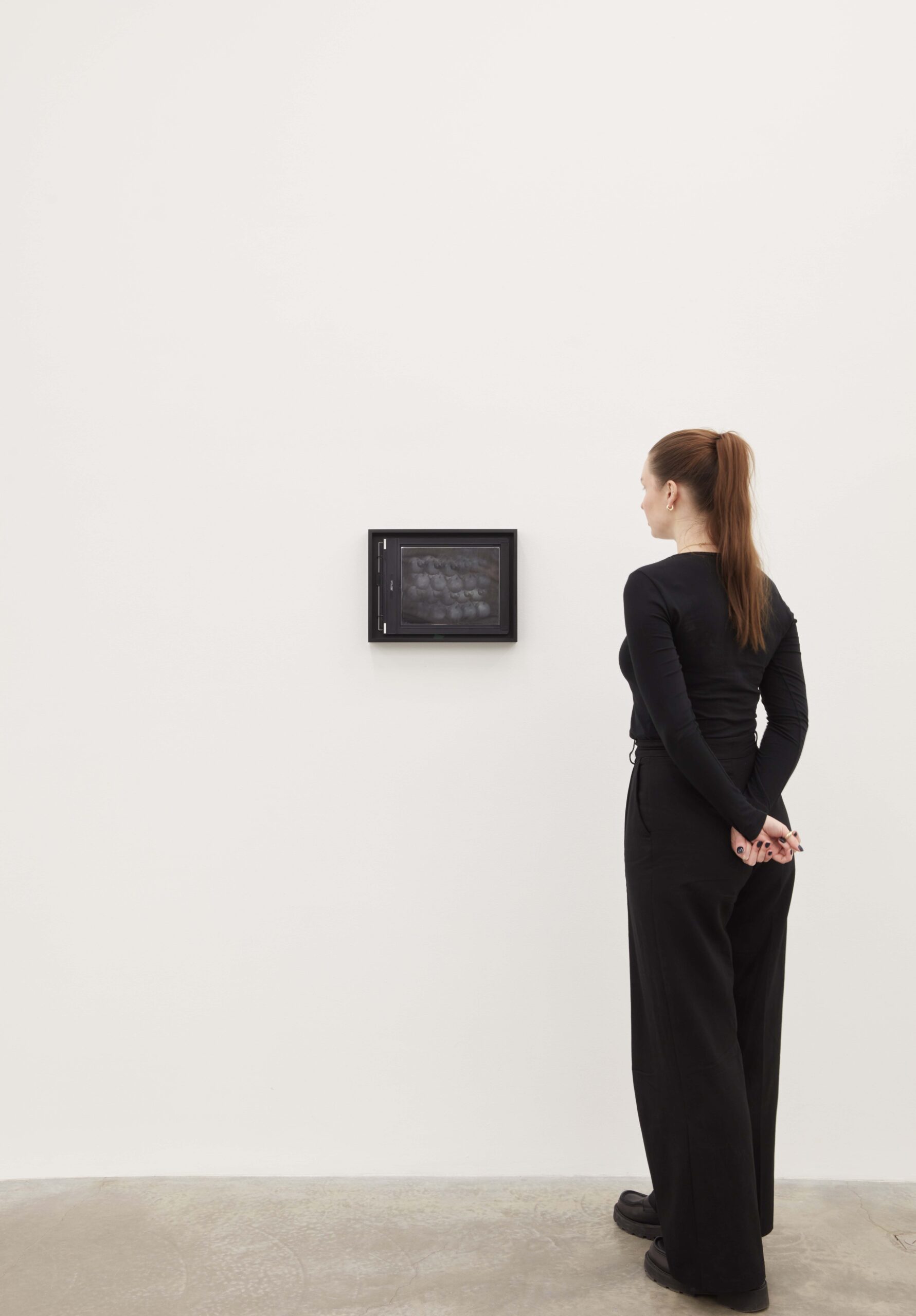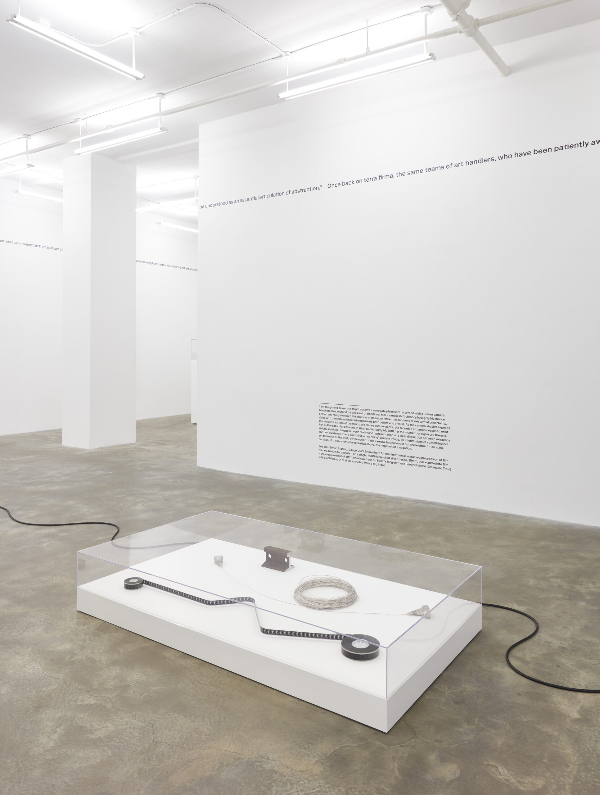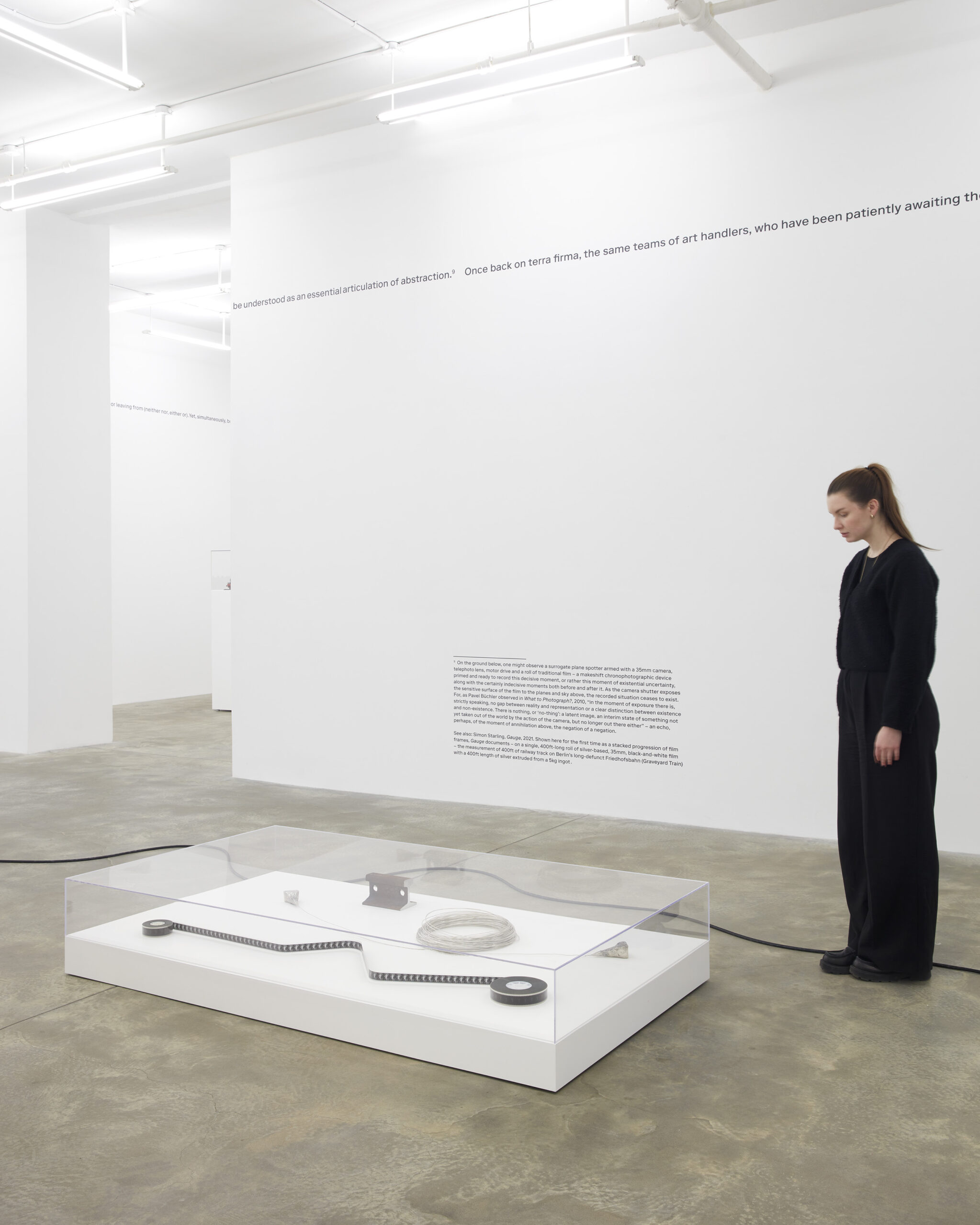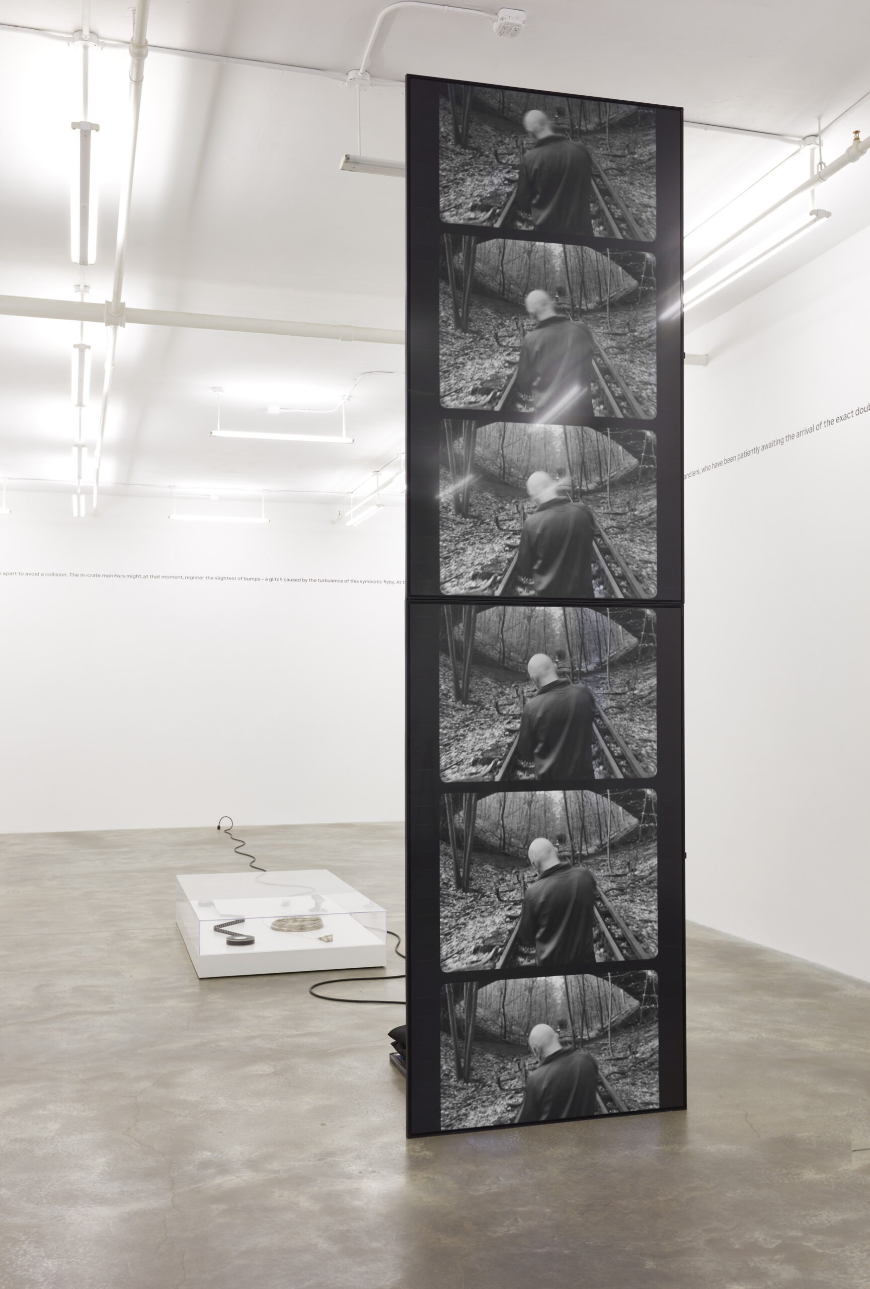 Gauge (2021), originally realized as part of the Oku Noto Triennale as a public work on an abandoned railway line on the Oku Noto Peninsular in Japan, is shown here for the first time as a stacked progression of film frames on a vertiginous screen. It is a single 400ft-long roll of silver-based 35mm black-and-white film, equating to the measurement of 400ft of railway track on Berlin’s long-defunct Friedhofsbahn (Graveyard Train) with a 400ft length of silver extruded from a 5kg ingot. These interrelated components – 5kg of railway track along with 400ft of both silver and film material – are physically present within the exhibition as if, like all the subjects of Two Birds, No Birds, they are participating in an invented pilgrimage that ends where the physical and the digital converge.