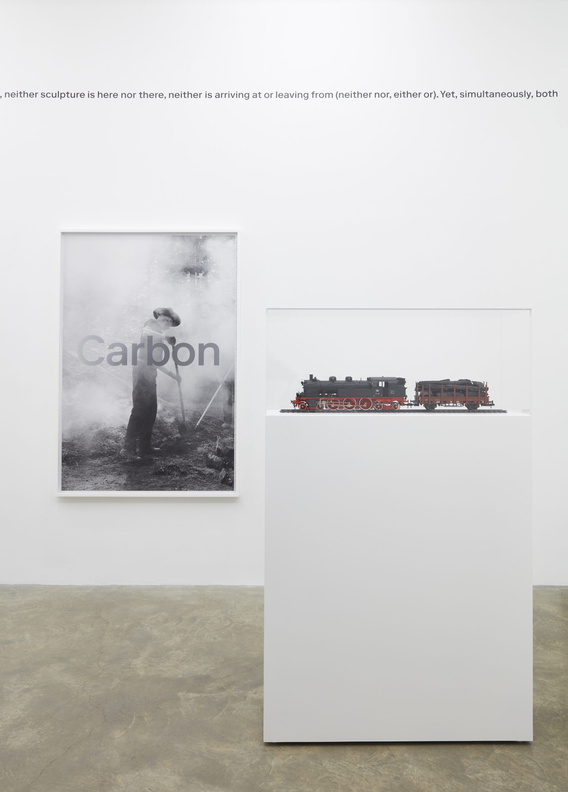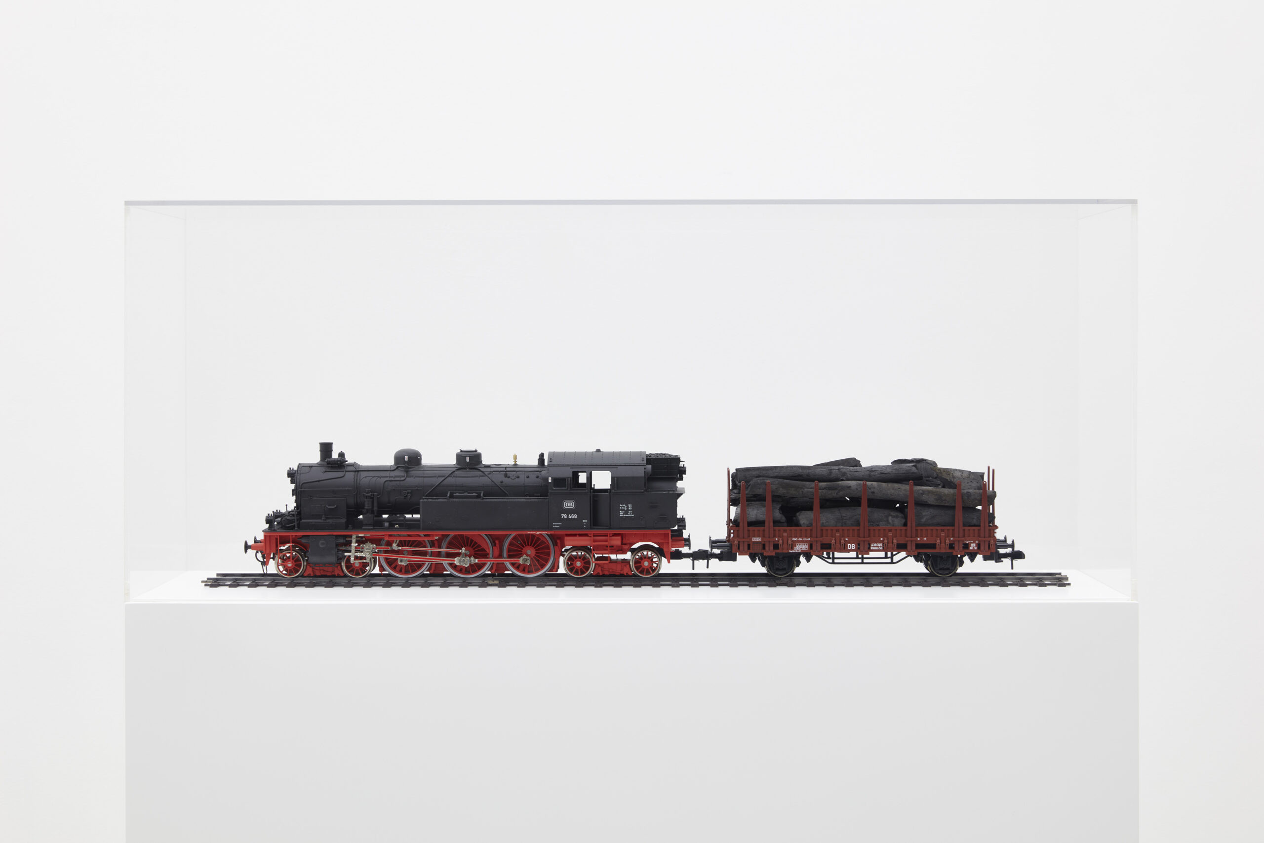 Whereas Two Birds, No Birds proposes the movement of sculptures from one museum to another, the project Carbon (Hagen – Essen) (2022) marks the 100th anniversary of the relocation of an entire museum: the Museum Folkwang, one of Europe’s first museums of contemporary art, which moved from Hagen to Essen in 1922. On August 6, 2022, a steam locomotive (DB 78 468), represented here as a quarter-inch scale O gauge model, retraced the route. This commemorative journey was fueled exclusively by charcoal produced from seven cubic meters of timber cut at the wooded site of an unbuilt art school, the Folkwangschule, Hagen, designed in 1920 by Bruno Taut for the museum’s founder Karl Osthaus.
