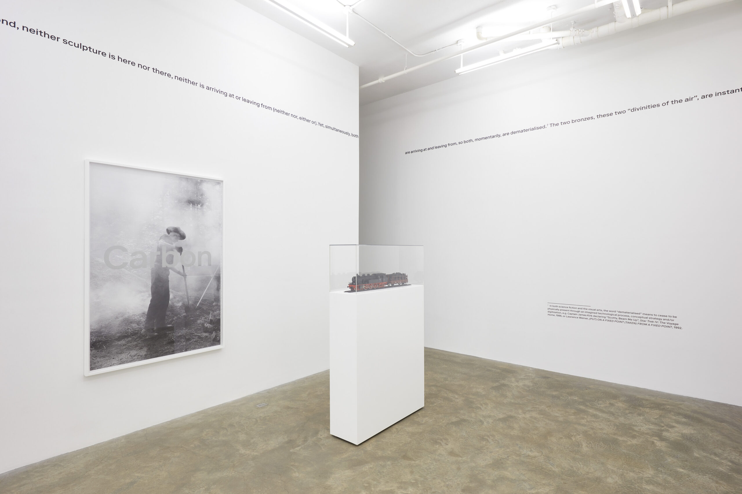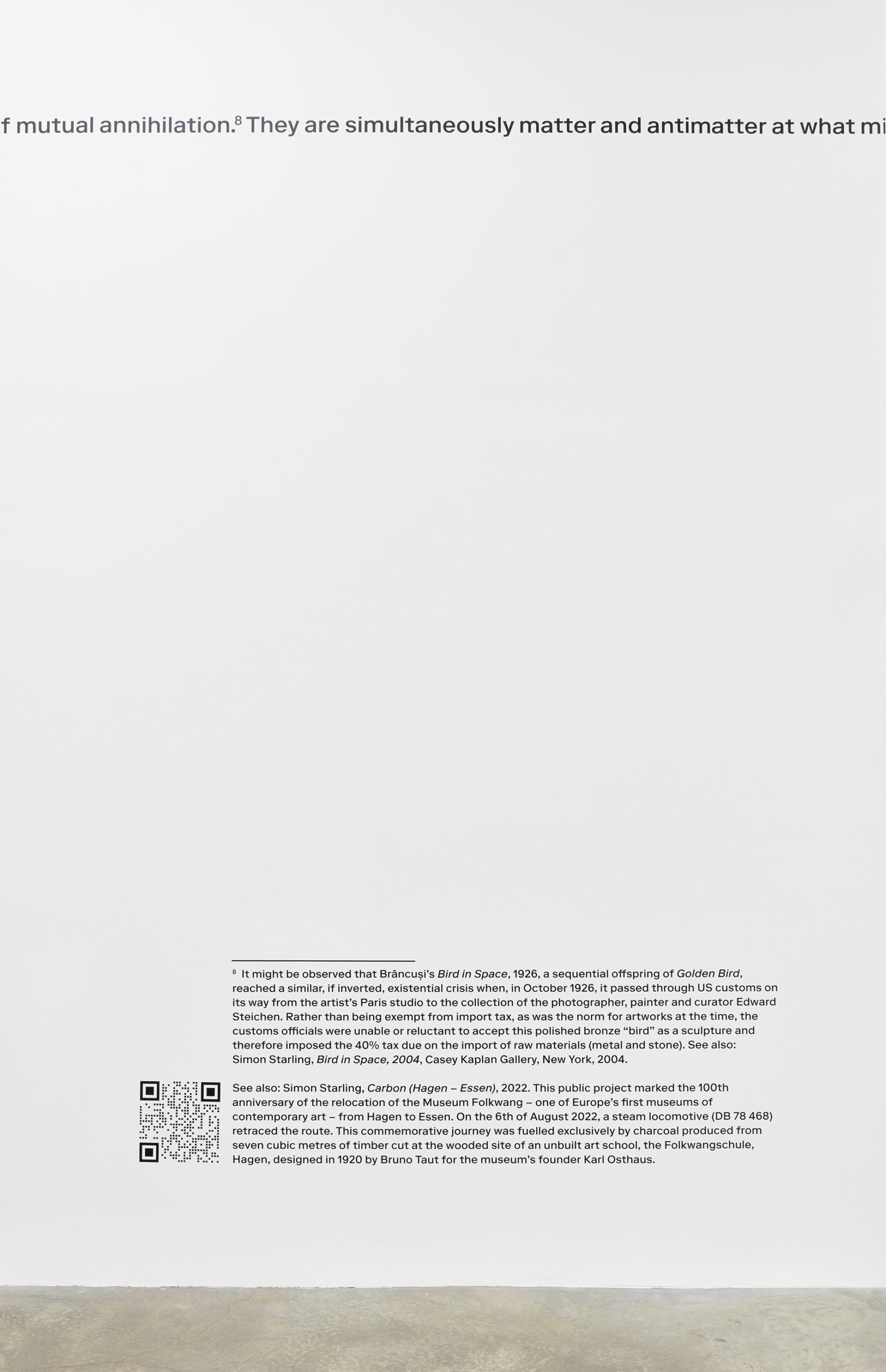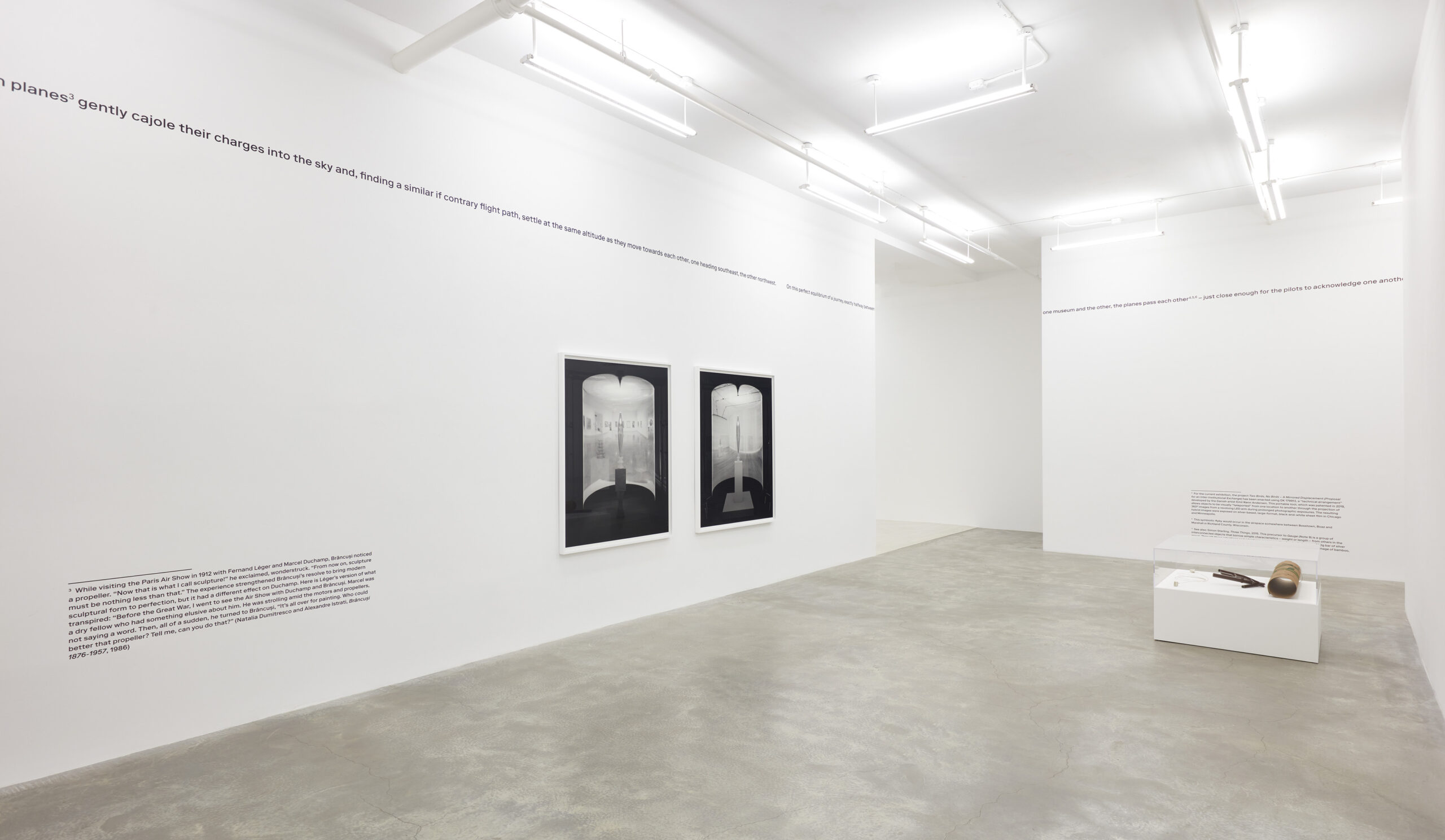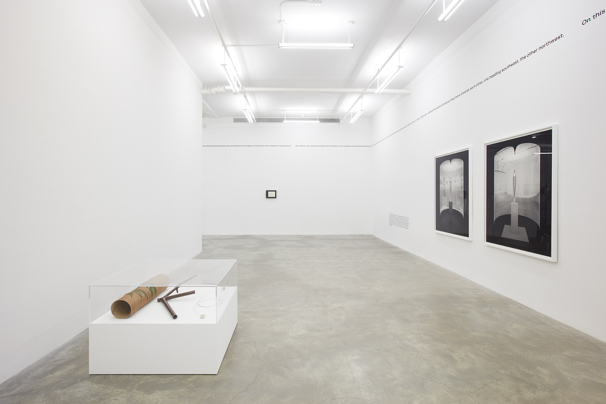 Lining the gallery walls is a fictitious scenario describing the symbiotic journeys of two separate copies of Golden Bird – one on view at the Minneapolis Institute of Art and the other at the Art Institute of Chicago. Each packed, crated, and shipped by air, the bronze sculptures pass each other mid-flight at exactly halfway between one museum and the other…in a fleeting and concurrent moment of existential dematerialization. So too does the text bisect the gallery walls, running along the central axis of the space as if to imitate the birds’ flight paths.