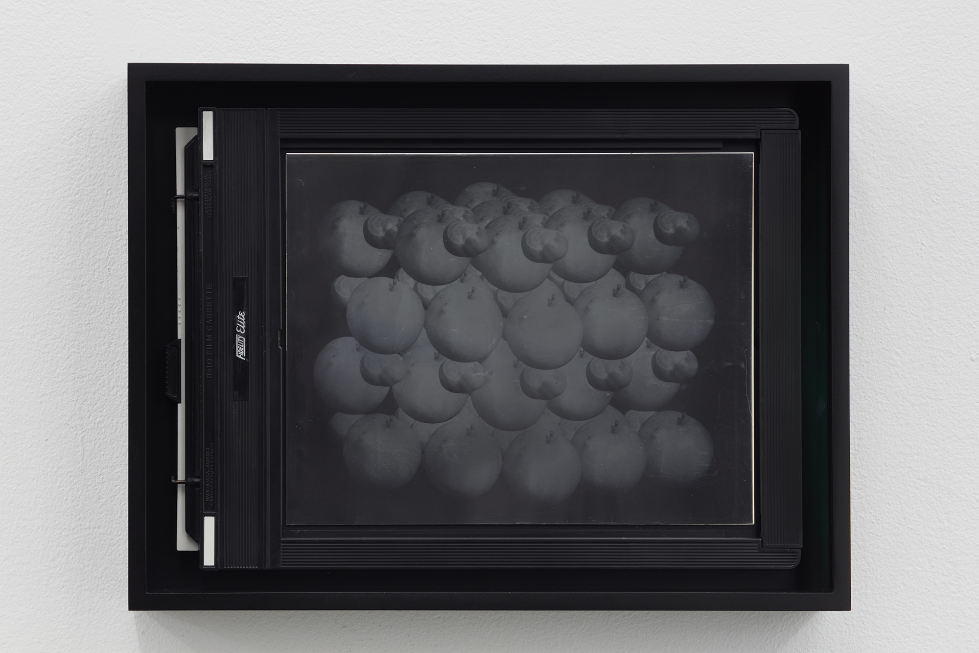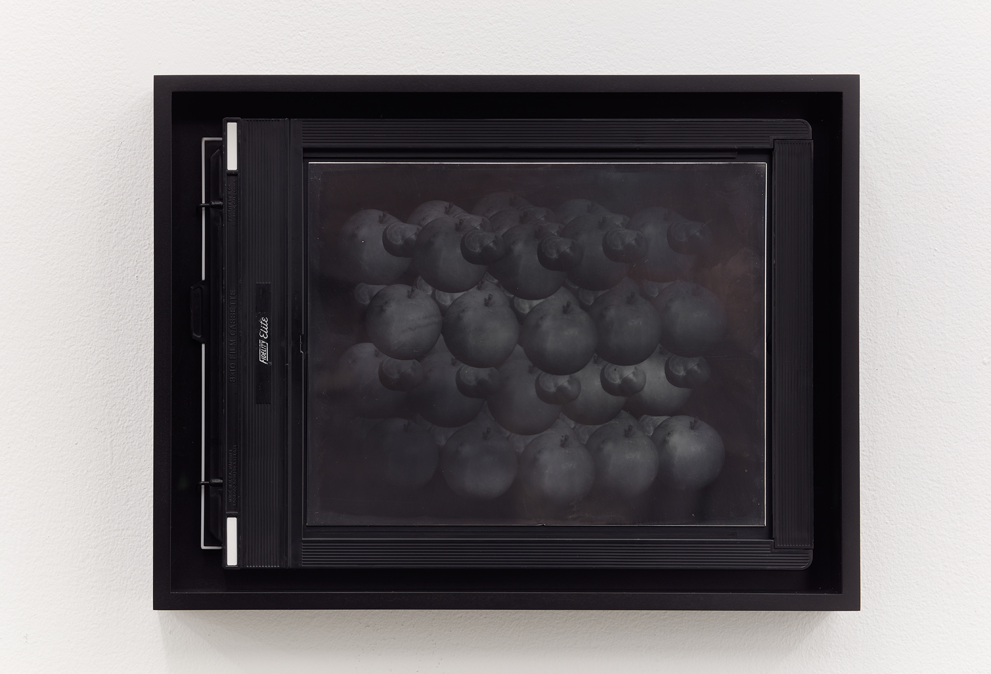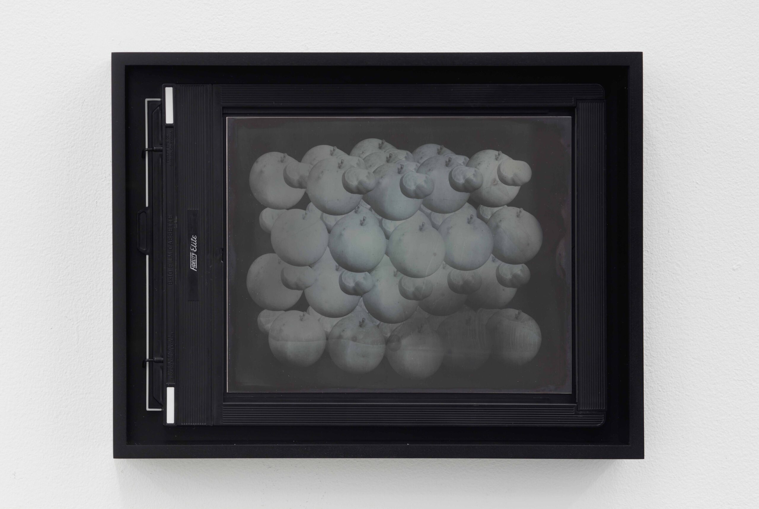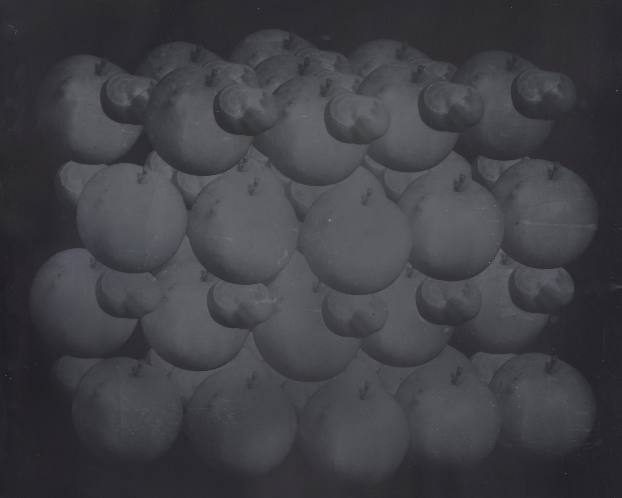 These reflective surfaces are echoed elsewhere in a series of new daguerreotypes, Recursive Plates (Still Life with Apples and Conkers or Silver Iodine Molecule Model) (2022). Similarly hybrid in nature, part age-old daguerreotype, part contemporary-composited digital image, these ghostly images are made on sheets of highly polished silver-plated copper and depict apples and conkers aligned to form a molecular model of silver iodine, the photosensitive compound with which the exposures are made.