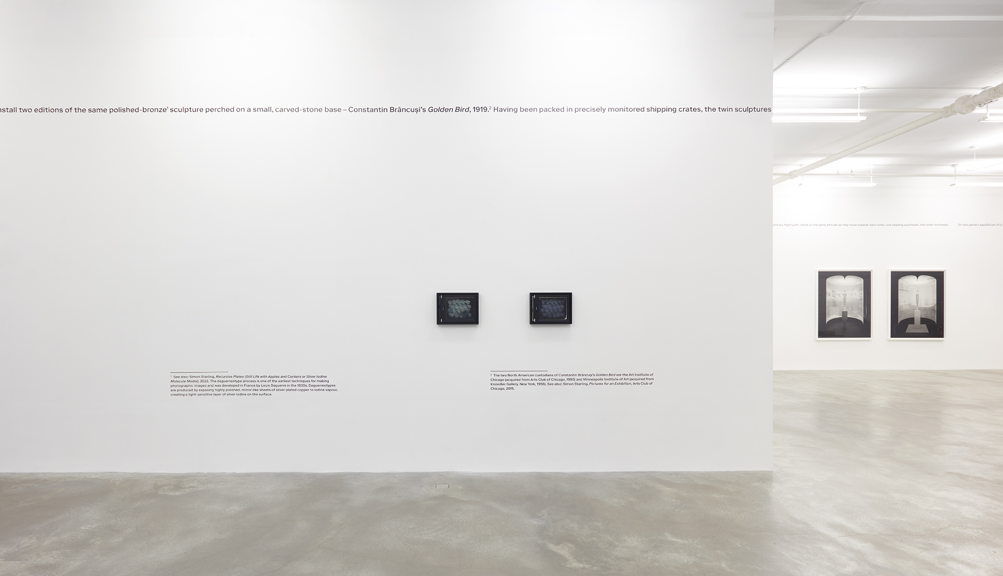 Central to Starling’s seventh solo exhibition with the gallery is a new work created in collaboration with Danish artist Emil Rønn Andersen, Two Birds, No Birds – A Mirrored Displacement (Proposal for an Inter-Institutional Exchange)/Text (2022). In a progression from Starling’s previous bodies of work that drew directly from Brâncusi, such as Bird in Space (2004, presented at Casey Kaplan the same year) and Pictures for an Exhibition (2013-14, the artist’s 2014 solo exhibition at the Arts Club of Chicago), Starling recontextualizes an old narrative.