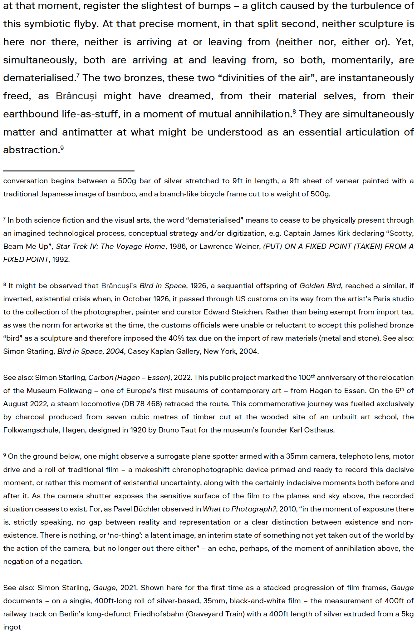 Simon Starling (b. 1967, Epsom, UK) reveals unexpected relationships within diverging histories. Guided by a cyclical rationale that has informed his practice for the last 30 years, Starling presents Two Birds, No Birds, a conflation of the material world of sculpture with the immaterial world of contemporary digital technology. Taking Constantin Brâncusi’s bronze sculpture Golden Bird (1919) as his point of departure, the artist entwines, overlaps, and uncovers the connections between past and present – the actual and the virtual – in a synthesis of sculpture, photography, film, and text. ?