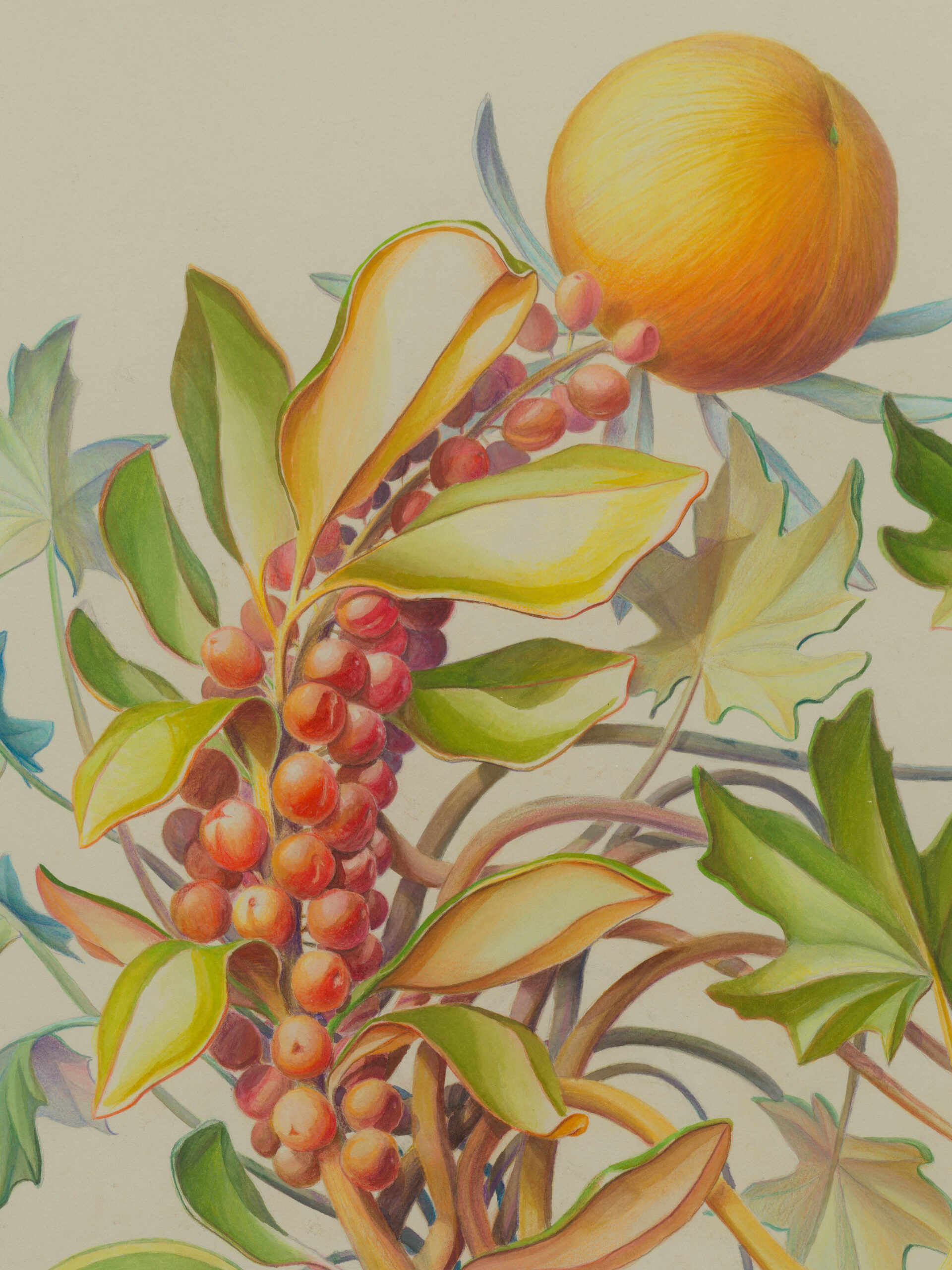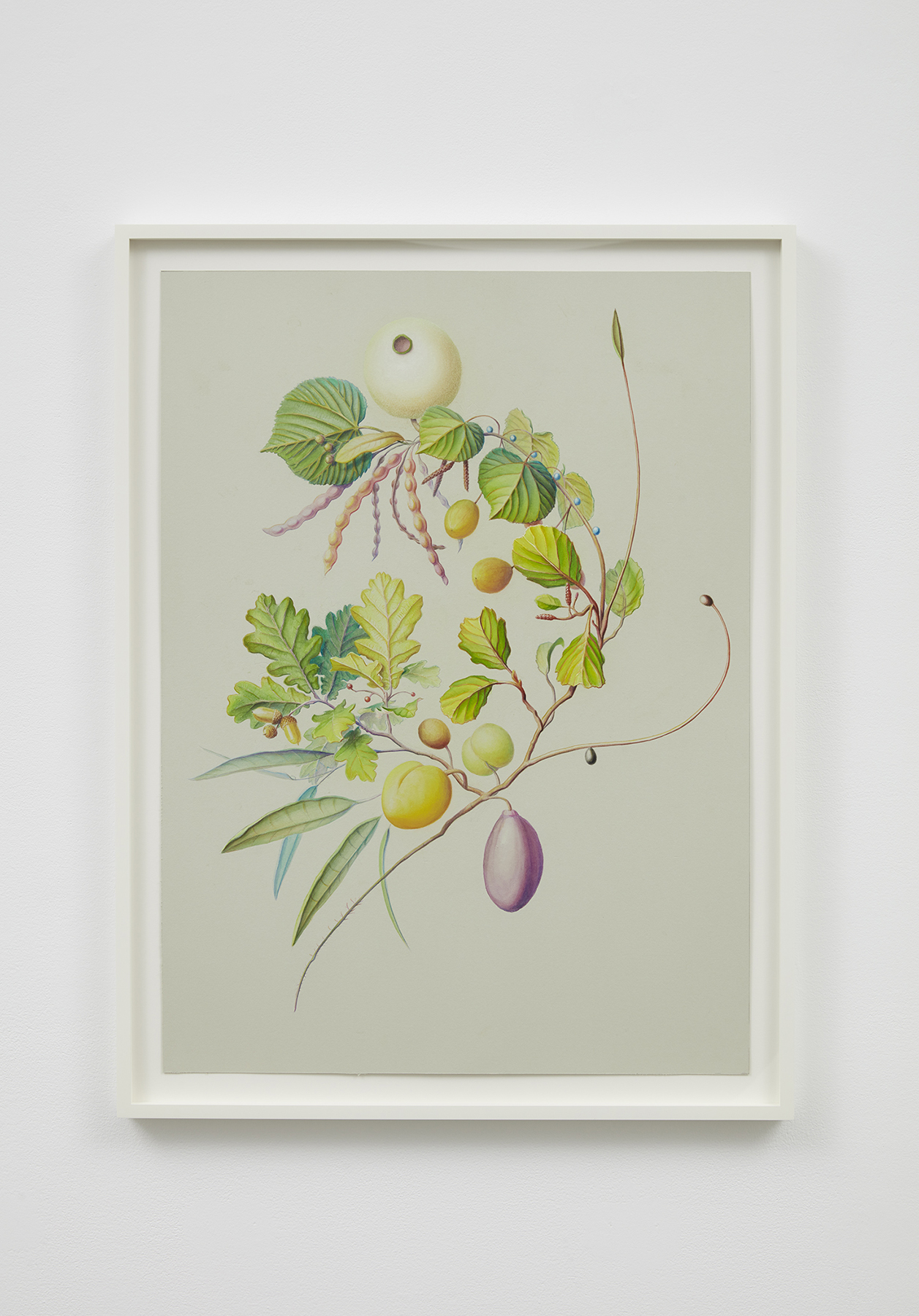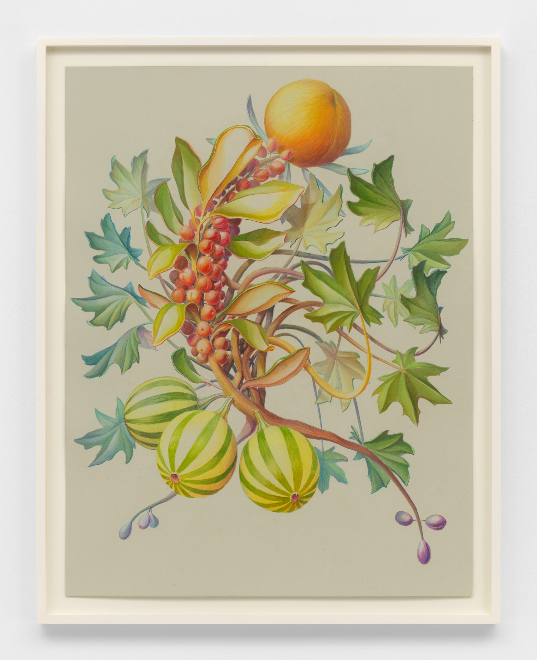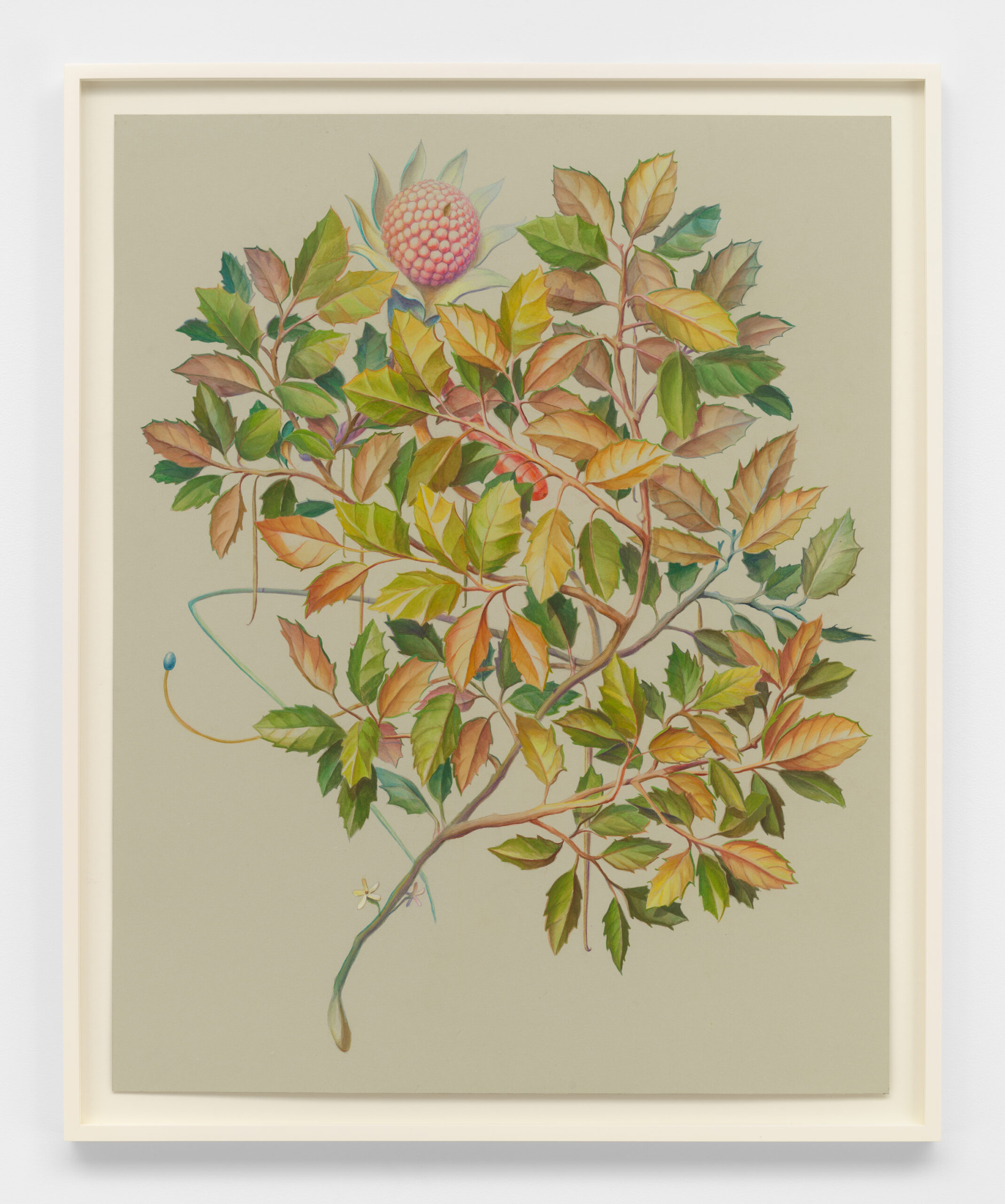 Three primary elements dominate this body of work: Characters, Barriers, and Walls. Characters serve as opulent protagonists. Culled from the artist’s imagination, these forms may appear realistic, yet closer inspection reveals a myriad of alien, unclassifiable elements. In A Rare Beast in Full Display (2021) matter that mirrors a peach, maple leaf, and legume exists harmonically. A fruit akin to a kumquat blossoms from foliage, as an olive dangles from its vine. The painstaking naturalism of these biomorphic watercolors is reminiscent of botanical diagrams dating back centuries. “De Materia Medica” a five-volume manuscript created between 50 and 70 CE surveys medically utilitarian plants and serve as a reference for the artist. Leveraging technical imagery, Thorpe commandeers floral depictions and engineers anthropomorphized creatures with bold inaccuracies that quietly defy the scientific gaze. The resulting watercolors concurrently wield and debunk naturalism, establishing space for fiction.