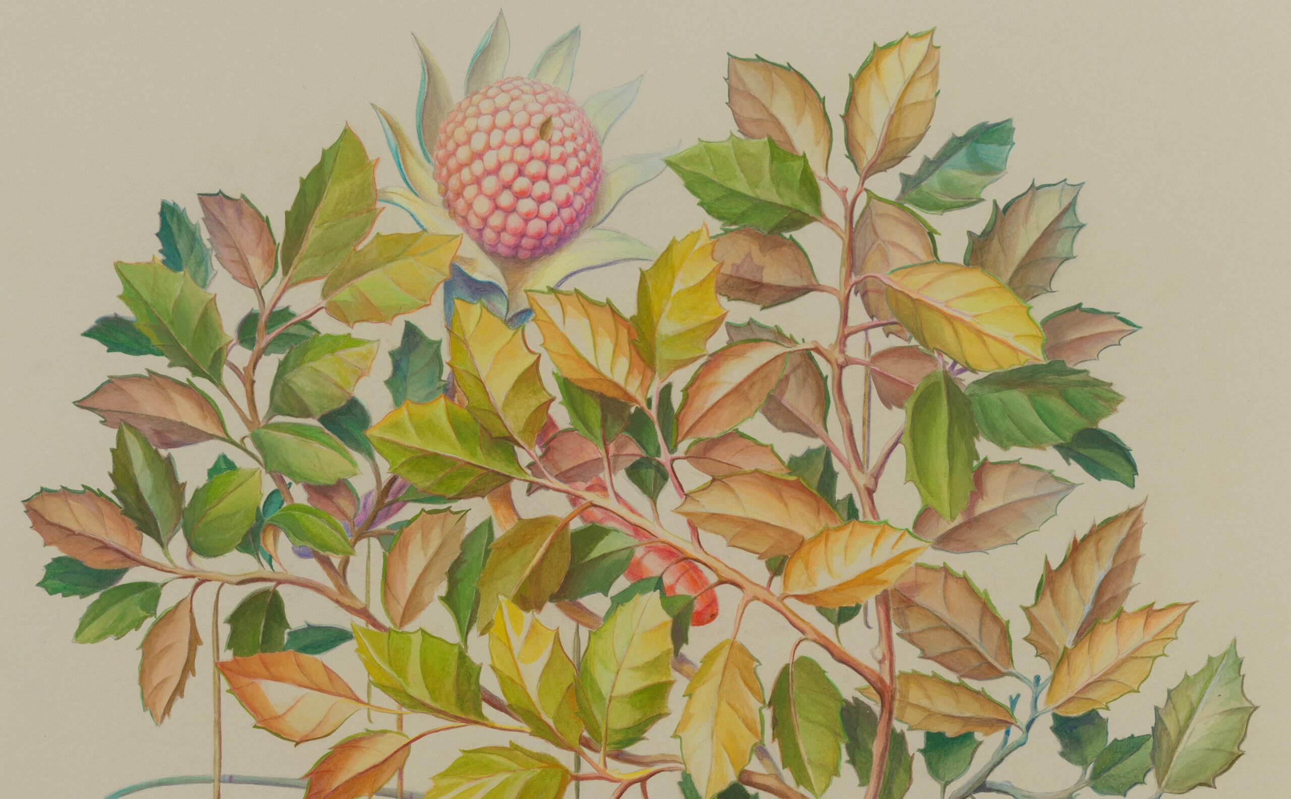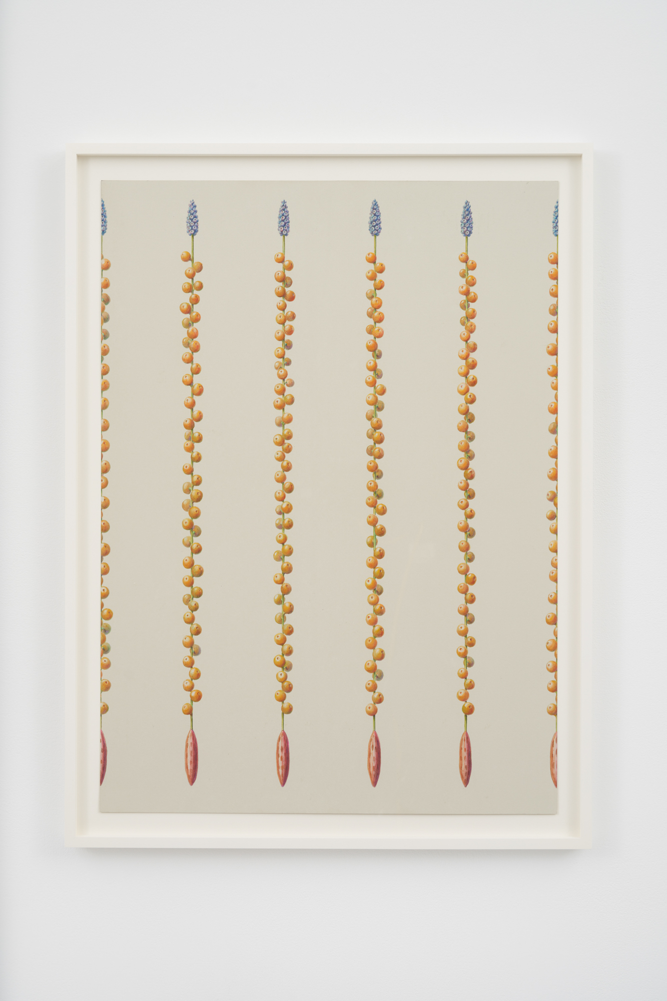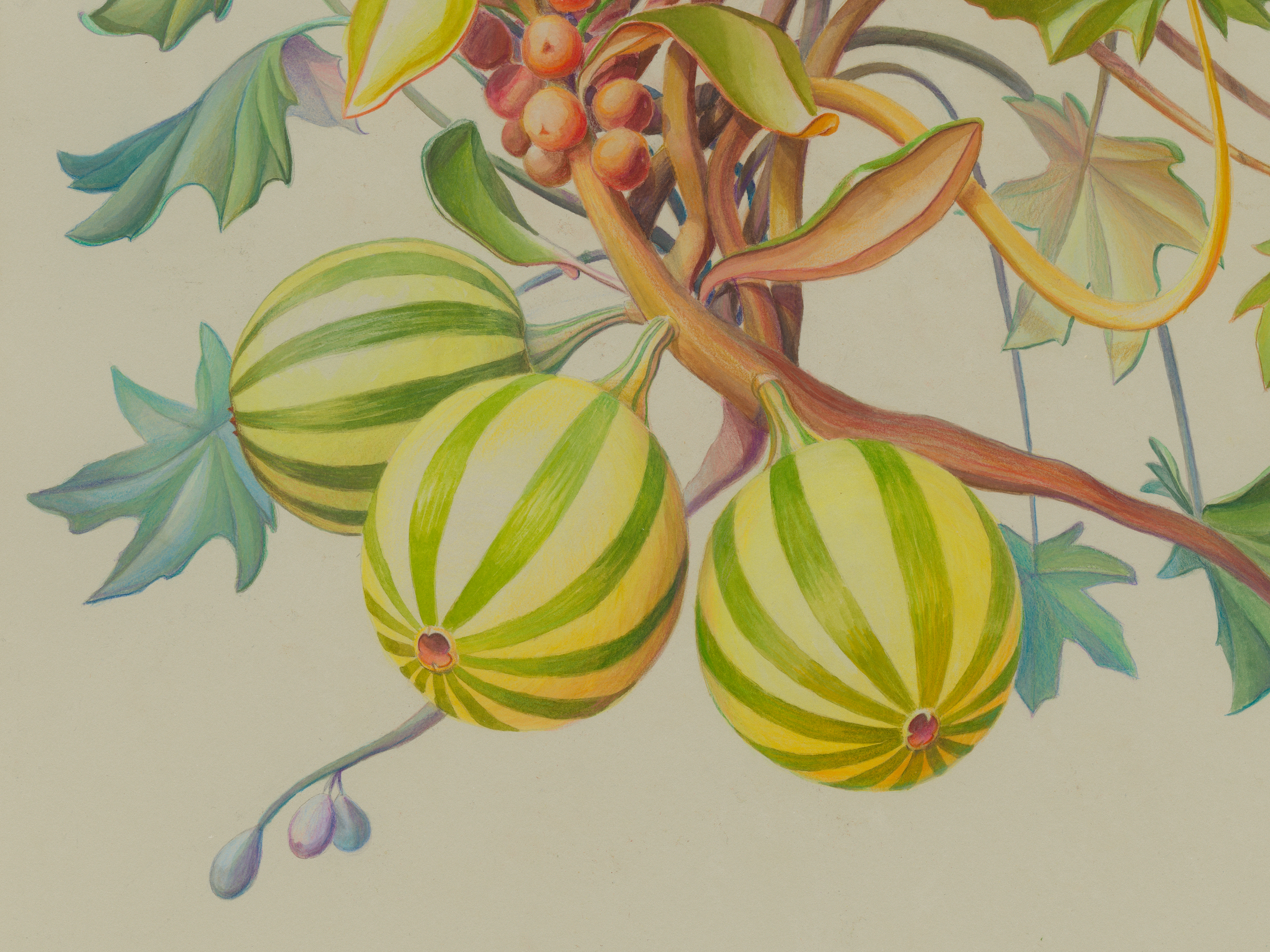 Three primary elements dominate this body of work: Characters, Barriers, and Walls. Characters serve as opulent protagonists. Culled from the artist’s imagination, these forms may appear realistic, yet closer inspection reveals a myriad of alien, unclassifiable elements. In A Rare Beast in Full Display (2021) matter that mirrors a peach, maple leaf, and legume exists harmonically. A fruit akin to a kumquat blossoms from foliage, as an olive dangles from its vine. The painstaking naturalism of these biomorphic watercolors is reminiscent of botanical diagrams dating back centuries. “De Materia Medica” a five-volume manuscript created between 50 and 70 CE surveys medically utilitarian plants and serve as a reference for the artist. Leveraging technical imagery, Thorpe commandeers floral depictions and engineers anthropomorphized creatures with bold inaccuracies that quietly defy the scientific gaze. The resulting watercolors concurrently wield and debunk naturalism, establishing space for fiction.