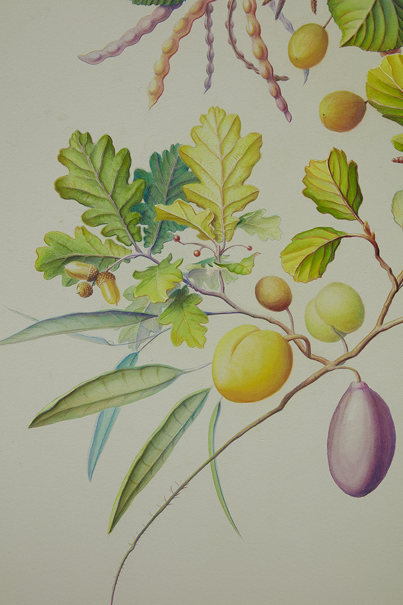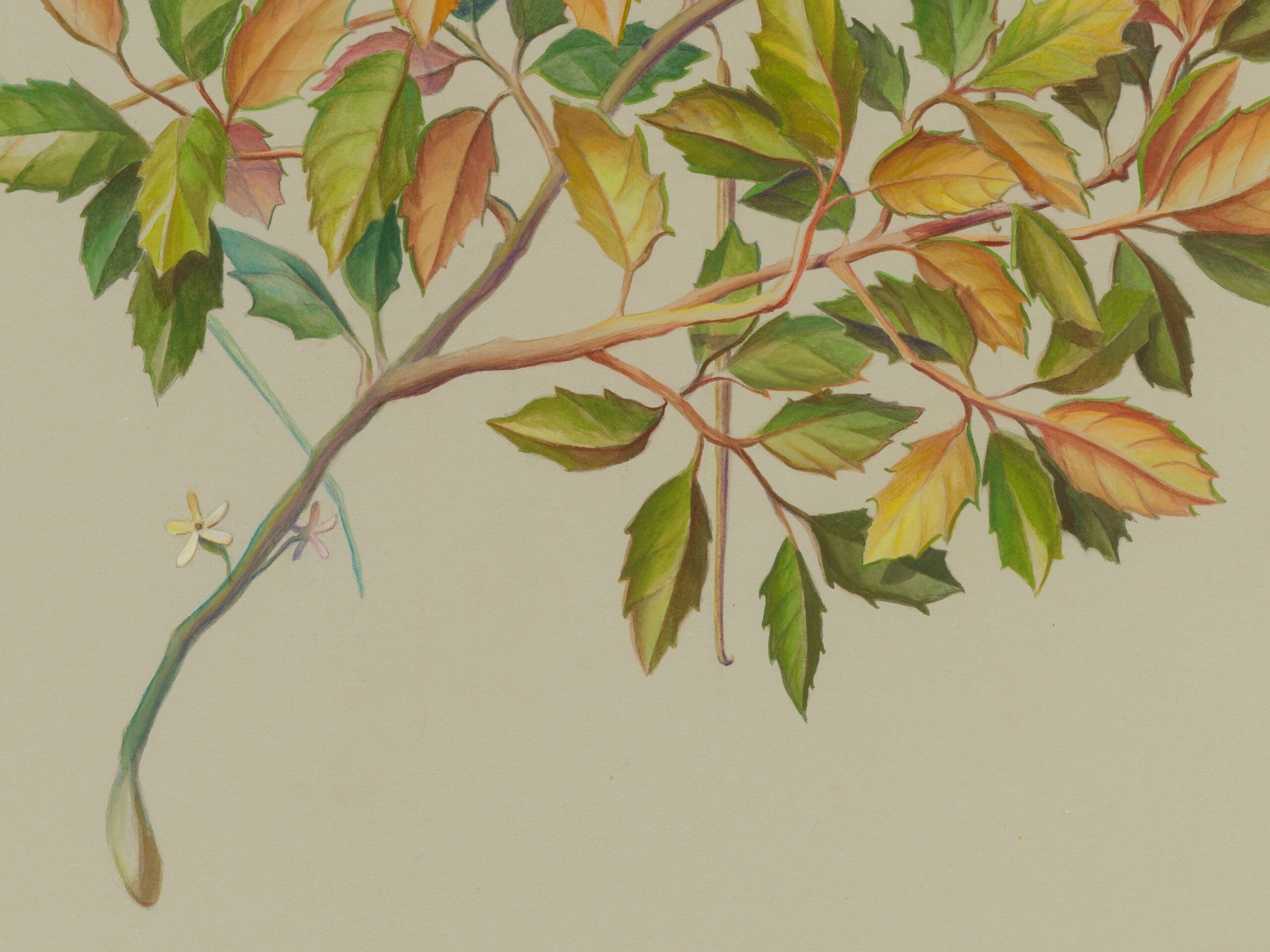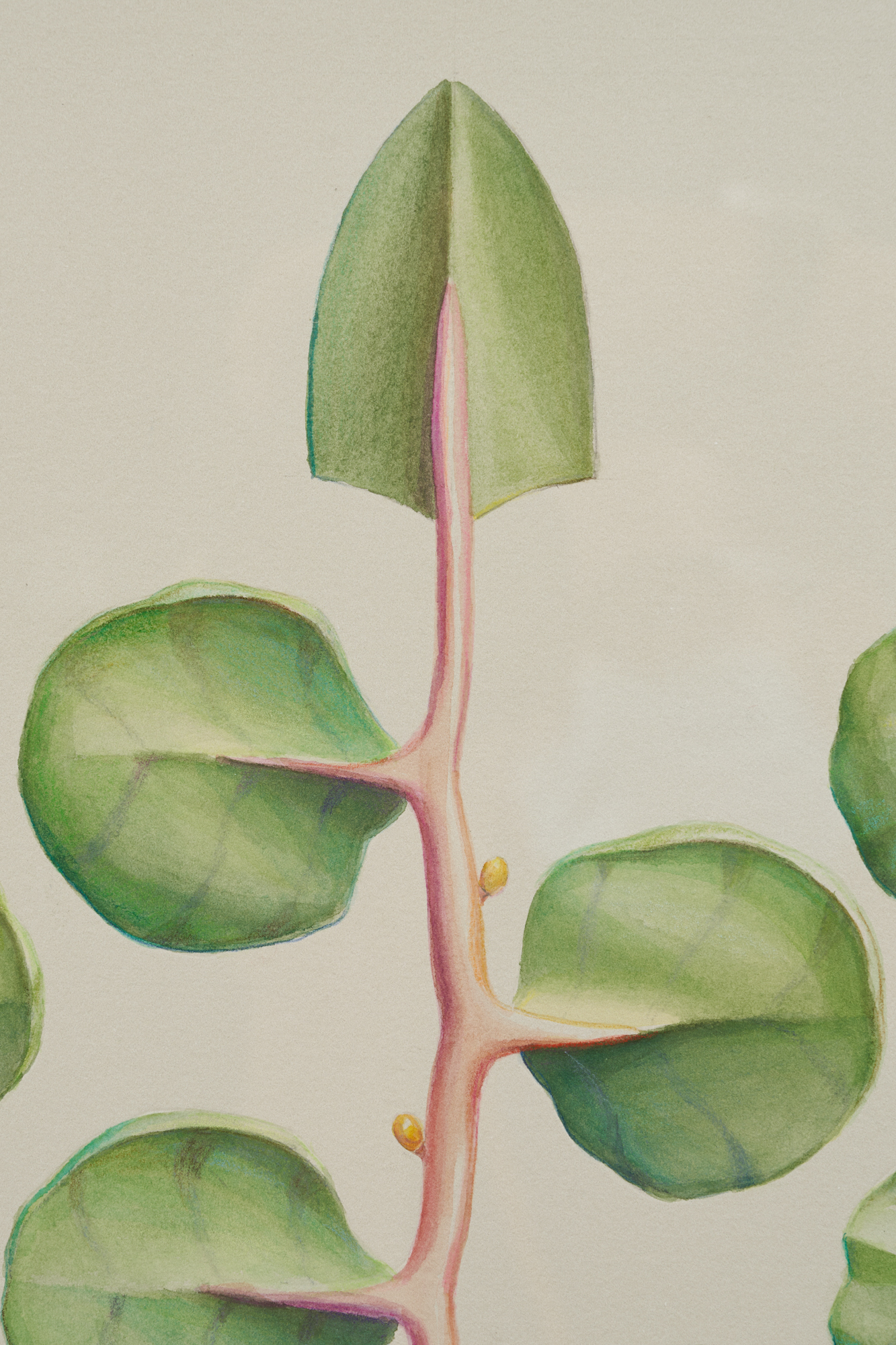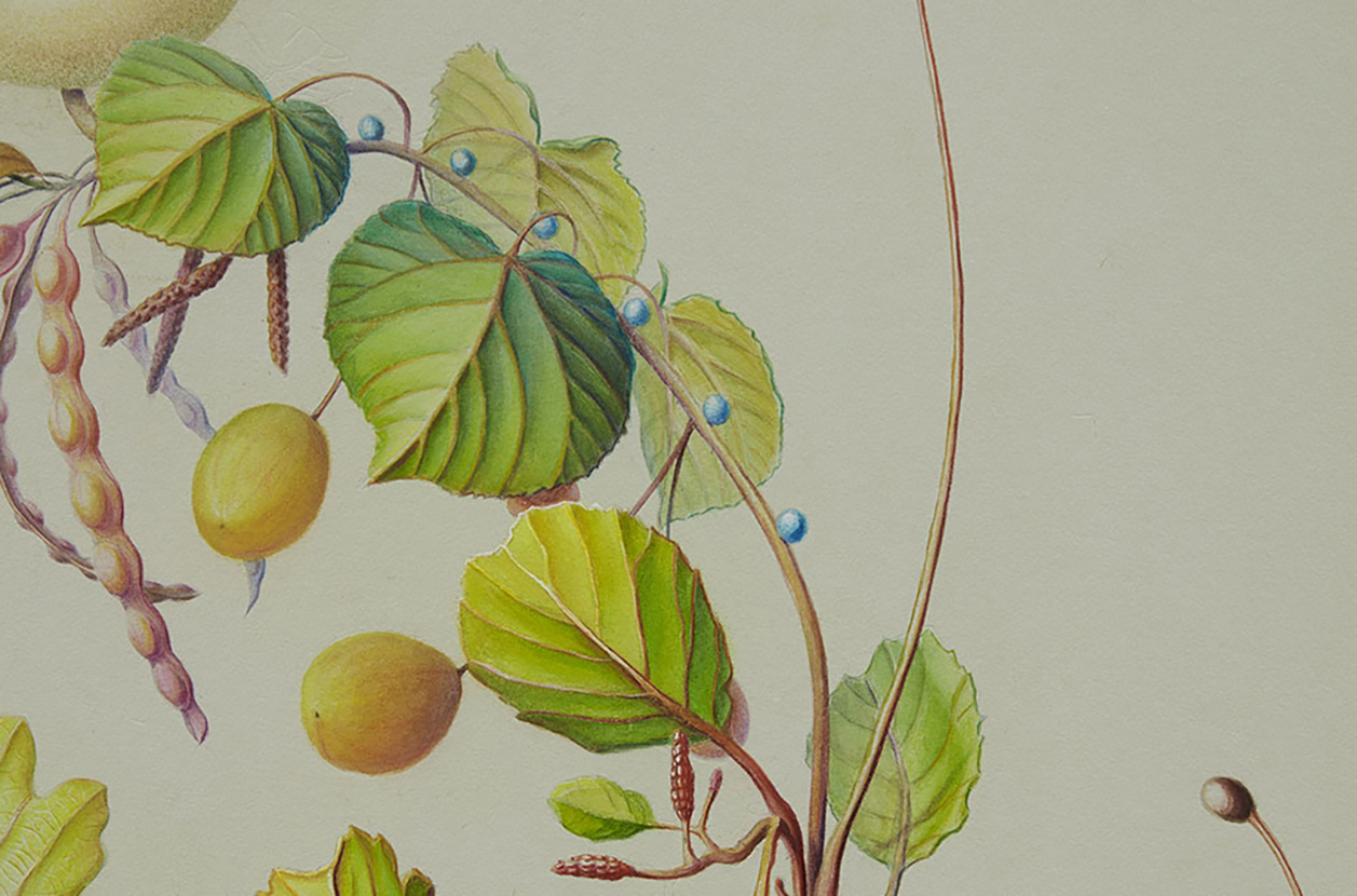 Three primary elements dominate this body of work: Characters, Barriers, and Walls. Characters serve as opulent protagonists. Culled from the artist’s imagination, these forms may appear realistic, yet closer inspection reveals a myriad of alien, unclassifiable elements. In A Rare Beast in Full Display (2021) matter that mirrors a peach, maple leaf, and legume exists harmonically. A fruit akin to a kumquat blossoms from foliage, as an olive dangles from its vine. The painstaking naturalism of these biomorphic watercolors is reminiscent of botanical diagrams dating back centuries. “De Materia Medica” a five-volume manuscript created between 50 and 70 CE surveys medically utilitarian plants and serve as a reference for the artist. Leveraging technical imagery, Thorpe commandeers floral depictions and engineers anthropomorphized creatures with bold inaccuracies that quietly defy the scientific gaze. The resulting watercolors concurrently wield and debunk naturalism, establishing space for fiction.