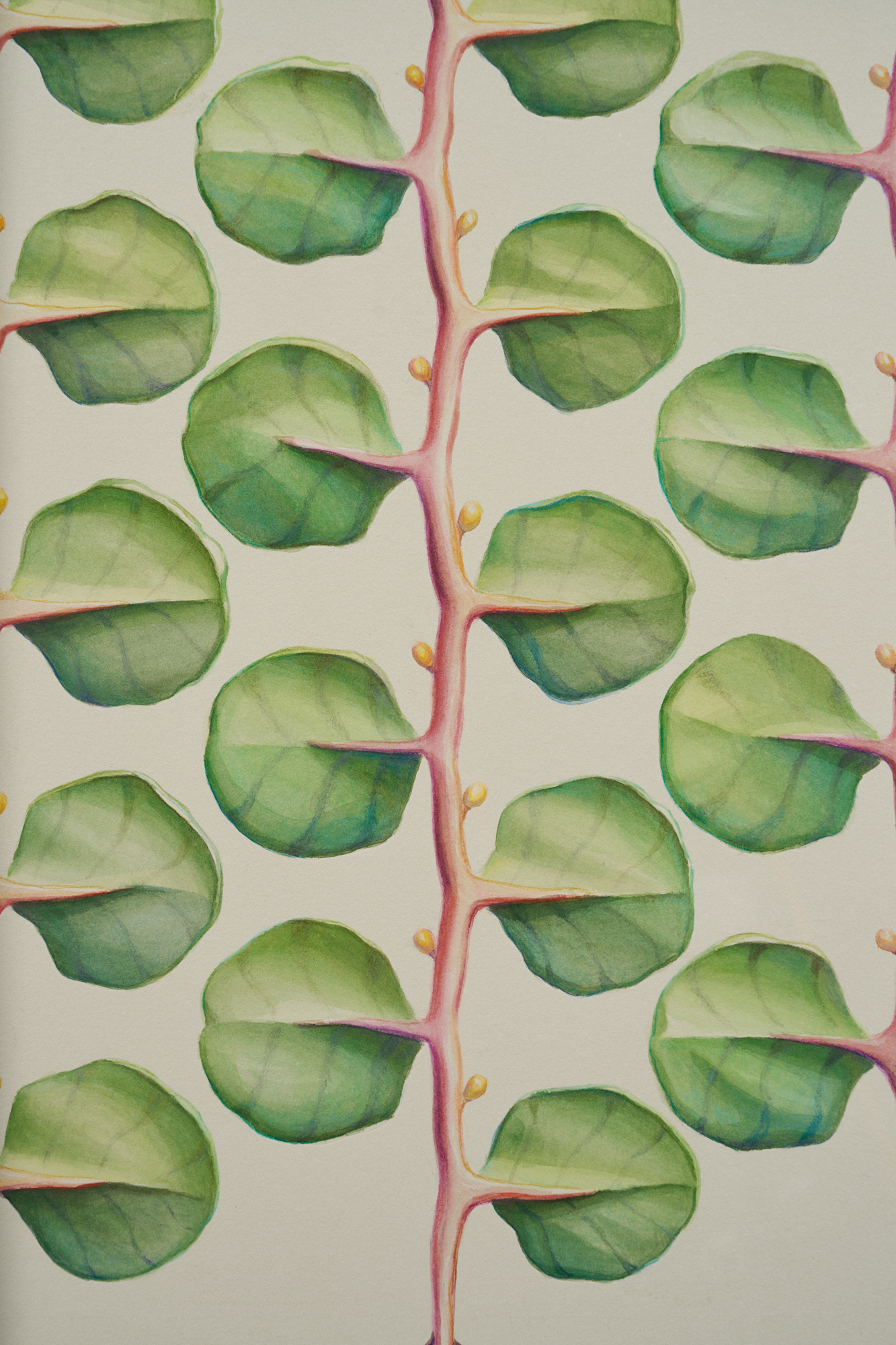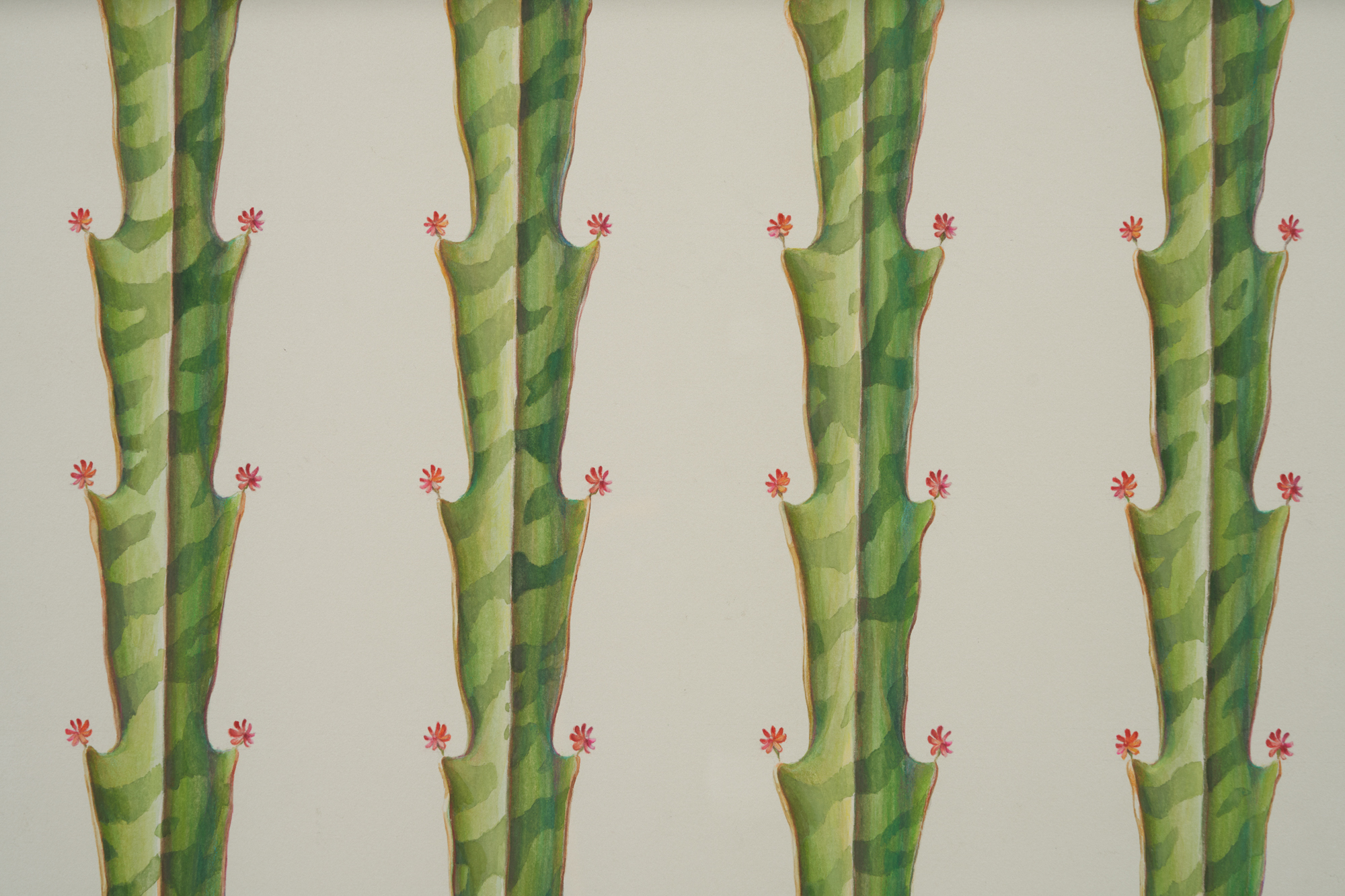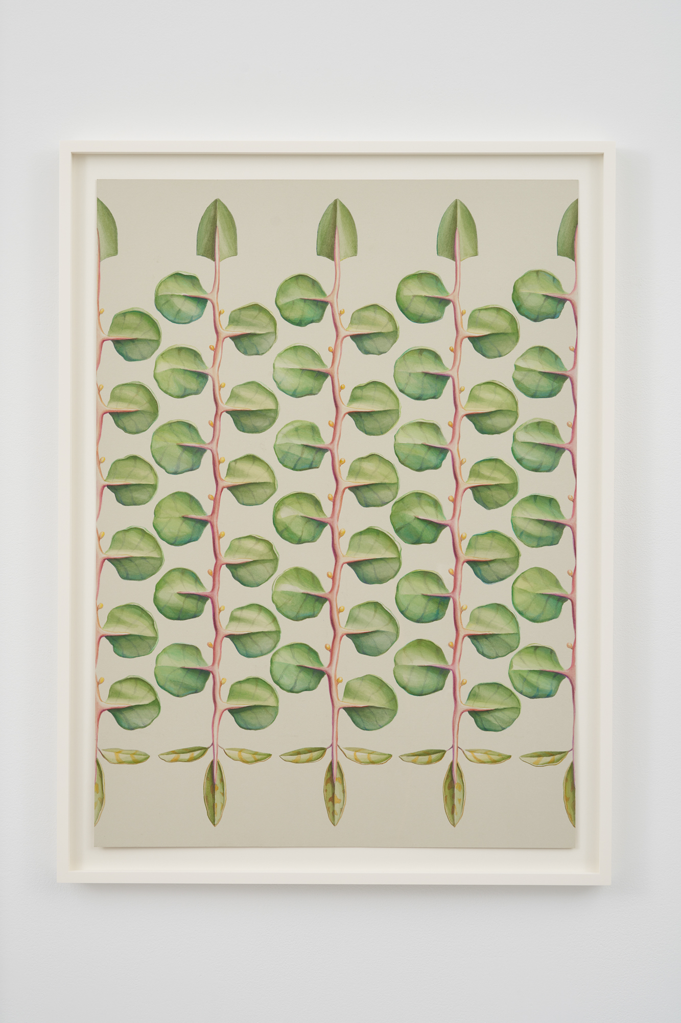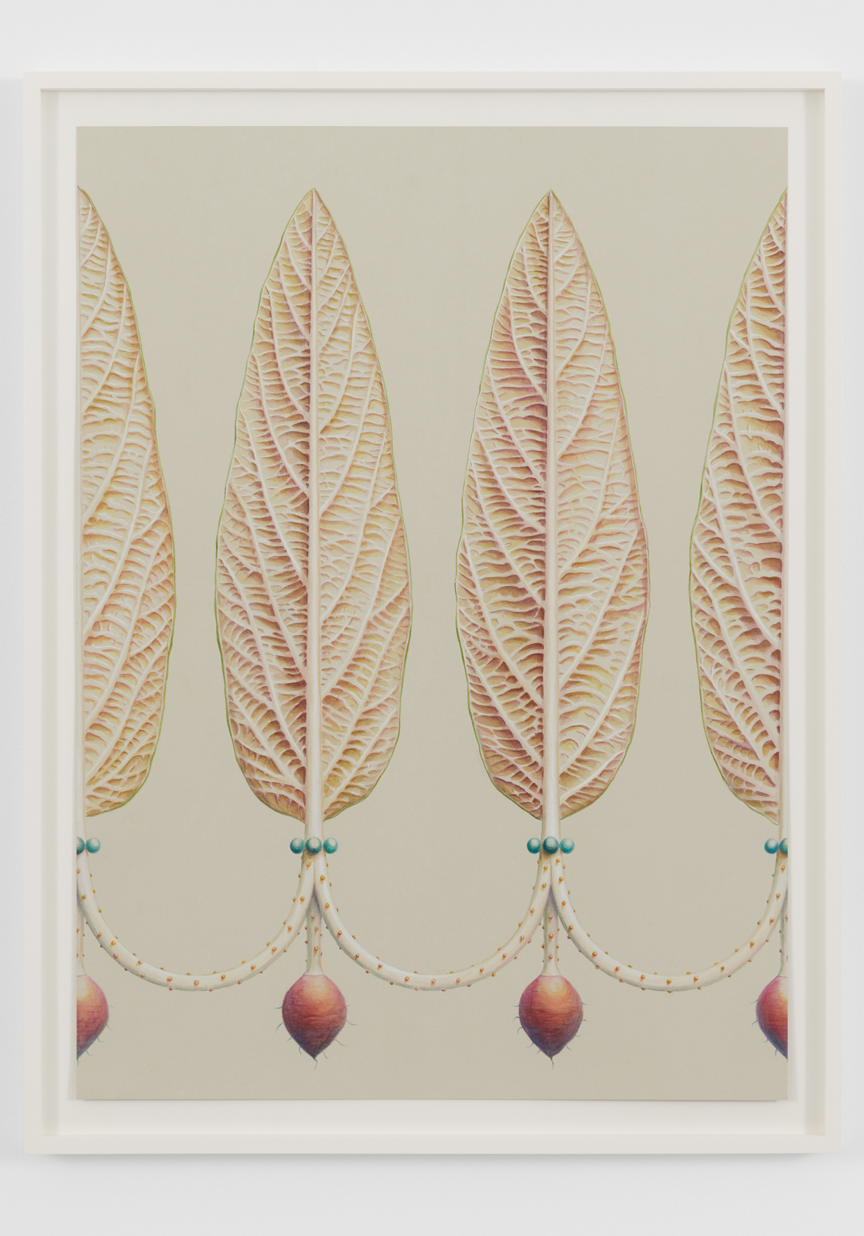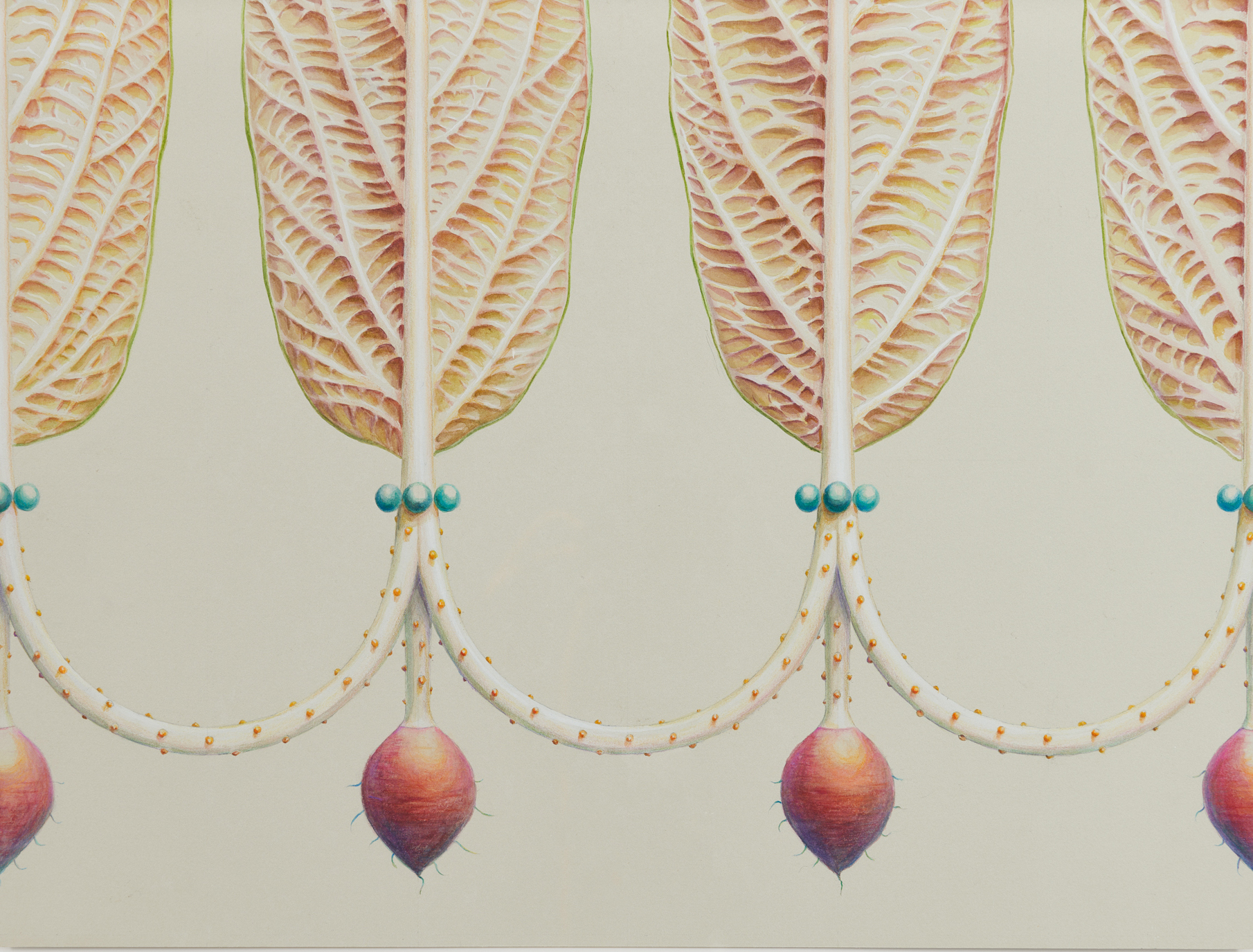 Barriers depict extraterrestrial plants; biodynamic fences that both invite and dispel. Four leaves reminiscent of endives are decorated with cylindrical balls that are linked together through a white root in Emphatic Display Ready to Hold (2022). A vibrant green outline hugs the leaves whose central root casts a shadow on unfolding veins. The artist’s creations are so acutely scrupulous that they echo the photography of Karl Blossfeldt, whose botanical documentation underscores the architectural qualities of nature. The fixed position of Thorpe’s Barriers is captivating and foreboding, natural and urban. Their visual presence suggests a fictitious collapse, as their ornamentation is simultaneously inviting and disarming. For the artist, the watercolors are fragile and propositional in sympathy with the delicate nature of the world depicted. Thorpe forsakes the recording of botany in favor of breeding humanity’s vulnerabilities.