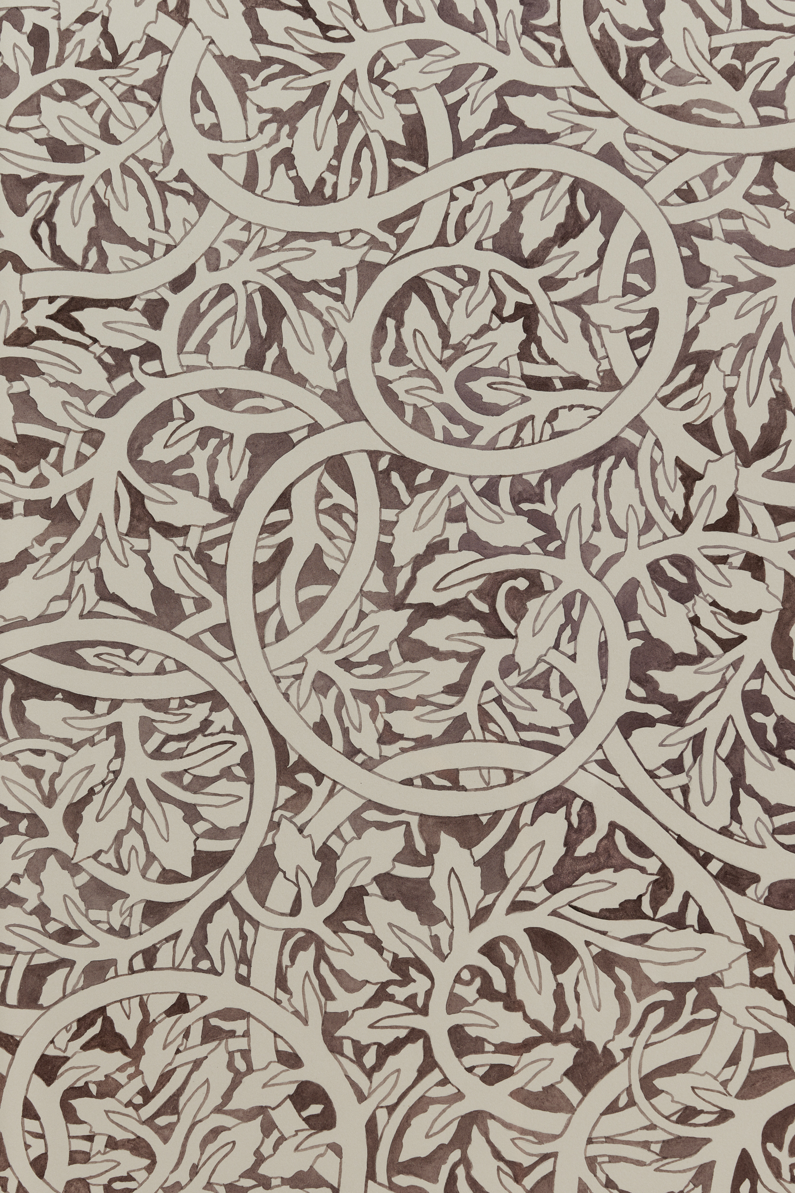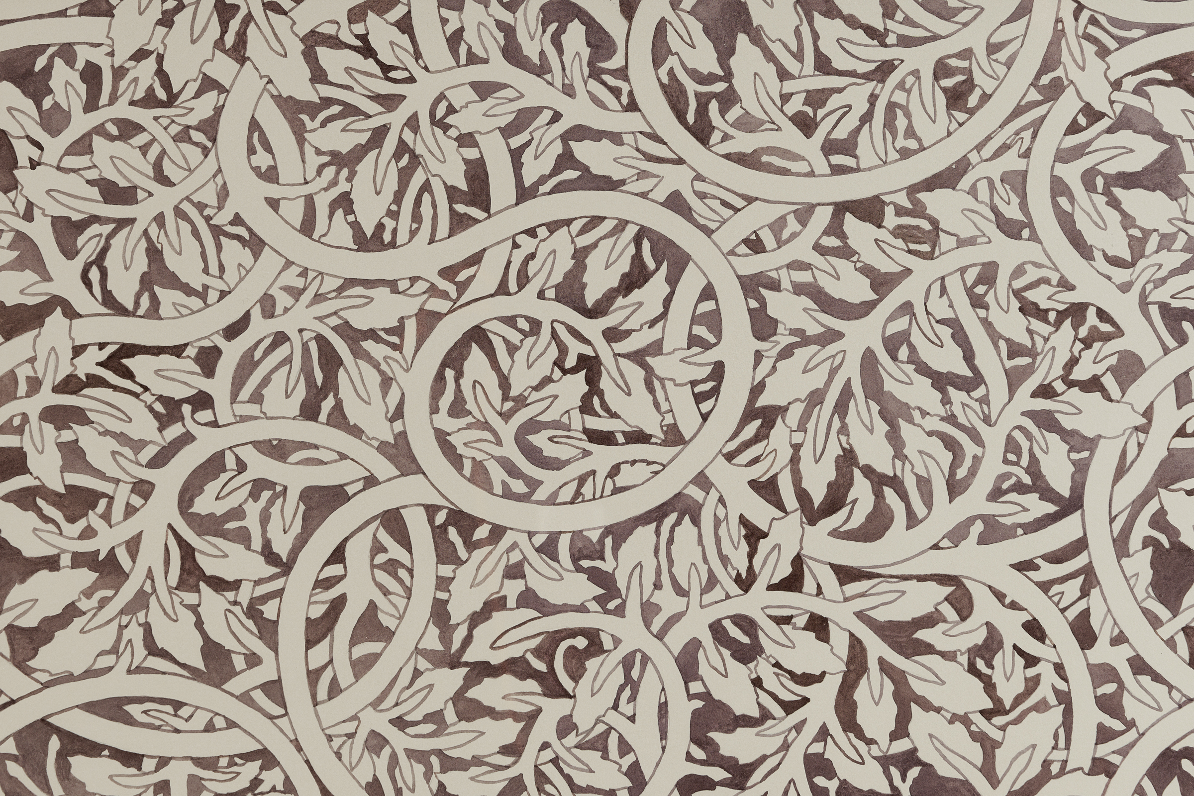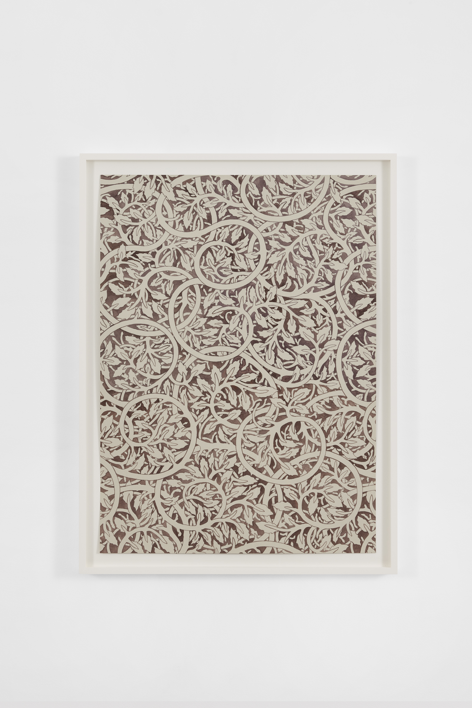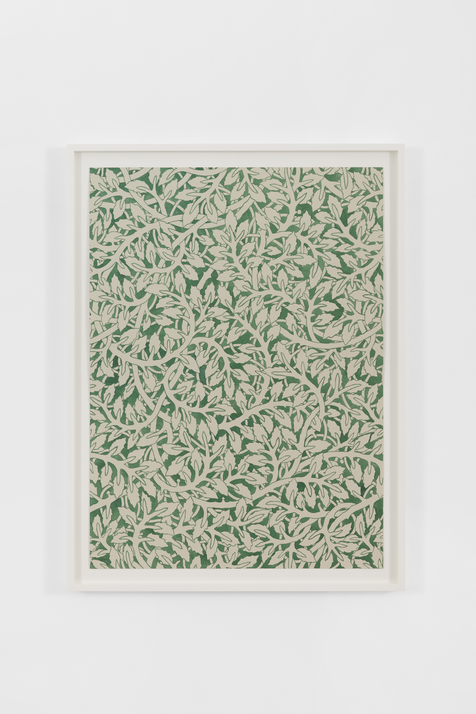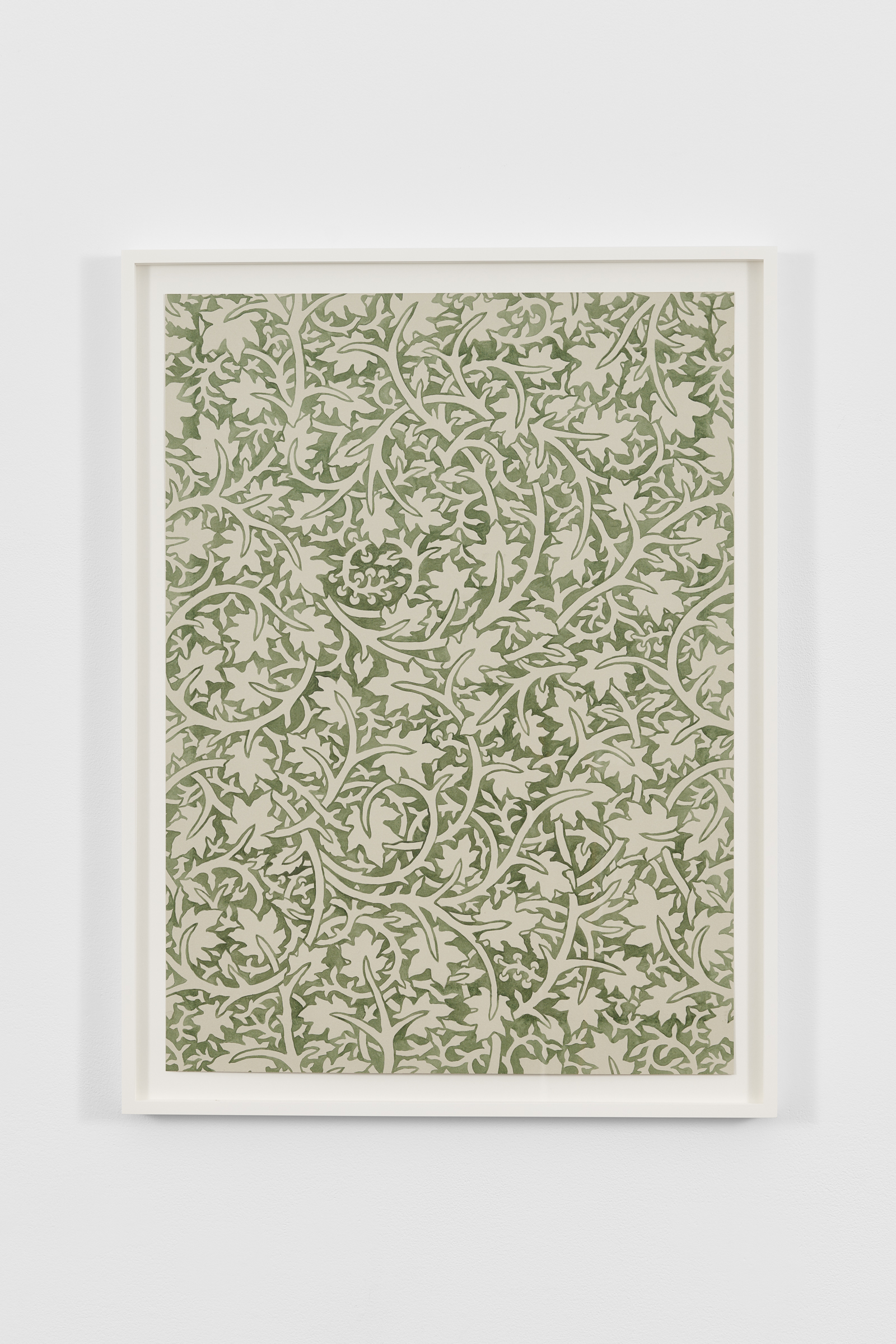 A series of Walls reminiscent of endpapers with undulating vines and closely placed leaves establish a scape in which an orchestra of fantastical organic matter exist. The hue and redundancy of Quiet Now, Hush…waiting, watching (2022) is reminiscent of William Morris’s Pimpernel (1876). With a forest palette and curving ornamentality, the work offers an illusion of endlessness, an impenetrable space to hide in. For Thorpe, this continuity is linked to naturalism: just as organic matter recycles itself, the intertwined patterning is ceaseless. Morris and the vernacular of the 19th century Arts and Craft Movement are central to Thorpe’s practice. The artist’s commitment to materiality and the diligence of his hand is an extension of the movement’s ethos and essays. Whereas the Arts and Crafts Movement possessed a focus on functionality, in these watercolors and beyond, Thorpe’s embellishments are in opposition to and divorced from the everyday object.