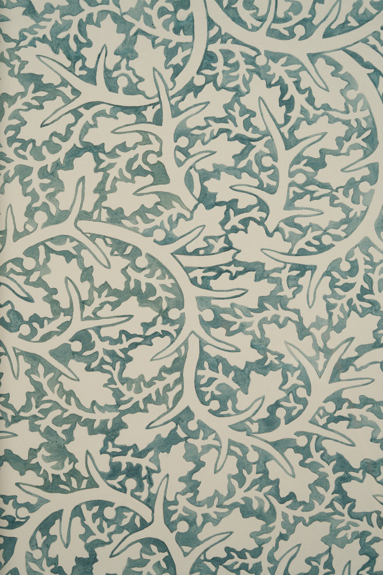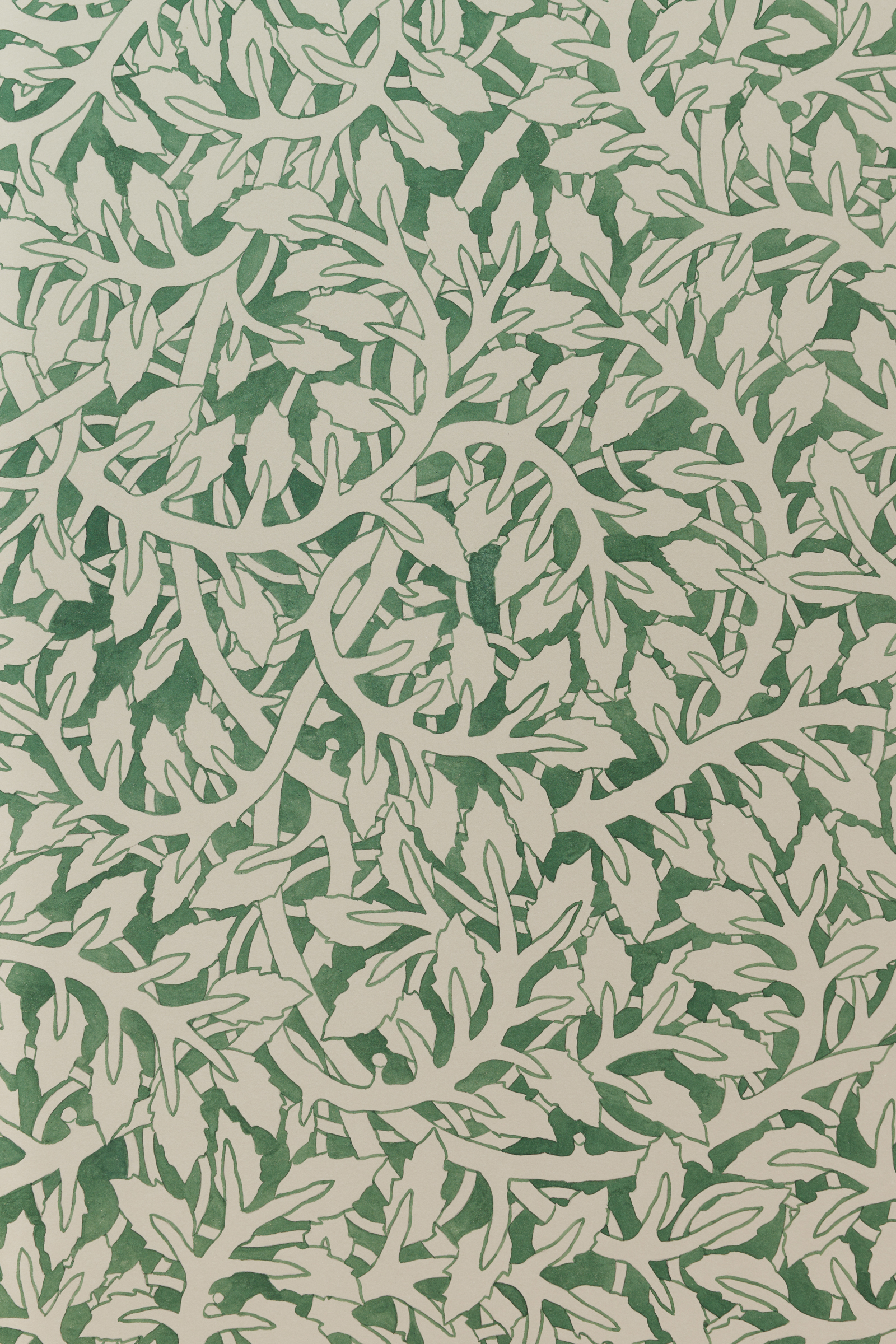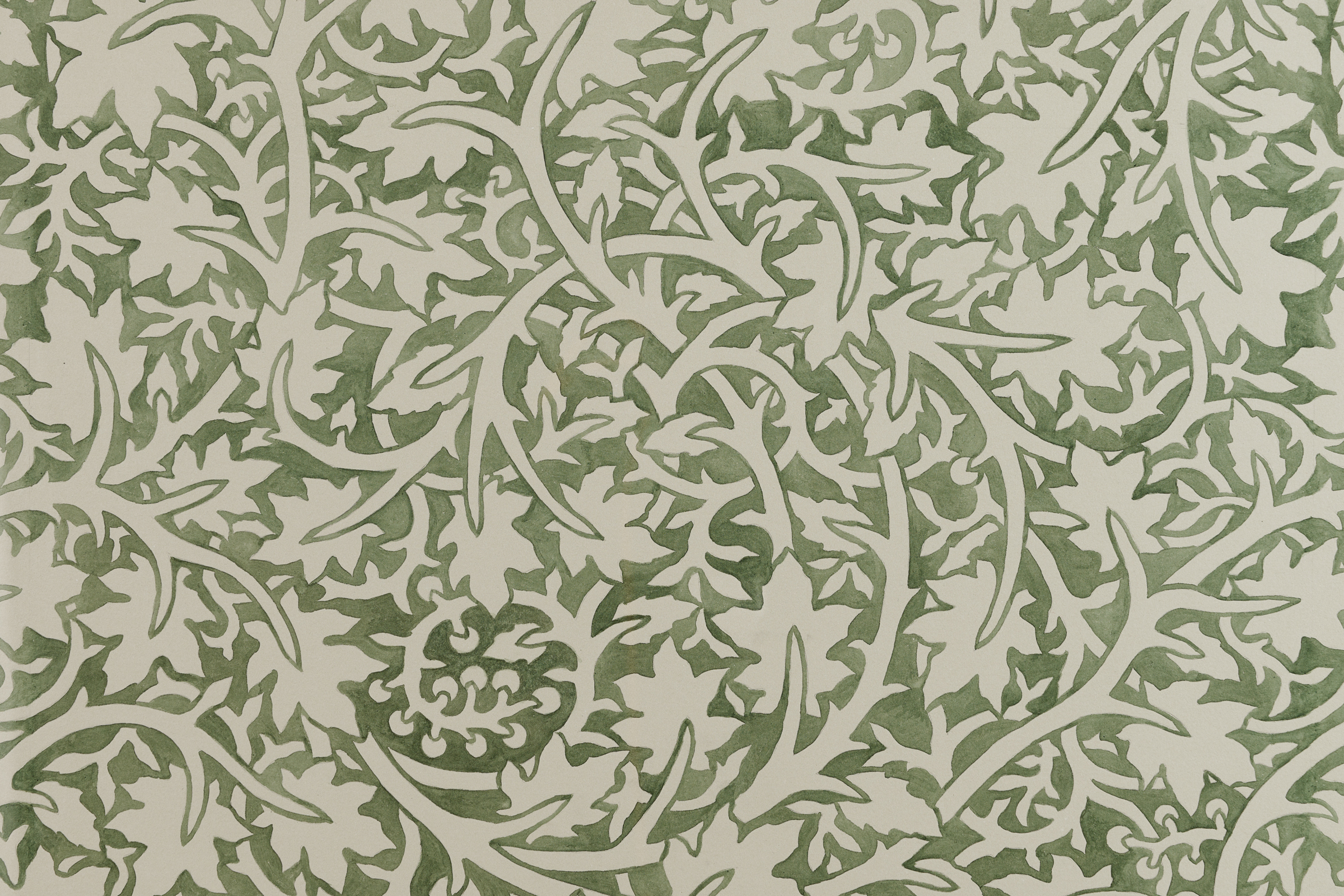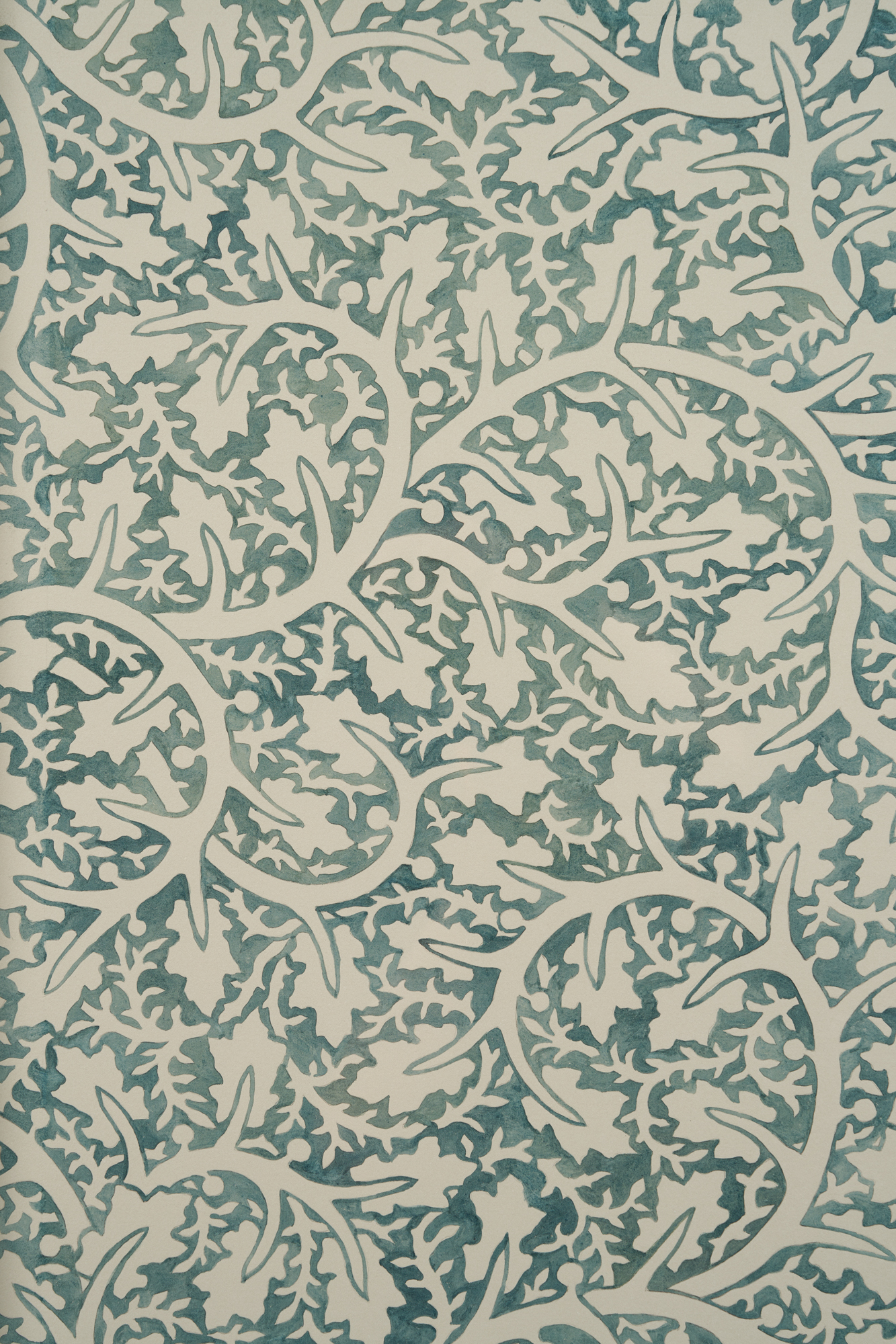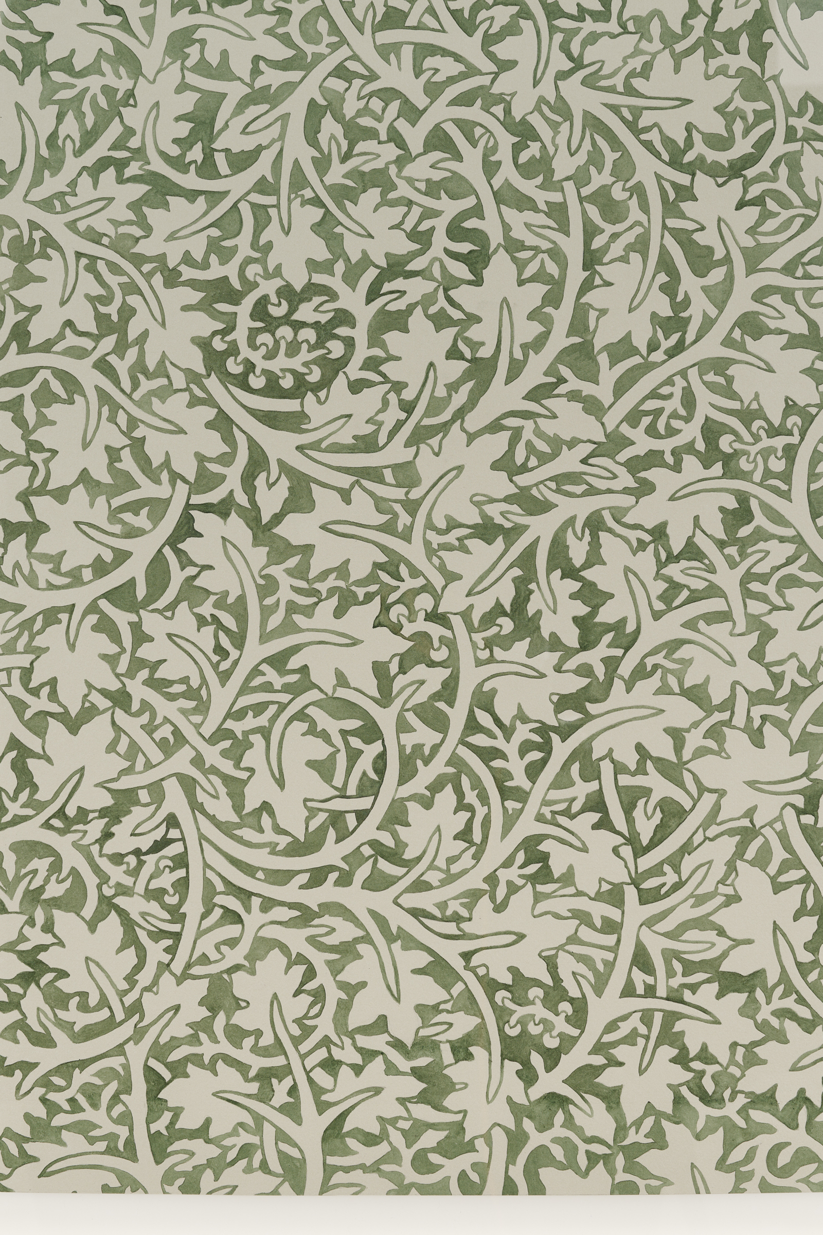 A series of Walls reminiscent of endpapers with undulating vines and closely placed leaves establish a scape in which an orchestra of fantastical organic matter exist. The hue and redundancy of Quiet Now, Hush…waiting, watching (2022) is reminiscent of William Morris’s Pimpernel (1876). With a forest palette and curving ornamentality, the work offers an illusion of endlessness, an impenetrable space to hide in. For Thorpe, this continuity is linked to naturalism: just as organic matter recycles itself, the intertwined patterning is ceaseless. Morris and the vernacular of the 19th century Arts and Craft Movement are central to Thorpe’s practice. The artist’s commitment to materiality and the diligence of his hand is an extension of the movement’s ethos and essays. Whereas the Arts and Crafts Movement possessed a focus on functionality, in these watercolors and beyond, Thorpe’s embellishments are in opposition to and divorced from the everyday object.